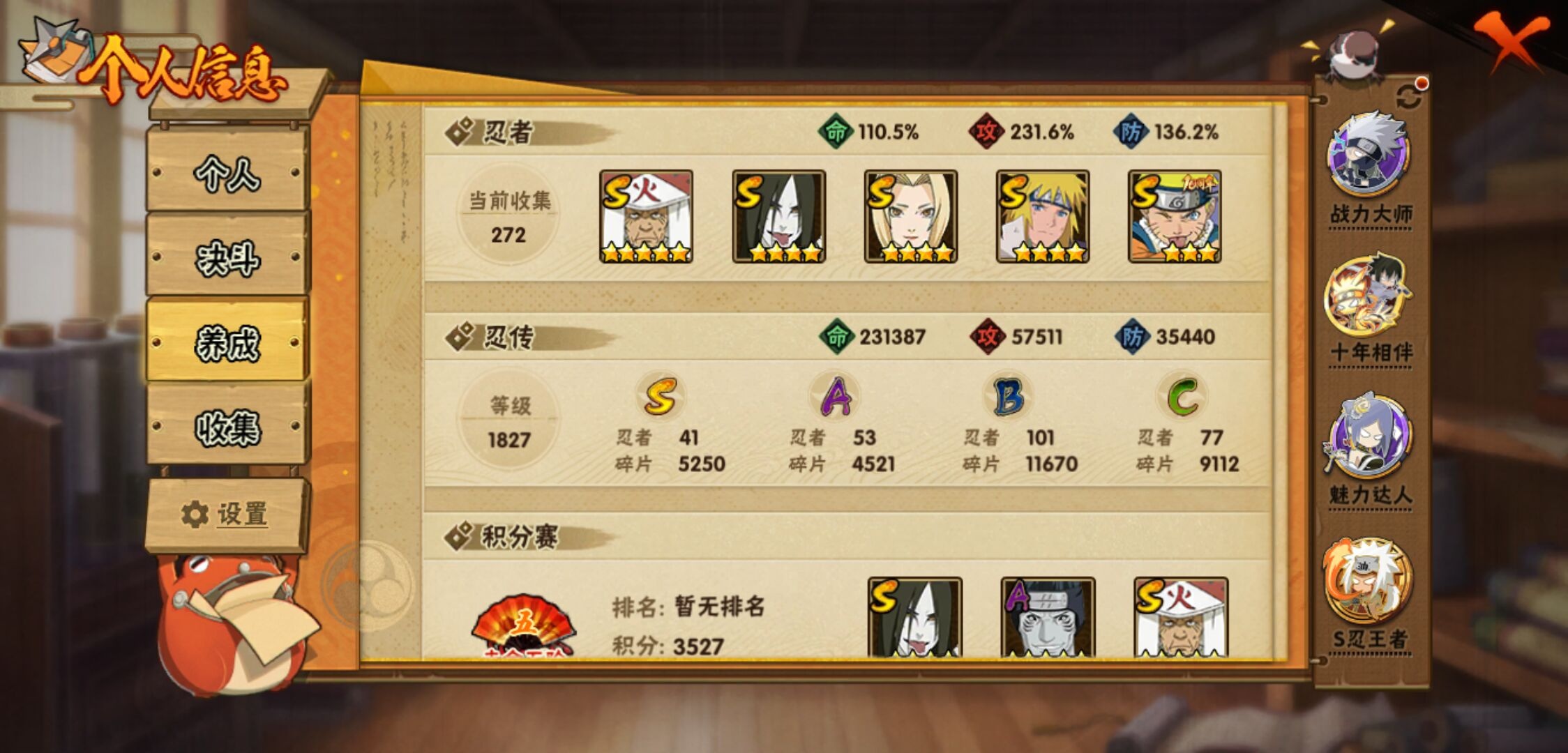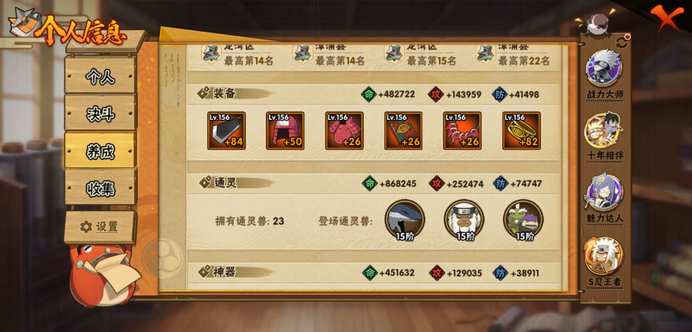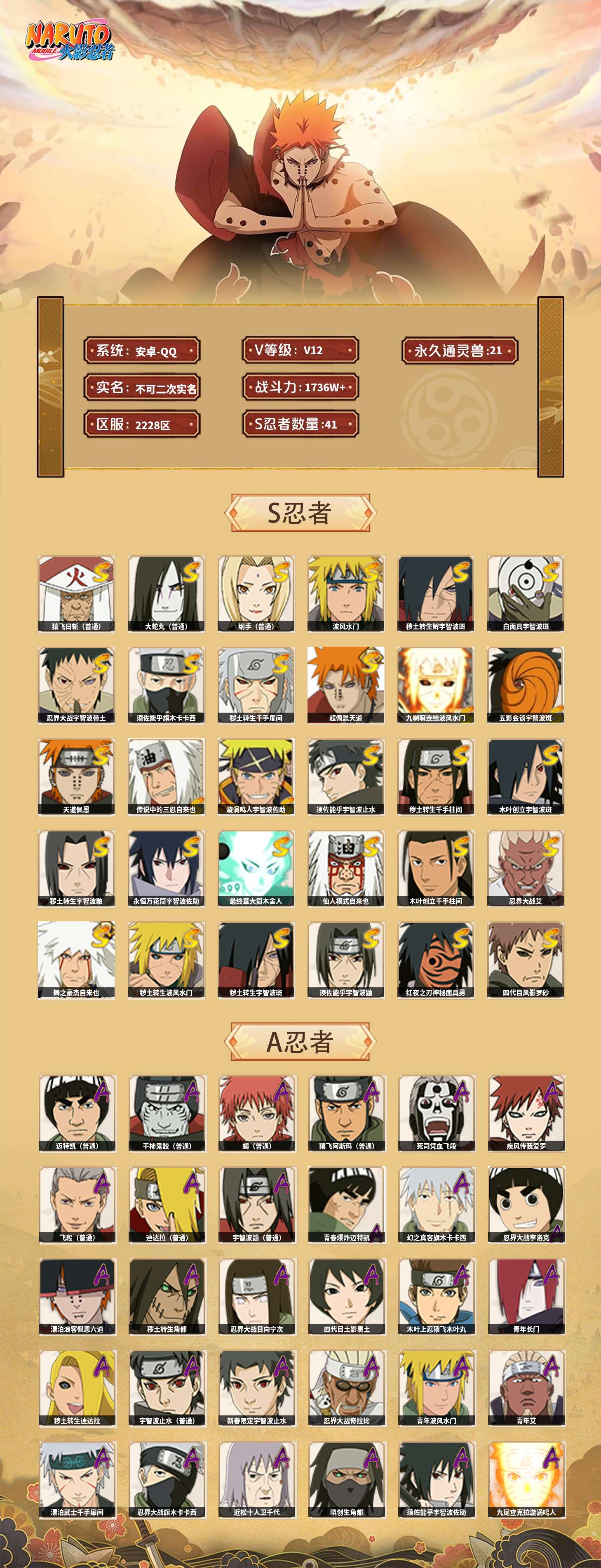 【火影忍者】【lyhy10790】战斗力:1736w;段位:影级1阶;本服排名:40;vip:v12级;s忍:41个;a忍:53个;通灵兽:21个,s忍:秽土转生解宇智波斑|白面具宇智波斑|忍界大战宇智波带土|须佐能乎旗木卡卡西|秽土转生千手扉间|超佩恩天道|九喇嘛连结波风水门|五影会谈宇智波斑|天道佩恩|传说中的三忍自来也|漩涡鸣人宇智波佐助|须佐能乎宇智波止水|秽土转生千手柱间|木叶创立宇智波斑|秽土转生宇智波鼬|永恒万花筒宇智波佐助|最终章大筒木舍人|仙人模式自来也|木叶创立千手柱间|忍界大战艾|舞之豪杰自来也|大蛇丸(普通) 4星|纲手(普通) 4星|波风水门 4星|秽土转生波风水门|秽土转生宇智波斑|须佐能乎宇智波鼬|红夜之刃神秘面具男|四代目风影罗砂|仙人模式药师兜|死门迈特凯|忍界大战大野木|忍界大战春野樱|九喇嘛连结漩涡鸣人|博人传大筒木金式|大筒木桃式|猿飞日斩(普通) 5星|秽土转生猿飞日斩|自来也(普通)|暴怒第六尾漩涡鸣人|初代目风影烈斗__a忍:青春爆炸迈特凯|幻之真容旗木卡卡西|忍界大战李洛克|漂泊浪客佩恩六道|秽土转生角都|忍界大战日向宁次|四代目土影黑土|木叶上忍猿飞木叶丸|青年长门|秽土转生迪达拉|宇智波止水(普通)|新春限定宇智波止水|忍界大战奇拉比|青年波风水门|青年艾|漂泊武士千手扉间|忍界大战旗木卡卡西|近松十人卫千代|晓创生角都|须佐能乎宇智波佐助|九尾查克拉漩涡鸣人|晓大蛇丸|百豪春野樱|忍界大战秋道丁次|奇拉比(普通)|万花筒写轮眼宇智波佐助|五代目水影照美冥|五代目雷影达鲁伊|死司凭血飞段 4星|角都(普通)|地怨虞角都|疾风传我爱罗 4星|迪达拉(普通) 3星|飞段(普通) 4星|小南(普通)|仙人模式漩涡鸣人|万花筒写轮眼旗木卡卡西|迈特凯(普通) 5星|宇智波鼬(普通) 3星|夏日限定宇智波鼬|干柿鬼鲛(普通) 5星|桃地再不斩|秽土转生桃地再不斩|蝎(普通) 5星|绯流琥蝎|猿飞阿斯玛(普通) 5星|桃式显现漩涡博人|最终章日向雏田|六代目水影长十郎|宇智波泉奈|羁绊神农|忍界大战土台|初始形态机械鸣人__通灵兽:忍犬(普通)|蓝蛇|蛤蟆吉|忍龟|镰鼬|猿魔|砂之守鹤|山椒鱼|蜃|蛤蟆仙人|鲛鲨|蛤蟆健|蛞蝓(普通)|乌鸦(普通)|怒鬼无臂|蛤蟆龙|熊猫|蛤蟆广|梦貘|鹰|蜘蛛