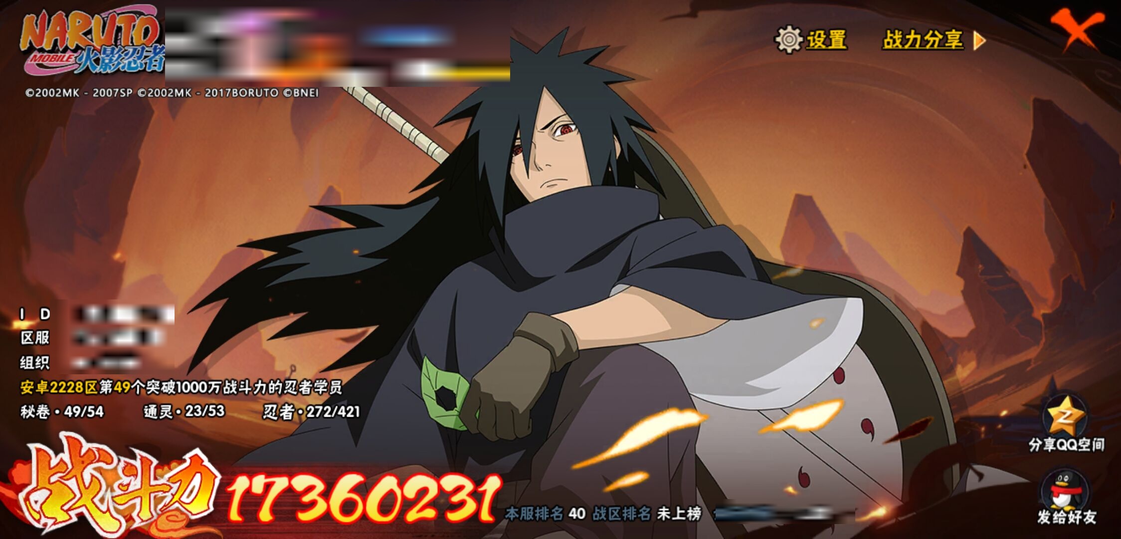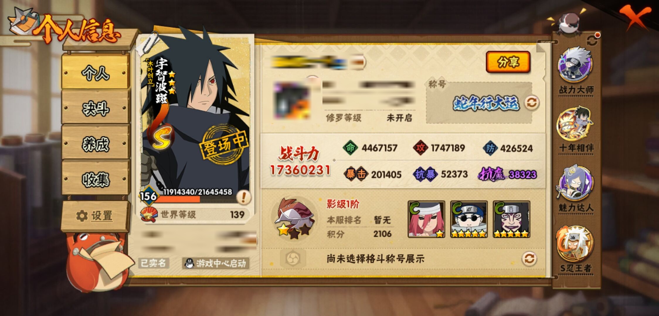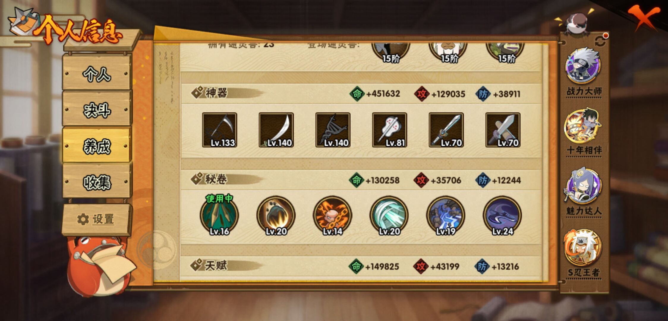 【火影忍者】【lyhy10790】战斗力:1736w;段位:影级1阶;本服排名:40;vip:v12级;s忍:41个;a忍:53个;通灵兽:21个,s忍:秽土转生解宇智波斑|白面具宇智波斑|忍界大战宇智波带土|须佐能乎旗木卡卡西|秽土转生千手扉间|超佩恩天道|九喇嘛连结波风水门|五影会谈宇智波斑|天道佩恩|传说中的三忍自来也|漩涡鸣人宇智波佐助|须佐能乎宇智波止水|秽土转生千手柱间|木叶创立宇智波斑|秽土转生宇智波鼬|永恒万花筒宇智波佐助|最终章大筒木舍人|仙人模式自来也|木叶创立千手柱间|忍界大战艾|舞之豪杰自来也|大蛇丸(普通) 4星|纲手(普通) 4星|波风水门 4星|秽土转生波风水门|秽土转生宇智波斑|须佐能乎宇智波鼬|红夜之刃神秘面具男|四代目风影罗砂|仙人模式药师兜|死门迈特凯|忍界大战大野木|忍界大战春野樱|九喇嘛连结漩涡鸣人|博人传大筒木金式|大筒木桃式|猿飞日斩(普通) 5星|秽土转生猿飞日斩|自来也(普通)|暴怒第六尾漩涡鸣人|初代目风影烈斗__a忍:青春爆炸迈特凯|幻之真容旗木卡卡西|忍界大战李洛克|漂泊浪客佩恩六道|秽土转生角都|忍界大战日向宁次|四代目土影黑土|木叶上忍猿飞木叶丸|青年长门|秽土转生迪达拉|宇智波止水(普通)|新春限定宇智波止水|忍界大战奇拉比|青年波风水门|青年艾|漂泊武士千手扉间|忍界大战旗木卡卡西|近松十人卫千代|晓创生角都|须佐能乎宇智波佐助|九尾查克拉漩涡鸣人|晓大蛇丸|百豪春野樱|忍界大战秋道丁次|奇拉比(普通)|万花筒写轮眼宇智波佐助|五代目水影照美冥|五代目雷影达鲁伊|死司凭血飞段 4星|角都(普通)|地怨虞角都|疾风传我爱罗 4星|迪达拉(普通) 3星|飞段(普通) 4星|小南(普通)|仙人模式漩涡鸣人|万花筒写轮眼旗木卡卡西|迈特凯(普通) 5星|宇智波鼬(普通) 3星|夏日限定宇智波鼬|干柿鬼鲛(普通) 5星|桃地再不斩|秽土转生桃地再不斩|蝎(普通) 5星|绯流琥蝎|猿飞阿斯玛(普通) 5星|桃式显现漩涡博人|最终章日向雏田|六代目水影长十郎|宇智波泉奈|羁绊神农|忍界大战土台|初始形态机械鸣人__通灵兽:忍犬(普通)|蓝蛇|蛤蟆吉|忍龟|镰鼬|猿魔|砂之守鹤|山椒鱼|蜃|蛤蟆仙人|鲛鲨|蛤蟆健|蛞蝓(普通)|乌鸦(普通)|怒鬼无臂|蛤蟆龙|熊猫|蛤蟆广|梦貘|鹰|蜘蛛