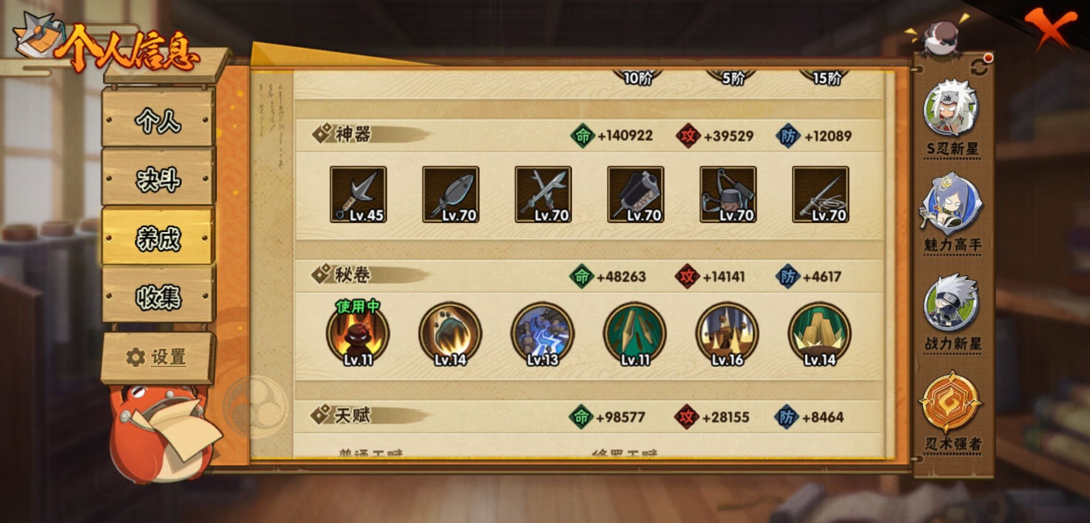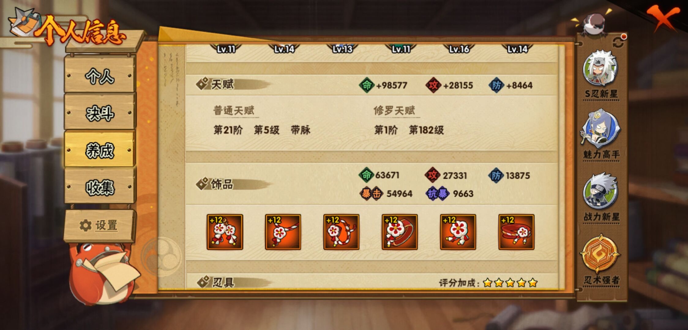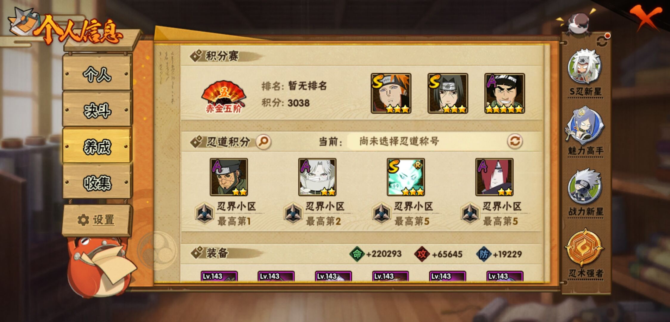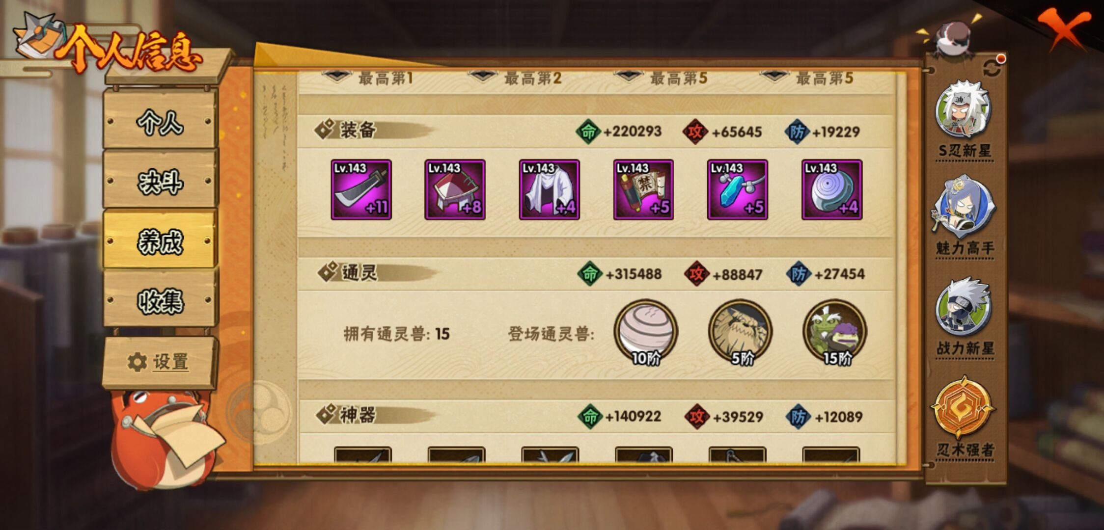 【火影忍者】【lyhy10802】战斗力:660w;段位:暗部1阶;vip:v7级;s忍:8个;a忍:26个;通灵兽:14个,s忍:白面具宇智波斑|须佐能乎旗木卡卡西|天道佩恩|漩涡鸣人宇智波佐助|最终章大筒木舍人|舞之豪杰自来也|秽土转生波风水门|须佐能乎宇智波鼬__a忍:青春爆炸迈特凯|忍界大战李洛克|秽土转生角都|火之意志继承者卑留呼|青年长门|近松十人卫千代|半蛇斗篷药师兜|须佐能乎宇智波佐助|火影继承人猿飞日斩|忍界大战秋道丁次|秽土转生猿飞阿斯玛|五代目水影照美冥|死司凭血飞段|疾风传我爱罗|飞段(普通)|迈特凯(普通) 5星|宇智波鼬(普通)|干柿鬼鲛(普通) 4星|绯流琥蝎|蝎(普通)|猿飞阿斯玛(普通) 5星|宇智波泉奈|羁绊神农|忍界大战土台|初始形态机械鸣人|侠隐江湖大野木__通灵兽:忍犬(普通)|蓝蛇|蛤蟆吉|忍龟|镰鼬|猿魔|山椒鱼|蜃|砂之守鹤|蛤蟆仙人|鲛鲨|蛤蟆健|乌鸦(普通)|蛤蟆龙