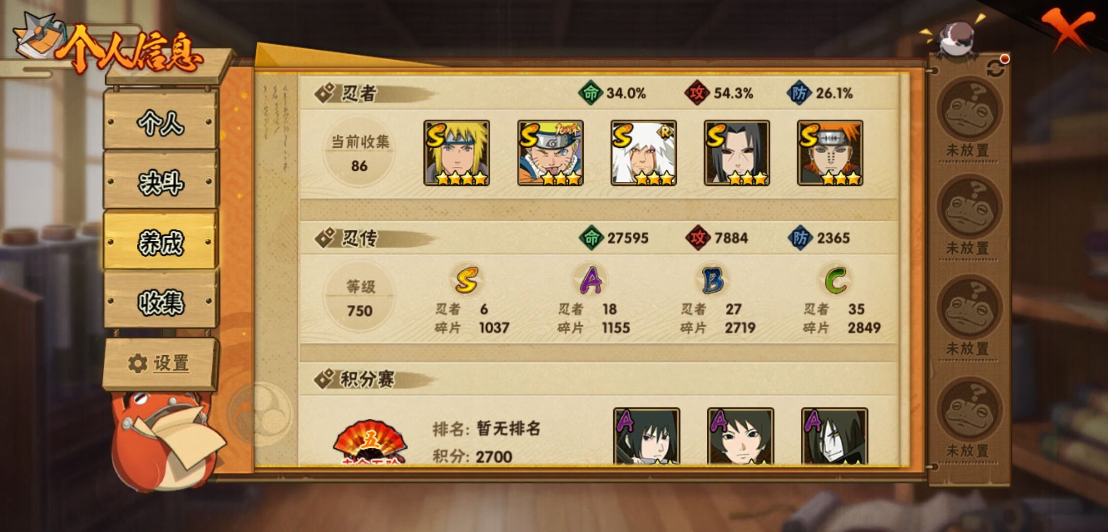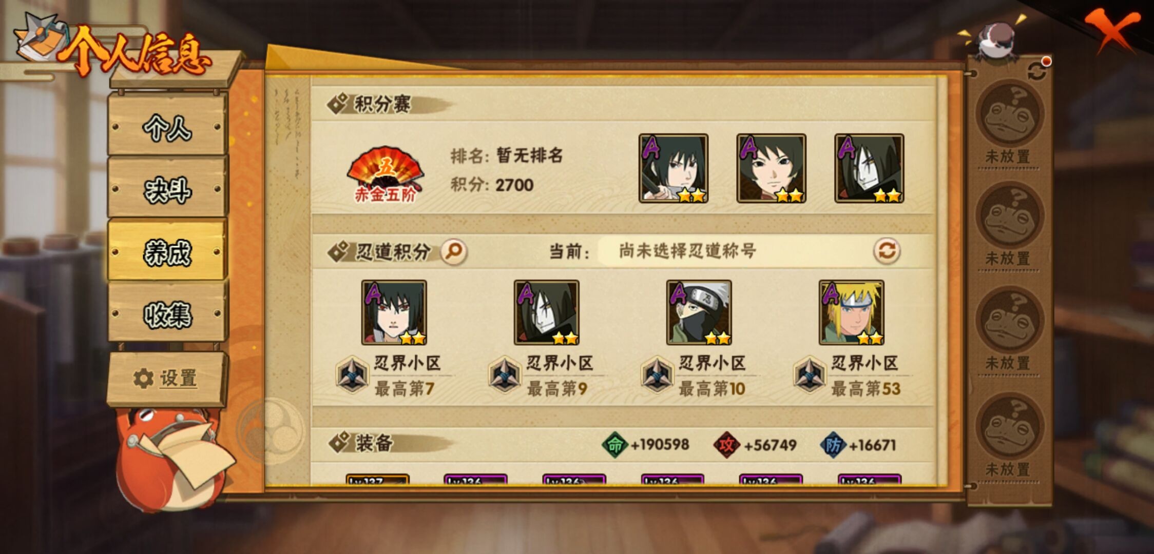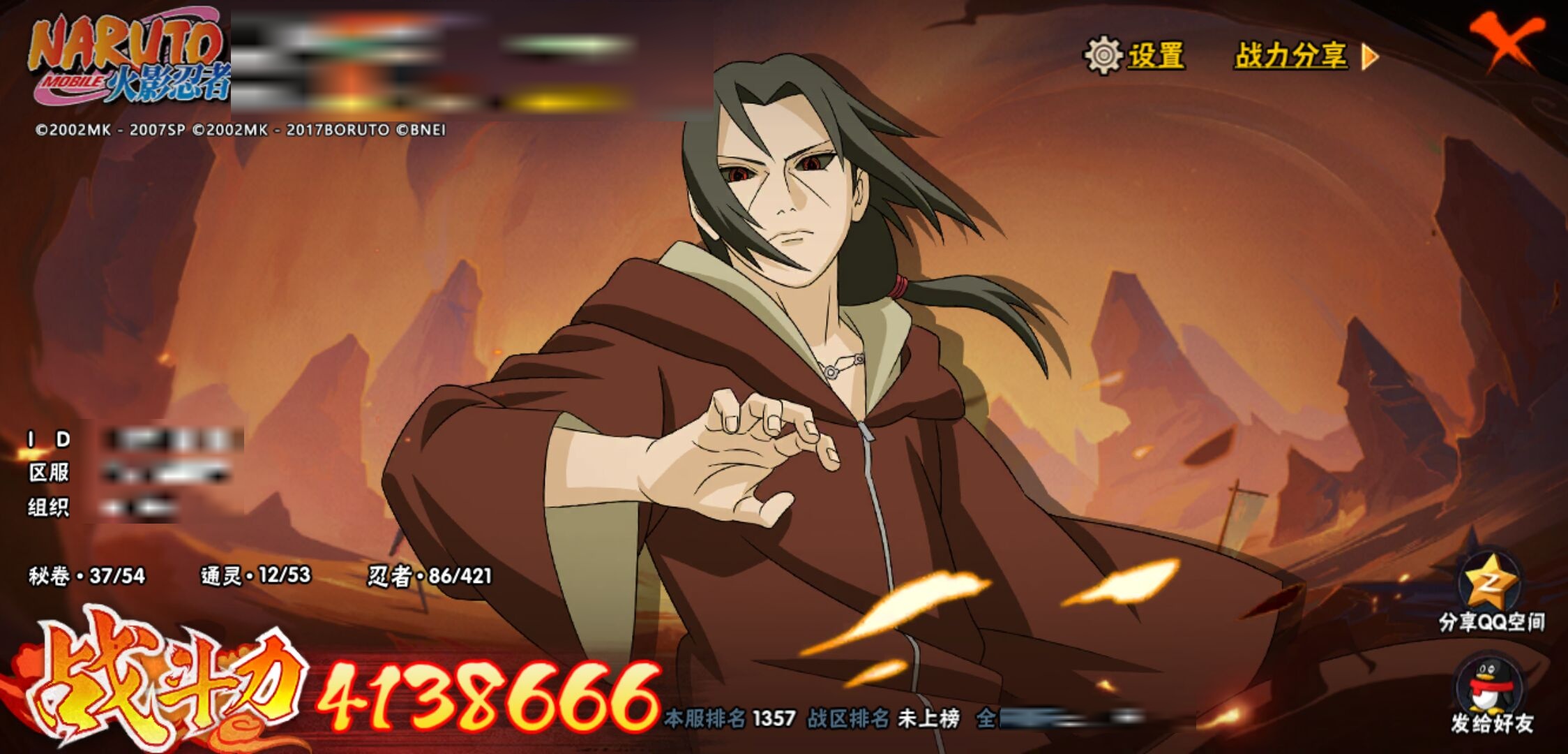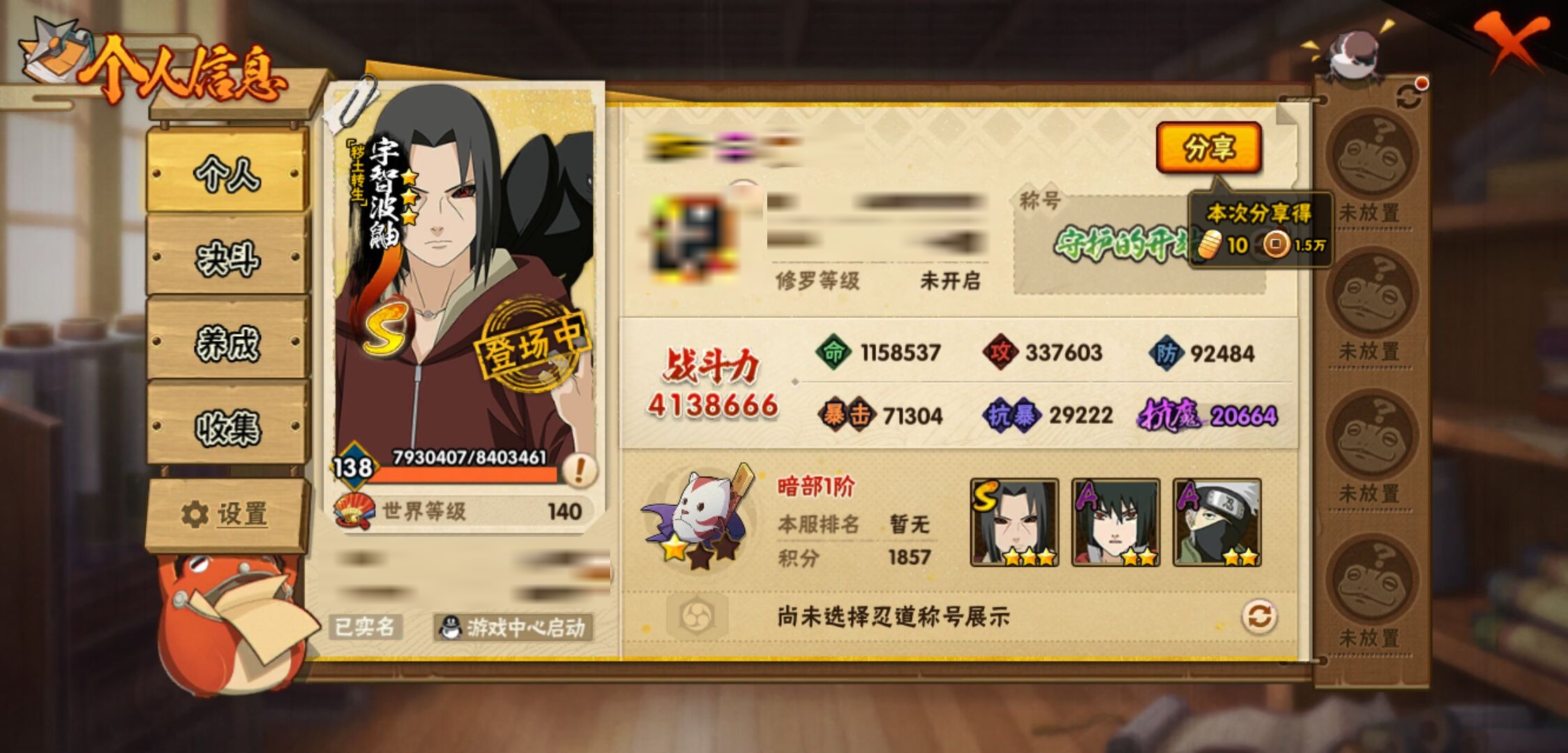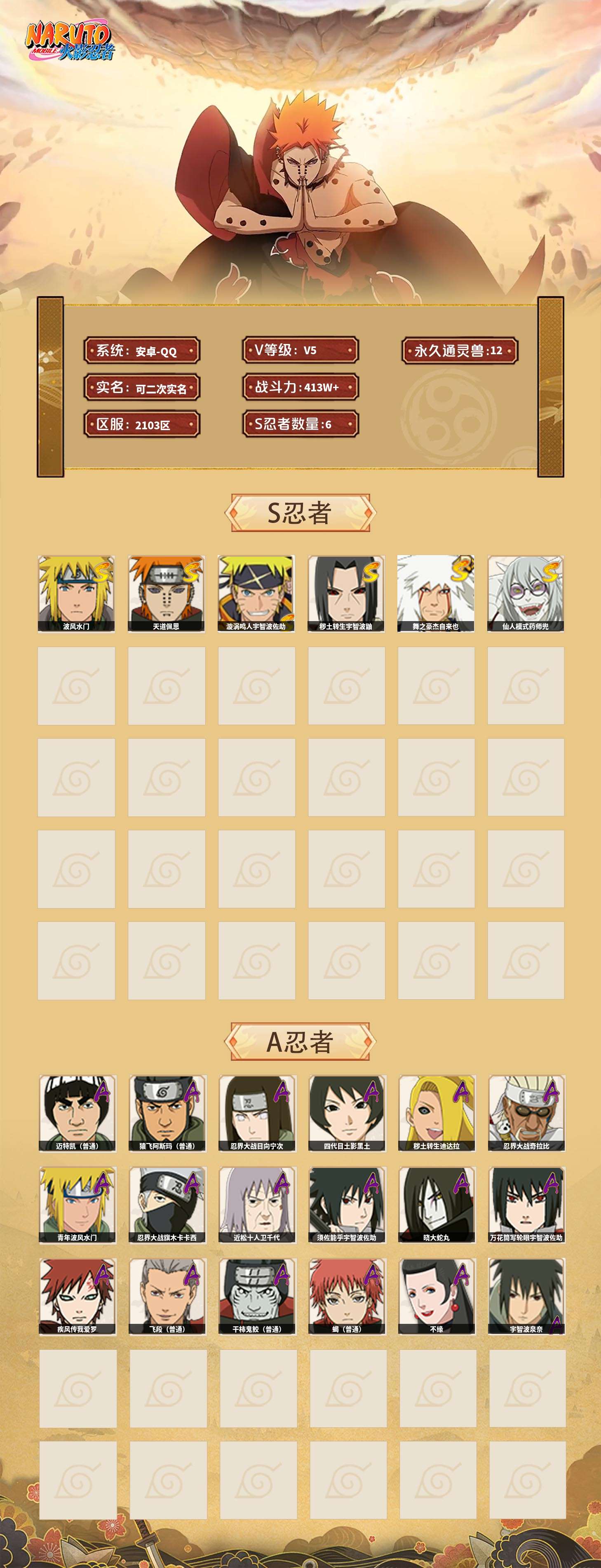 【火影忍者】【lyhy10815】战斗力:413w;段位:暗部1阶;vip:v5级;s忍:6个;a忍:18个;通灵兽:12个,s忍:天道佩恩|漩涡鸣人宇智波佐助|秽土转生宇智波鼬|舞之豪杰自来也|波风水门 4星|仙人模式药师兜__a忍:忍界大战日向宁次|四代目土影黑土|秽土转生迪达拉|忍界大战奇拉比|青年波风水门|忍界大战旗木卡卡西|近松十人卫千代|须佐能乎宇智波佐助|晓大蛇丸|万花筒写轮眼宇智波佐助|疾风传我爱罗|飞段(普通)|迈特凯(普通) 3星|干柿鬼鲛(普通)|蝎(普通)|猿飞阿斯玛(普通) 3星|不缘|宇智波泉奈__通灵兽:忍犬(普通)|蓝蛇|蛤蟆吉|忍龟|镰鼬|猿魔|砂之守鹤|山椒鱼|蜃|蛤蟆仙人|鲛鲨|蛤蟆健