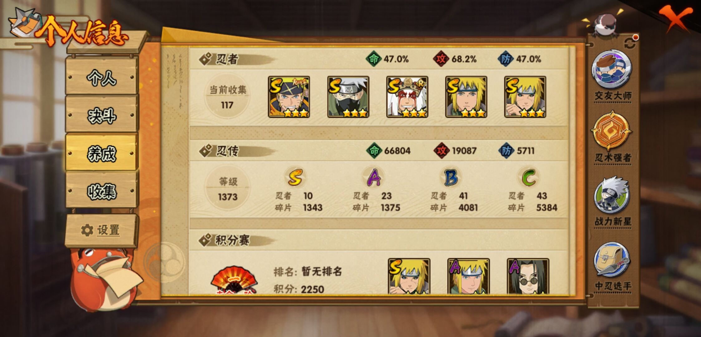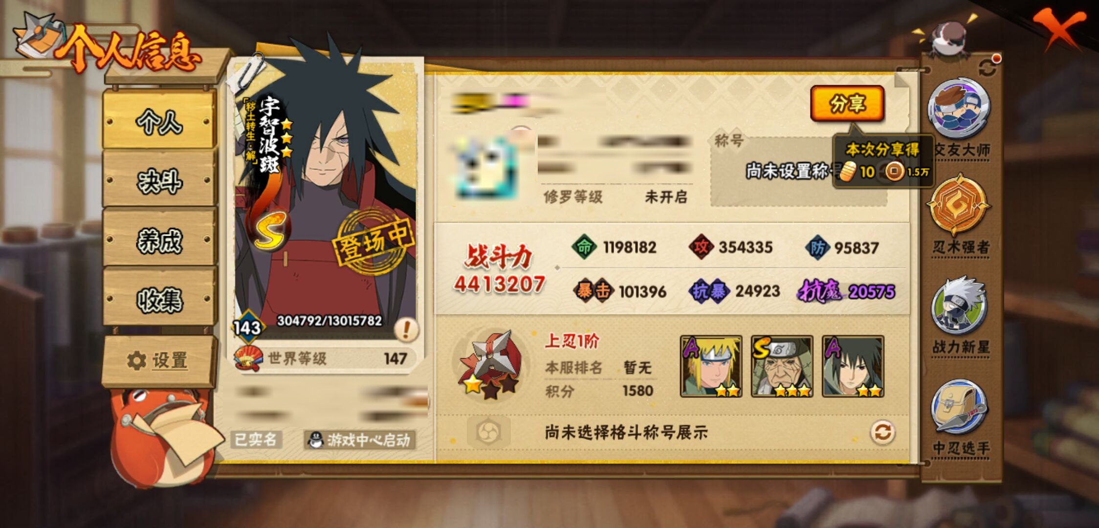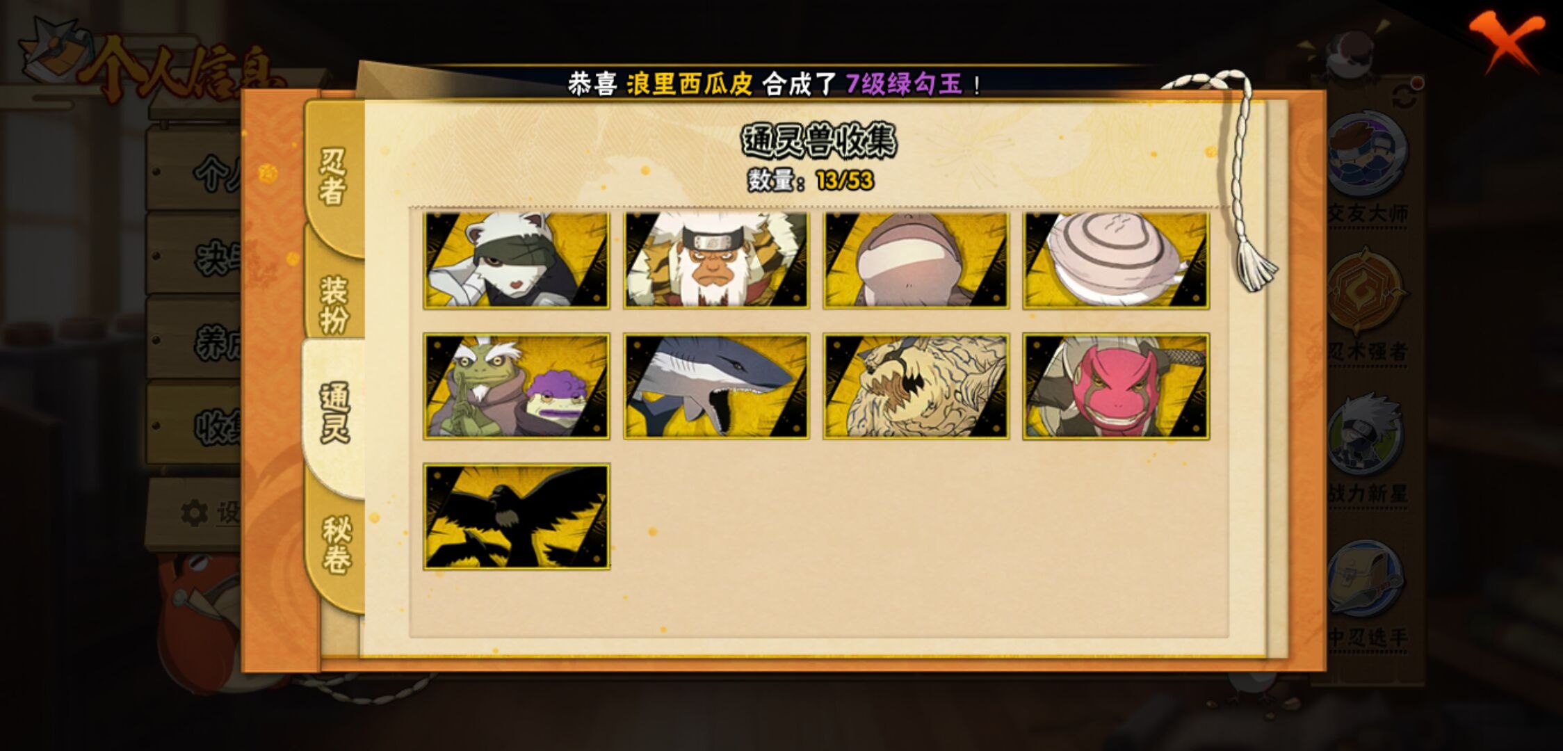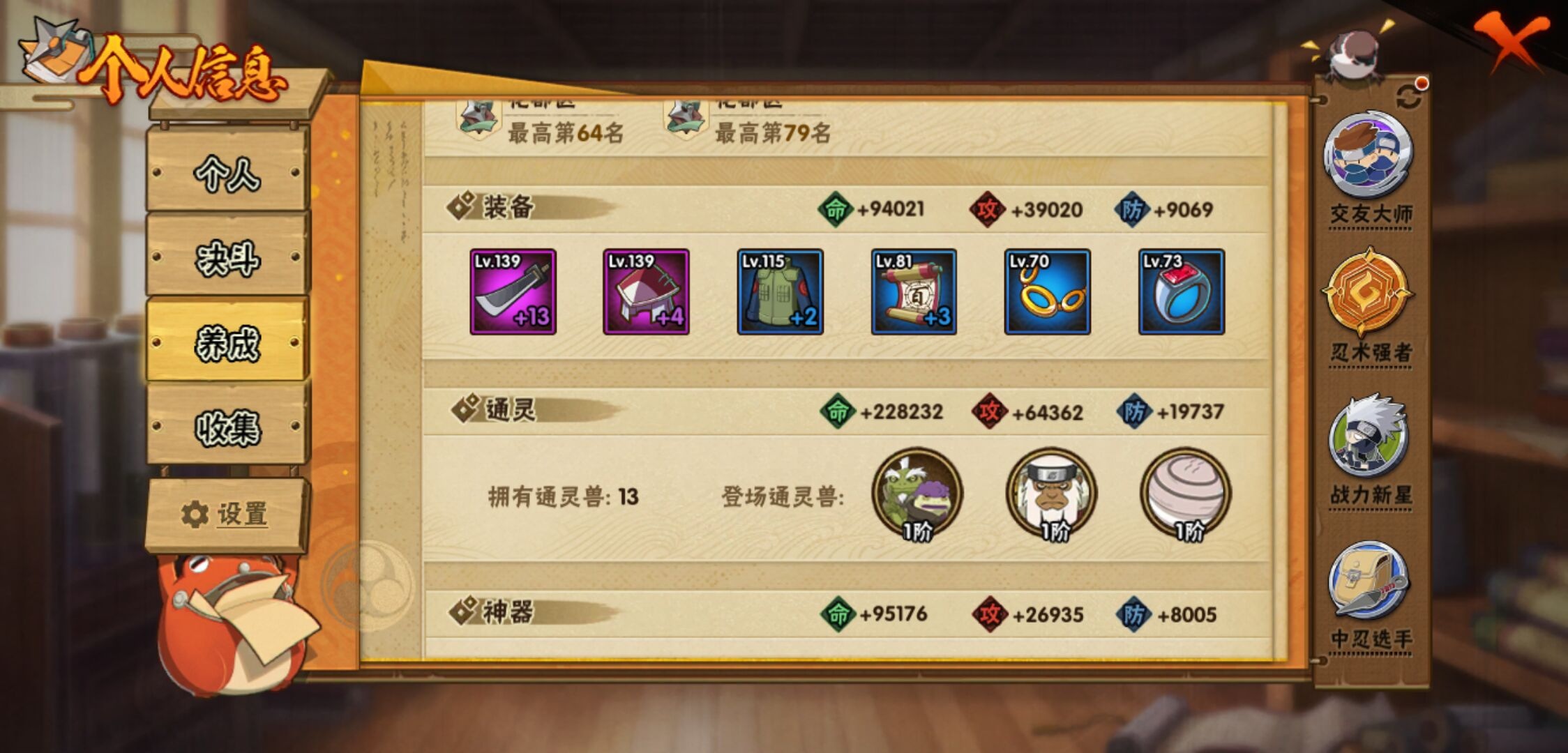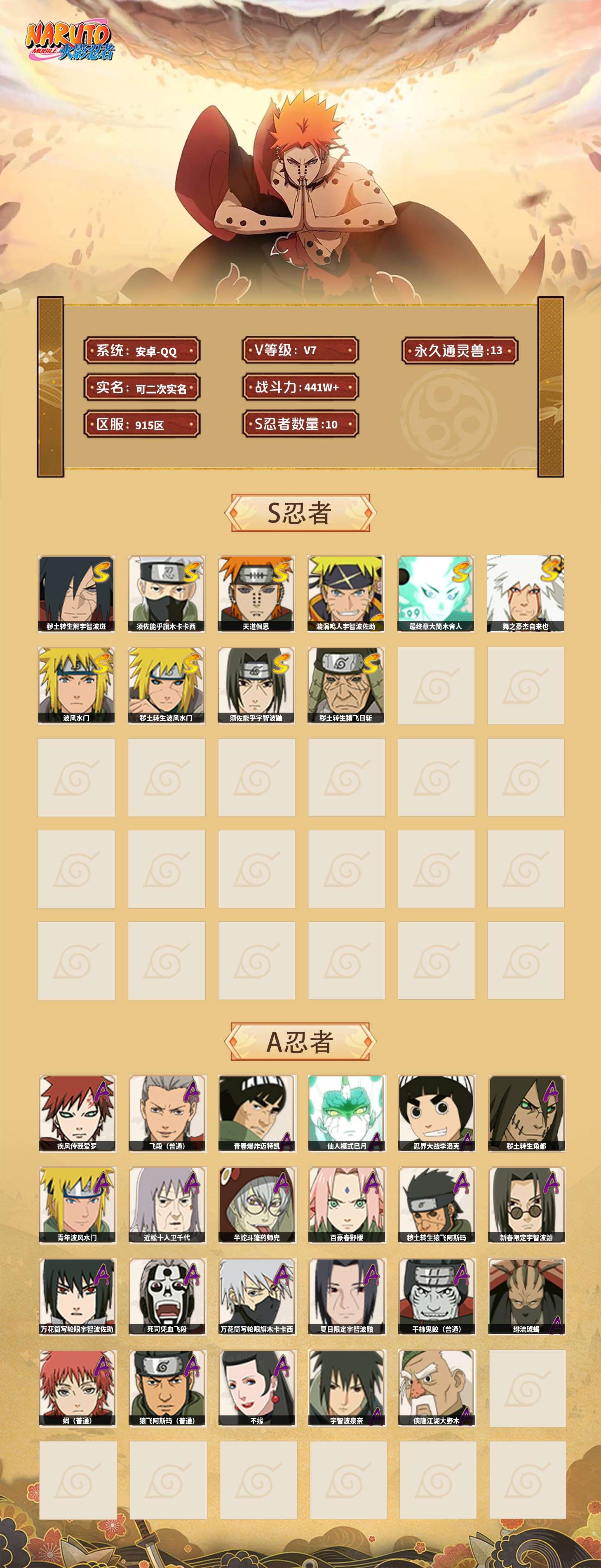 【火影忍者】【lyhy10843】战斗力:441w;段位:上忍1阶;本服排名:2094;vip:v7级;s忍:10个;a忍:23个;通灵兽:13个,s忍:秽土转生解宇智波斑|须佐能乎旗木卡卡西|天道佩恩|漩涡鸣人宇智波佐助|最终章大筒木舍人|舞之豪杰自来也|波风水门|秽土转生波风水门|须佐能乎宇智波鼬|秽土转生猿飞日斩__a忍:青春爆炸迈特凯|仙人模式巳月|忍界大战李洛克|秽土转生角都|青年波风水门|近松十人卫千代|半蛇斗篷药师兜|百豪春野樱|秽土转生猿飞阿斯玛|新春限定宇智波鼬|万花筒写轮眼宇智波佐助|死司凭血飞段|疾风传我爱罗 3星|飞段(普通) 3星|万花筒写轮眼旗木卡卡西|夏日限定宇智波鼬|干柿鬼鲛(普通)|绯流琥蝎|蝎(普通)|猿飞阿斯玛(普通)|不缘|宇智波泉奈|侠隐江湖大野木__通灵兽:忍犬(普通)|蓝蛇|蛤蟆吉|忍龟|镰鼬|猿魔|山椒鱼|蜃|蛤蟆仙人|鲛鲨|砂之守鹤|蛤蟆健|乌鸦(普通)