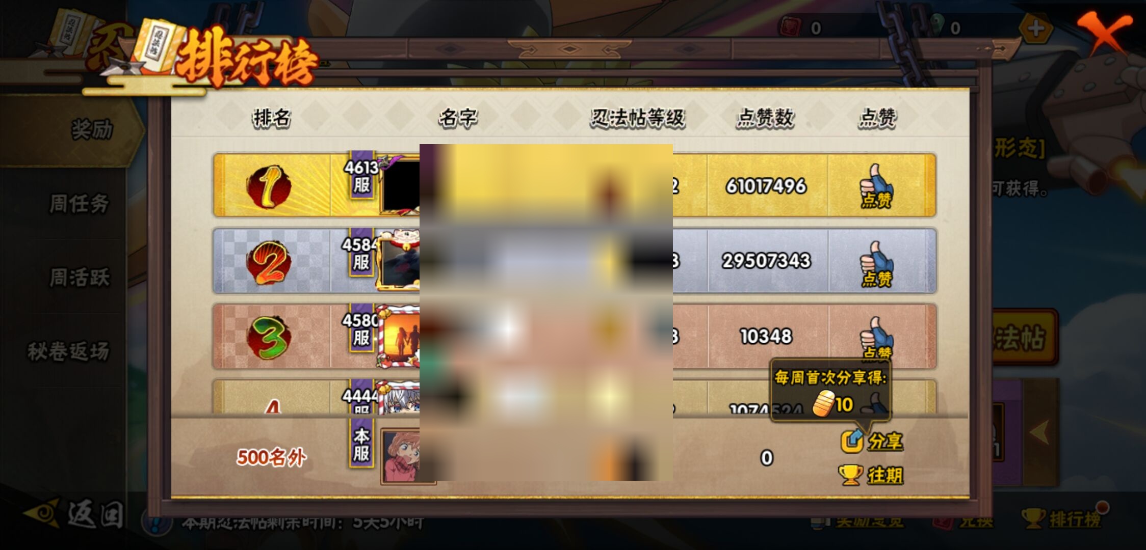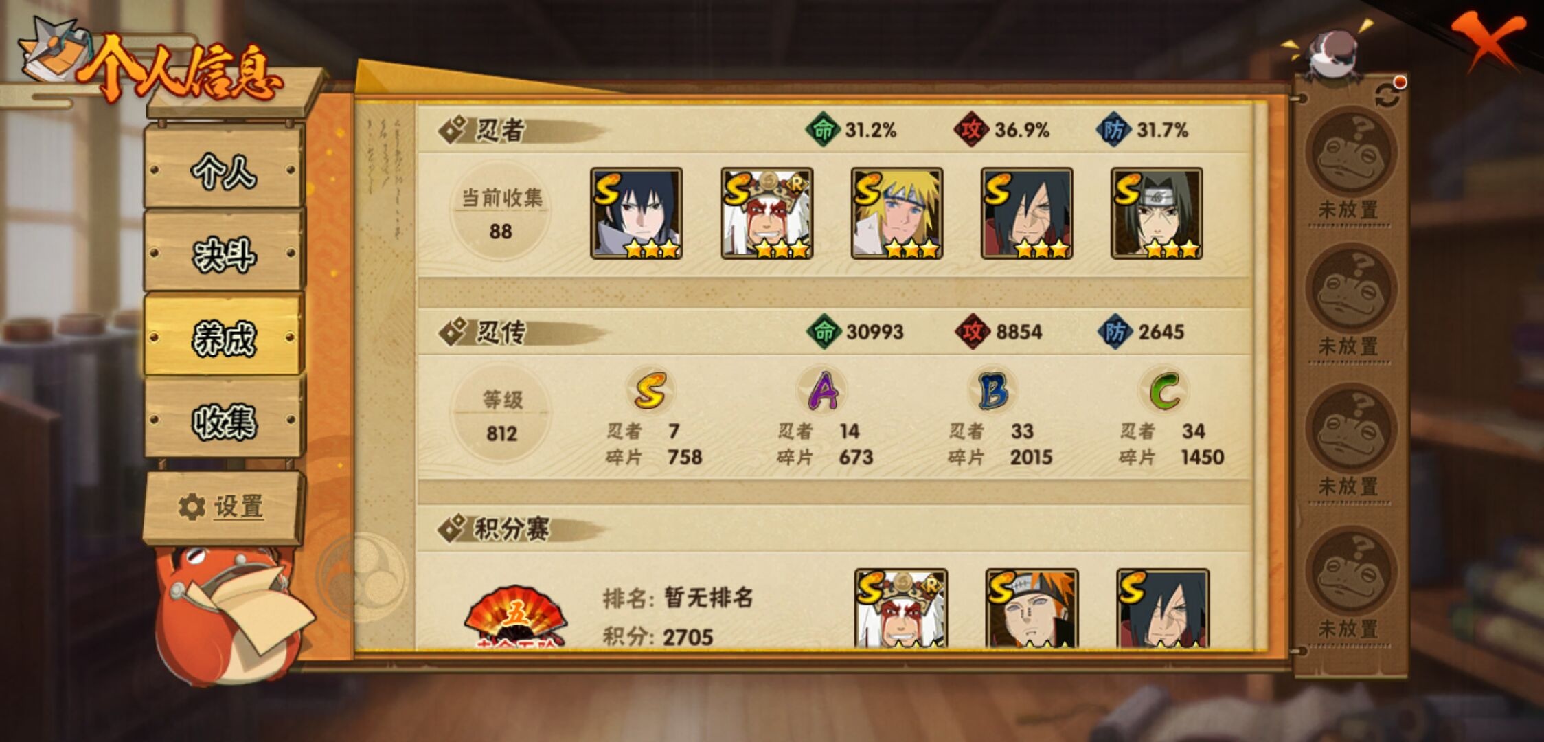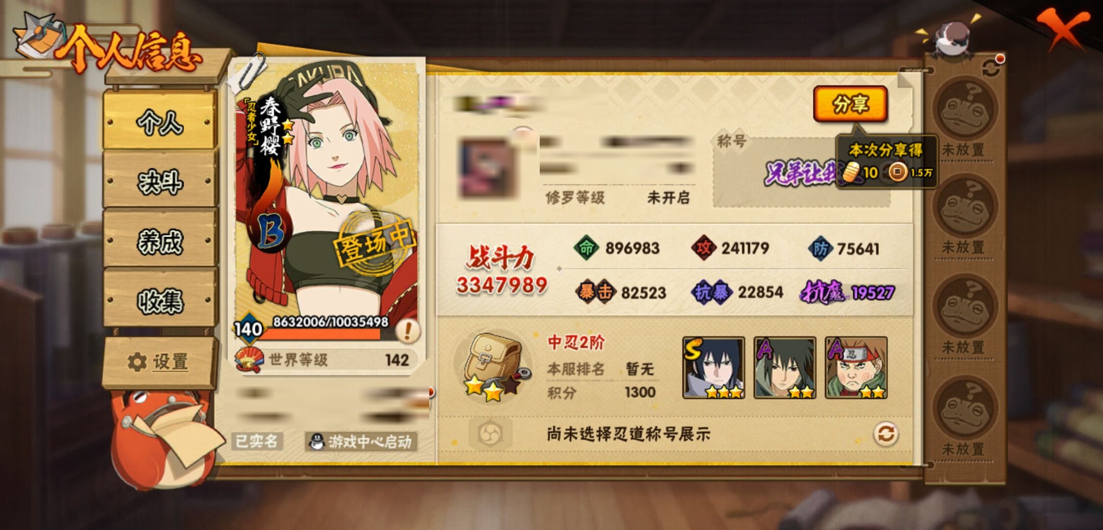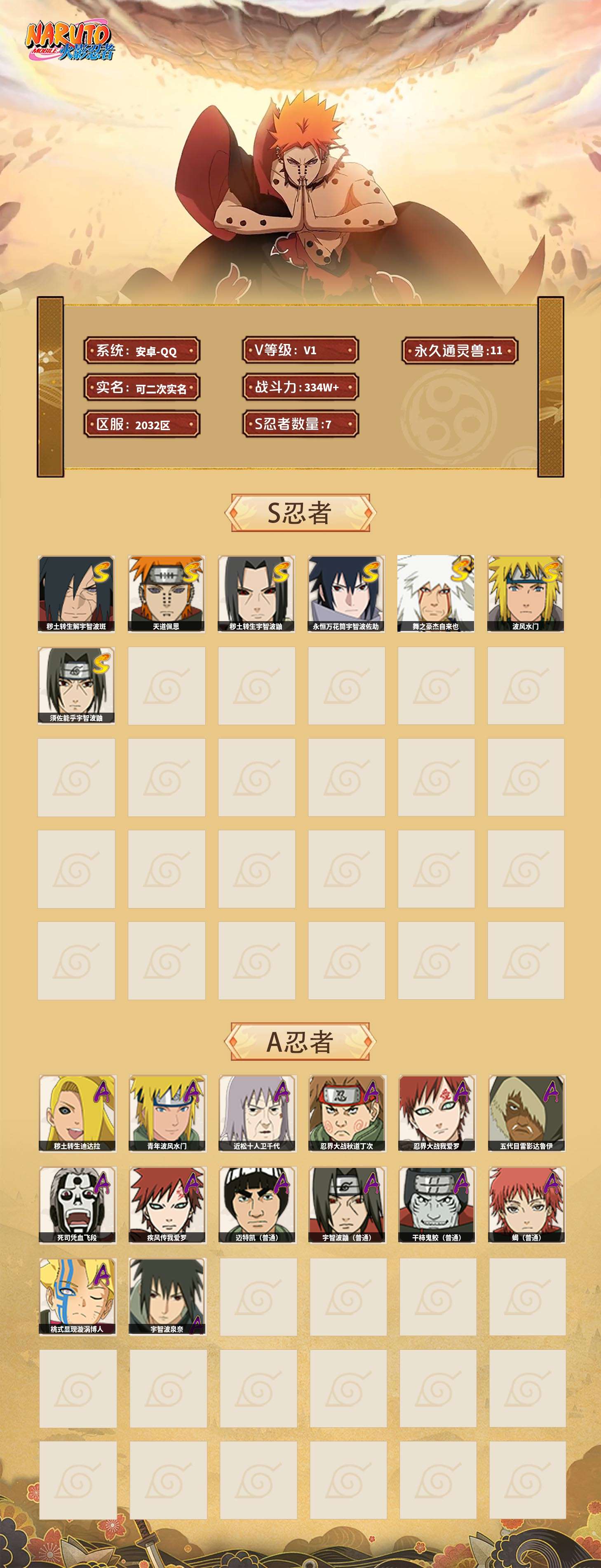 【火影忍者】【lyhy10850】战斗力:334w;段位:中忍2阶;本服排名:2279;vip:v1级;s忍:7个;a忍:14个;通灵兽:11个,s忍:秽土转生解宇智波斑|天道佩恩|秽土转生宇智波鼬|永恒万花筒宇智波佐助|舞之豪杰自来也|波风水门|须佐能乎宇智波鼬__a忍:秽土转生迪达拉|青年波风水门|近松十人卫千代|忍界大战秋道丁次|忍界大战我爱罗|五代目雷影达鲁伊|死司凭血飞段|疾风传我爱罗|迈特凯(普通)|宇智波鼬(普通)|干柿鬼鲛(普通)|蝎(普通)|桃式显现漩涡博人|宇智波泉奈__通灵兽:忍犬(普通)|蓝蛇|蛤蟆吉|砂之守鹤|忍龟|镰鼬|猿魔|山椒鱼|蜃|蛤蟆仙人|鲛鲨