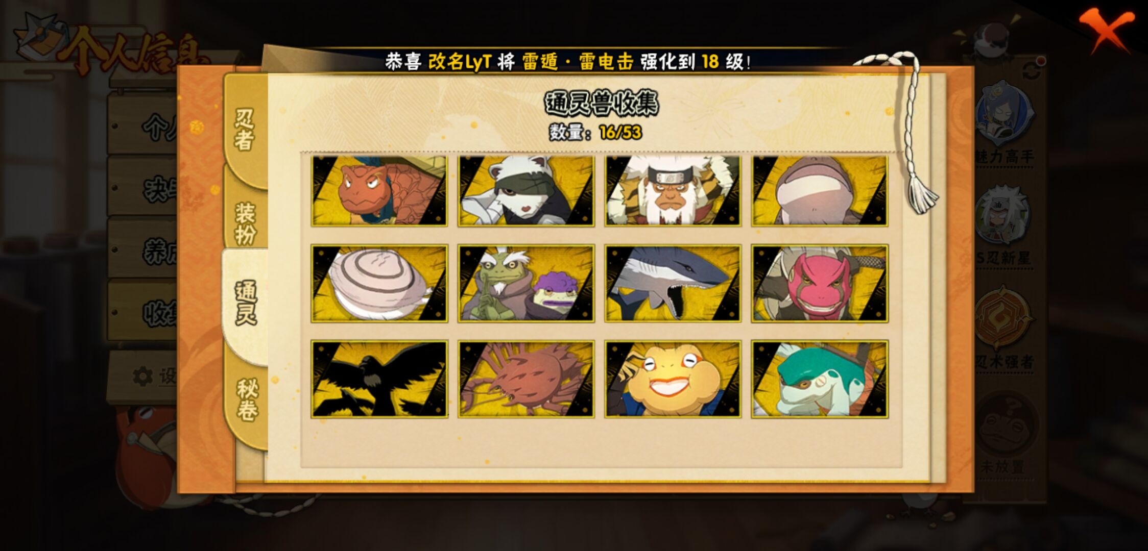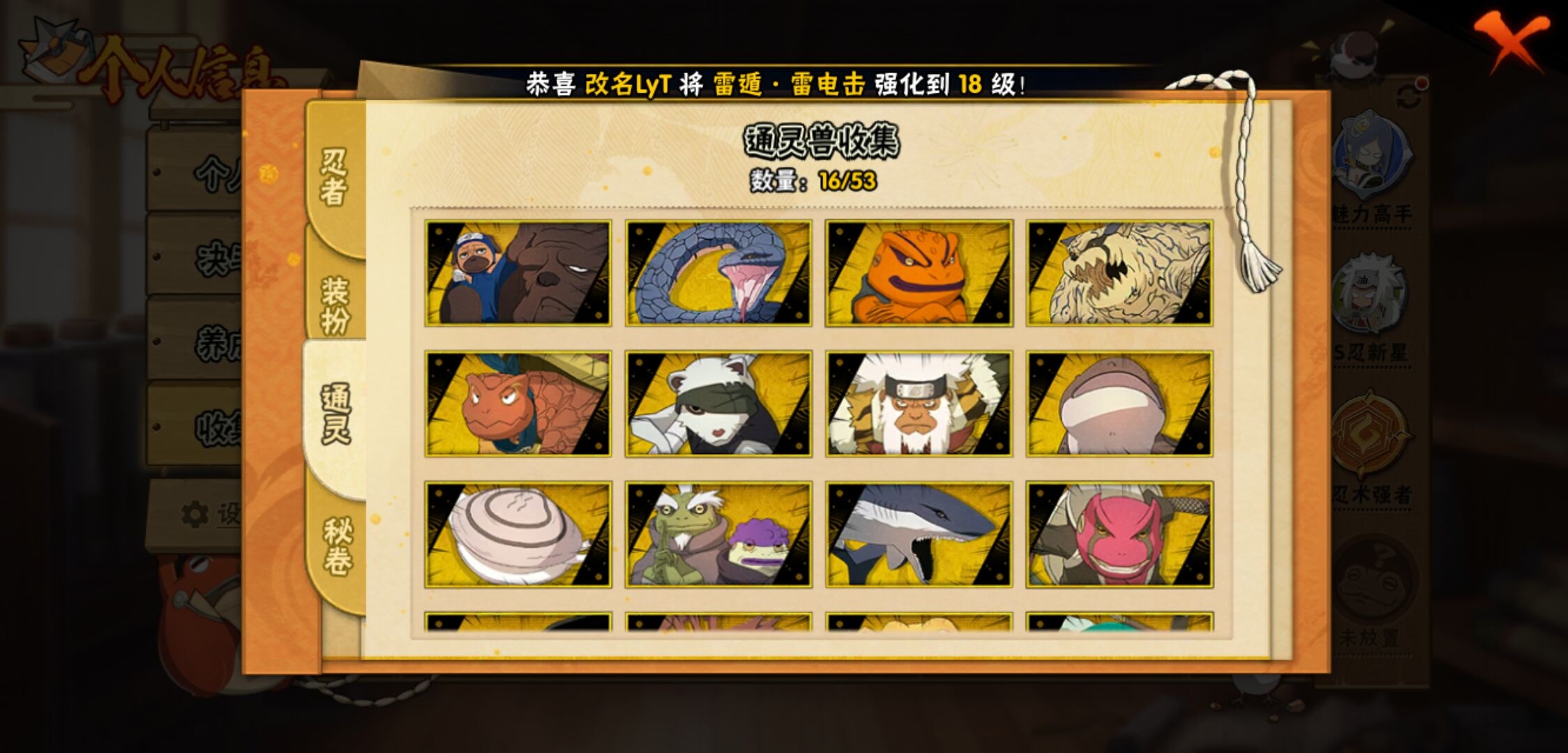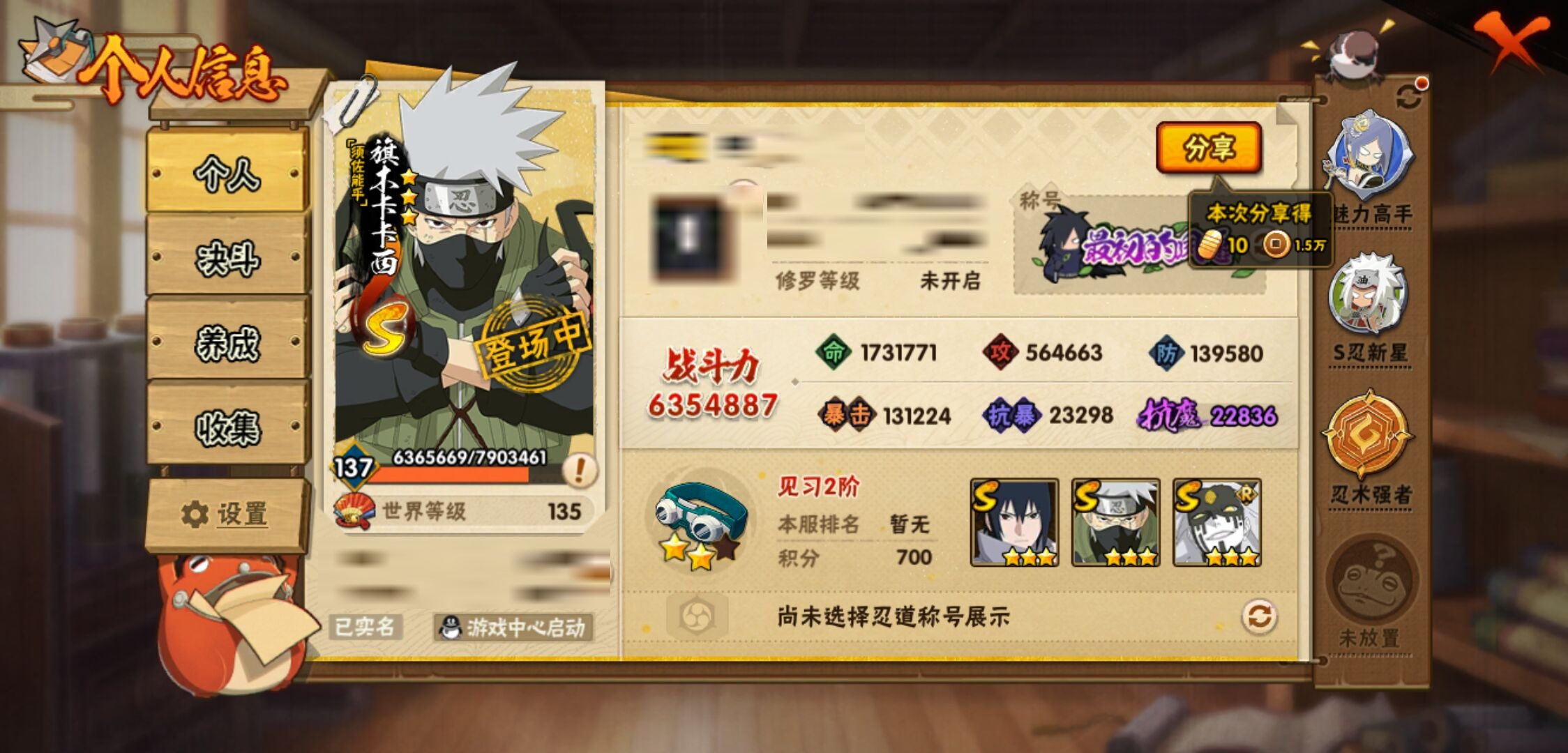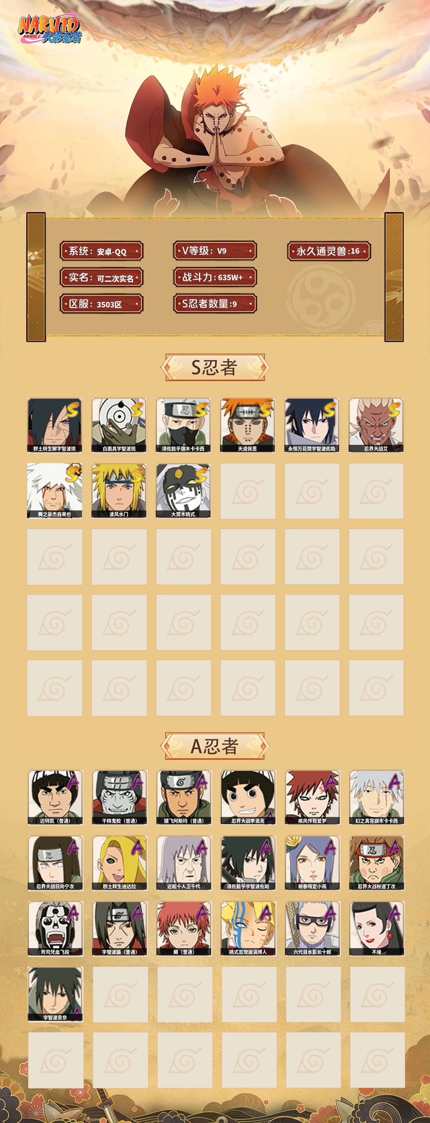 【火影忍者】【lyhy10852】战斗力:635w;段位:见习2阶;本服排名:1247;vip:v9级;s忍:9个;a忍:19个;通灵兽:16个,s忍:秽土转生解宇智波斑|白面具宇智波斑|须佐能乎旗木卡卡西|天道佩恩|永恒万花筒宇智波佐助|忍界大战艾|舞之豪杰自来也|波风水门|大筒木桃式__a忍:幻之真容旗木卡卡西|忍界大战李洛克 3星|忍界大战日向宁次|秽土转生迪达拉|近松十人卫千代|须佐能乎宇智波佐助|新春限定小南|忍界大战秋道丁次|死司凭血飞段|疾风传我爱罗 3星|迈特凯(普通) 5星|宇智波鼬(普通)|干柿鬼鲛(普通) 5星|蝎(普通)|猿飞阿斯玛(普通) 5星|桃式显现漩涡博人|六代目水影长十郎|不缘|宇智波泉奈__通灵兽:忍犬(普通)|蓝蛇|蛤蟆吉|砂之守鹤|忍龟|镰鼬|猿魔|山椒鱼|蜃|蛤蟆仙人|鲛鲨|蛤蟆健|乌鸦(普通)|螃蟹|蛤蟆龙|蛤蟆广