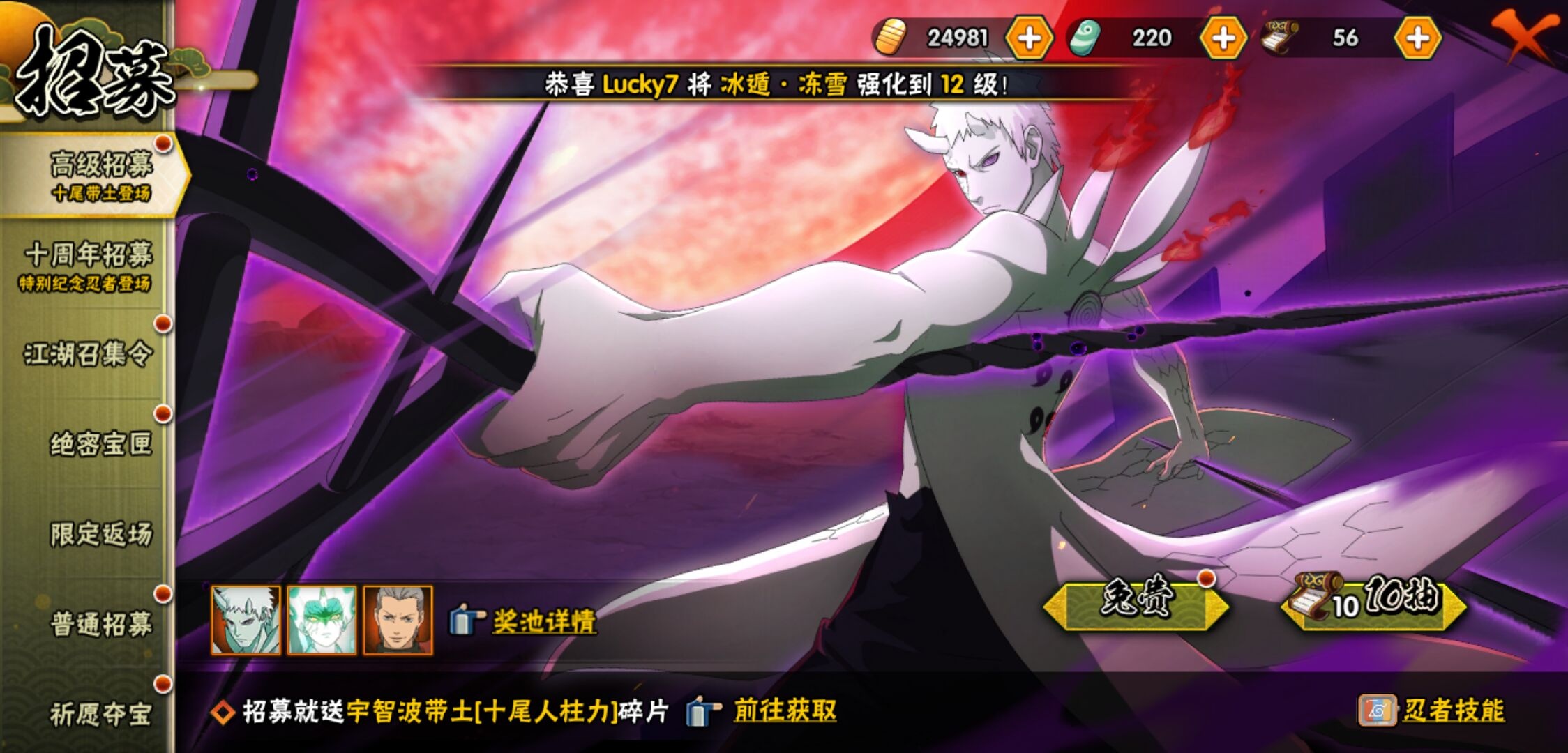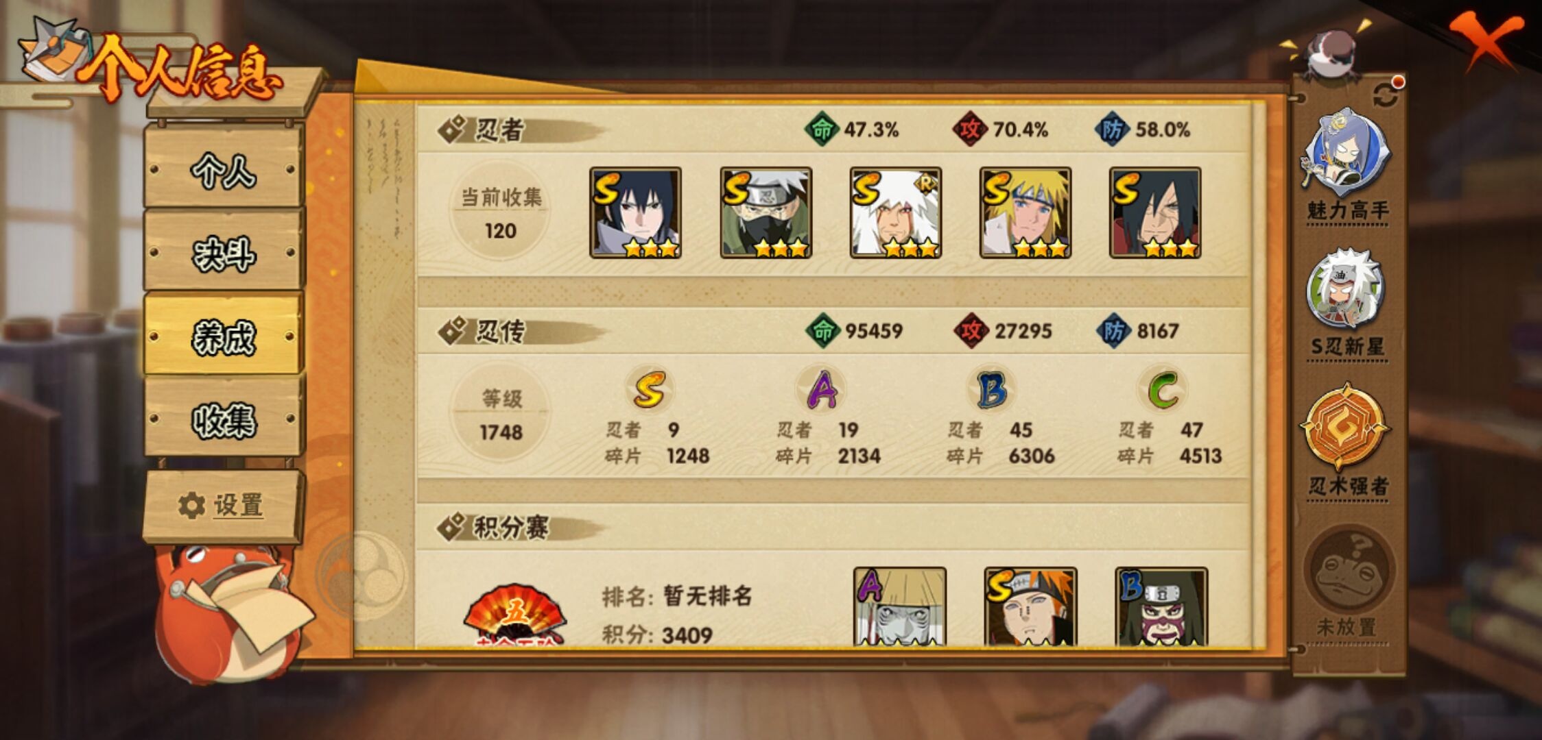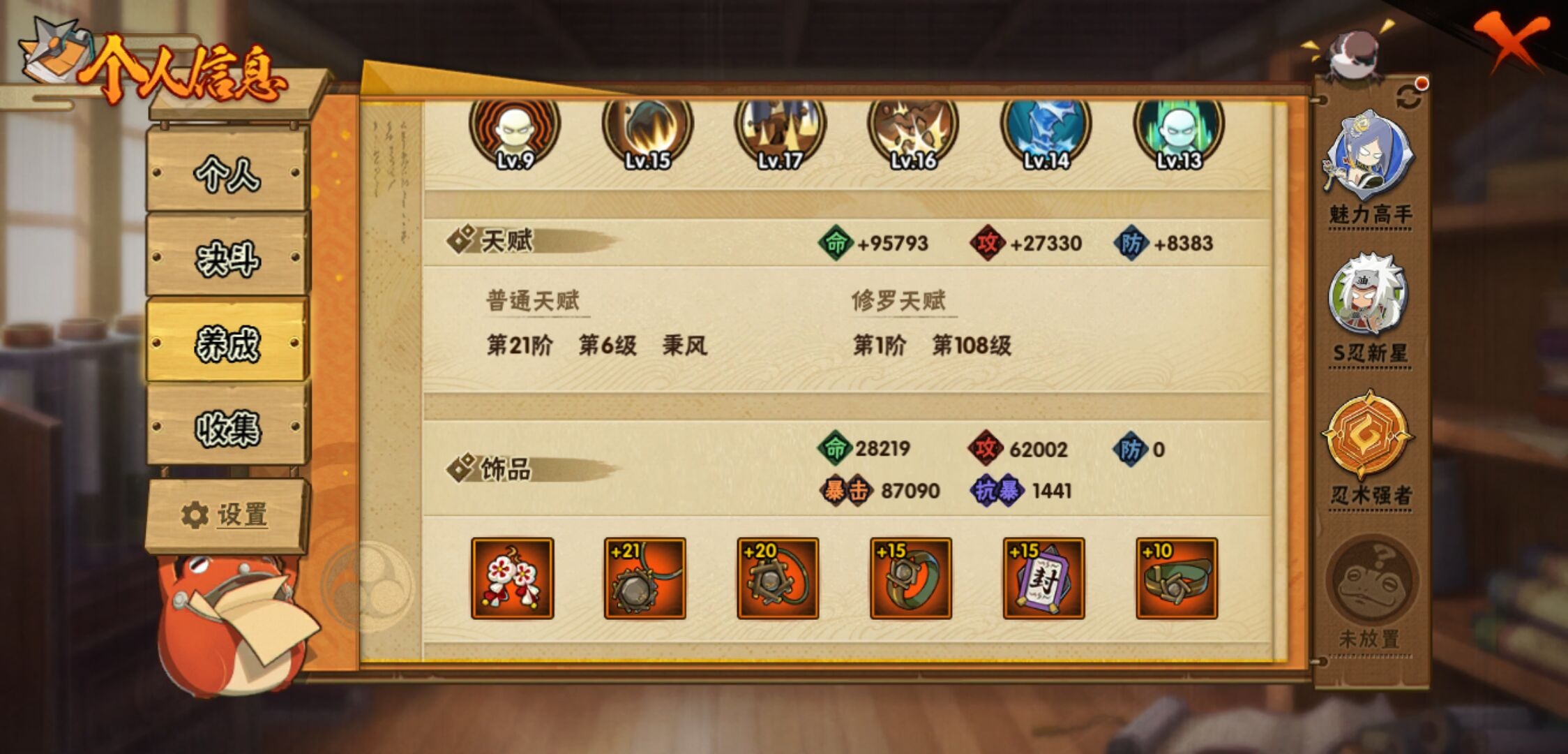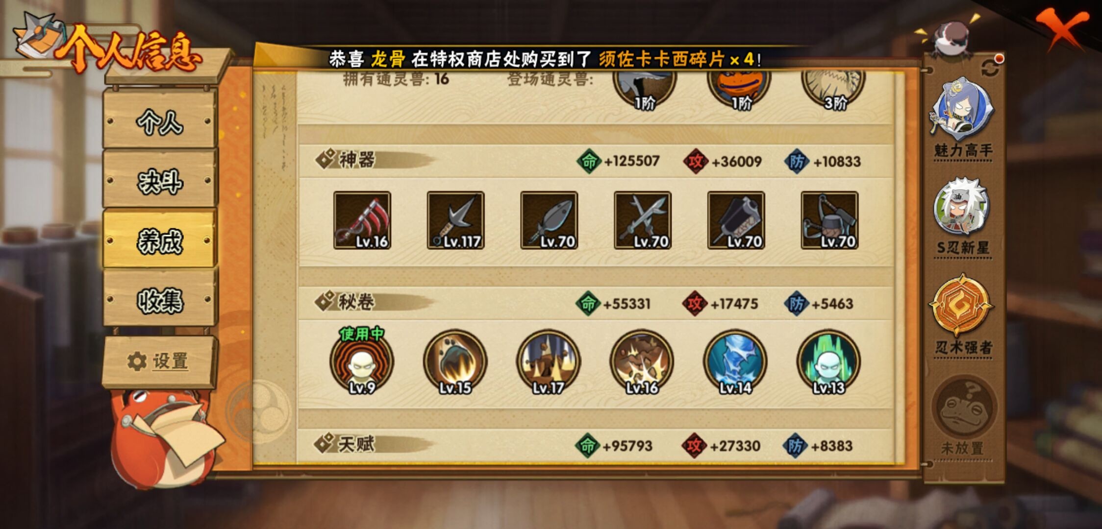【火影忍者】【lyhy10852】战斗力:635w;段位:见习2阶;本服排名:1247;vip:v9级;s忍:9个;a忍:19个;通灵兽:16个,s忍:秽土转生解宇智波斑|白面具宇智波斑|须佐能乎旗木卡卡西|天道佩恩|永恒万花筒宇智波佐助|忍界大战艾|舞之豪杰自来也|波风水门|大筒木桃式__a忍:幻之真容旗木卡卡西|忍界大战李洛克 3星|忍界大战日向宁次|秽土转生迪达拉|近松十人卫千代|须佐能乎宇智波佐助|新春限定小南|忍界大战秋道丁次|死司凭血飞段|疾风传我爱罗 3星|迈特凯(普通) 5星|宇智波鼬(普通)|干柿鬼鲛(普通) 5星|蝎(普通)|猿飞阿斯玛(普通) 5星|桃式显现漩涡博人|六代目水影长十郎|不缘|宇智波泉奈__通灵兽:忍犬(普通)|蓝蛇|蛤蟆吉|砂之守鹤|忍龟|镰鼬|猿魔|山椒鱼|蜃|蛤蟆仙人|鲛鲨|蛤蟆健|乌鸦(普通)|螃蟹|蛤蟆龙|蛤蟆广
