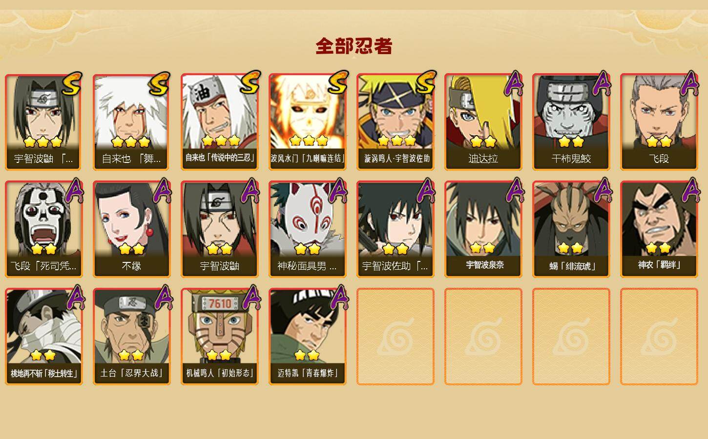 【hy370】5s级忍者数-15a级忍者数 【s级忍者】:宇智波鼬「须佐能乎」3星,自来也「舞之豪杰」3星,自来也「传说中的三忍」3星,波风水门「九喇嘛连结」3星,漩涡鸣人·宇智波佐助3星 【a级忍者】:迪达拉2星,飞段2星,飞段「死司凭血」2星,干柿鬼鲛2星,机械鸣人「初始形态」2星,桃地再不斩「秽土转生」2星,蝎「绯流琥」2星,宇智波鼬2星,宇智波佐助「须佐能乎」2星,神秘面具男「忍者之路」2星,神农「羁绊」2星,土台「忍界大战」2星,不缘2星,宇智波泉奈2星,迈特凯「青春爆炸」2星
