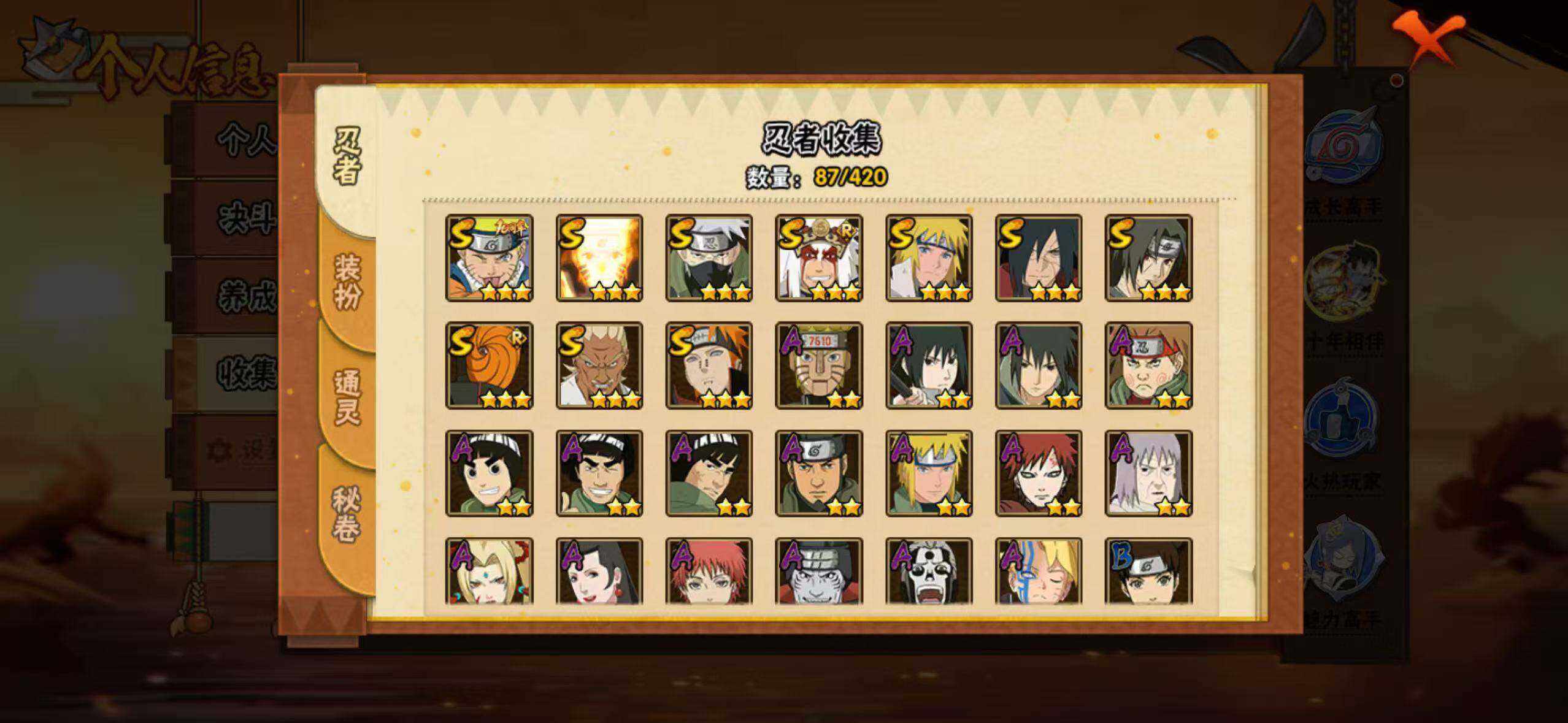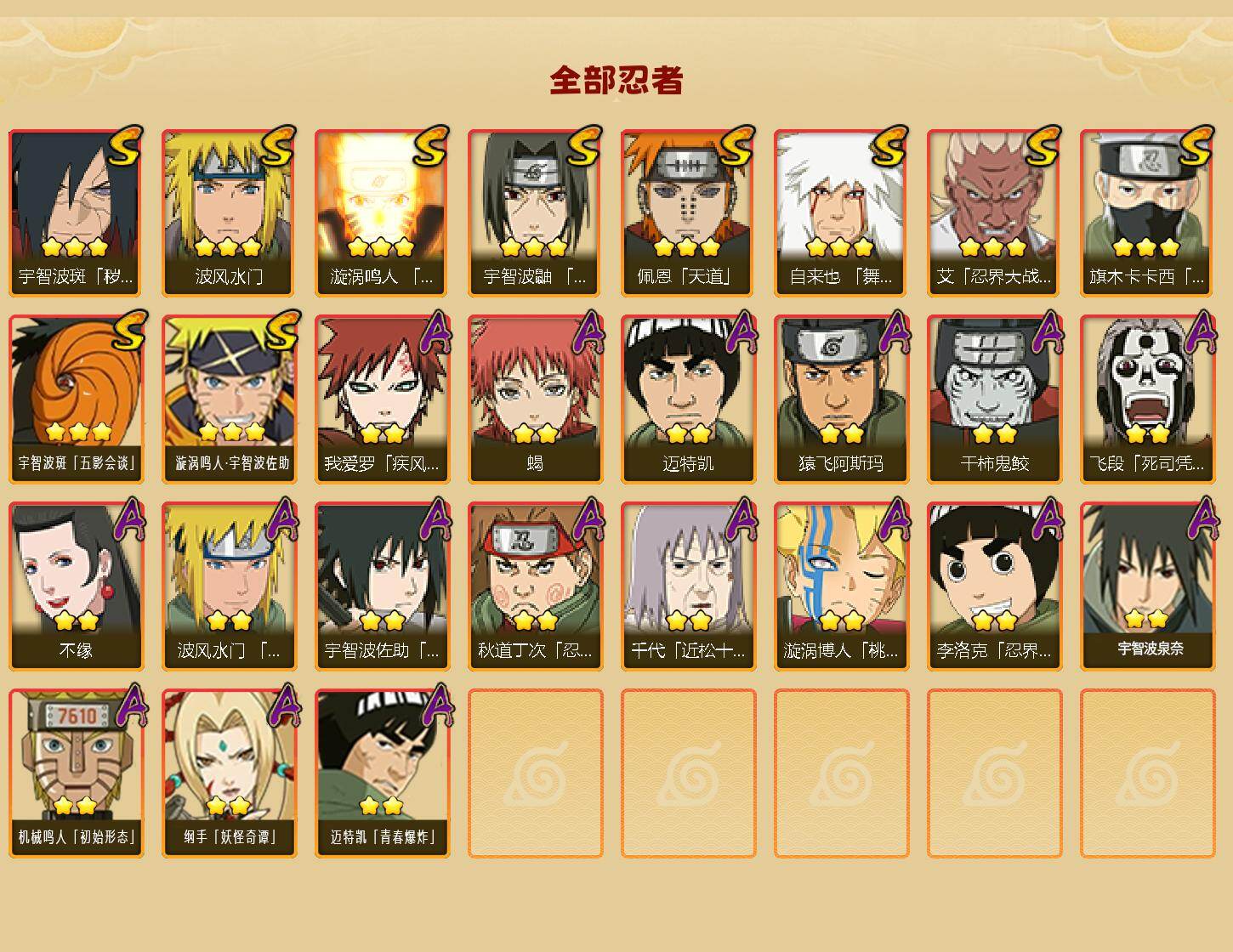 【hy467】10s级忍者数-17a级忍者数 【s级忍者】:宇智波斑「秽土转生·解」3星,艾「忍界大战」3星,宇智波鼬「须佐能乎」3星,旗木卡卡西「须佐能乎」3星,自来也「舞之豪杰」3星,波风水门3星,漩涡鸣人「九喇嘛连结」3星,佩恩「天道」3星,宇智波斑「五影会谈」3星,漩涡鸣人·宇智波佐助3星 【a级忍者】:波风水门「青年」2星,飞段「死司凭血」2星,干柿鬼鲛2星,漩涡博人「桃式显现」2星,机械鸣人「初始形态」2星,迈特凯2星,我爱罗「疾风传」2星,蝎2星,猿飞阿斯玛2星,宇智波佐助「须佐能乎」2星,李洛克「忍界大战」2星,秋道丁次「忍界大战」2星,千代「近松十人卫」2星,不缘2星,宇智波泉奈2星,纲手「妖怪奇谭」2星,迈特凯「青春爆炸」2星