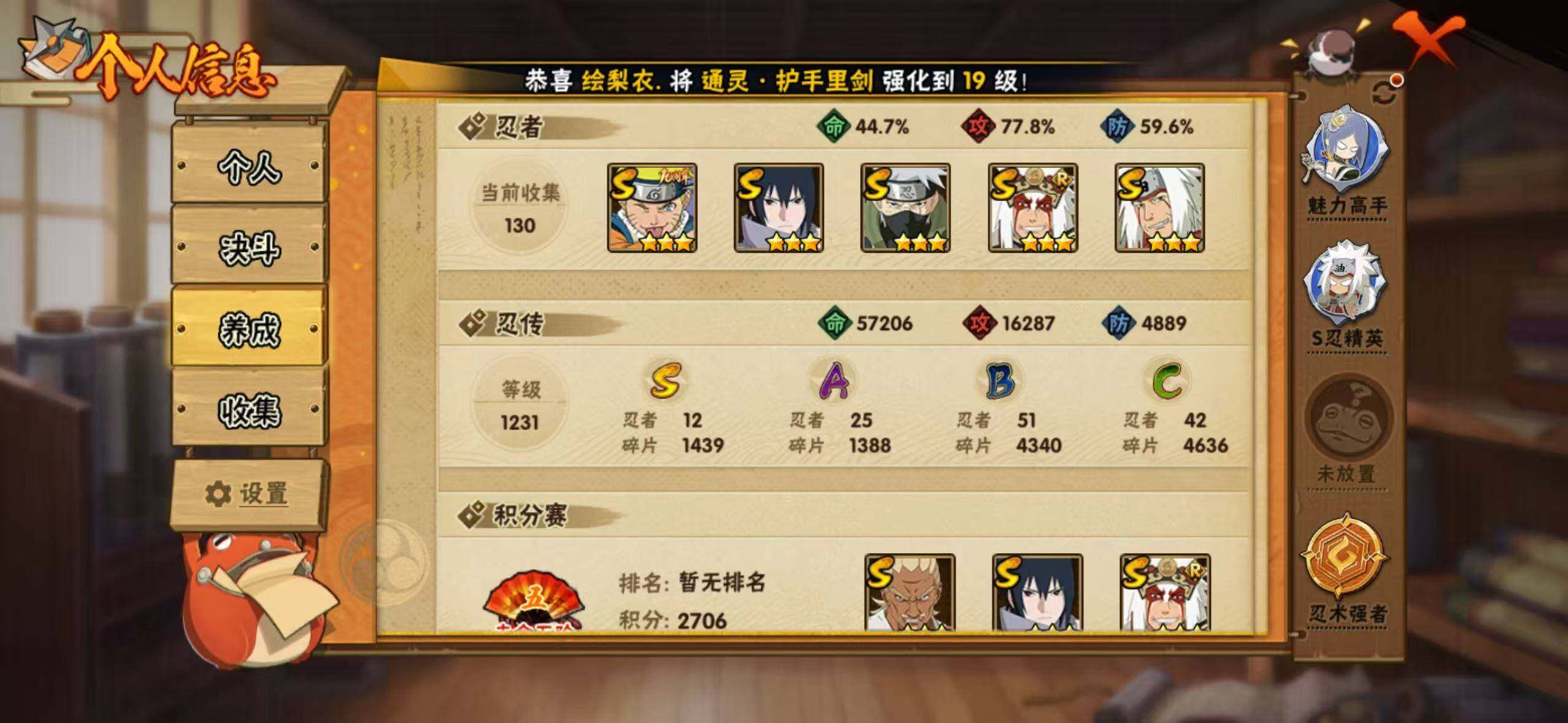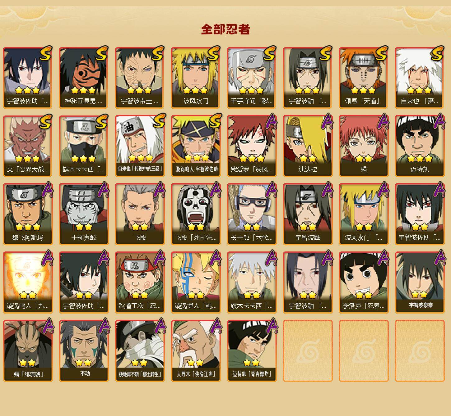 【hy440】12s-25a 【s级忍者】:千手扉间「秽土转生」3星,宇智波带土「忍界大战」3星,艾「忍界大战」3星,宇智波鼬「须佐能乎」3星,旗木卡卡西「须佐能乎」3星,自来也「舞之豪杰」3星,自来也「传说中的三忍」3星,波风水门3星,神秘面具男「红夜之刃」3星,佩恩「天道」3星,宇智波佐助「永恒万花筒」3星,漩涡鸣人·宇智波佐助3星 【a级忍者】:波风水门「青年」2星,迪达拉2星,飞段2星,飞段「死司凭血」2星,干柿鬼鲛2星,漩涡博人「桃式显现」2星,漩涡鸣人「九尾查克拉」2星,迈特凯3星,旗木卡卡西「幻之真容」2星,桃地再不斩「秽土转生」2星,我爱罗「疾风传」3星,蝎2星,蝎「绯流琥」2星,猿飞阿斯玛3星,宇智波鼬2星,宇智波鼬「夏日限定」2星,宇智波佐助「须佐能乎」2星,宇智波佐助「万花筒写轮眼」2星,长十郎「六代目水影」2星,李洛克「忍界大战」2星,秋道丁次「忍界大战」2星,宇智波泉奈2星,不动2星,大野木「侠隐江湖」2星,迈特凯「青春爆炸」2星