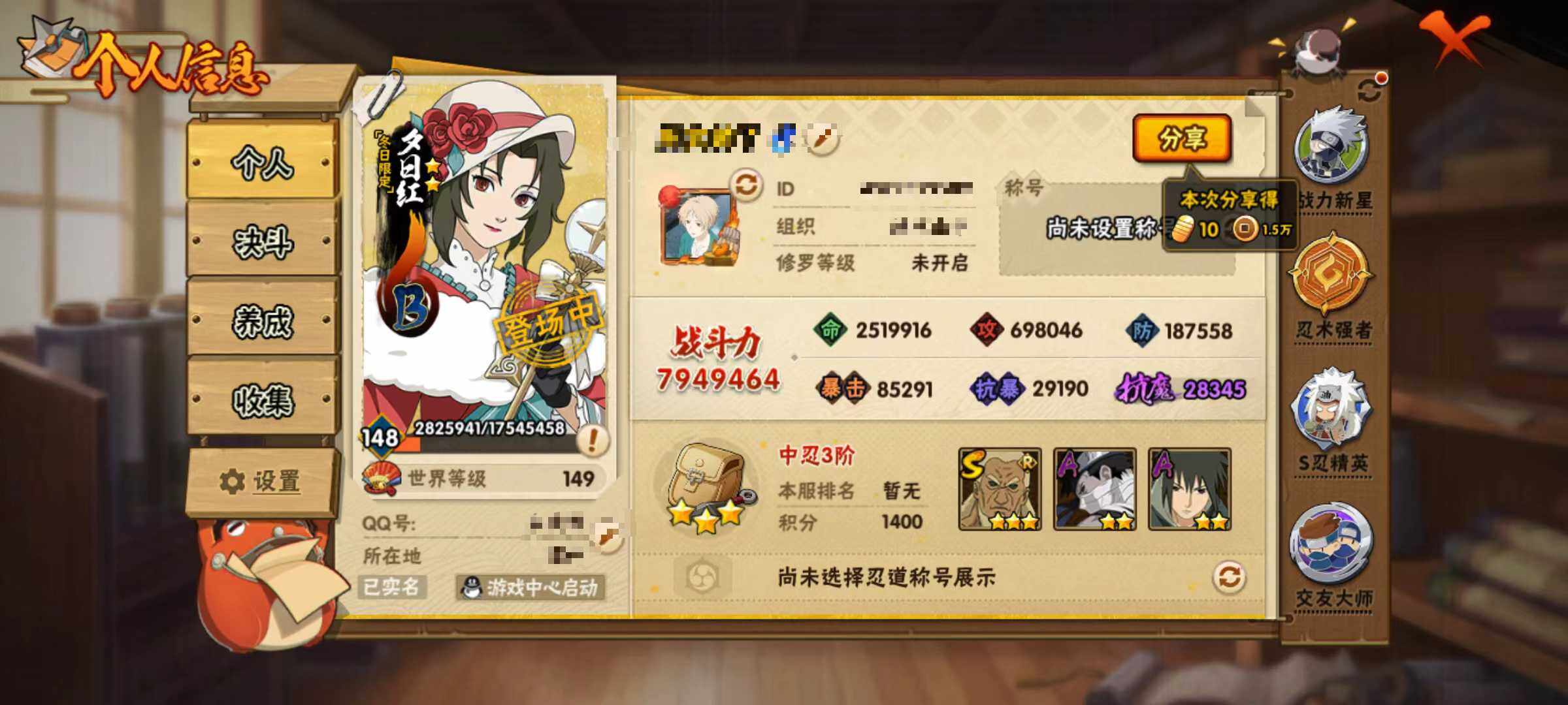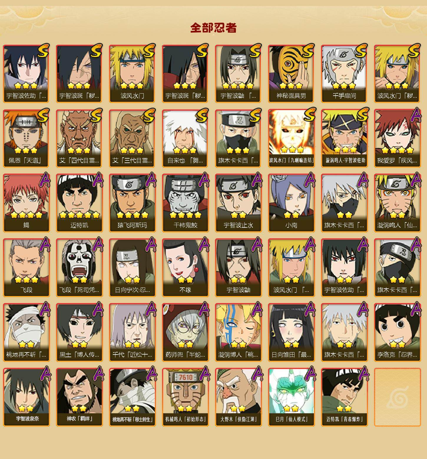 【hy546】15s级忍者数-32a级忍者数 【s级忍者】:波风水门「秽土转生」3星,宇智波斑「秽土转生」3星,宇智波斑「秽土转生·解」3星,宇智波鼬「须佐能乎」4星,旗木卡卡西「须佐能乎」3星,艾「四代目雷影」3星,艾「三代目雷影」3星,自来也「舞之豪杰」3星,千手扉间3星,波风水门3星,神秘面具男3星,佩恩「天道」3星,宇智波佐助「永恒万花筒」3星,波风水门「九喇嘛连结」3星,漩涡鸣人·宇智波佐助3星 【a级忍者】:波风水门「青年」2星,飞段3星,飞段「死司凭血」2星,干柿鬼鲛4星,漩涡博人「桃式显现」2星,漩涡鸣人「仙人模式」2星,机械鸣人「初始形态」2星,迈特凯5星,旗木卡卡西「忍界大战」2星,旗木卡卡西「万花筒写轮眼」2星,旗木卡卡西「幻之真容」2星,桃地再不斩「漂泊武士」2星,桃地再不斩「秽土转生」2星,我爱罗「疾风传」4星,蝎4星,小南2星,猿飞阿斯玛4星,宇智波止水2星,宇智波鼬2星,宇智波佐助「万花筒写轮眼」2星,药师兜「半蛇斗篷」2星,日向宁次「忍界大战」2星,日向雏田「最终章」2星,李洛克「忍界大战」2星,黑土「博人传」2星,千代「近松十人卫」2星,神农「羁绊」2星,不缘2星,宇智波泉奈2星,大野木「侠隐江湖」2星,巳月「仙人模式」2星,迈特凯「青春爆炸」2星