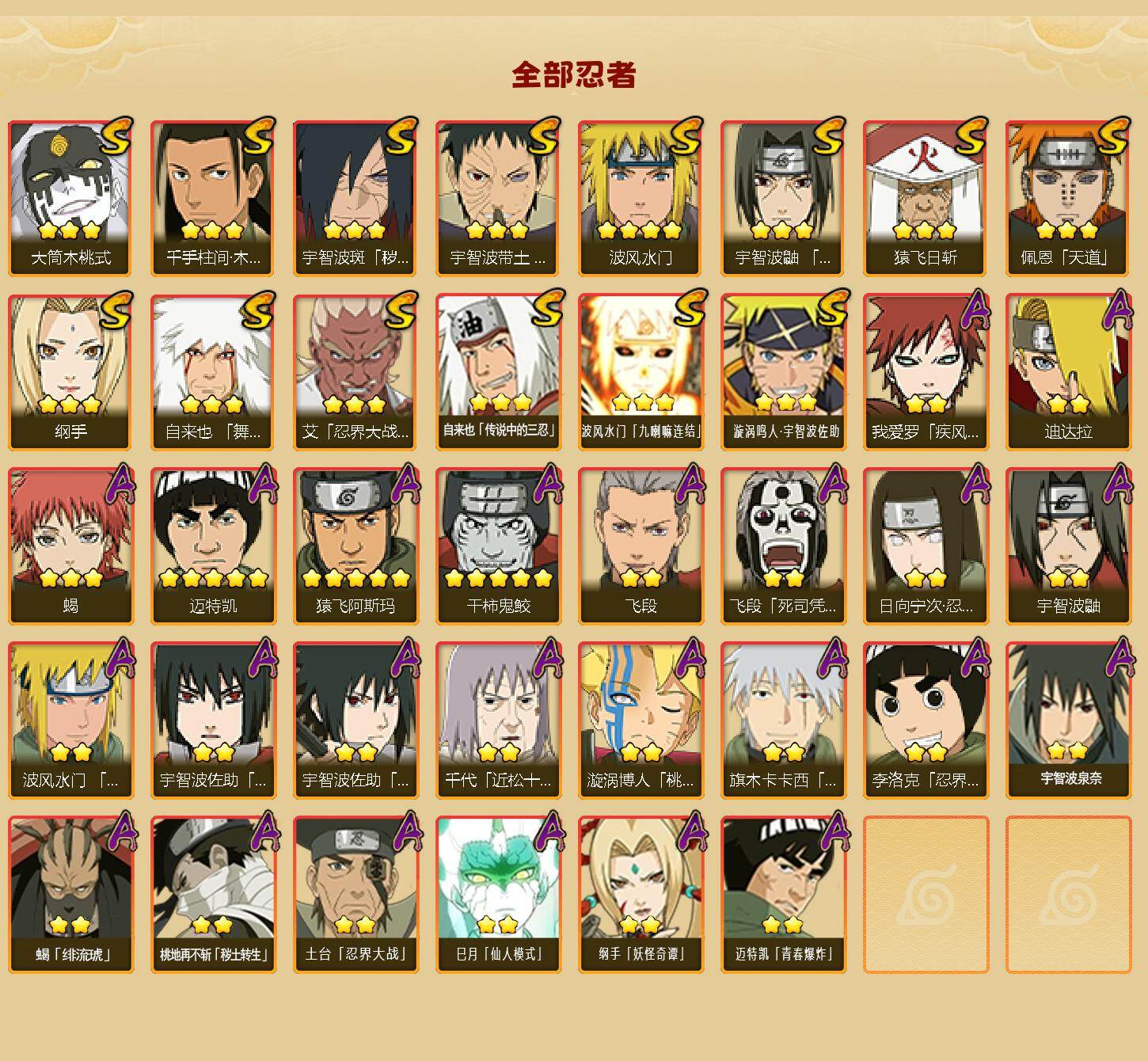 【hy455】14s-24a 宇智波斑「秽土转生·解」3星,宇智波带土「忍界大战」3星,艾「忍界大战」3星,宇智波鼬「须佐能乎」3星,千手柱间「木叶创立」3星,自来也「舞之豪杰」3星,自来也「传说中的三忍」3星,纲手3星,猿飞日斩3星,波风水门4星,佩恩「天道」3星,大筒木桃式3星,波风水门「九喇嘛连结」3星,漩涡鸣人·宇智波佐助3星 波风水门「青年」2星,迪达拉2星,飞段2星,飞段「死司凭血」2星,干柿鬼鲛5星,漩涡博人「桃式显现」2星,迈特凯5星,旗木卡卡西「幻之真容」2星,桃地再不斩「秽土转生」2星,我爱罗「疾风传」2星,蝎3星,蝎「绯流琥」2星,猿飞阿斯玛5星,宇智波鼬2星,宇智波佐助「须佐能乎」2星,宇智波佐助「万花筒写轮眼」2星,日向宁次「忍界大战」2星,李洛克「忍界大战」2星,千代「近松十人卫」2星,土台「忍界大战」2星,宇智波泉奈2星,巳月「仙人模式」2星,纲手「妖怪奇谭」2星,迈特凯「青春爆炸」2星