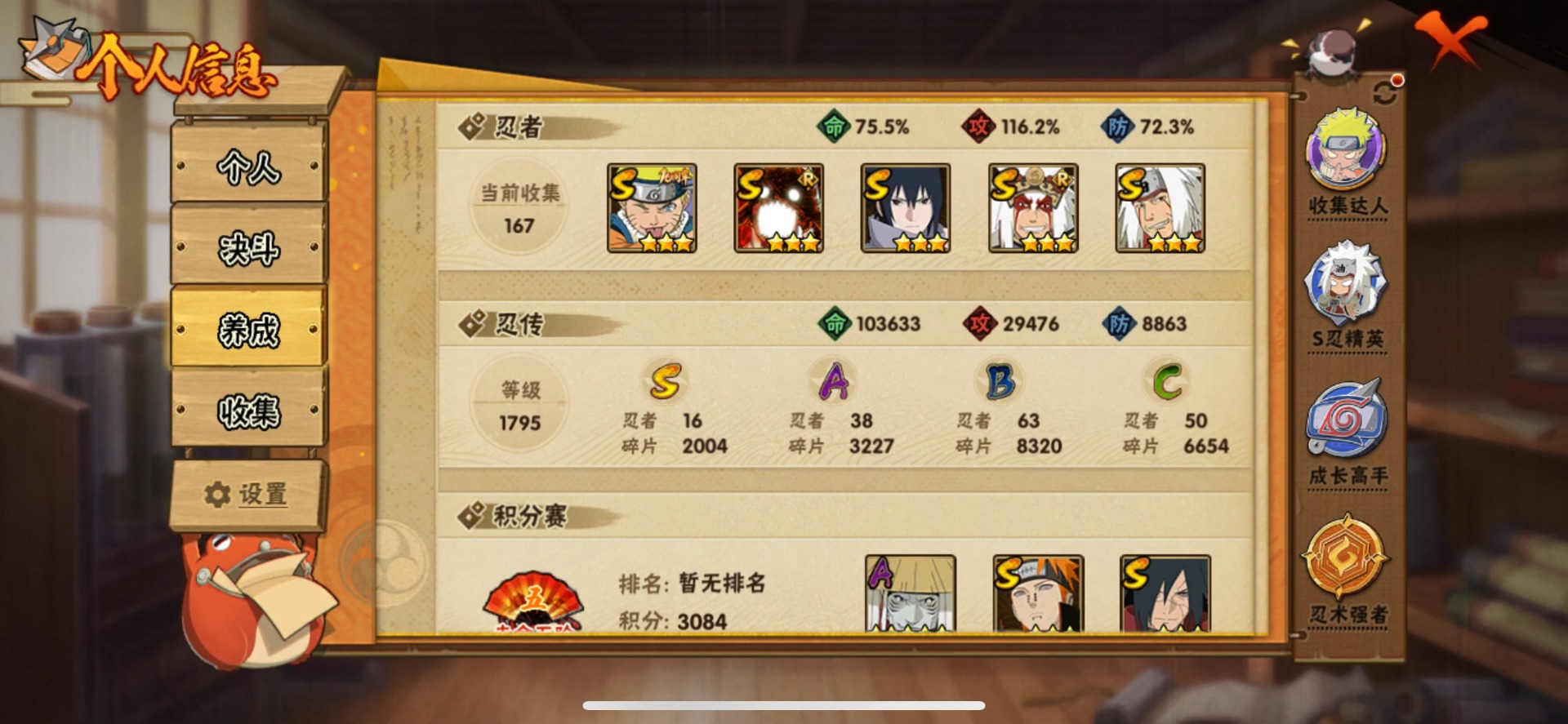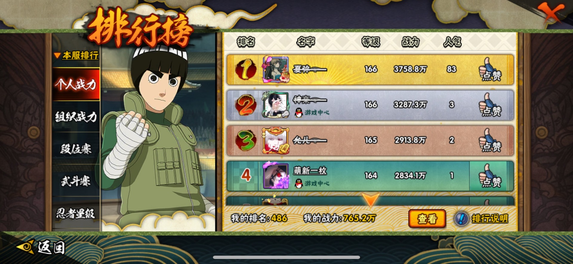 [15643452]v10 16s忍 38a忍 17通灵 765.2w战力 可二次 可修改实名 【s级忍者】宇智波斑「秽土转生·解」宇智波佐助「永恒万花筒」迈特凯「死门」宇智波带土 「忍界大战」千手柱间「秽土转生」自来也 「舞之豪杰」大筒木舍人 「最终章」自来也 「传说中的三忍」漩涡鸣人 「暴怒·第六尾」漩涡鸣人·宇智波佐助宇智波鼬「秽土转生」药师兜「仙人模式」宇智波鼬 「须佐能乎」佩恩「天道」波风水门大蛇丸 【通灵兽】熊猫