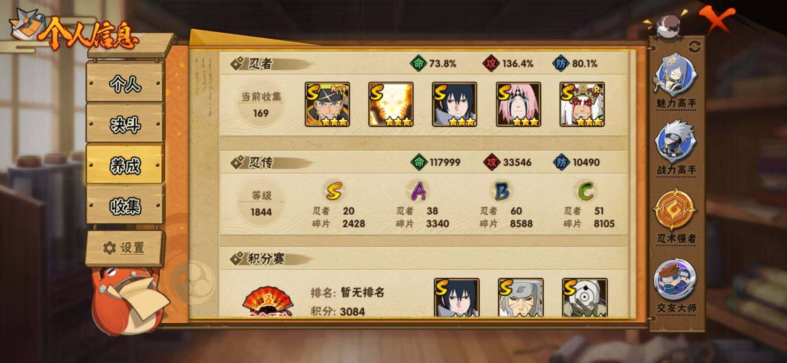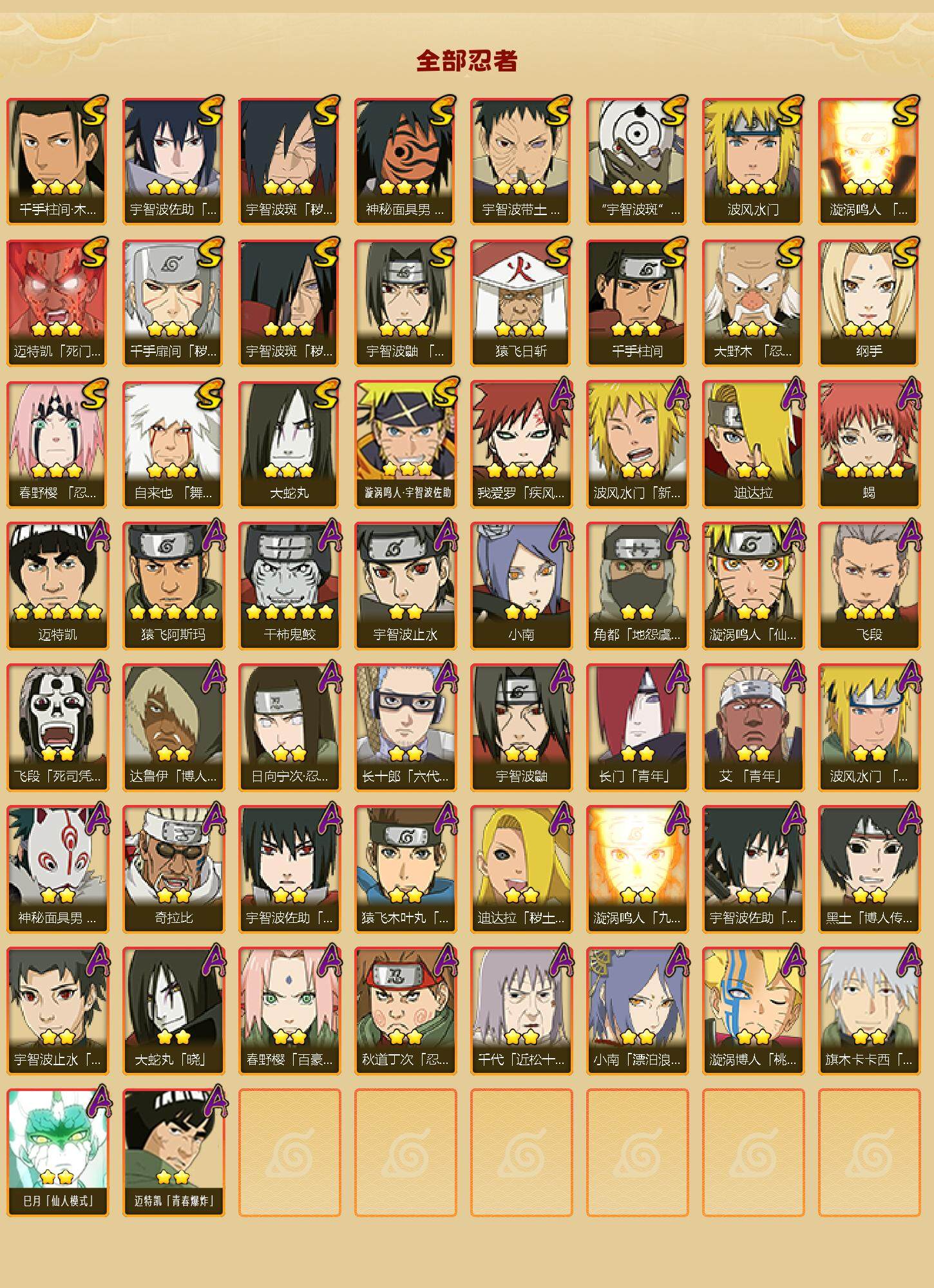 【hy434】20s-38a 【s级忍者】:千手扉间「秽土转生」3星,宇智波斑「秽土转生」3星,宇智波斑「秽土转生·解」3星,大野木「忍界大战」3星,春野樱「忍界大战」3星,宇智波带土「忍界大战」3星,宇智波鼬「须佐能乎」3星,千手柱间「木叶创立」3星,自来也「舞之豪杰」3星,大蛇丸3星,纲手3星,千手柱间3星,猿飞日斩3星,波风水门3星,神秘面具男「红夜之刃」3星,漩涡鸣人「九喇嘛连结」3星,迈特凯「死门」3星,宇智波佐助「永恒万花筒」3星,宇智波斑 「白面具」3星宇智波斑「白面具」,漩涡鸣人·宇智波佐助3星 【a级忍者】:艾「青年」2星,长门「青年」2星,波风水门「青年」2星,波风水门「新春限定」2星,达鲁伊「博人传」2星,迪达拉2星,迪达拉「秽土转生」2星,大蛇丸「晓」2星,奇拉比2星,飞段3星,飞段「死司凭血」2星,干柿鬼鲛5星,漩涡博人「桃式显现」2星,漩涡鸣人「仙人模式」2星,漩涡鸣人「九尾查克拉」2星,迈特凯5星,旗木卡卡西「幻之真容」2星,我爱罗「疾风传」4星,蝎4星,小南2星,小南「漂泊浪客」2星,角都「地怨虞」2星,猿飞阿斯玛5星,宇智波止水2星,宇智波止水「新春限定」2星,宇智波鼬2星,宇智波佐助「须佐能乎」2星,宇智波佐助「万花筒写轮眼」2星,日向宁次「忍界大战」2星,长十郎「六代目水影」2星,神秘面具男「忍者之路」2星,猿飞木叶丸「博人传」2星,黑土「博人传」2星,春野樱「百豪」2星,秋道丁次「忍界大战」2星,千代「近松十人卫」2星,巳月「仙人模式」2星,迈特凯「青春爆炸」2星