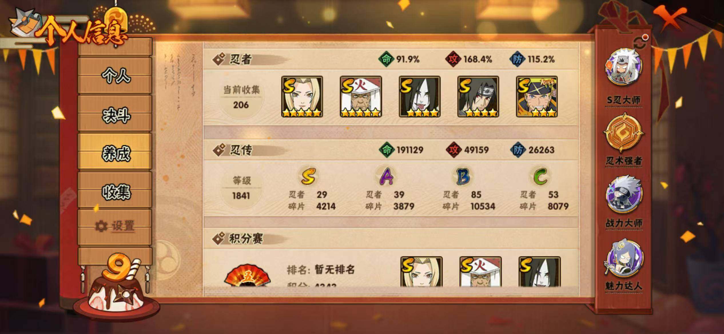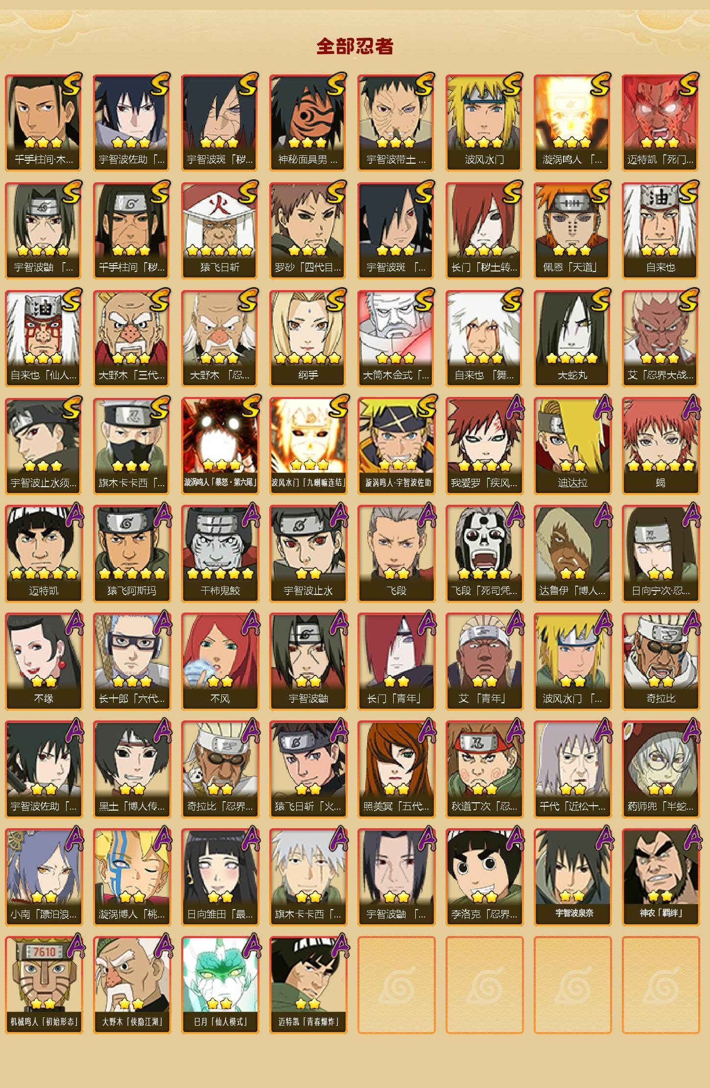 【hy341】29s级忍者数-39a级忍者数 【s级忍者】:长门「秽土转生」3星,千手柱间「秽土转生」3星,宇智波斑「秽土转生·解」3星,大野木「忍界大战」3星,宇智波带土「忍界大战」3星,艾「忍界大战」3星,宇智波鼬「须佐能乎」4星,宇智波止水「须佐能乎」3星,旗木卡卡西「须佐能乎」3星,宇智波斑「木叶创立」3星,千手柱间「木叶创立」3星,罗砂「四代目风影」3星,大野木「三代目土影」3星,自来也3星,自来也「仙人模式」3星,自来也「舞之豪杰」3星,大蛇丸4星,纲手5星,猿飞日斩5星,波风水门3星,神秘面具男「红夜之刃」3星,漩涡鸣人「九喇嘛连结」3星,迈特凯「死门」3星,佩恩「天道」3星,宇智波佐助「永恒万花筒」3星,大筒木金式3星,漩涡鸣人「暴怒·第六尾」3星,波风水门「九喇嘛连结」3星,漩涡鸣人·宇智波佐助3星 【a级忍者】:艾「青年」2星,长门「青年」2星,波风水门「青年」2星,达鲁伊「博人传」2星,迪达拉2星,奇拉比2星,奇拉比「忍界大战」2星,飞段2星,飞段「死司凭血」4星,干柿鬼鲛5星,漩涡博人「桃式显现」2星,机械鸣人「初始形态」2星,迈特凯5星,旗木卡卡西「幻之真容」2星,我爱罗「疾风传」4星,蝎5星,小南「漂泊浪客」2星,猿飞阿斯玛5星,宇智波止水2星,猿飞日斩「火影继承人」2星,宇智波鼬2星,宇智波鼬「夏日限定」2星,宇智波佐助「须佐能乎」2星,药师兜「半蛇斗篷」2星,照美冥「五代目水影」2星,日向宁次「忍界大战」2星,日向雏田「最终章」2星,长十郎「六代目水影」3星,李洛克「忍界大战」2星,黑土「博人传」2星,秋道丁次「忍界大战」2星,千代「近松十人卫」2星,神农「羁绊」2星,不缘2星,不风2星,宇智波泉奈2星,大野木「侠隐江湖」2星,巳月「仙人模式」2星,迈特凯「青春爆炸」2星
