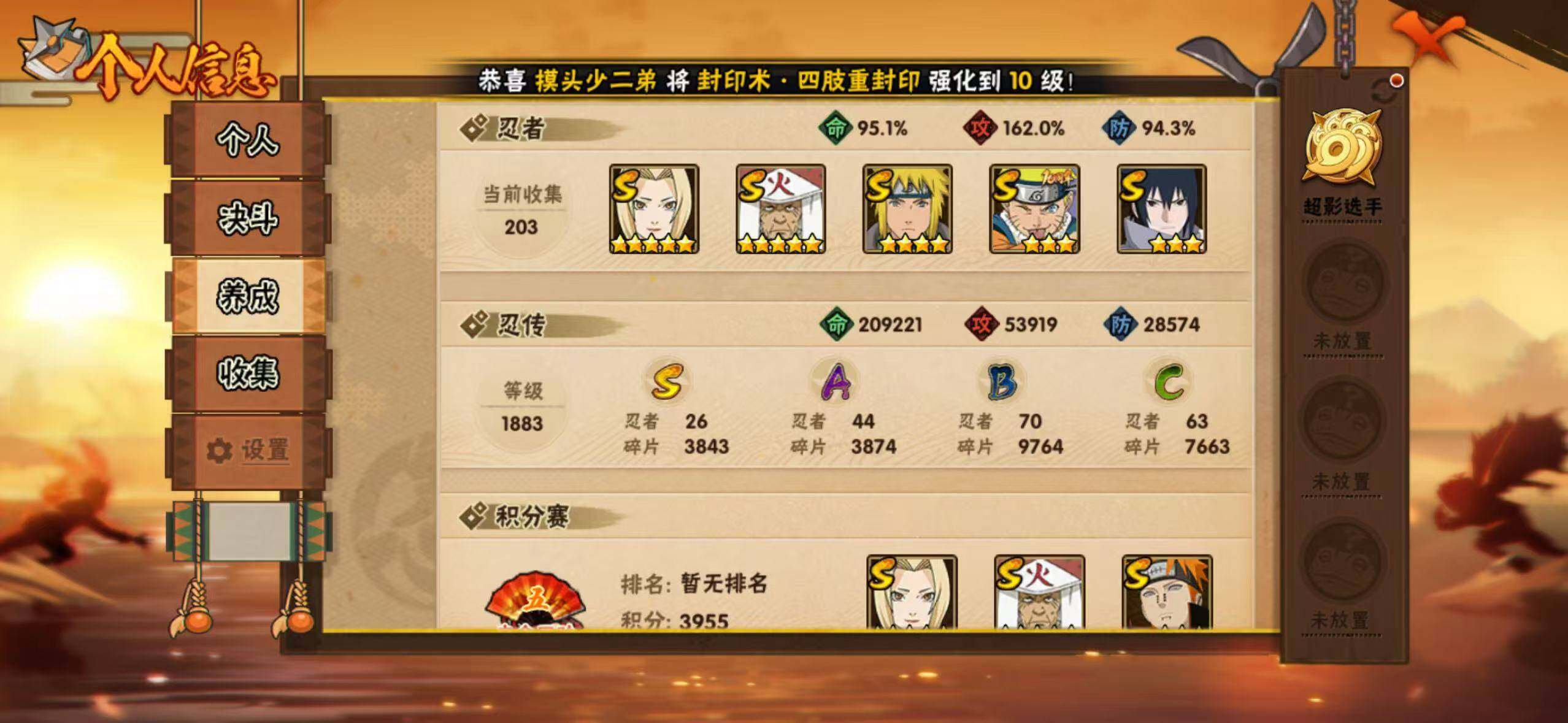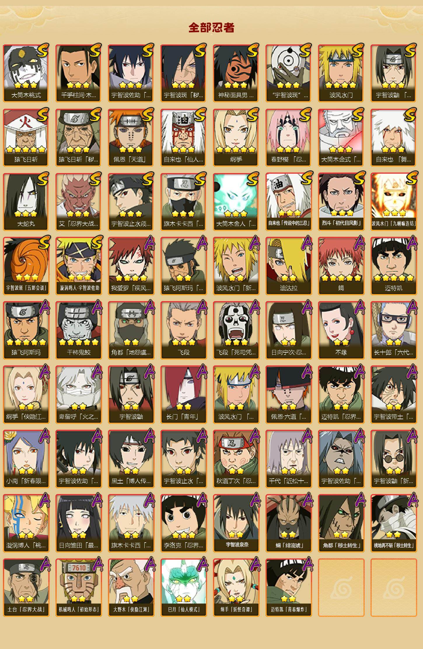 【hy556】26s级忍者数-44a级忍者数 【s级忍者】:猿飞日斩「秽土转生」3星,宇智波斑「秽土转生·解」3星,春野樱「忍界大战」3星,艾「忍界大战」3星,宇智波鼬「须佐能乎」3星,宇智波止水「须佐能乎」3星,旗木卡卡西「须佐能乎」3星,千手柱间「木叶创立」3星,烈斗「初代目风影」3星,自来也「仙人模式」3星,自来也「舞之豪杰」3星,大蛇丸3星,自来也「传说中的三忍」3星,纲手5星,猿飞日斩5星,波风水门4星,神秘面具男「红夜之刃」3星,佩恩「天道」3星,宇智波佐助「永恒万花筒」3星,宇智波斑 「白面具」3星宇智波斑「白面具」,大筒木金式3星,大筒木桃式3星,大筒木舍人「最终章」3星,波风水门「九喇嘛连结」3星,宇智波斑「五影会谈」3星,漩涡鸣人·宇智波佐助3星 【a级忍者】:长门「青年」2星,波风水门「青年」2星,波风水门「新春限定」2星,迪达拉2星,飞段3星,飞段「死司凭血」3星,干柿鬼鲛5星,漩涡博人「桃式显现」2星,机械鸣人「初始形态」2星,迈特凯5星,迈特凯「忍界大战」2星,旗木卡卡西「幻之真容」2星,桃地再不斩「秽土转生」2星,我爱罗「疾风传」4星,蝎5星,蝎「绯流琥」2星,小南「新春限定」2星,角都「地怨虞」2星,角都「秽土转生」2星,猿飞阿斯玛5星,猿飞阿斯玛「秽土转生」2星,宇智波止水「新春限定」2星,宇智波鼬2星,宇智波鼬「新春限定」2星,宇智波佐助「须佐能乎」2星,宇智波佐助「疾风传咒印」2星,日向宁次「忍界大战」2星,日向雏田「最终章」2星,宇智波带土「暴怒」2星,长十郎「六代目水影」2星,纲手「侠隐江湖」2星,卑留呼「火之意志继承者」2星,佩恩·六道「漂泊浪客」2星,李洛克「忍界大战」3星,黑土「博人传」2星,秋道丁次「忍界大战」2星,千代「近松十人卫」2星,土台「忍界大战」2星,不缘2星,宇智波泉奈2星,大野木「侠隐江湖」2星,巳月「仙人模式」2星,纲手「妖怪奇谭」2星,迈特凯「青春爆炸」2星