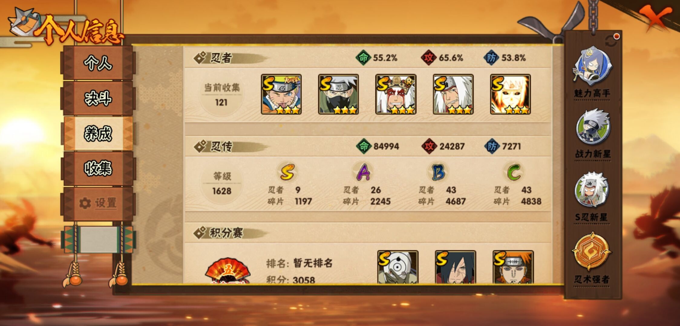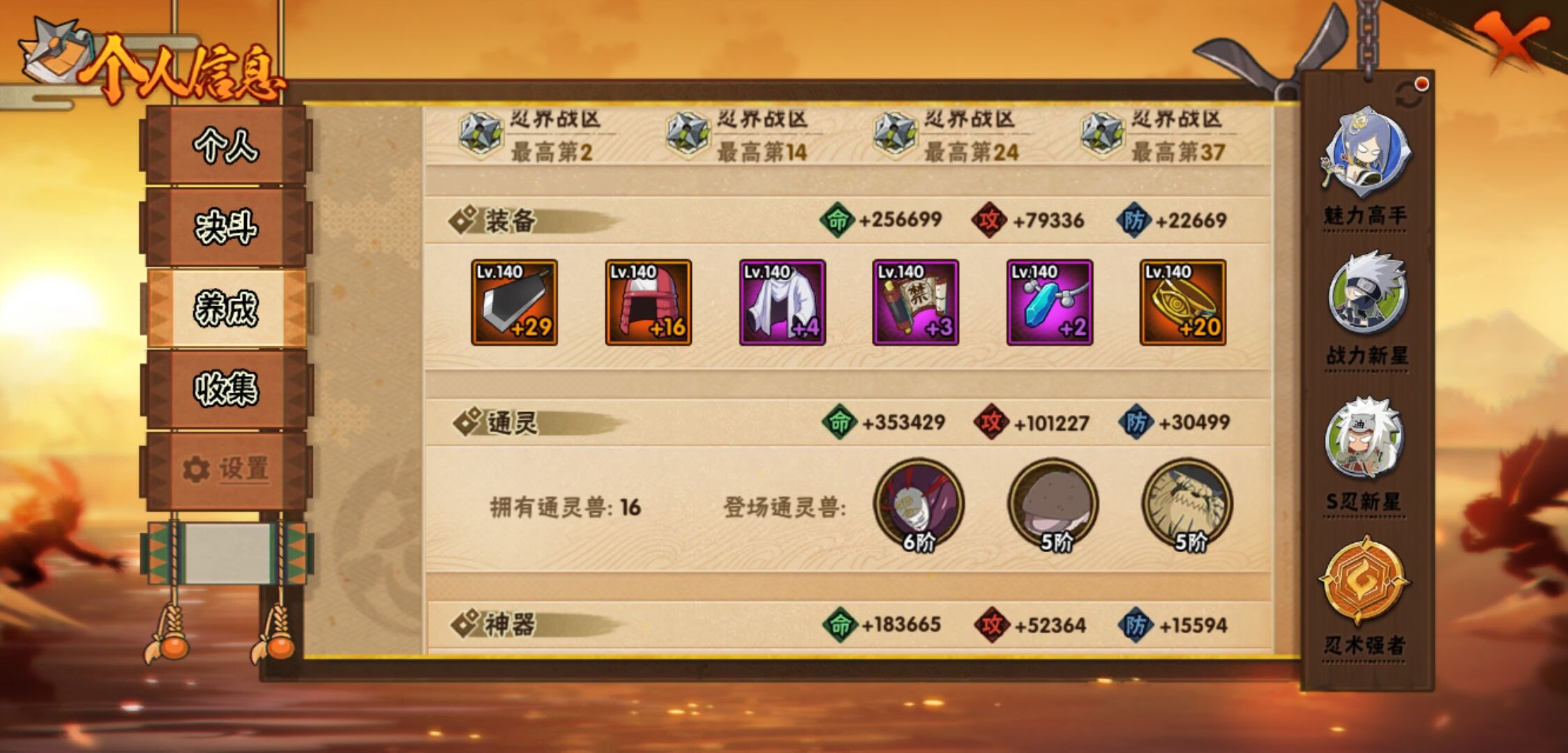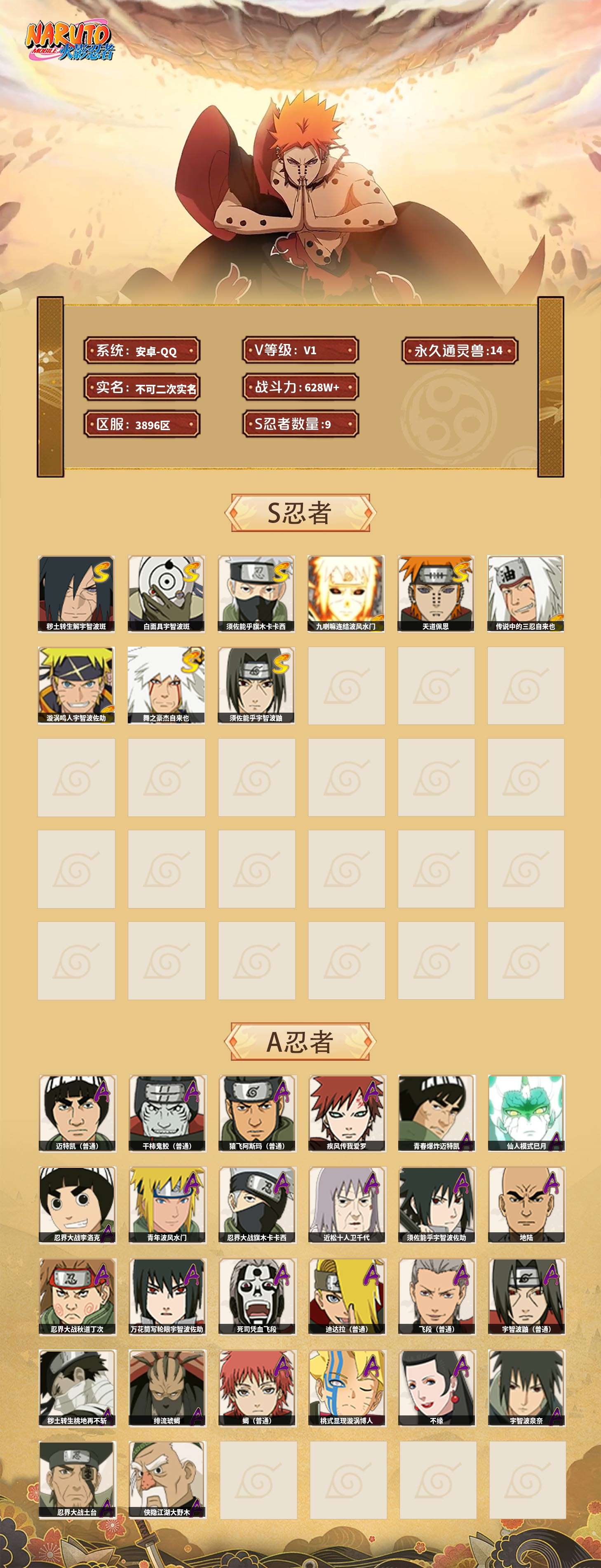【火影忍者】【lyhy10864】战斗力:628w;段位:影级1阶;本服排名:612;vip:v1级;s忍:9个;a忍:26个;通灵兽:14个,s忍:秽土转生解宇智波斑|白面具宇智波斑|须佐能乎旗木卡卡西|九喇嘛连结波风水门|天道佩恩|传说中的三忍自来也|漩涡鸣人宇智波佐助|舞之豪杰自来也|须佐能乎宇智波鼬__a忍:青春爆炸迈特凯|仙人模式巳月|忍界大战李洛克|青年波风水门|忍界大战旗木卡卡西|近松十人卫千代|须佐能乎宇智波佐助|地陆|忍界大战秋道丁次|万花筒写轮眼宇智波佐助|死司凭血飞段|疾风传我爱罗 3星|迪达拉(普通)|飞段(普通)|迈特凯(普通) 5星|宇智波鼬(普通)|干柿鬼鲛(普通) 4星|秽土转生桃地再不斩|绯流琥蝎|蝎(普通)|猿飞阿斯玛(普通) 4星|桃式显现漩涡博人|不缘|宇智波泉奈|忍界大战土台|侠隐江湖大野木__通灵兽:忍犬(普通)|蓝蛇|砂之守鹤|蛤蟆吉|忍龟|镰鼬|猿魔|山椒鱼|蜃|蛤蟆仙人|鲛鲨|蛤蟆健|乌鸦(普通)|蛤蟆龙