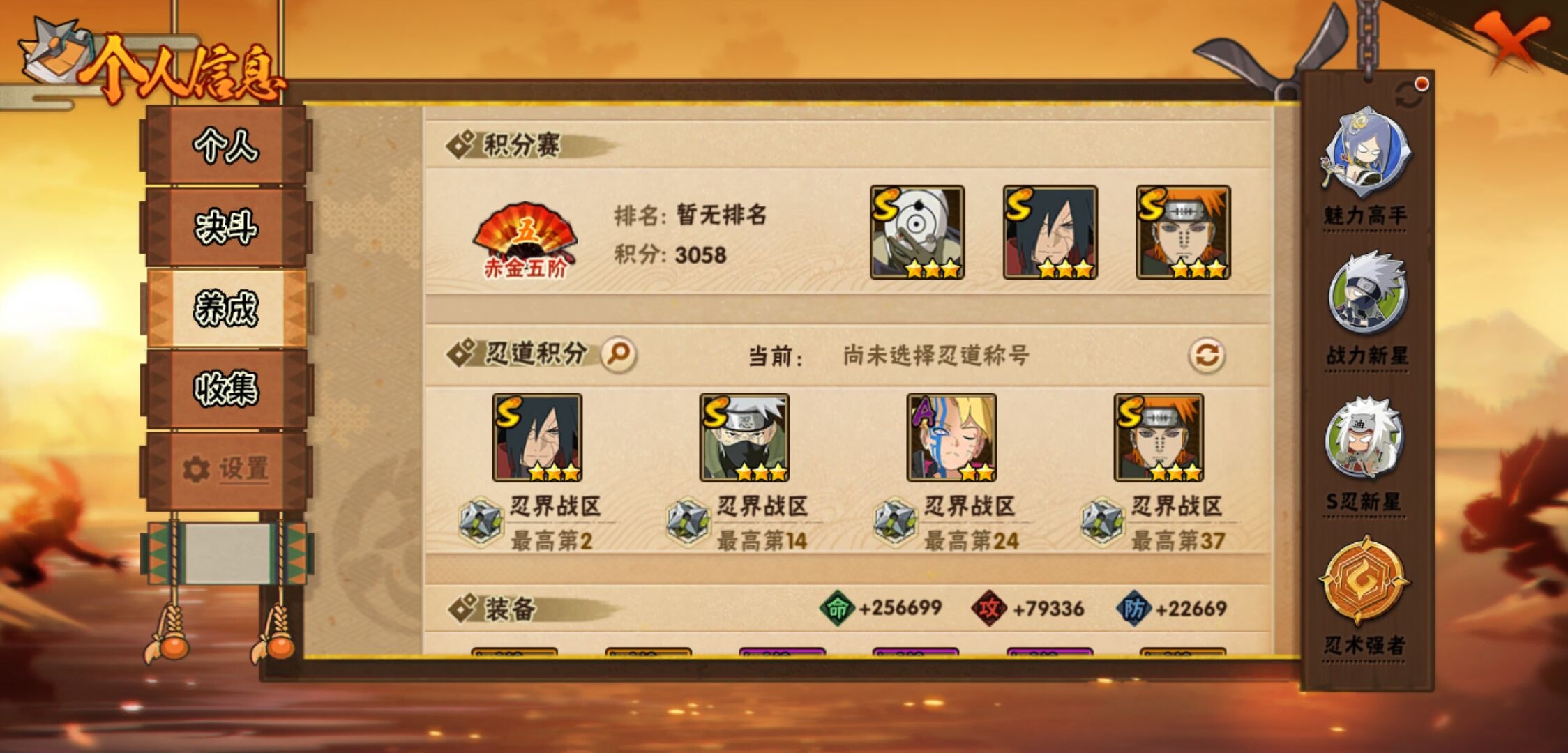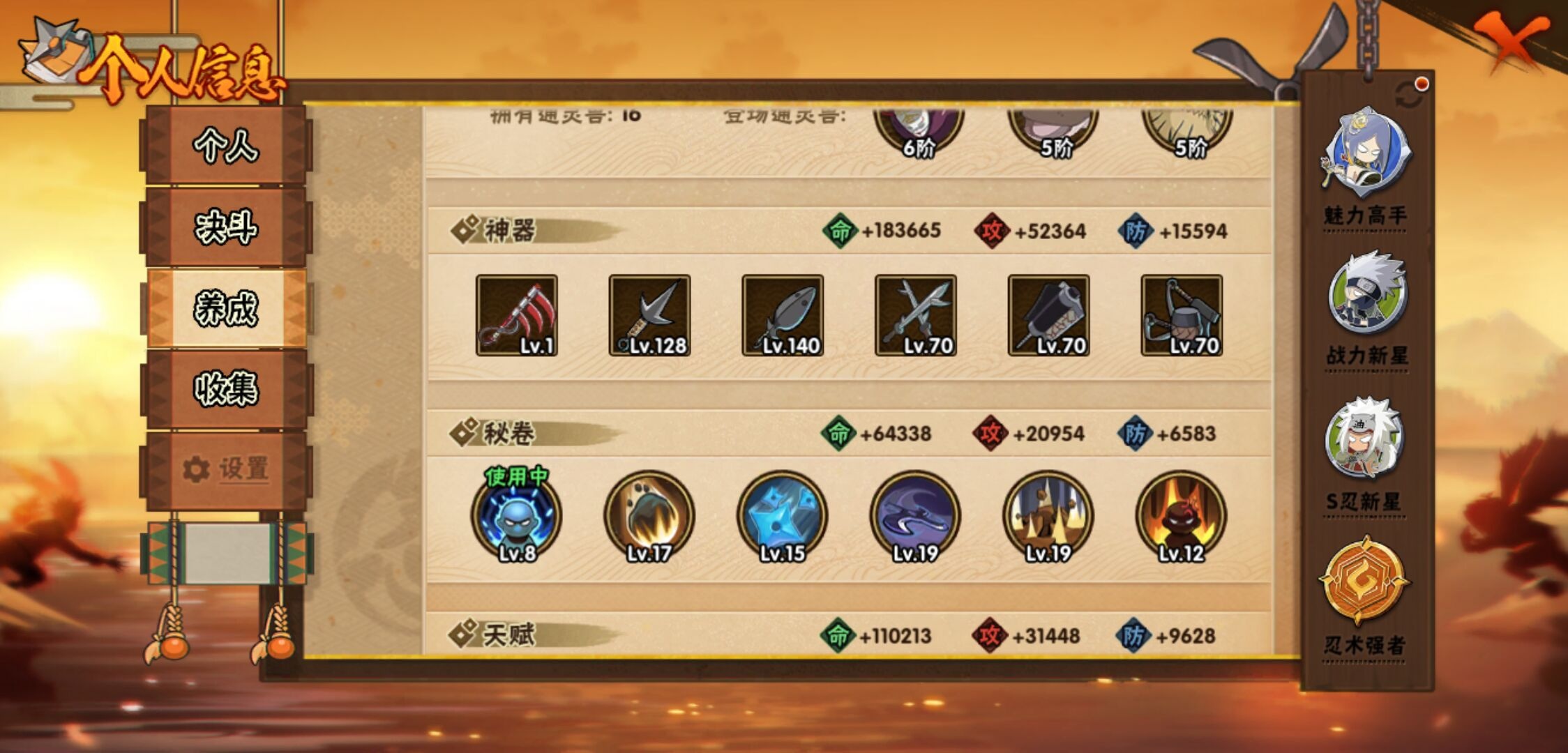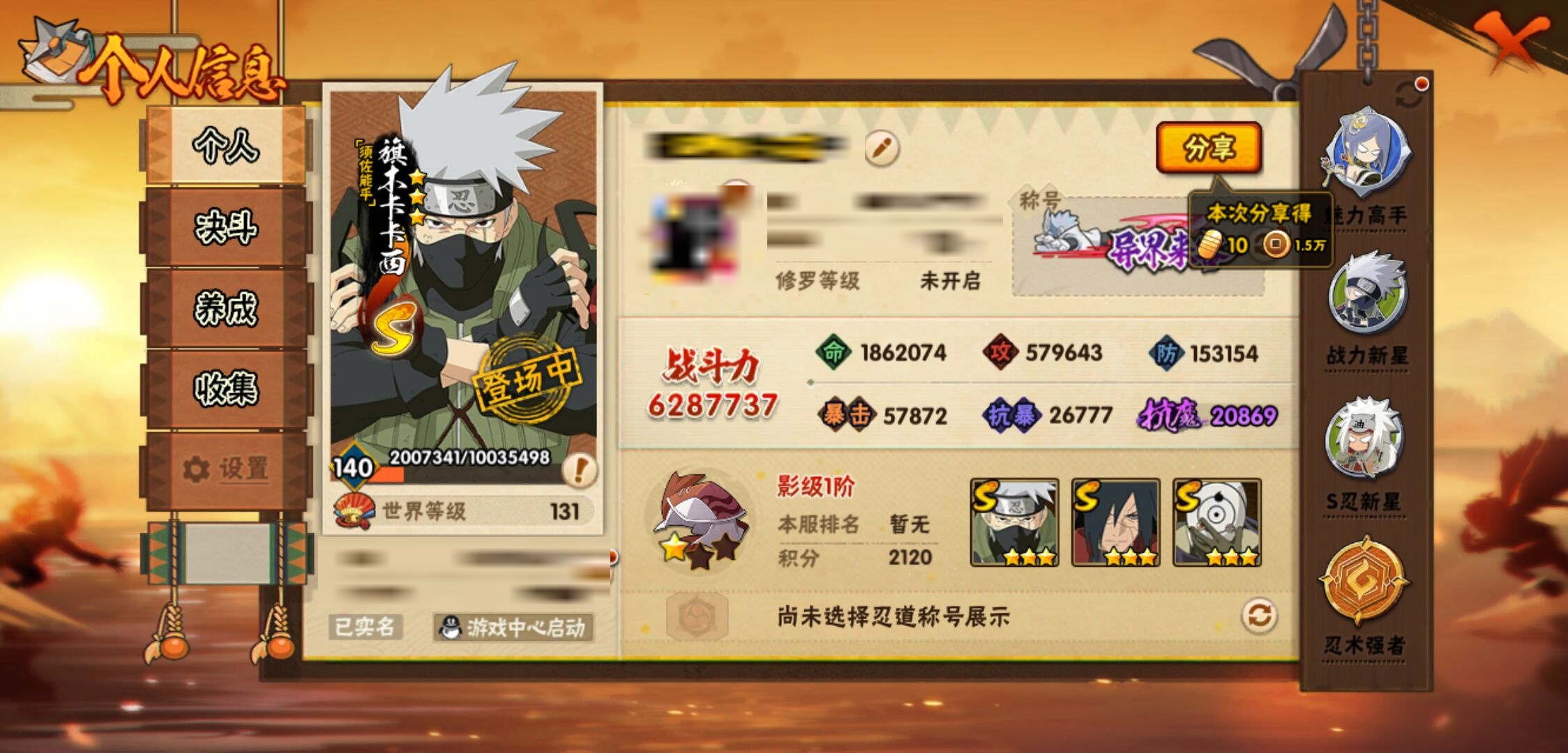 【火影忍者】【lyhy10864】战斗力:628w;段位:影级1阶;本服排名:612;vip:v1级;s忍:9个;a忍:26个;通灵兽:14个,s忍:秽土转生解宇智波斑|白面具宇智波斑|须佐能乎旗木卡卡西|九喇嘛连结波风水门|天道佩恩|传说中的三忍自来也|漩涡鸣人宇智波佐助|舞之豪杰自来也|须佐能乎宇智波鼬__a忍:青春爆炸迈特凯|仙人模式巳月|忍界大战李洛克|青年波风水门|忍界大战旗木卡卡西|近松十人卫千代|须佐能乎宇智波佐助|地陆|忍界大战秋道丁次|万花筒写轮眼宇智波佐助|死司凭血飞段|疾风传我爱罗 3星|迪达拉(普通)|飞段(普通)|迈特凯(普通) 5星|宇智波鼬(普通)|干柿鬼鲛(普通) 4星|秽土转生桃地再不斩|绯流琥蝎|蝎(普通)|猿飞阿斯玛(普通) 4星|桃式显现漩涡博人|不缘|宇智波泉奈|忍界大战土台|侠隐江湖大野木__通灵兽:忍犬(普通)|蓝蛇|砂之守鹤|蛤蟆吉|忍龟|镰鼬|猿魔|山椒鱼|蜃|蛤蟆仙人|鲛鲨|蛤蟆健|乌鸦(普通)|蛤蟆龙