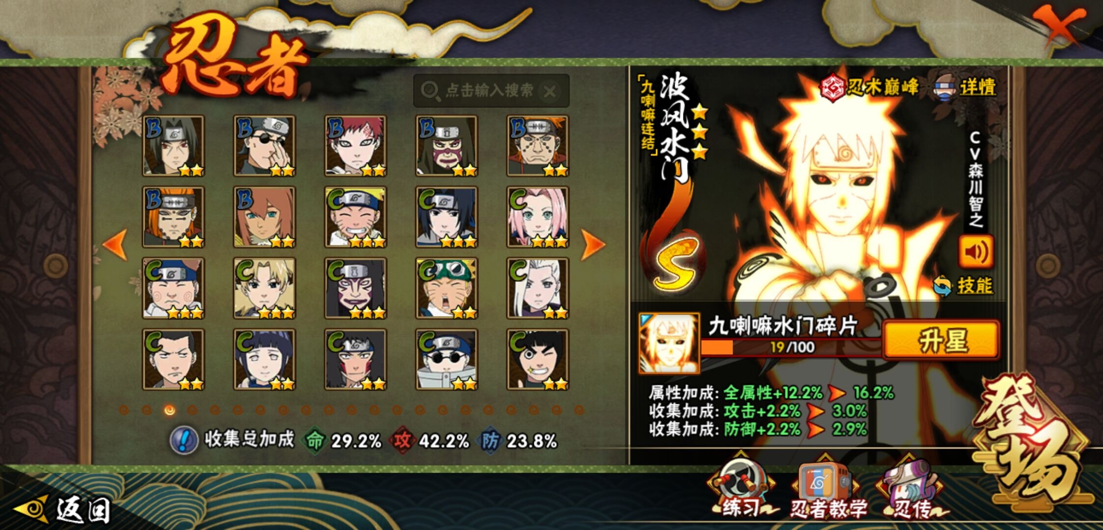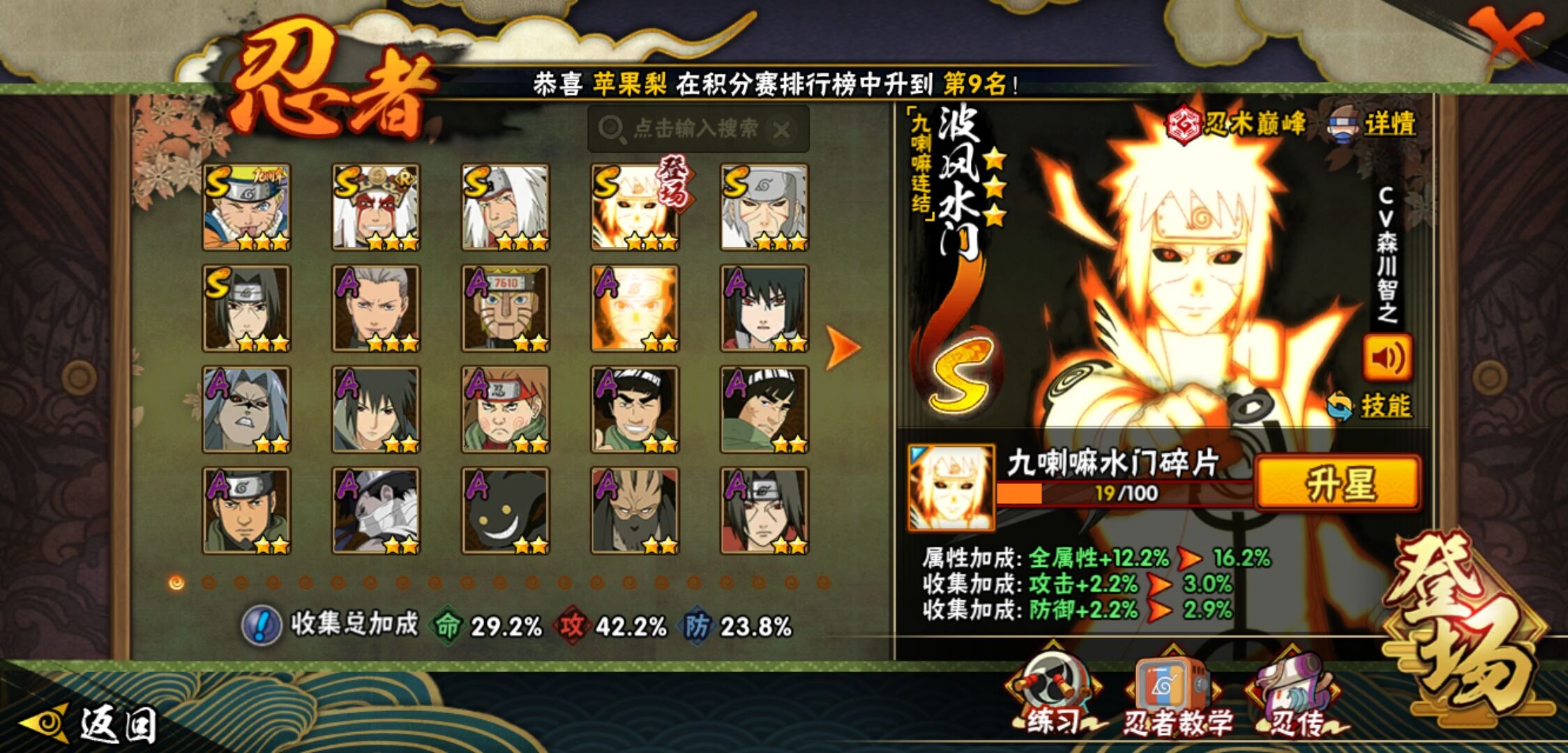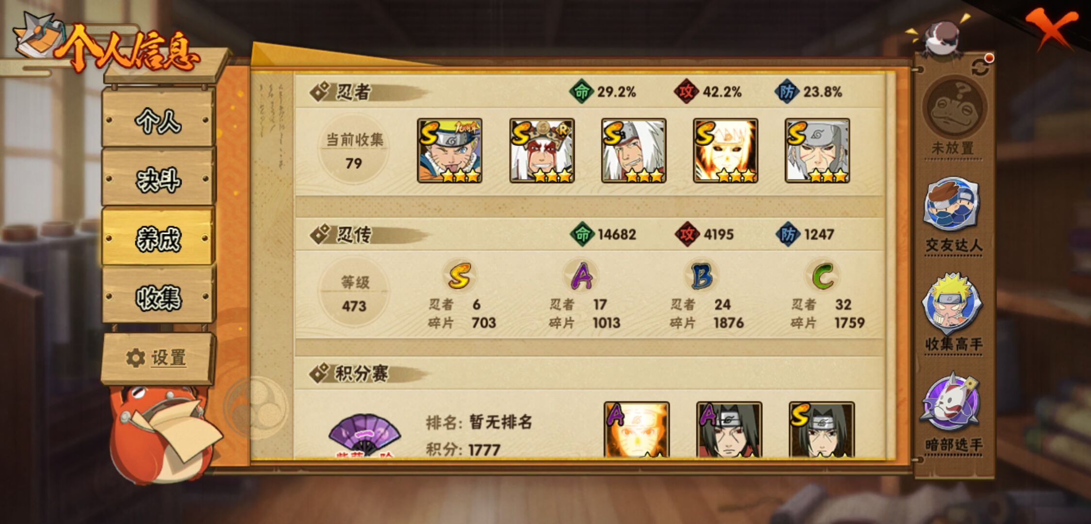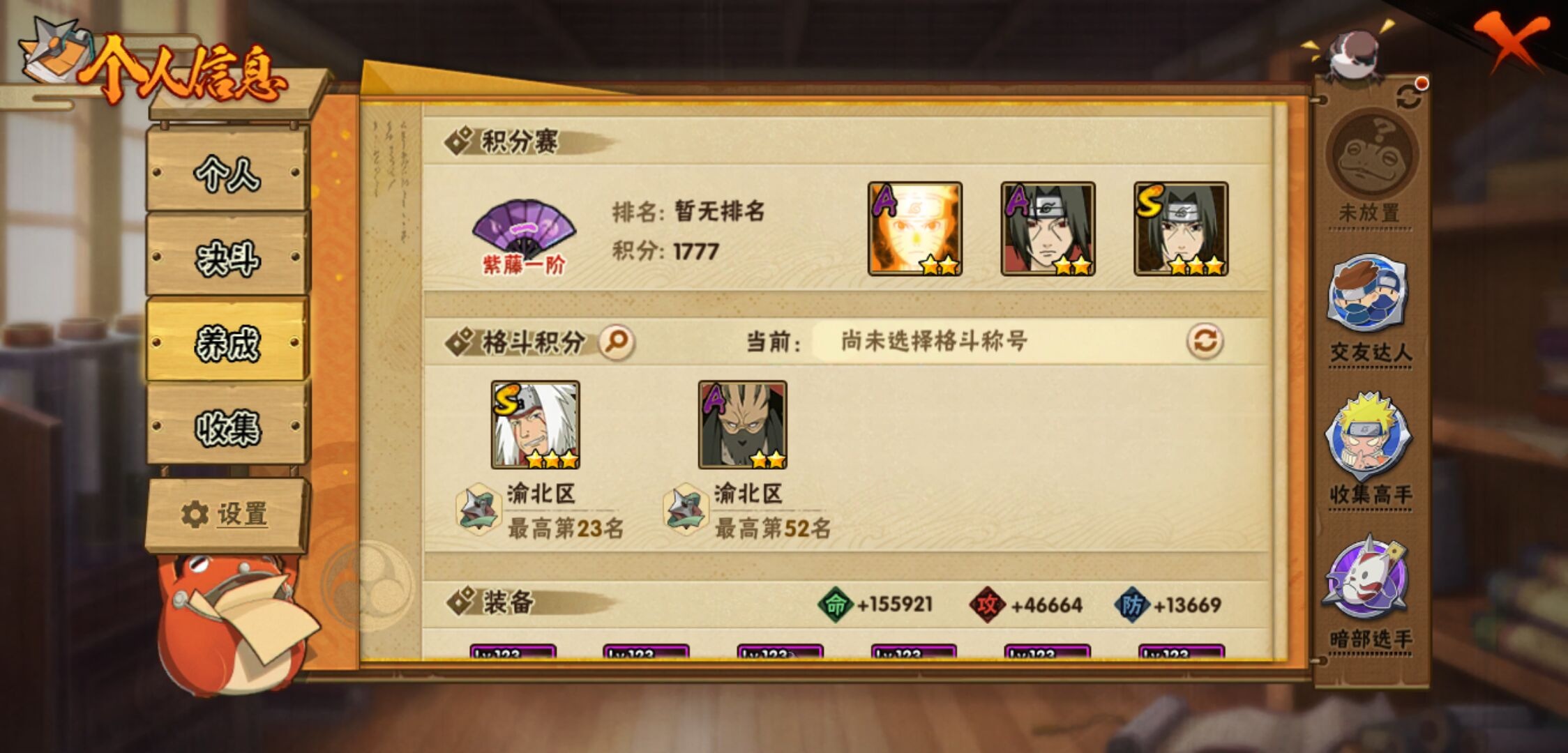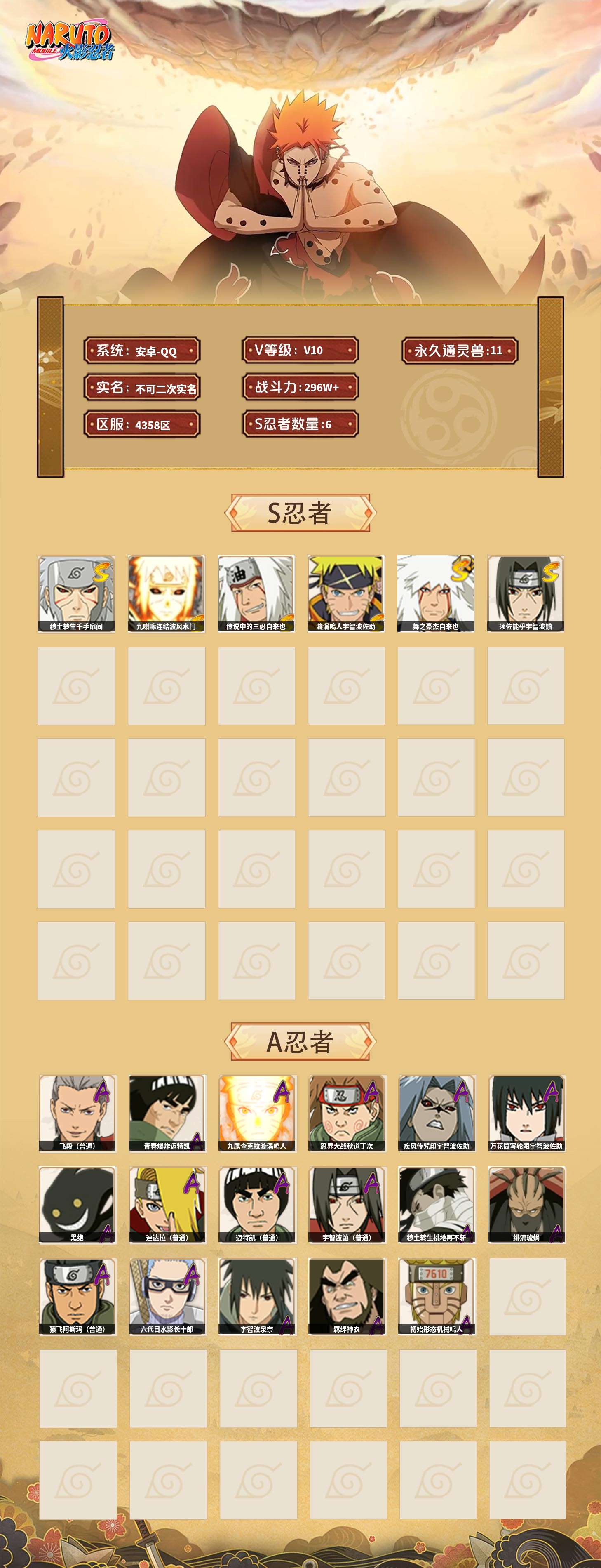 【火影忍者】【lyhy10842】战斗力:296w;段位:暗部1阶;本服排名:1396;vip:v10级;s忍:6个;a忍:17个;通灵兽:11个,s忍:秽土转生千手扉间|九喇嘛连结波风水门|传说中的三忍自来也|漩涡鸣人宇智波佐助|舞之豪杰自来也|须佐能乎宇智波鼬__a忍:青春爆炸迈特凯|九尾查克拉漩涡鸣人|忍界大战秋道丁次|疾风传咒印宇智波佐助|万花筒写轮眼宇智波佐助|黑绝|迪达拉(普通)|飞段(普通) 3星|迈特凯(普通)|宇智波鼬(普通)|秽土转生桃地再不斩|绯流琥蝎|猿飞阿斯玛(普通)|六代目水影长十郎|宇智波泉奈|羁绊神农|初始形态机械鸣人__通灵兽:忍犬(普通)|蓝蛇|蛤蟆吉|忍龟|镰鼬|猿魔|砂之守鹤|山椒鱼|蜃|蛤蟆仙人|鲛鲨