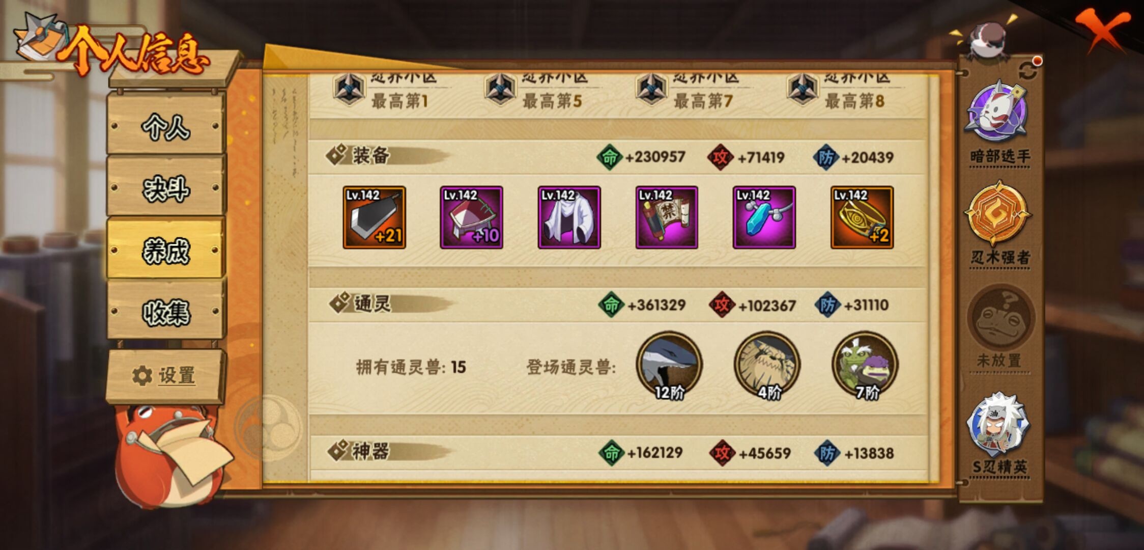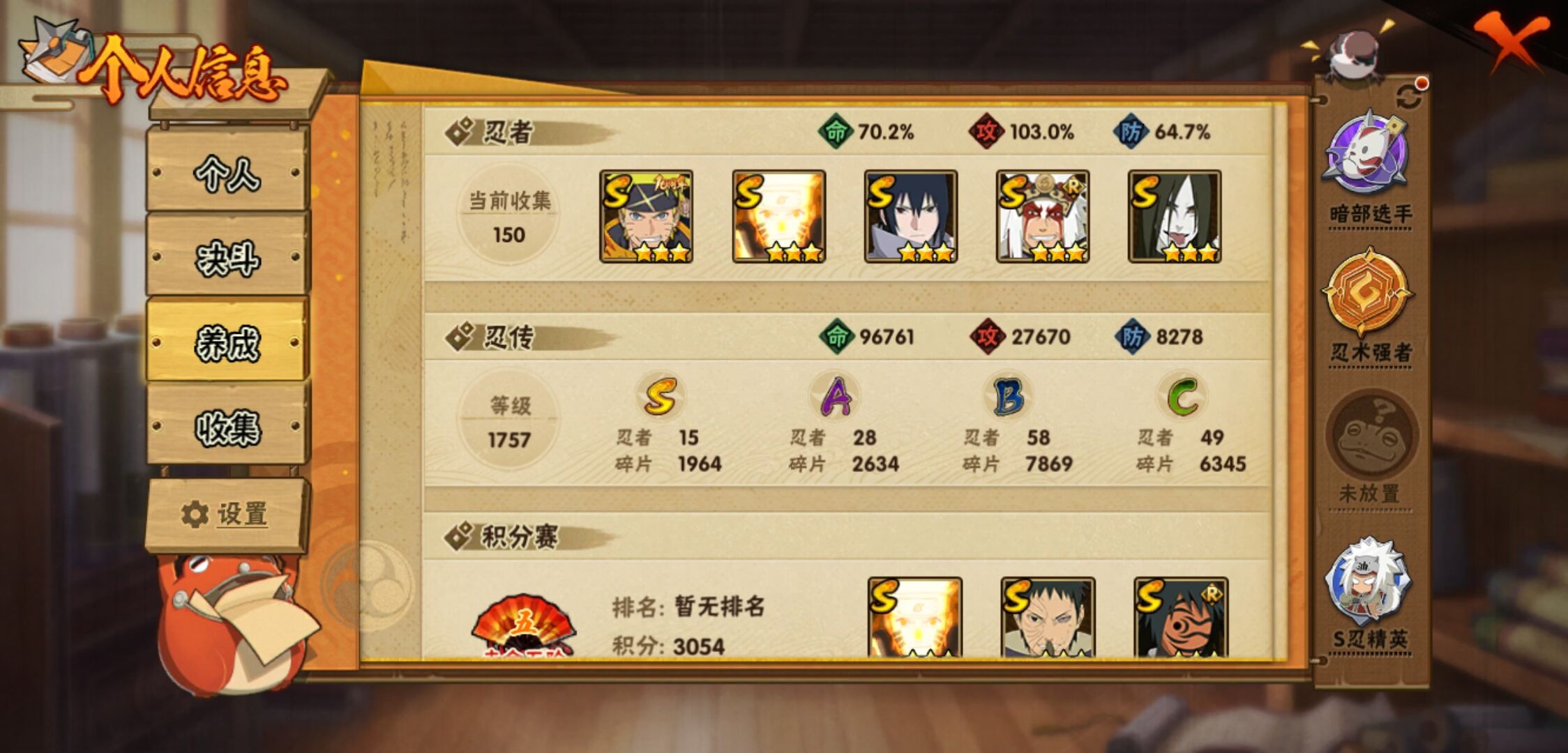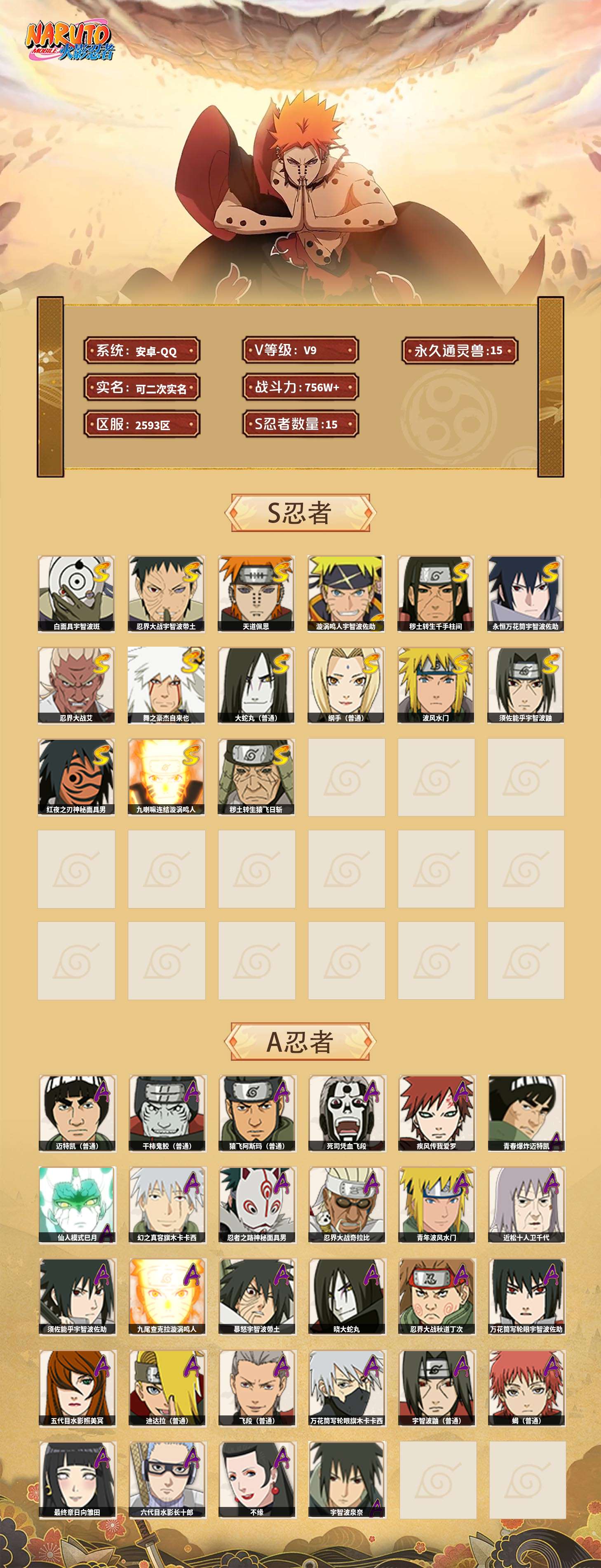 【火影忍者】【lyhy10872】战斗力:756w;段位:中忍3阶;本服排名:699;vip:v9级;s忍:15个;a忍:28个;通灵兽:15个,s忍:白面具宇智波斑|忍界大战宇智波带土|天道佩恩|漩涡鸣人宇智波佐助|秽土转生千手柱间|永恒万花筒宇智波佐助|忍界大战艾|舞之豪杰自来也|大蛇丸(普通)|纲手(普通)|波风水门|须佐能乎宇智波鼬|红夜之刃神秘面具男|九喇嘛连结漩涡鸣人|秽土转生猿飞日斩__a忍:青春爆炸迈特凯|仙人模式巳月|幻之真容旗木卡卡西|忍者之路神秘面具男|忍界大战奇拉比|青年波风水门|近松十人卫千代|须佐能乎宇智波佐助|九尾查克拉漩涡鸣人|暴怒宇智波带土|晓大蛇丸|忍界大战秋道丁次|万花筒写轮眼宇智波佐助|五代目水影照美冥|死司凭血飞段 3星|疾风传我爱罗 3星|迪达拉(普通)|飞段(普通)|万花筒写轮眼旗木卡卡西|迈特凯(普通) 5星|宇智波鼬(普通)|干柿鬼鲛(普通) 5星|蝎(普通)|猿飞阿斯玛(普通) 5星|最终章日向雏田|六代目水影长十郎|不缘|宇智波泉奈__通灵兽:忍犬(普通)|蓝蛇|砂之守鹤|蛤蟆吉|忍龟|镰鼬|猿魔|山椒鱼|蜃|蛤蟆仙人|鲛鲨|蛤蟆健|乌鸦(普通)|蛤蟆龙|蛤蟆广
