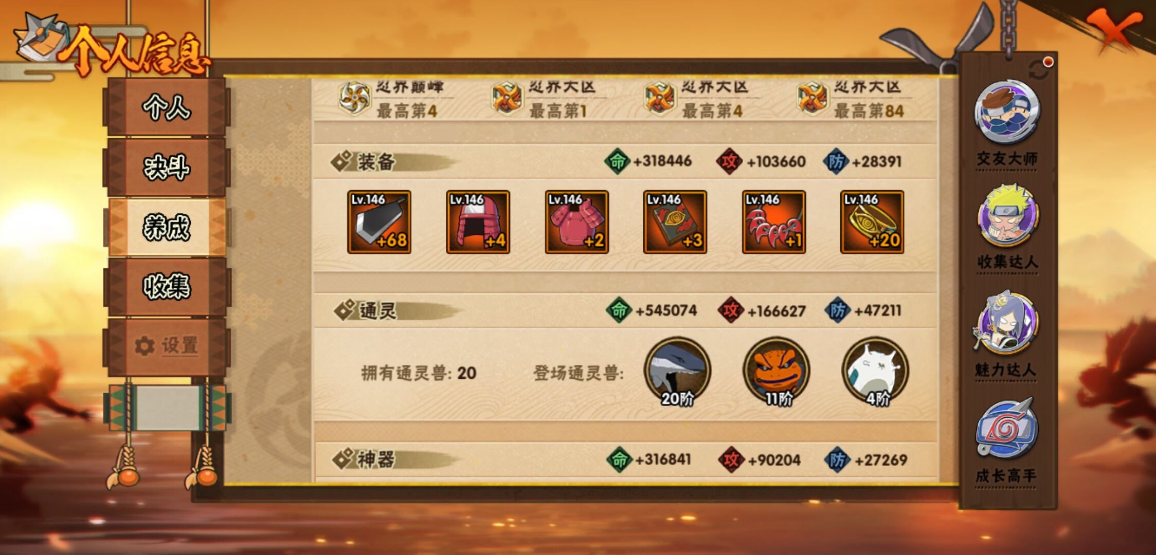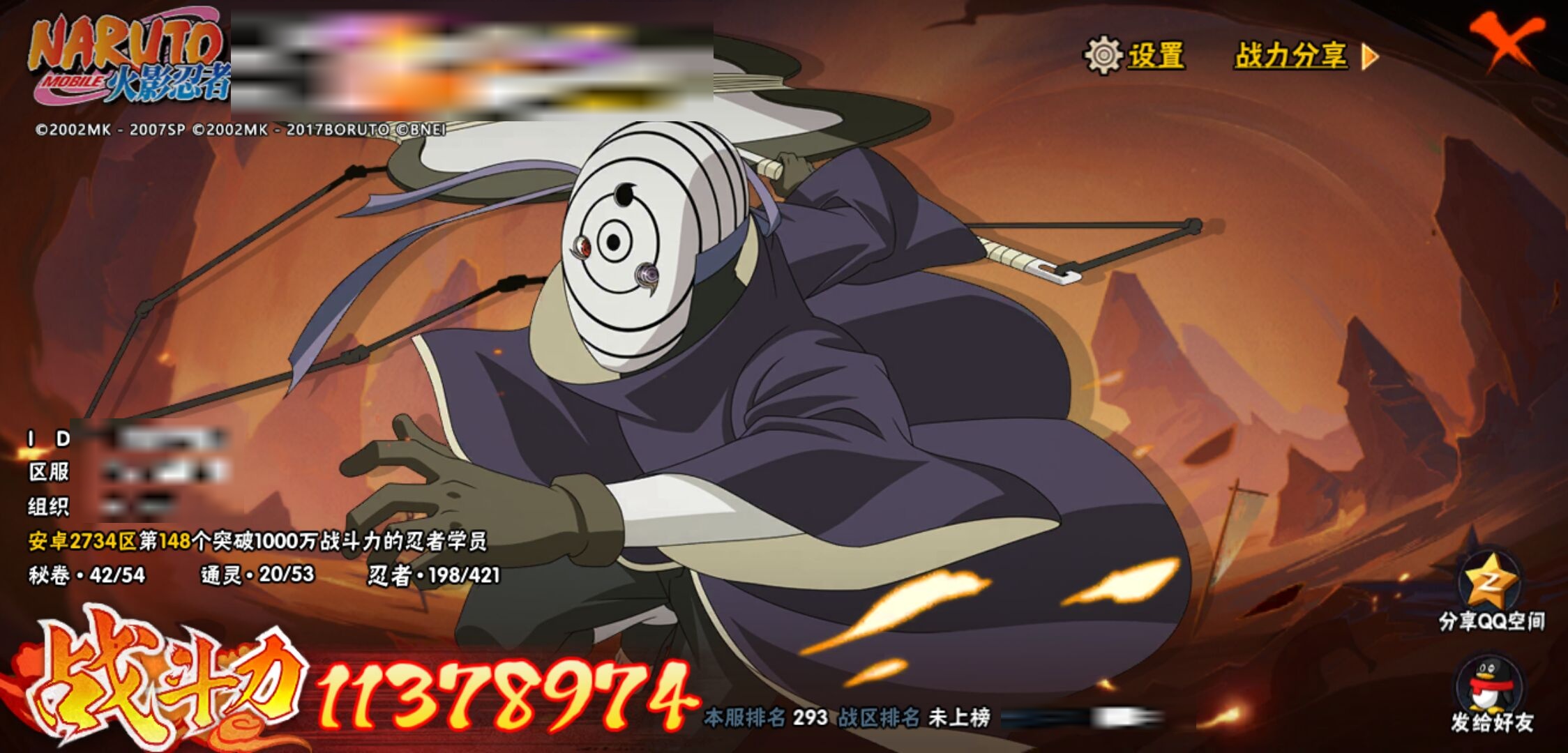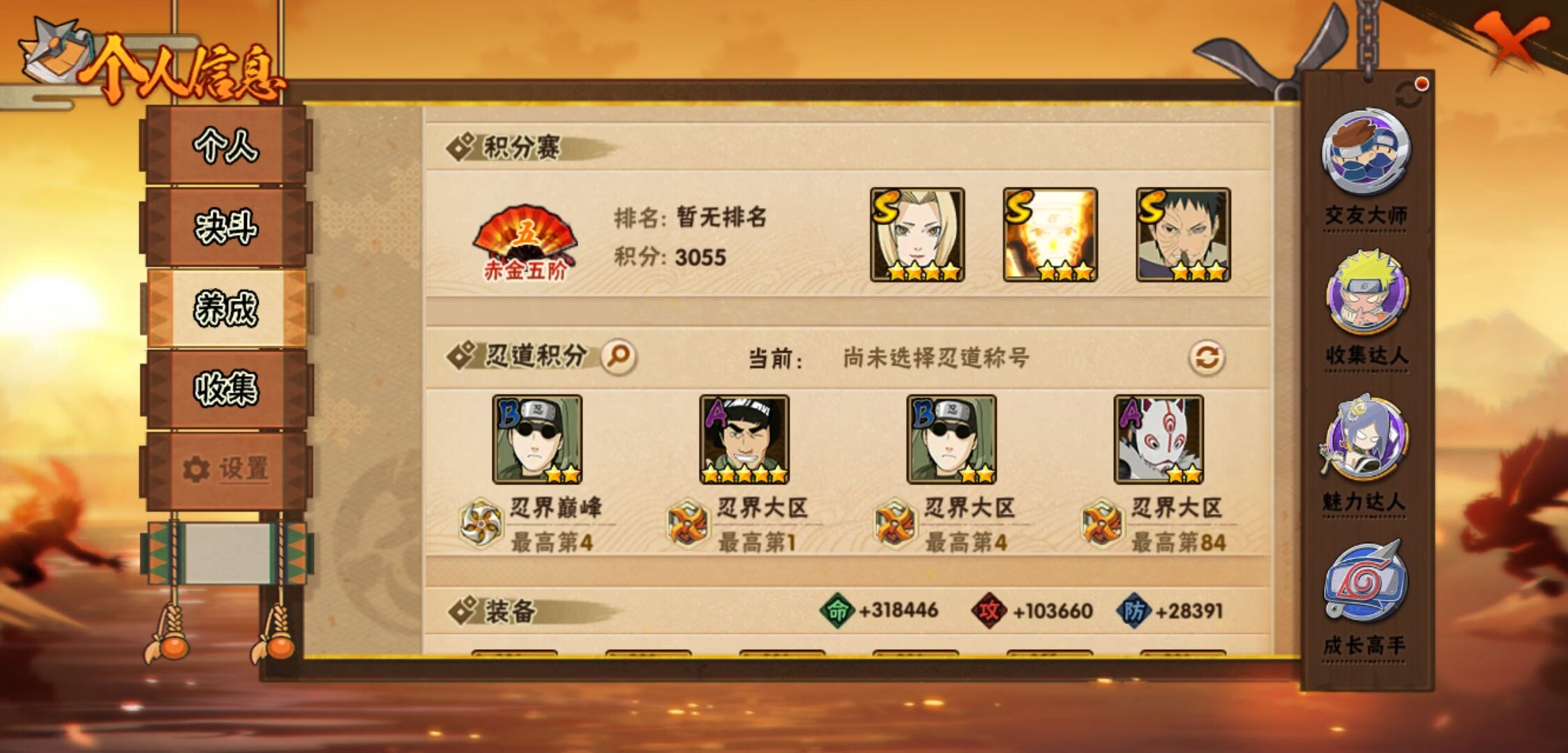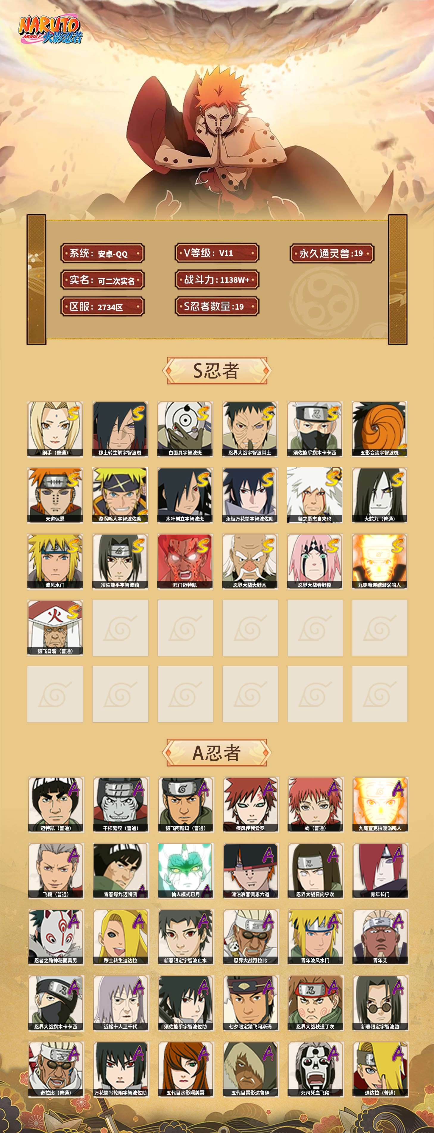 【火影忍者】【lyhy10874】战斗力:1138w;段位:暗部3阶;本服排名:293;vip:v11级;s忍:19个;a忍:37个;通灵兽:19个,s忍:秽土转生解宇智波斑|白面具宇智波斑|忍界大战宇智波带土|须佐能乎旗木卡卡西|五影会谈宇智波斑|天道佩恩|漩涡鸣人宇智波佐助|木叶创立宇智波斑|永恒万花筒宇智波佐助|舞之豪杰自来也|大蛇丸(普通)|纲手(普通) 4星|波风水门|须佐能乎宇智波鼬|死门迈特凯|忍界大战大野木|忍界大战春野樱|九喇嘛连结漩涡鸣人|猿飞日斩(普通)__a忍:青春爆炸迈特凯|仙人模式巳月|漂泊浪客佩恩六道|忍界大战日向宁次|青年长门|忍者之路神秘面具男|秽土转生迪达拉|新春限定宇智波止水|忍界大战奇拉比|青年波风水门|青年艾|忍界大战旗木卡卡西|近松十人卫千代|须佐能乎宇智波佐助|九尾查克拉漩涡鸣人 3星|七夕限定猿飞阿斯玛|忍界大战秋道丁次|新春限定宇智波鼬|奇拉比(普通)|万花筒写轮眼宇智波佐助|五代目水影照美冥|五代目雷影达鲁伊|死司凭血飞段|疾风传我爱罗 4星|迪达拉(普通)|飞段(普通) 3星|迈特凯(普通) 5星|宇智波鼬(普通)|干柿鬼鲛(普通) 5星|蝎(普通) 4星|绯流琥蝎|猿飞阿斯玛(普通) 5星|桃式显现漩涡博人|六代目水影长十郎|不缘|宇智波泉奈|初始形态机械鸣人__通灵兽:忍犬(普通)|蓝蛇|砂之守鹤|蛤蟆吉|忍龟|镰鼬|猿魔|山椒鱼|熊猫|蛞蝓(普通)|蜃|蛤蟆仙人|鲛鲨|怒鬼无臂|蛤蟆健|乌鸦(普通)|蛤蟆龙|蛤蟆广|梦貘