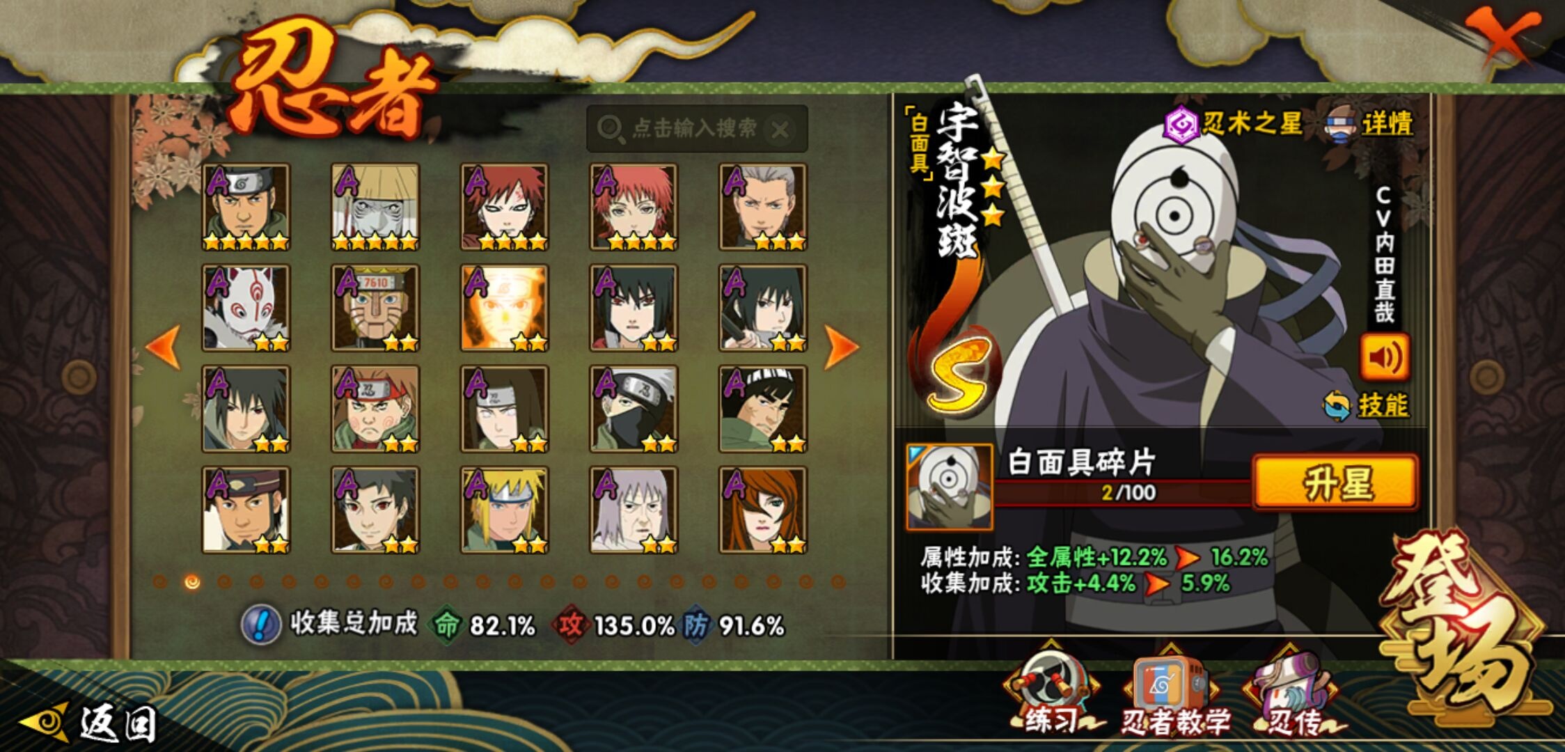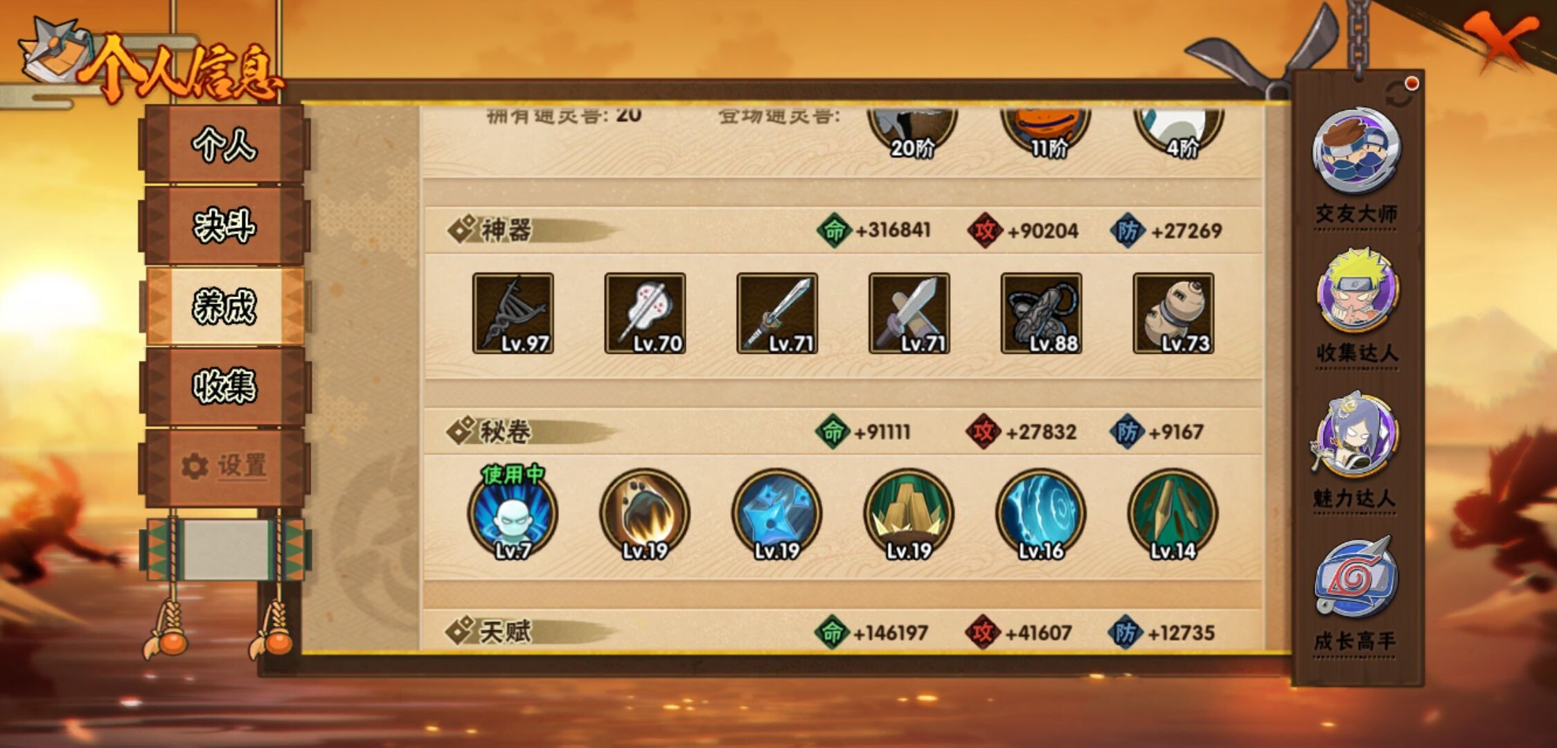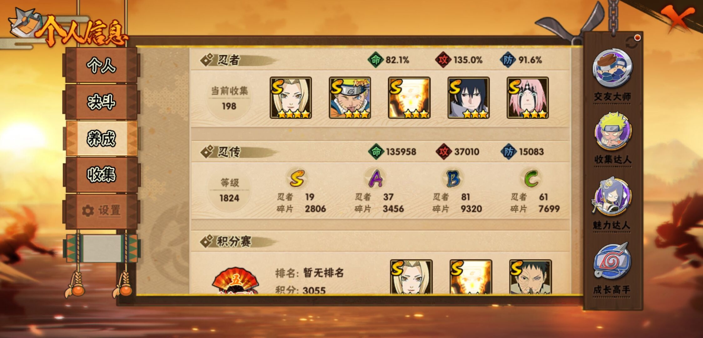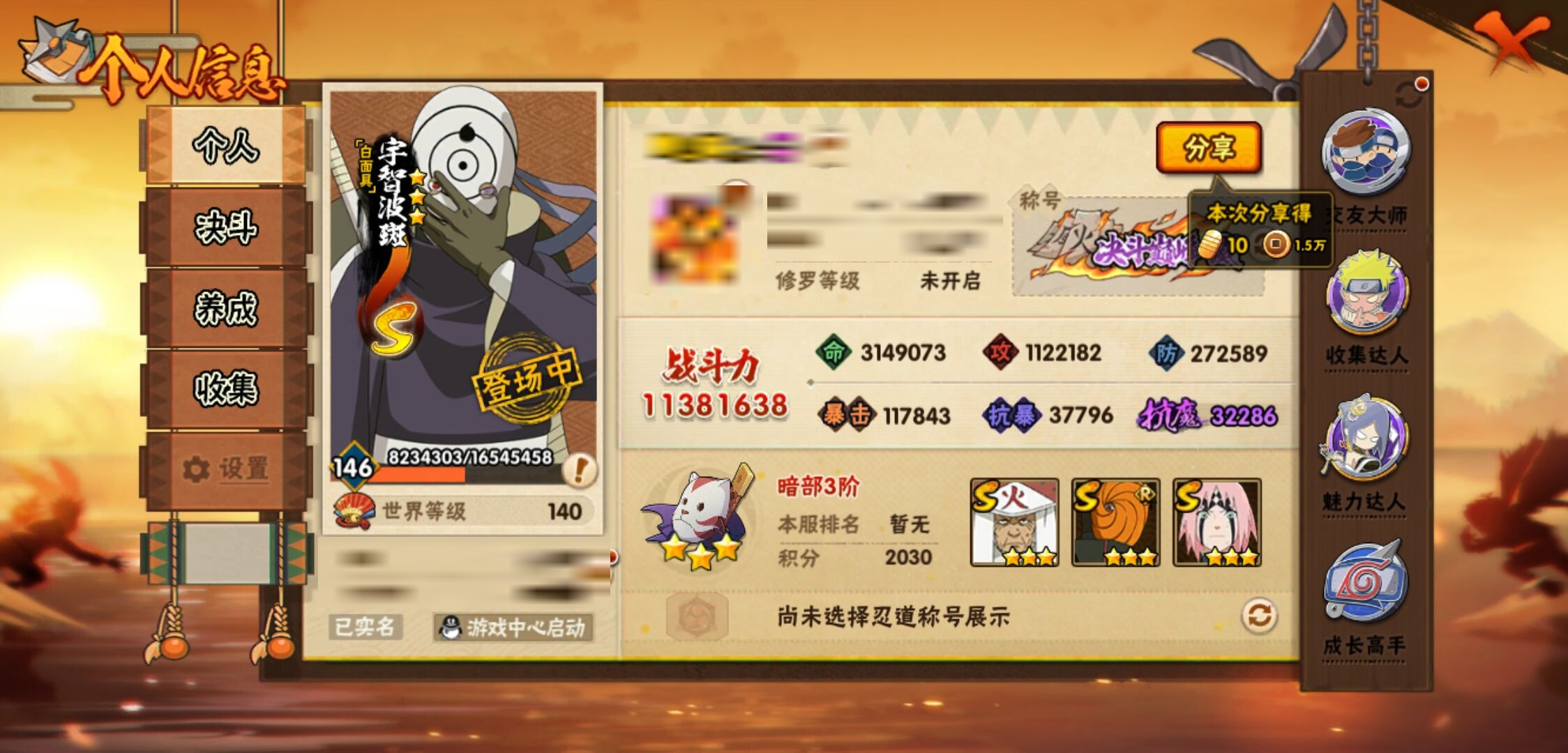 【火影忍者】【lyhy10874】战斗力:1138w;段位:暗部3阶;本服排名:293;vip:v11级;s忍:19个;a忍:37个;通灵兽:19个,s忍:秽土转生解宇智波斑|白面具宇智波斑|忍界大战宇智波带土|须佐能乎旗木卡卡西|五影会谈宇智波斑|天道佩恩|漩涡鸣人宇智波佐助|木叶创立宇智波斑|永恒万花筒宇智波佐助|舞之豪杰自来也|大蛇丸(普通)|纲手(普通) 4星|波风水门|须佐能乎宇智波鼬|死门迈特凯|忍界大战大野木|忍界大战春野樱|九喇嘛连结漩涡鸣人|猿飞日斩(普通)__a忍:青春爆炸迈特凯|仙人模式巳月|漂泊浪客佩恩六道|忍界大战日向宁次|青年长门|忍者之路神秘面具男|秽土转生迪达拉|新春限定宇智波止水|忍界大战奇拉比|青年波风水门|青年艾|忍界大战旗木卡卡西|近松十人卫千代|须佐能乎宇智波佐助|九尾查克拉漩涡鸣人 3星|七夕限定猿飞阿斯玛|忍界大战秋道丁次|新春限定宇智波鼬|奇拉比(普通)|万花筒写轮眼宇智波佐助|五代目水影照美冥|五代目雷影达鲁伊|死司凭血飞段|疾风传我爱罗 4星|迪达拉(普通)|飞段(普通) 3星|迈特凯(普通) 5星|宇智波鼬(普通)|干柿鬼鲛(普通) 5星|蝎(普通) 4星|绯流琥蝎|猿飞阿斯玛(普通) 5星|桃式显现漩涡博人|六代目水影长十郎|不缘|宇智波泉奈|初始形态机械鸣人__通灵兽:忍犬(普通)|蓝蛇|砂之守鹤|蛤蟆吉|忍龟|镰鼬|猿魔|山椒鱼|熊猫|蛞蝓(普通)|蜃|蛤蟆仙人|鲛鲨|怒鬼无臂|蛤蟆健|乌鸦(普通)|蛤蟆龙|蛤蟆广|梦貘