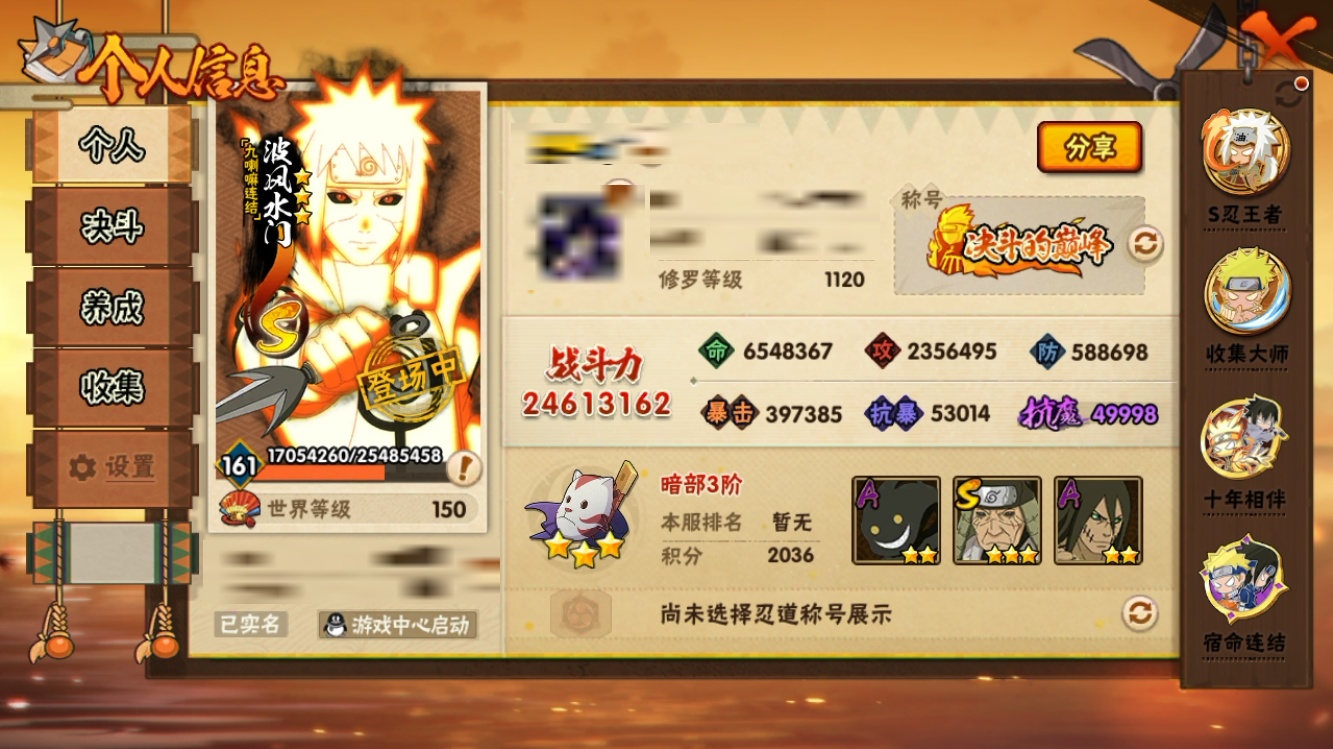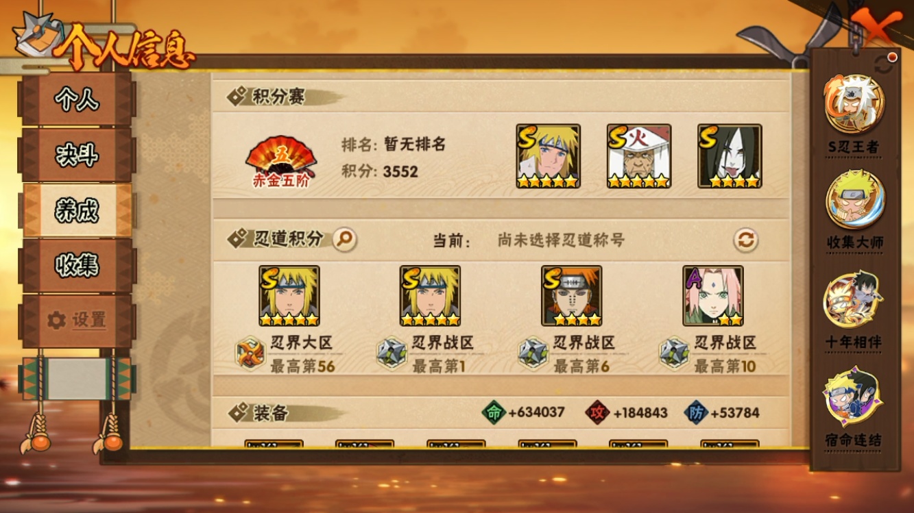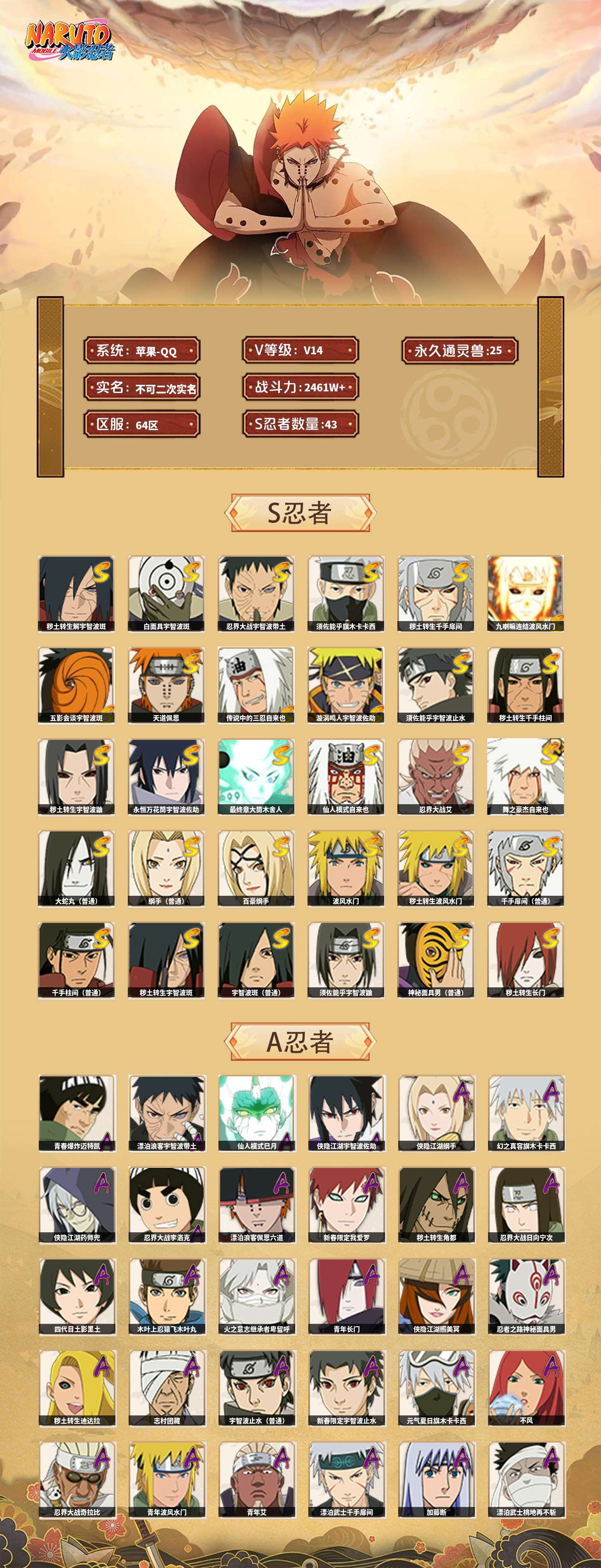 【火影忍者】【lyhy10884】战斗力:2461w;段位:暗部3阶;本服排名:115;vip:v14级;s忍:43个;a忍:84个;通灵兽:25个,s忍:秽土转生解宇智波斑|白面具宇智波斑|忍界大战宇智波带土|须佐能乎旗木卡卡西|秽土转生千手扉间|九喇嘛连结波风水门|五影会谈宇智波斑|天道佩恩|传说中的三忍自来也|漩涡鸣人宇智波佐助|须佐能乎宇智波止水|秽土转生千手柱间|秽土转生宇智波鼬|永恒万花筒宇智波佐助|最终章大筒木舍人|仙人模式自来也|忍界大战艾|舞之豪杰自来也|大蛇丸(普通)|纲手(普通)|百豪纲手|波风水门|秽土转生波风水门|千手扉间(普通)|千手柱间(普通)|秽土转生宇智波斑|宇智波斑(普通)|须佐能乎宇智波鼬|神秘面具男(普通)|秽土转生长门|秽土转生半藏|二代目水影鬼灯幻月|三代目土影大野木|四代目雷影艾|仙人模式药师兜|死门迈特凯|忍界大战春野樱|九喇嘛连结漩涡鸣人|大筒木桃式|猿飞日斩(普通)|秽土转生猿飞日斩|自来也(普通)|暴怒第六尾漩涡鸣人__a忍:青春爆炸迈特凯|漂泊浪客宇智波带土|仙人模式巳月|侠隐江湖宇智波佐助|侠隐江湖纲手|幻之真容旗木卡卡西|侠隐江湖药师兜|忍界大战李洛克|漂泊浪客佩恩六道|新春限定我爱罗|秽土转生角都|忍界大战日向宁次|四代目土影黑土|木叶上忍猿飞木叶丸|火之意志继承者卑留呼|青年长门|侠隐江湖照美冥|忍者之路神秘面具男|秽土转生迪达拉|志村团藏|宇智波止水(普通)|新春限定宇智波止水|元气夏日旗木卡卡西|不风|忍界大战奇拉比|青年波风水门|青年艾|漂泊武士千手扉间|加藤断|漂泊武士桃地再不斩|近松十人卫千代|晓创生角都|半蛇斗篷药师兜|须佐能乎宇智波佐助|九尾查克拉漩涡鸣人|新春限定小南|恶灵之影飞段|晓大蛇丸|地陆|火影继承人猿飞日斩|百豪春野樱|忍界大战秋道丁次|忍界大战我爱罗|忍界大战勘九郎|新春限定波风水门|新春限定宇智波鼬|奇拉比(普通)|万花筒写轮眼宇智波佐助|五代目水影照美冥|五代目雷影达鲁伊|绝|黑绝|死司凭血飞段|角都(普通)|地怨虞角都|疾风传我爱罗|迪达拉(普通)|飞段(普通)|小南(普通)|漂泊浪客小南|仙人模式漩涡鸣人|万花筒写轮眼旗木卡卡西|旗木卡卡西(普通)|迈特凯(普通)|宇智波鼬(普通)|夏日限定宇智波鼬|干柿鬼鲛(普通)|桃地再不斩|秽土转生桃地再不斩|蝎(普通)|绯流琥蝎|猿飞阿斯玛(普通)|桃式显现漩涡博人|最终章日向雏田|六代目水影长十郎|不缘|新春限定大蛇丸|不动|宇智波泉奈|羁绊神农|夏日限定黑土|忍界大战土台|初始形态机械鸣人|侠隐江湖大野木__通灵兽:忍犬(普通)|蓝蛇|蛤蟆吉|忍龟|镰鼬|猿魔|山椒鱼|蜃|蛤蟆仙人|鲛鲨|蛤蟆健|乌鸦(普通)|蛞蝓(普通)|蛤蟆广|梦貘|蛤蟆龙|蜘蛛|怒鬼爪|鹰|砂之守鹤|蛞蝓侠隐江湖|万蛇|熊猫|螃蟹|变色龙