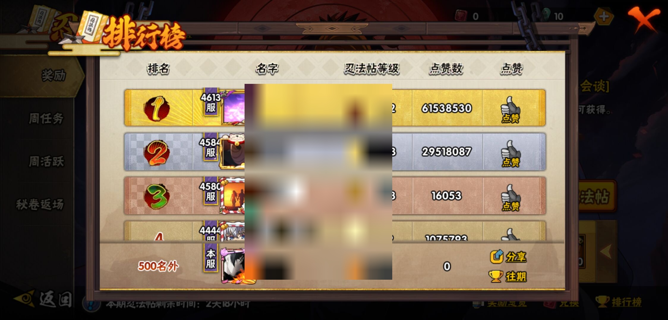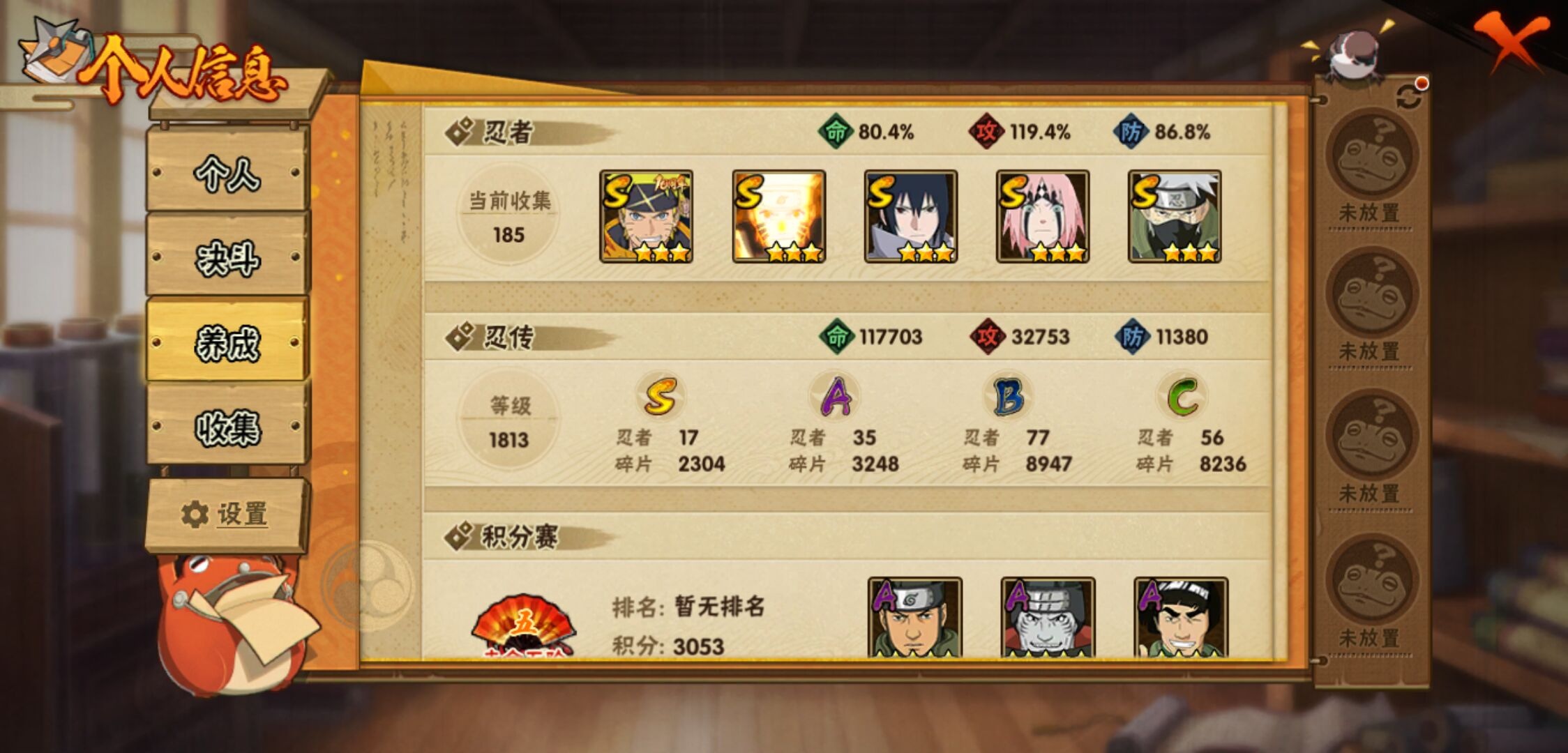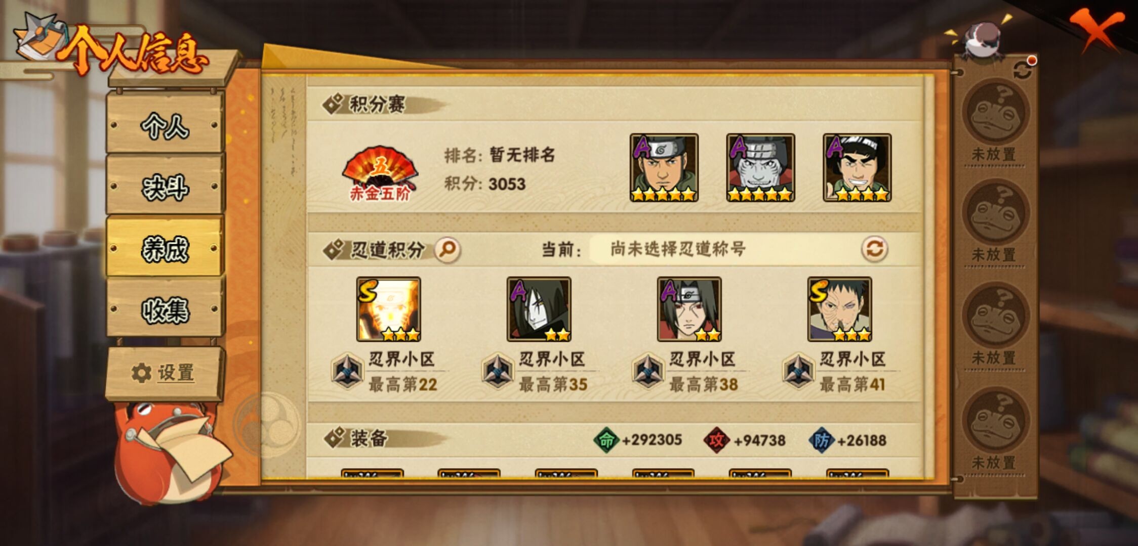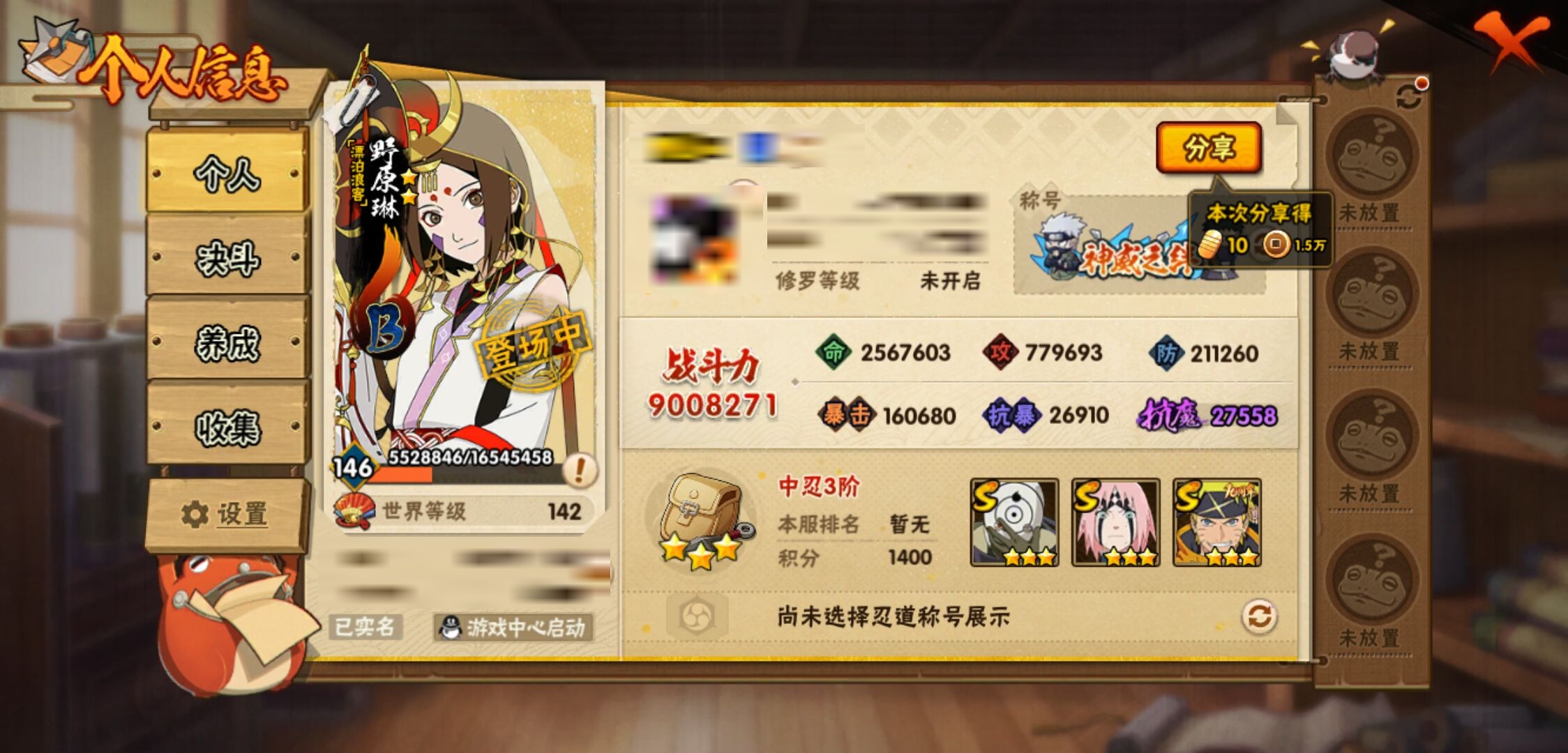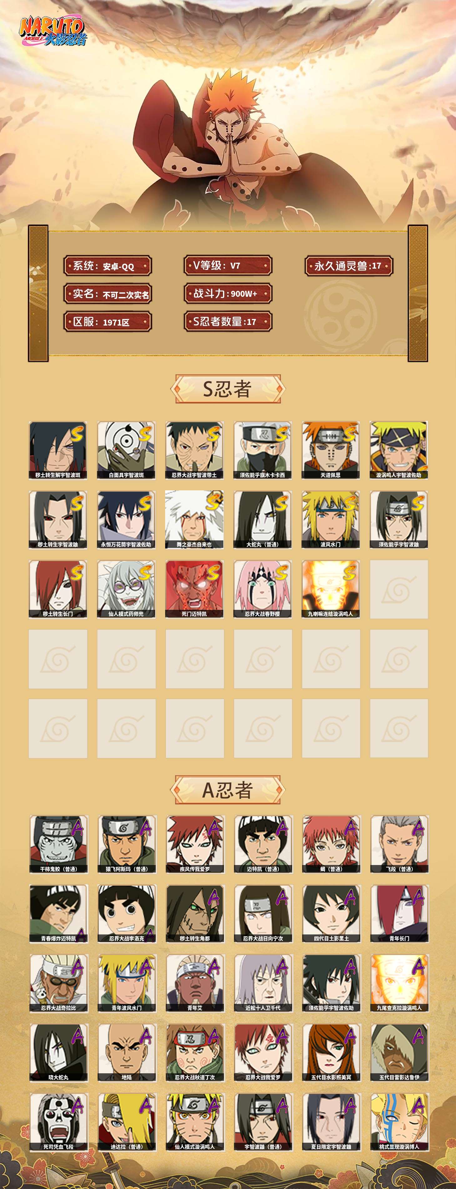 【火影忍者】【lyhy10901】战斗力:900w;段位:中忍3阶;本服排名:517;vip:v7级;s忍:17个;a忍:35个;通灵兽:17个,s忍:秽土转生解宇智波斑|白面具宇智波斑|忍界大战宇智波带土|须佐能乎旗木卡卡西|天道佩恩|漩涡鸣人宇智波佐助|秽土转生宇智波鼬|永恒万花筒宇智波佐助|舞之豪杰自来也|大蛇丸(普通)|波风水门|须佐能乎宇智波鼬|秽土转生长门|仙人模式药师兜|死门迈特凯|忍界大战春野樱|九喇嘛连结漩涡鸣人__a忍:青春爆炸迈特凯|忍界大战李洛克|秽土转生角都|忍界大战日向宁次|四代目土影黑土|青年长门|忍界大战奇拉比|青年波风水门|青年艾|近松十人卫千代|须佐能乎宇智波佐助|九尾查克拉漩涡鸣人|晓大蛇丸|地陆|忍界大战秋道丁次|忍界大战我爱罗|五代目水影照美冥|五代目雷影达鲁伊|死司凭血飞段|疾风传我爱罗 4星|迪达拉(普通)|飞段(普通) 3星|仙人模式漩涡鸣人|迈特凯(普通) 4星|宇智波鼬(普通)|夏日限定宇智波鼬|干柿鬼鲛(普通) 5星|蝎(普通) 4星|猿飞阿斯玛(普通) 5星|桃式显现漩涡博人|最终章日向雏田|六代目水影长十郎|不缘|宇智波泉奈|忍界大战土台__通灵兽:忍犬(普通)|蓝蛇|蛤蟆吉|忍龟|镰鼬|猿魔|山椒鱼|蜃|蛤蟆仙人|鲛鲨|砂之守鹤|蛤蟆健|乌鸦(普通)|蛤蟆龙|蛤蟆广|乌鸦夏日限定|梦貘