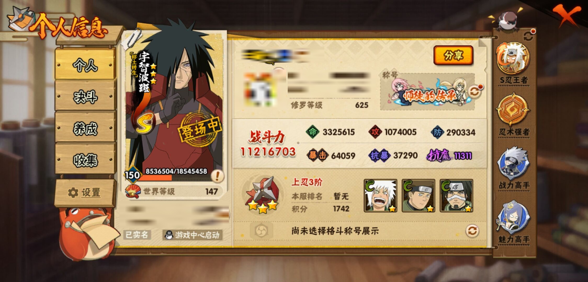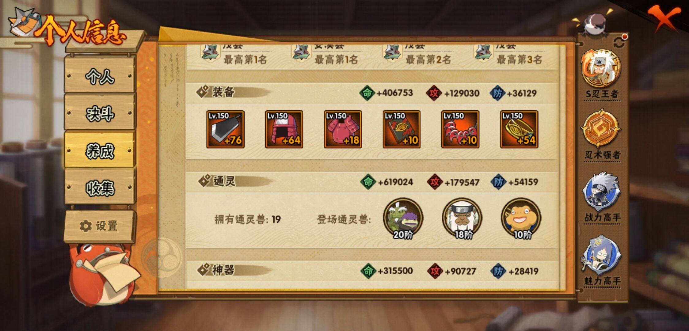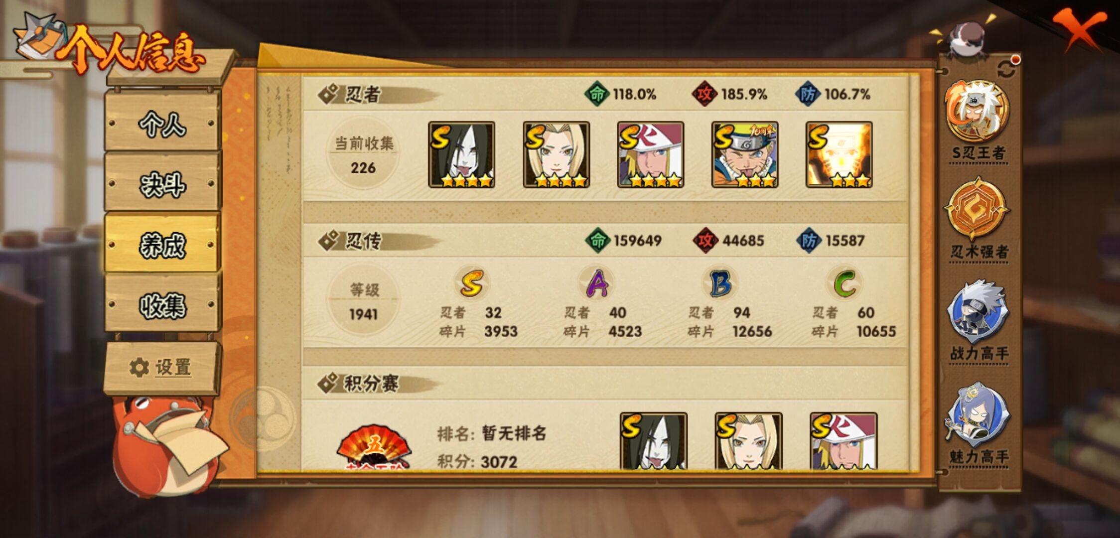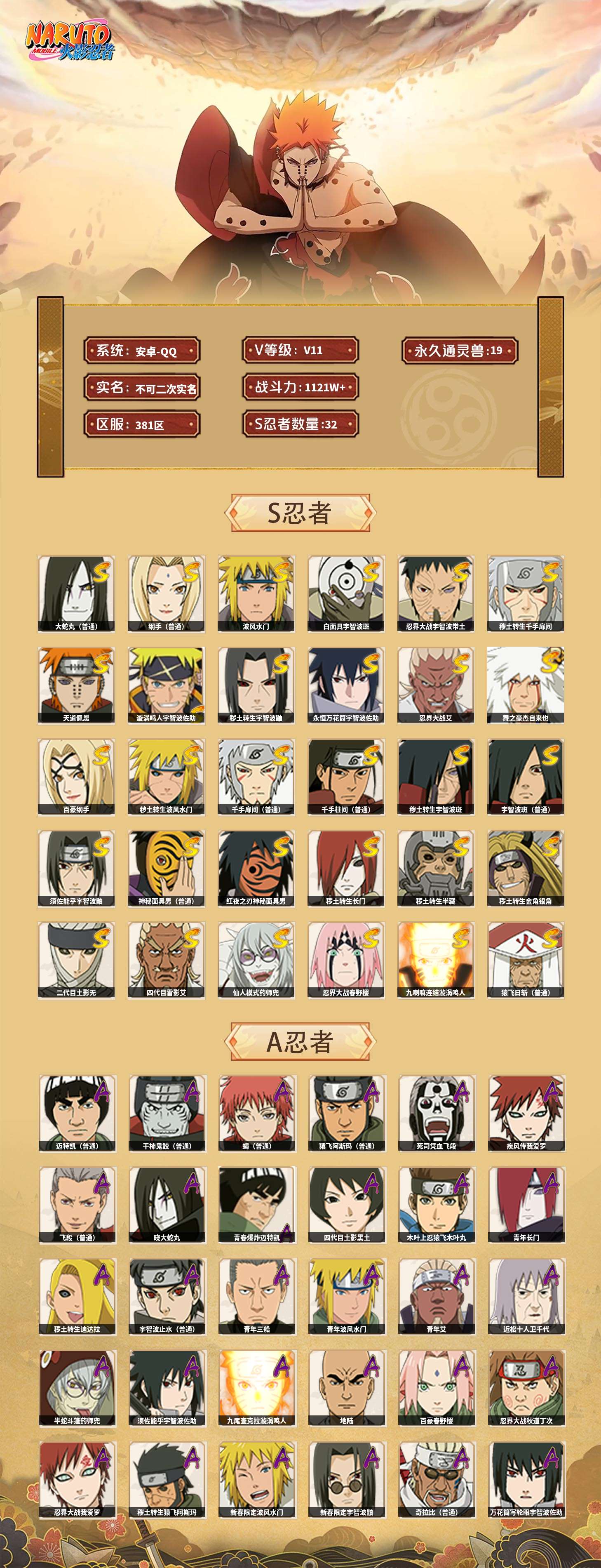 【火影忍者】【lyhy10912】战斗力:1121w;段位:上忍3阶;本服排名:494;vip:v11级;s忍:32个;a忍:40个;通灵兽:19个,s忍:白面具宇智波斑|忍界大战宇智波带土|秽土转生千手扉间|天道佩恩|漩涡鸣人宇智波佐助|秽土转生宇智波鼬|永恒万花筒宇智波佐助|忍界大战艾|舞之豪杰自来也|大蛇丸(普通) 4星|纲手(普通) 4星|百豪纲手|波风水门 4星|秽土转生波风水门|千手扉间(普通)|千手柱间(普通)|秽土转生宇智波斑|宇智波斑(普通)|须佐能乎宇智波鼬|神秘面具男(普通)|红夜之刃神秘面具男|秽土转生长门|秽土转生半藏|秽土转生金角银角|二代目土影无|四代目雷影艾|仙人模式药师兜|忍界大战春野樱|九喇嘛连结漩涡鸣人|猿飞日斩(普通)|秽土转生猿飞日斩|自来也(普通)__a忍:青春爆炸迈特凯|四代目土影黑土|木叶上忍猿飞木叶丸|青年长门|秽土转生迪达拉|宇智波止水(普通)|青年三船|青年波风水门|青年艾|近松十人卫千代|半蛇斗篷药师兜|须佐能乎宇智波佐助|九尾查克拉漩涡鸣人|晓大蛇丸 3星|地陆|百豪春野樱|忍界大战秋道丁次|忍界大战我爱罗|秽土转生猿飞阿斯玛|新春限定波风水门|新春限定宇智波鼬|奇拉比(普通)|万花筒写轮眼宇智波佐助|五代目水影照美冥|死司凭血飞段 4星|角都(普通)|地怨虞角都|疾风传我爱罗 4星|迪达拉(普通)|飞段(普通) 4星|小南(普通)|仙人模式漩涡鸣人|万花筒写轮眼旗木卡卡西|迈特凯(普通) 5星|宇智波鼬(普通)|干柿鬼鲛(普通) 5星|蝎(普通) 5星|猿飞阿斯玛(普通) 5星|六代目水影长十郎|不缘__通灵兽:忍犬(普通)|蓝蛇|蛤蟆吉|忍龟|镰鼬|猿魔|山椒鱼|蜃|蛞蝓(普通)|蛤蟆仙人|鲛鲨|蛤蟆健|乌鸦(普通)|蛤蟆龙|蛤蟆广|梦貘|鹰|蜘蛛|砂之守鹤