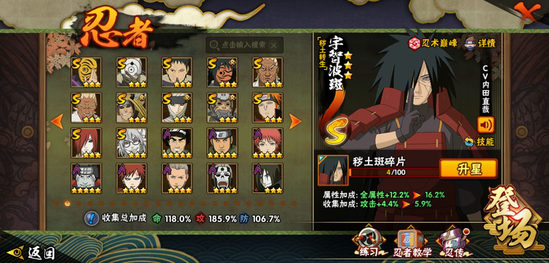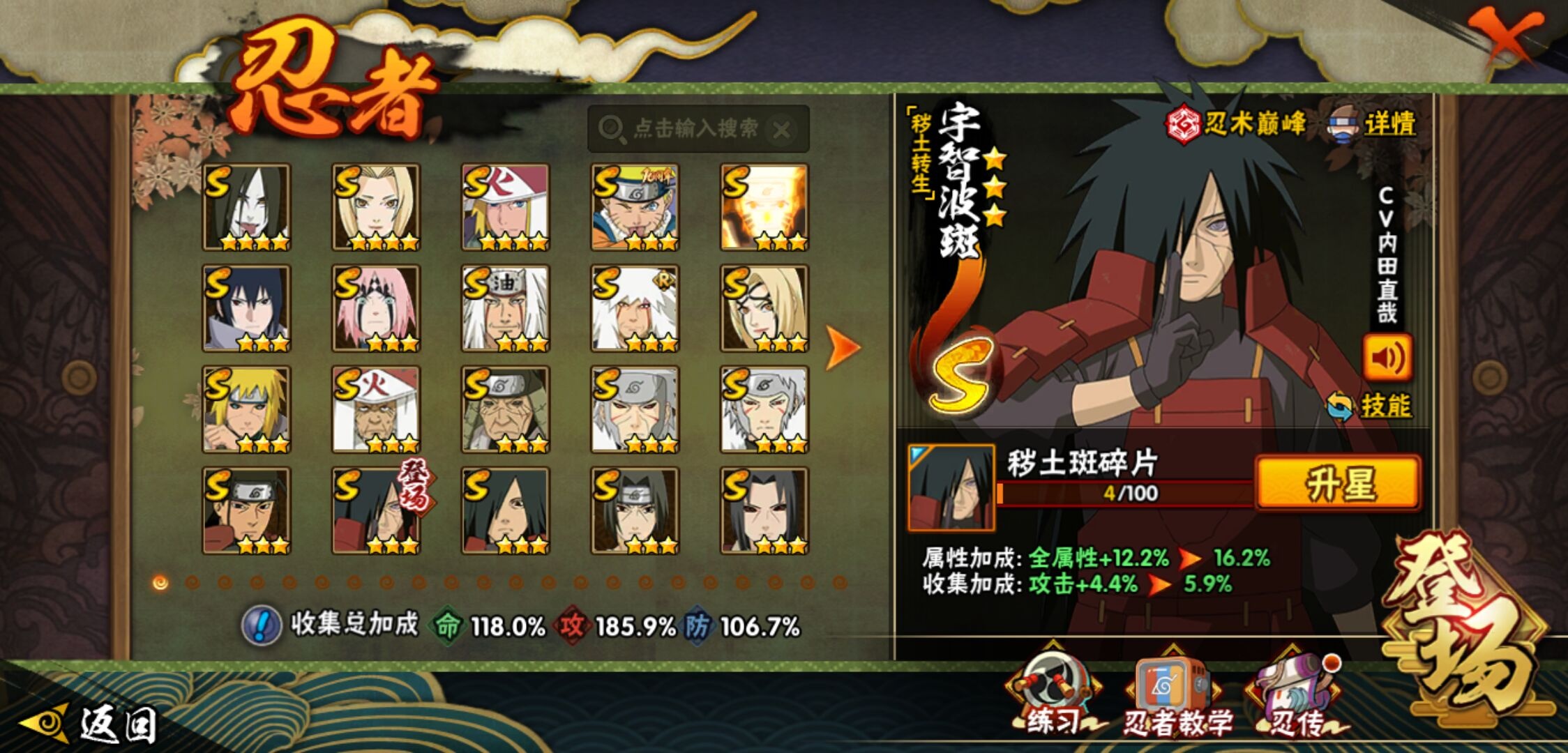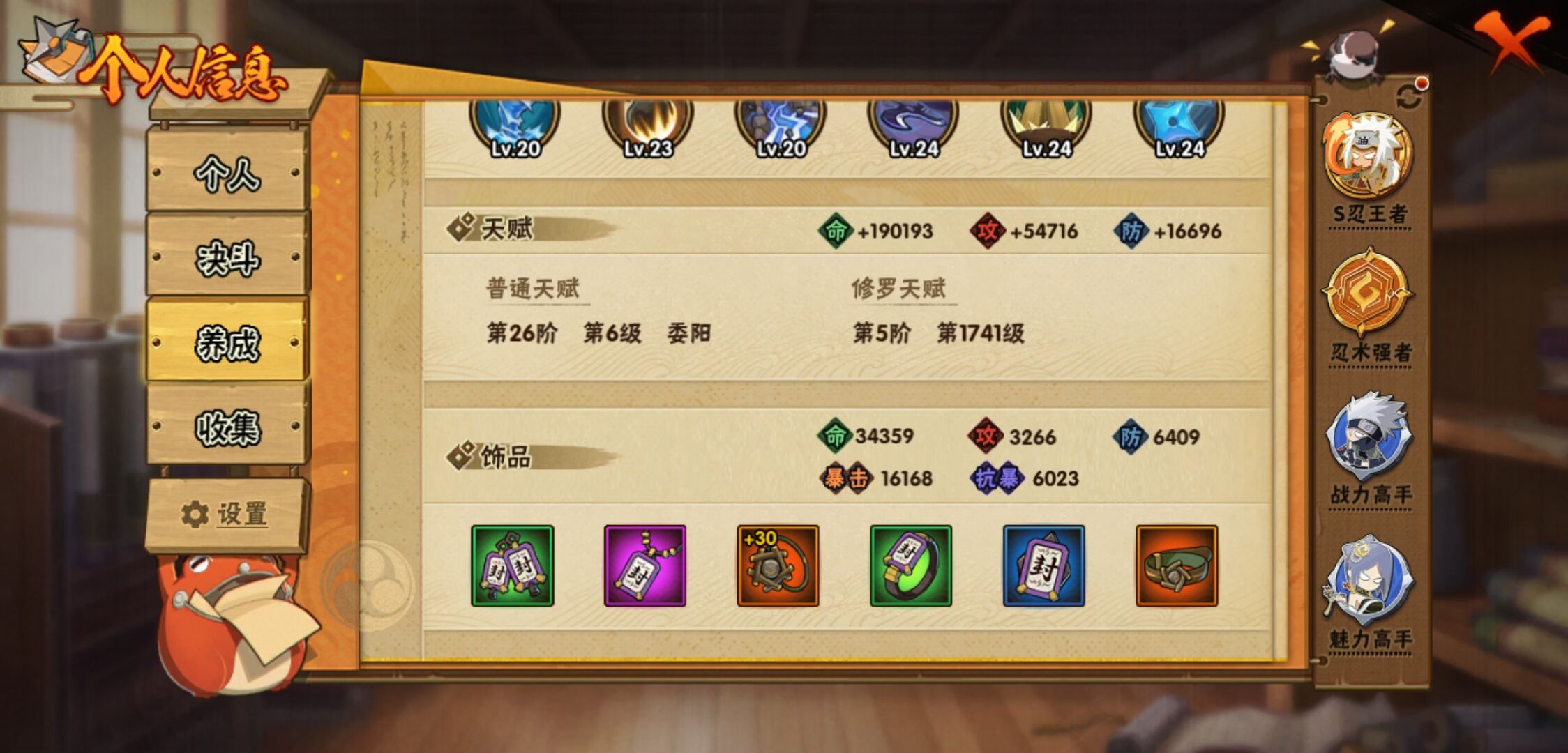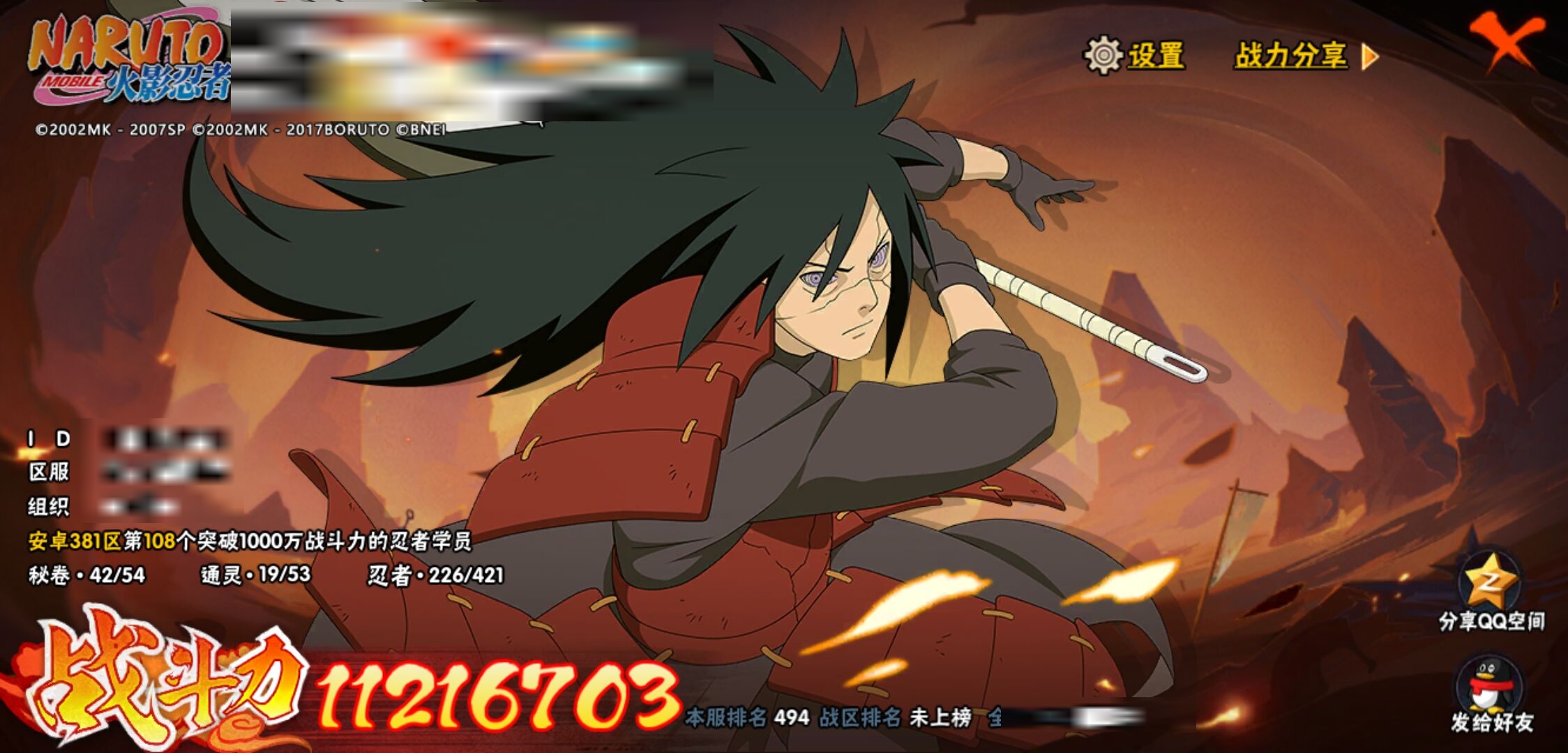 【火影忍者】【lyhy10912】战斗力:1121w;段位:上忍3阶;本服排名:494;vip:v11级;s忍:32个;a忍:40个;通灵兽:19个,s忍:白面具宇智波斑|忍界大战宇智波带土|秽土转生千手扉间|天道佩恩|漩涡鸣人宇智波佐助|秽土转生宇智波鼬|永恒万花筒宇智波佐助|忍界大战艾|舞之豪杰自来也|大蛇丸(普通) 4星|纲手(普通) 4星|百豪纲手|波风水门 4星|秽土转生波风水门|千手扉间(普通)|千手柱间(普通)|秽土转生宇智波斑|宇智波斑(普通)|须佐能乎宇智波鼬|神秘面具男(普通)|红夜之刃神秘面具男|秽土转生长门|秽土转生半藏|秽土转生金角银角|二代目土影无|四代目雷影艾|仙人模式药师兜|忍界大战春野樱|九喇嘛连结漩涡鸣人|猿飞日斩(普通)|秽土转生猿飞日斩|自来也(普通)__a忍:青春爆炸迈特凯|四代目土影黑土|木叶上忍猿飞木叶丸|青年长门|秽土转生迪达拉|宇智波止水(普通)|青年三船|青年波风水门|青年艾|近松十人卫千代|半蛇斗篷药师兜|须佐能乎宇智波佐助|九尾查克拉漩涡鸣人|晓大蛇丸 3星|地陆|百豪春野樱|忍界大战秋道丁次|忍界大战我爱罗|秽土转生猿飞阿斯玛|新春限定波风水门|新春限定宇智波鼬|奇拉比(普通)|万花筒写轮眼宇智波佐助|五代目水影照美冥|死司凭血飞段 4星|角都(普通)|地怨虞角都|疾风传我爱罗 4星|迪达拉(普通)|飞段(普通) 4星|小南(普通)|仙人模式漩涡鸣人|万花筒写轮眼旗木卡卡西|迈特凯(普通) 5星|宇智波鼬(普通)|干柿鬼鲛(普通) 5星|蝎(普通) 5星|猿飞阿斯玛(普通) 5星|六代目水影长十郎|不缘__通灵兽:忍犬(普通)|蓝蛇|蛤蟆吉|忍龟|镰鼬|猿魔|山椒鱼|蜃|蛞蝓(普通)|蛤蟆仙人|鲛鲨|蛤蟆健|乌鸦(普通)|蛤蟆龙|蛤蟆广|梦貘|鹰|蜘蛛|砂之守鹤