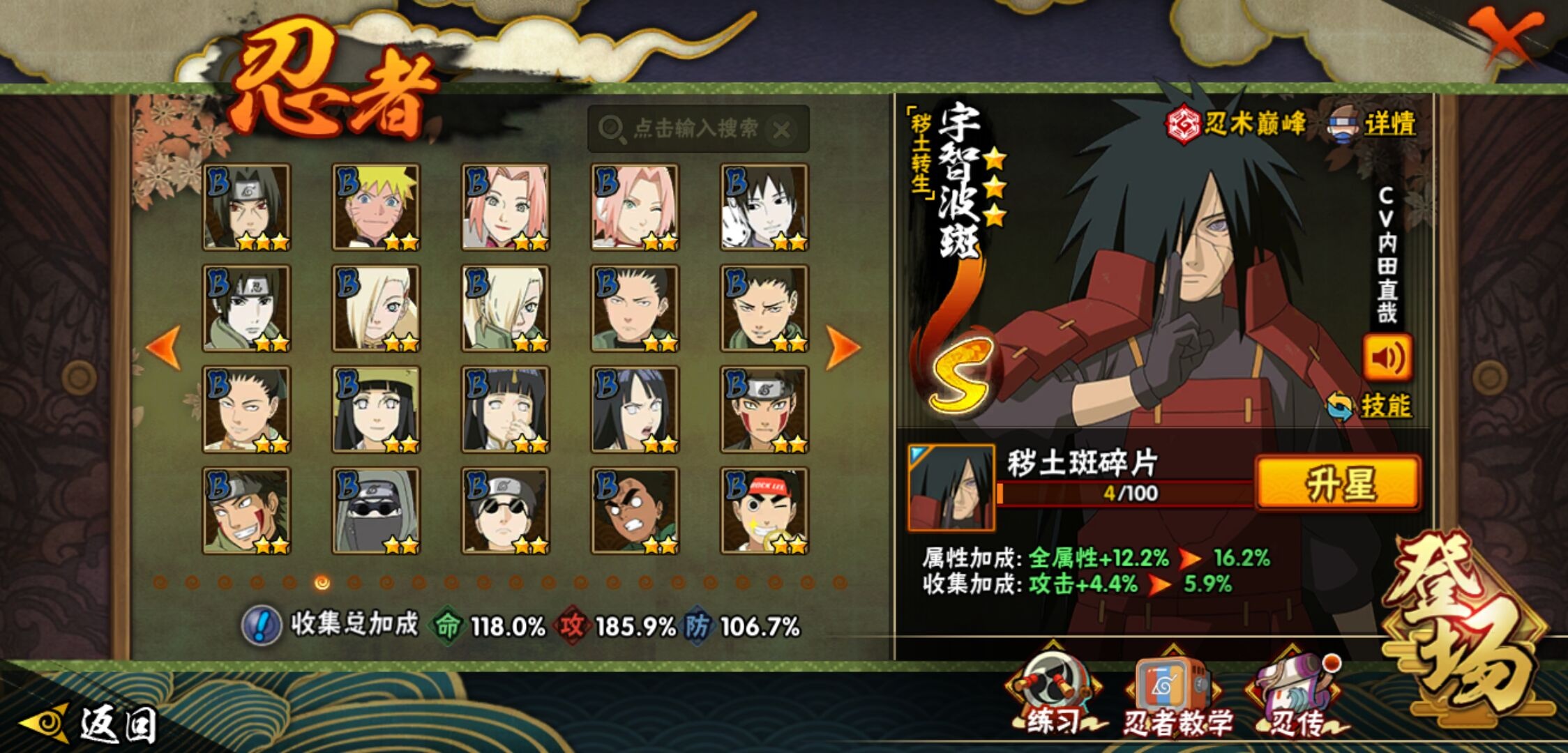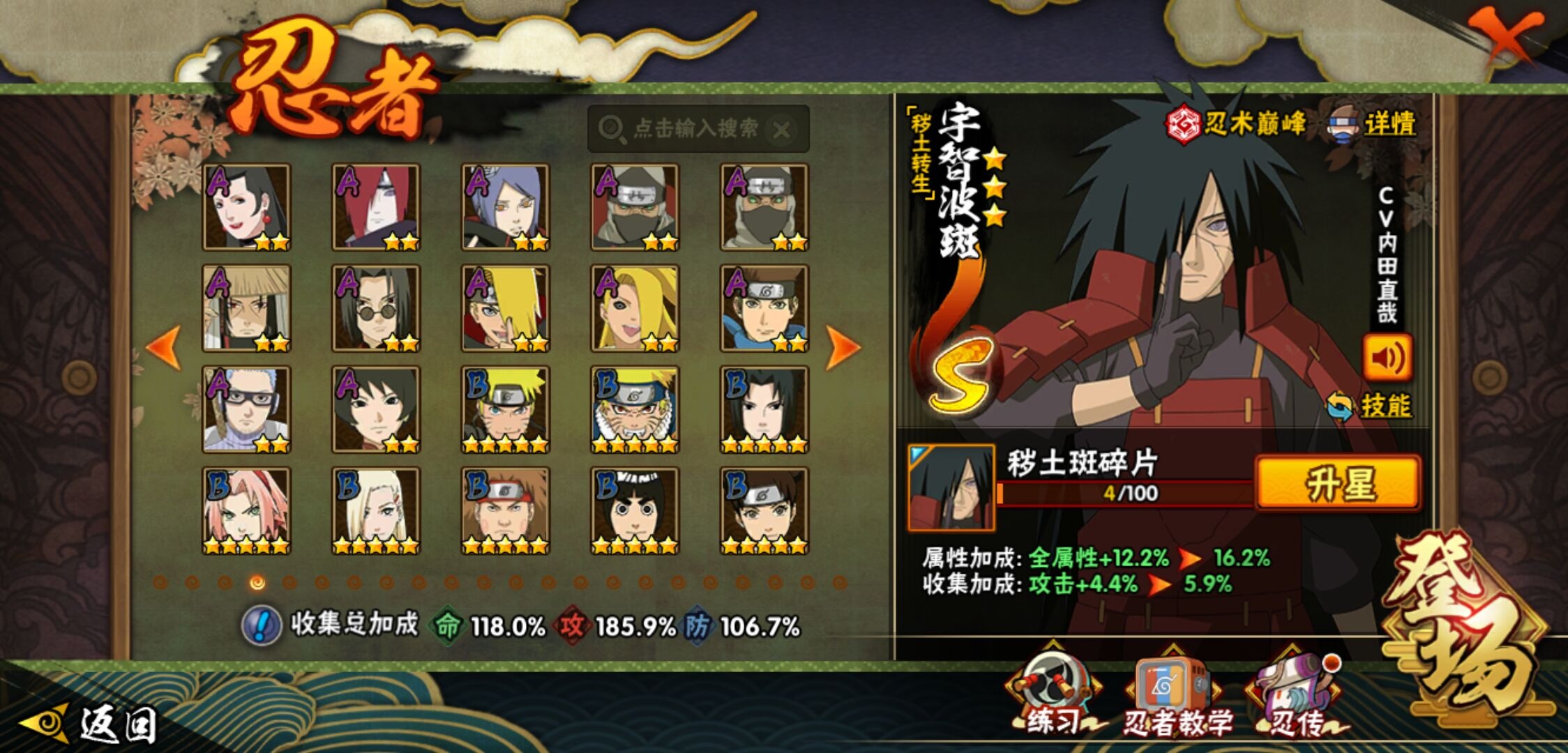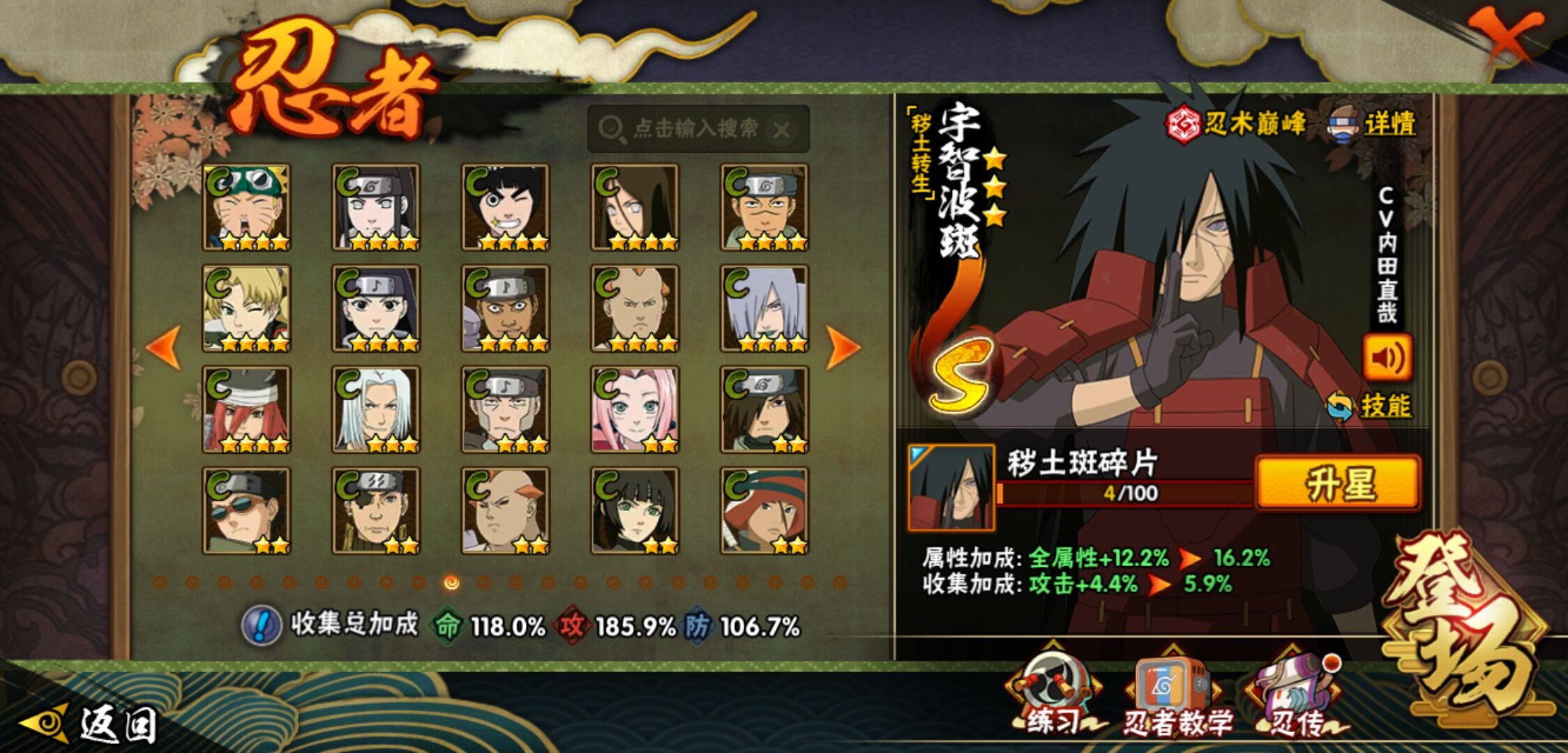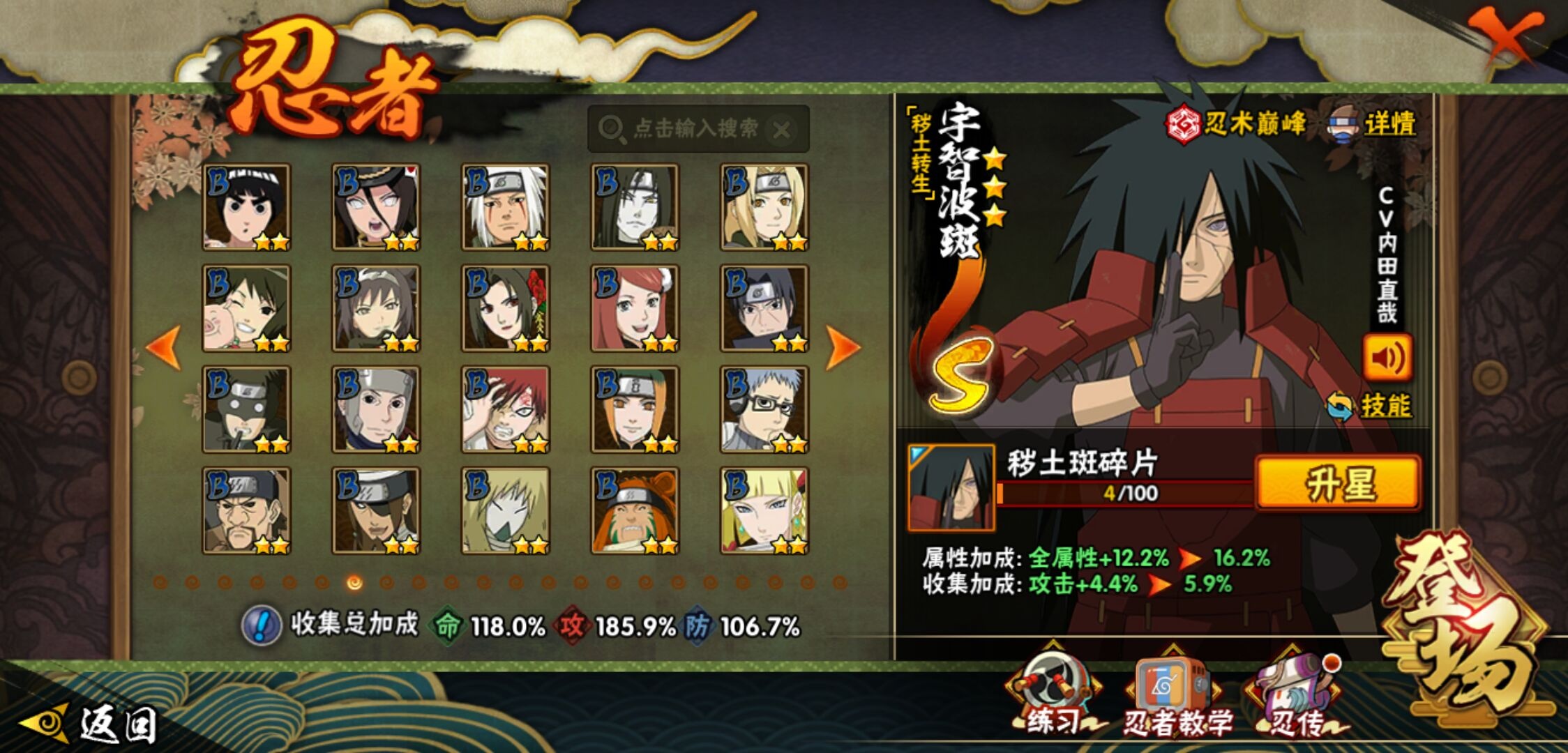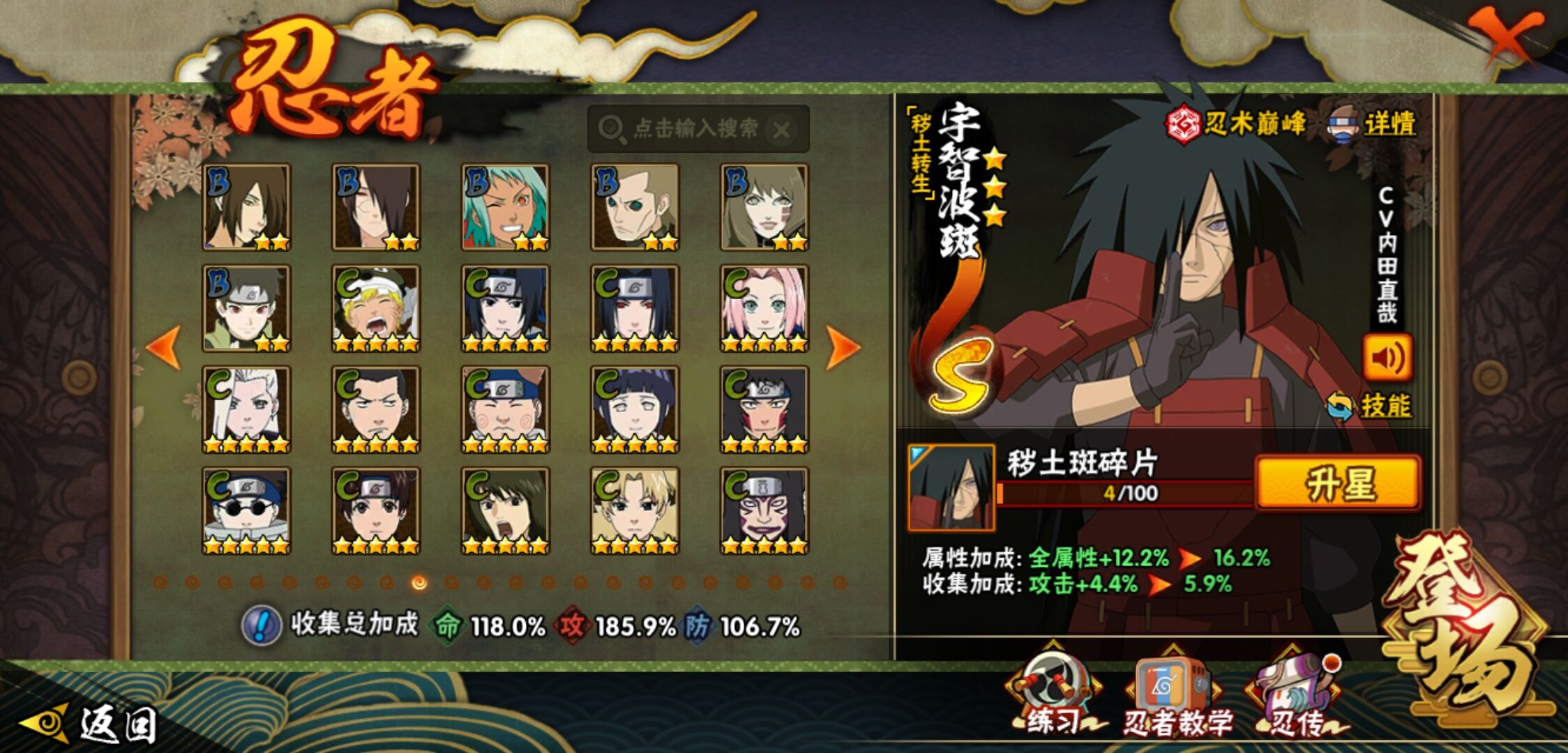 【火影忍者】【lyhy10912】战斗力:1121w;段位:上忍3阶;本服排名:494;vip:v11级;s忍:32个;a忍:40个;通灵兽:19个,s忍:白面具宇智波斑|忍界大战宇智波带土|秽土转生千手扉间|天道佩恩|漩涡鸣人宇智波佐助|秽土转生宇智波鼬|永恒万花筒宇智波佐助|忍界大战艾|舞之豪杰自来也|大蛇丸(普通) 4星|纲手(普通) 4星|百豪纲手|波风水门 4星|秽土转生波风水门|千手扉间(普通)|千手柱间(普通)|秽土转生宇智波斑|宇智波斑(普通)|须佐能乎宇智波鼬|神秘面具男(普通)|红夜之刃神秘面具男|秽土转生长门|秽土转生半藏|秽土转生金角银角|二代目土影无|四代目雷影艾|仙人模式药师兜|忍界大战春野樱|九喇嘛连结漩涡鸣人|猿飞日斩(普通)|秽土转生猿飞日斩|自来也(普通)__a忍:青春爆炸迈特凯|四代目土影黑土|木叶上忍猿飞木叶丸|青年长门|秽土转生迪达拉|宇智波止水(普通)|青年三船|青年波风水门|青年艾|近松十人卫千代|半蛇斗篷药师兜|须佐能乎宇智波佐助|九尾查克拉漩涡鸣人|晓大蛇丸 3星|地陆|百豪春野樱|忍界大战秋道丁次|忍界大战我爱罗|秽土转生猿飞阿斯玛|新春限定波风水门|新春限定宇智波鼬|奇拉比(普通)|万花筒写轮眼宇智波佐助|五代目水影照美冥|死司凭血飞段 4星|角都(普通)|地怨虞角都|疾风传我爱罗 4星|迪达拉(普通)|飞段(普通) 4星|小南(普通)|仙人模式漩涡鸣人|万花筒写轮眼旗木卡卡西|迈特凯(普通) 5星|宇智波鼬(普通)|干柿鬼鲛(普通) 5星|蝎(普通) 5星|猿飞阿斯玛(普通) 5星|六代目水影长十郎|不缘__通灵兽:忍犬(普通)|蓝蛇|蛤蟆吉|忍龟|镰鼬|猿魔|山椒鱼|蜃|蛞蝓(普通)|蛤蟆仙人|鲛鲨|蛤蟆健|乌鸦(普通)|蛤蟆龙|蛤蟆广|梦貘|鹰|蜘蛛|砂之守鹤