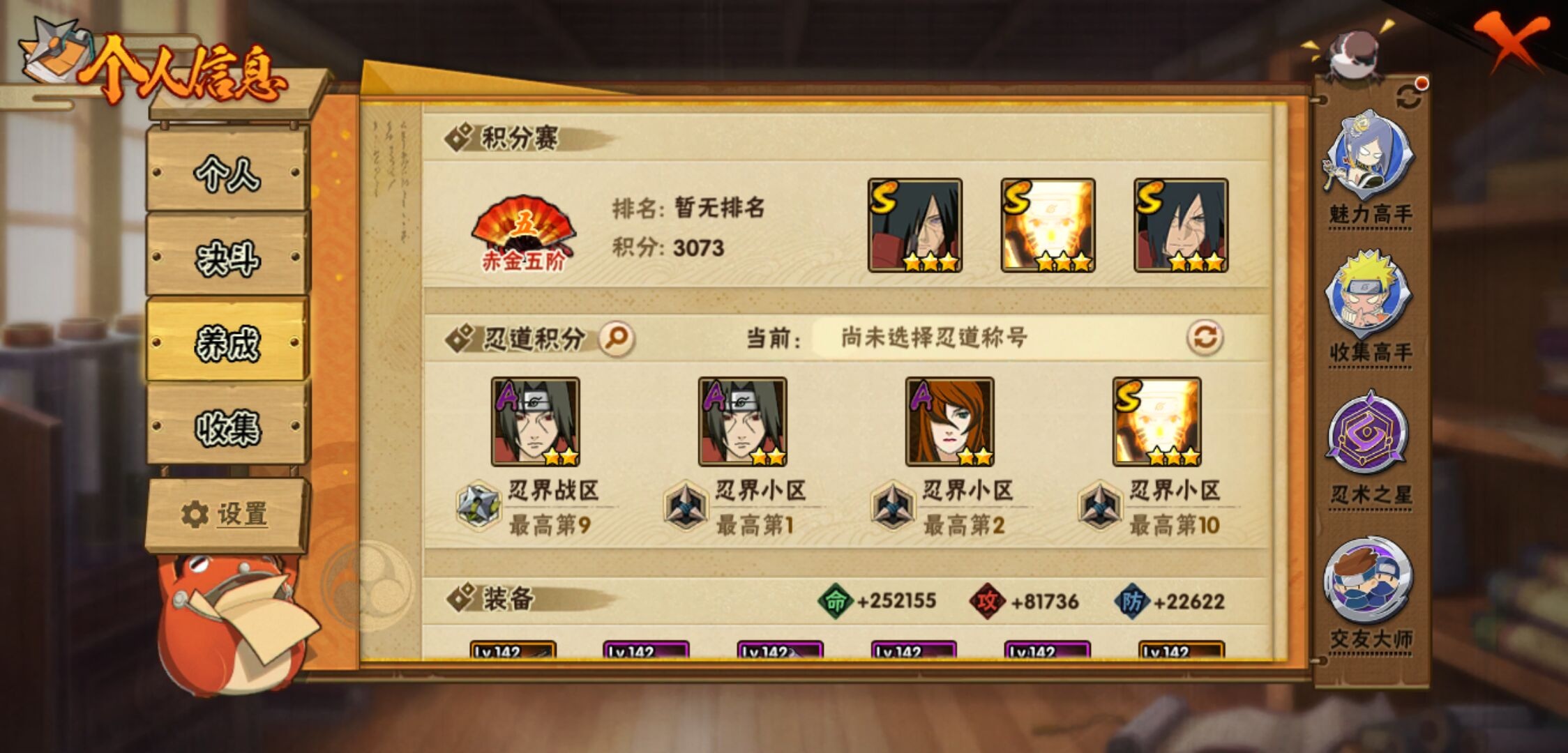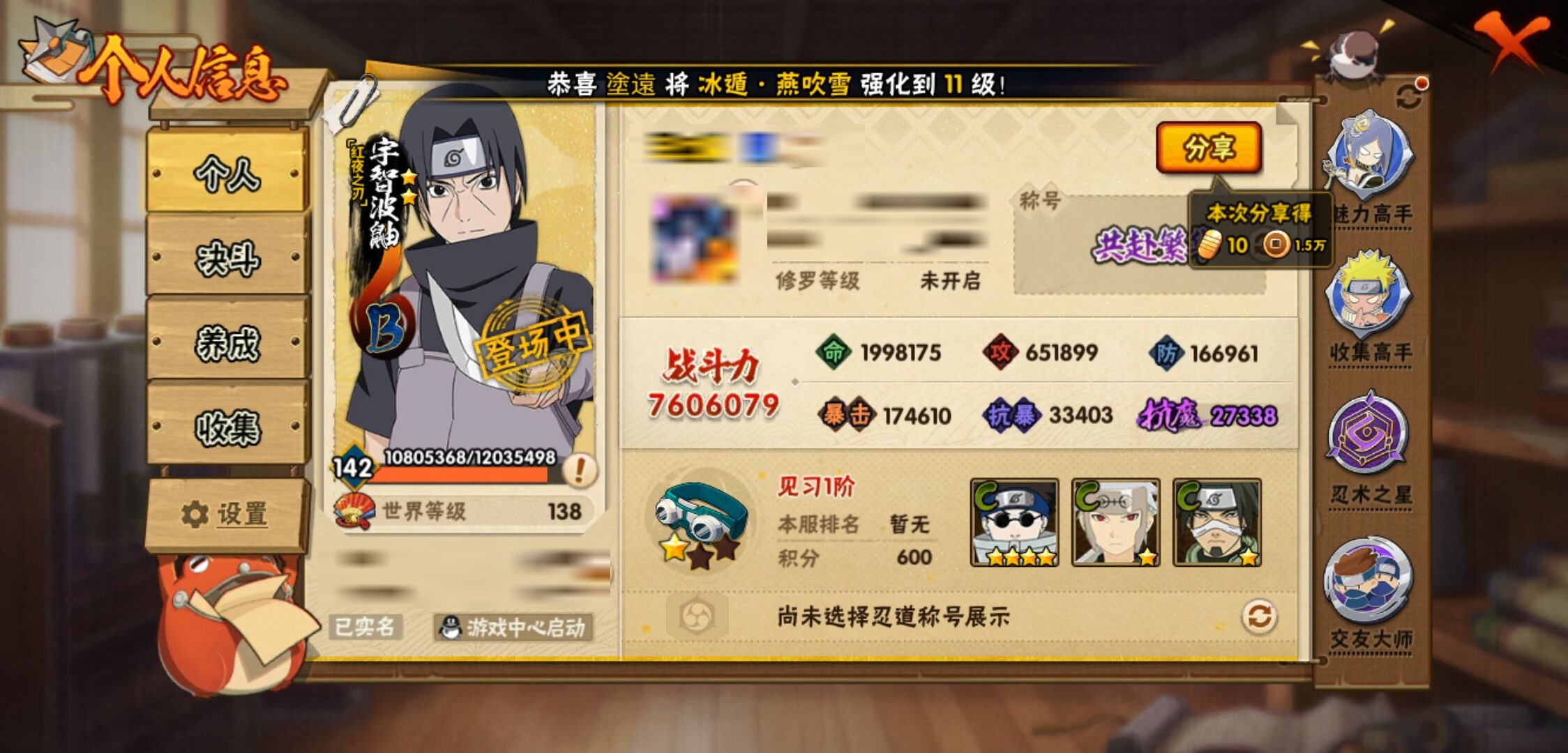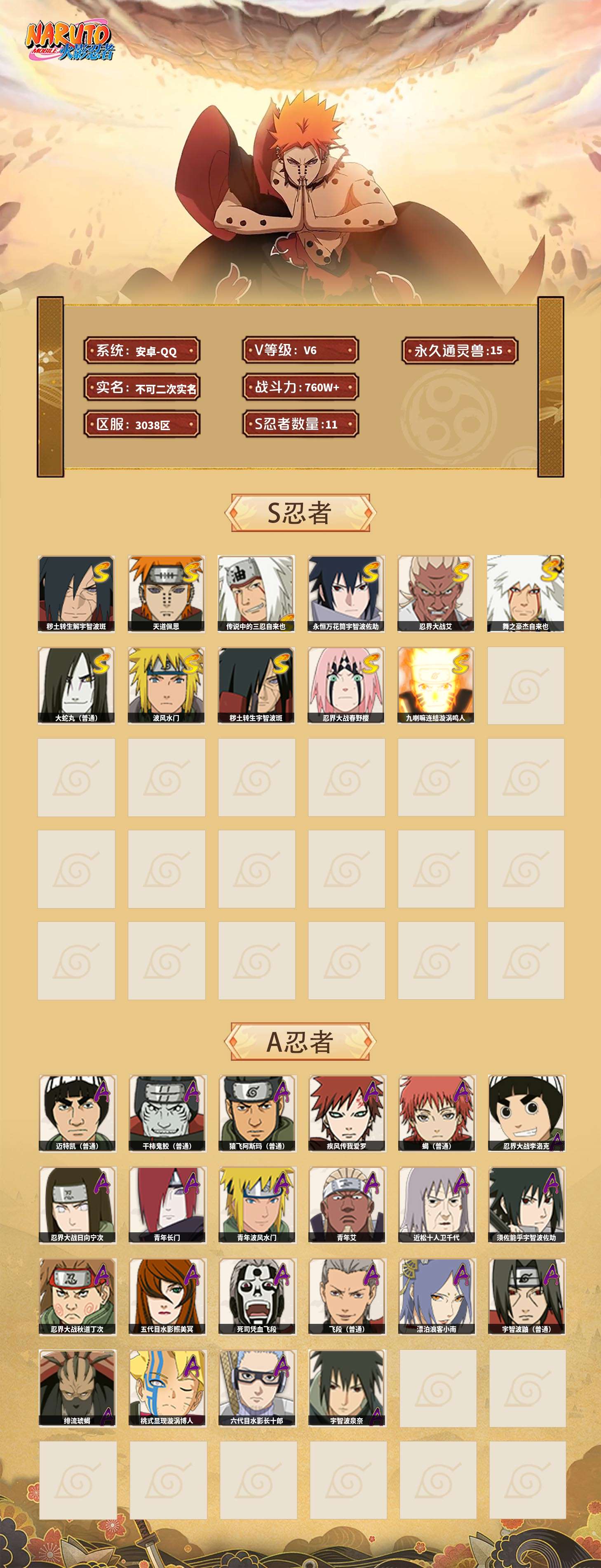 【火影忍者】【lyhy10902】战斗力:760w;段位:见习1阶;本服排名:677;vip:v6级;s忍:11个;a忍:22个;通灵兽:15个,s忍:秽土转生解宇智波斑|天道佩恩|传说中的三忍自来也|永恒万花筒宇智波佐助|忍界大战艾|舞之豪杰自来也|大蛇丸(普通)|波风水门|秽土转生宇智波斑|忍界大战春野樱|九喇嘛连结漩涡鸣人__a忍:忍界大战李洛克|忍界大战日向宁次|青年长门|青年波风水门|青年艾|近松十人卫千代|须佐能乎宇智波佐助|忍界大战秋道丁次|五代目水影照美冥|死司凭血飞段|疾风传我爱罗 4星|飞段(普通)|漂泊浪客小南|迈特凯(普通) 5星|宇智波鼬(普通)|干柿鬼鲛(普通) 5星|蝎(普通) 3星|绯流琥蝎|猿飞阿斯玛(普通) 5星|桃式显现漩涡博人|六代目水影长十郎|宇智波泉奈__通灵兽:忍犬(普通)|蓝蛇|蛤蟆吉|忍龟|砂之守鹤|镰鼬|猿魔|山椒鱼|蜃|蛤蟆仙人|鲛鲨|蛤蟆健|乌鸦(普通)|蛤蟆龙|蛤蟆广
