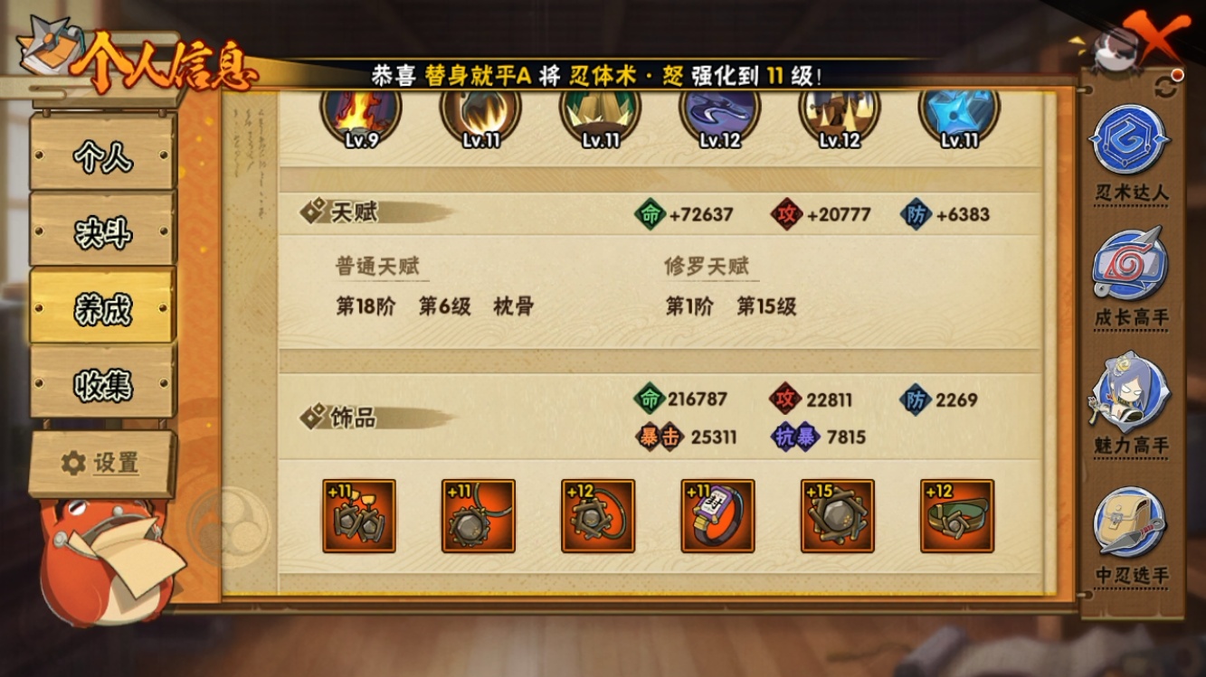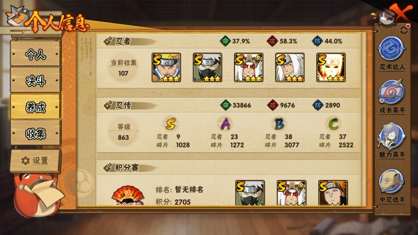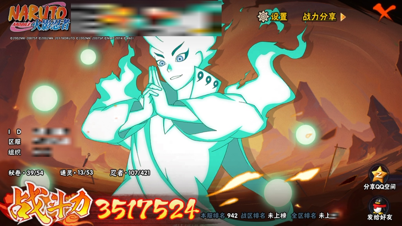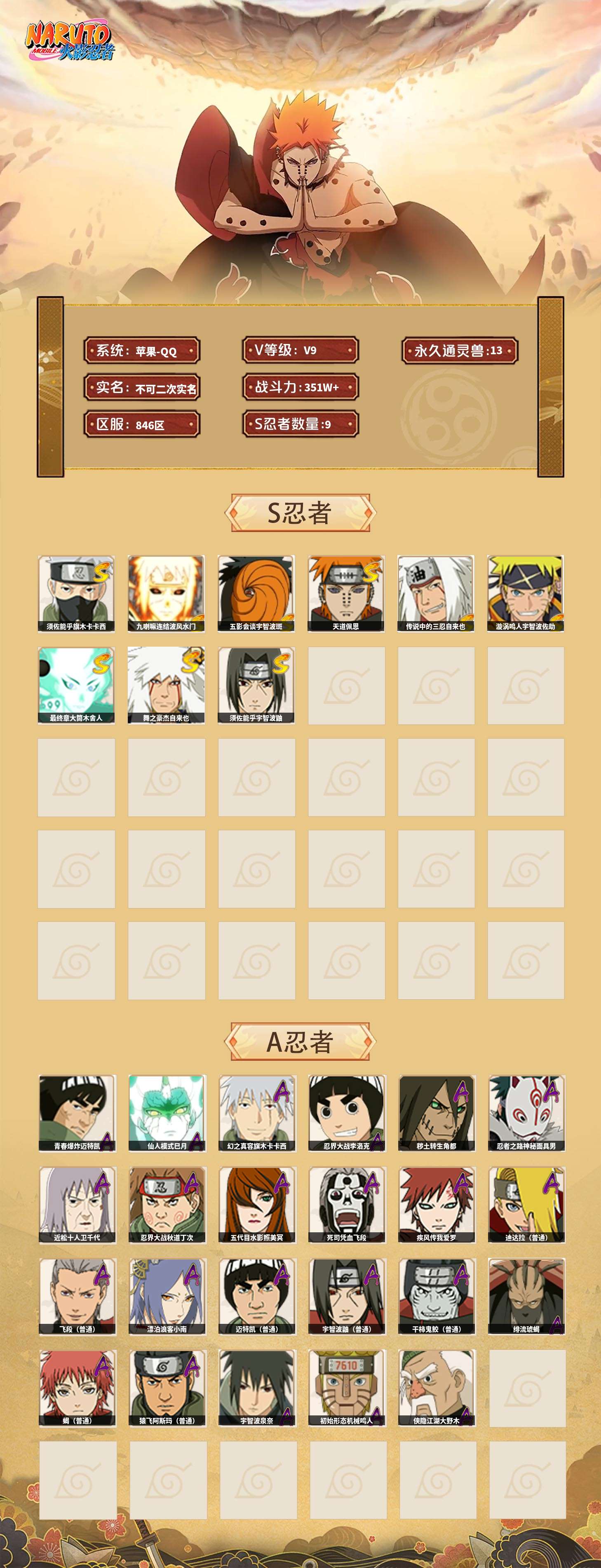 【火影忍者】【lyhy10935】战斗力:351w;段位:暗部1阶;本服排名:942;vip:v9级;s忍:9个;a忍:23个;通灵兽:13个,s忍:须佐能乎旗木卡卡西|九喇嘛连结波风水门|五影会谈宇智波斑|天道佩恩|传说中的三忍自来也|漩涡鸣人宇智波佐助|最终章大筒木舍人|舞之豪杰自来也|须佐能乎宇智波鼬__a忍:青春爆炸迈特凯|仙人模式巳月|幻之真容旗木卡卡西|忍界大战李洛克|秽土转生角都|忍者之路神秘面具男|近松十人卫千代|忍界大战秋道丁次|五代目水影照美冥|死司凭血飞段|疾风传我爱罗|迪达拉(普通)|飞段(普通)|漂泊浪客小南|迈特凯(普通)|宇智波鼬(普通)|干柿鬼鲛(普通)|绯流琥蝎|蝎(普通)|猿飞阿斯玛(普通)|宇智波泉奈|初始形态机械鸣人|侠隐江湖大野木__通灵兽:忍犬(普通)|蓝蛇|砂之守鹤|蛤蟆吉|忍龟|镰鼬|猿魔|山椒鱼|蜃|蛤蟆仙人|鲛鲨|蛞蝓(普通)|蛤蟆健