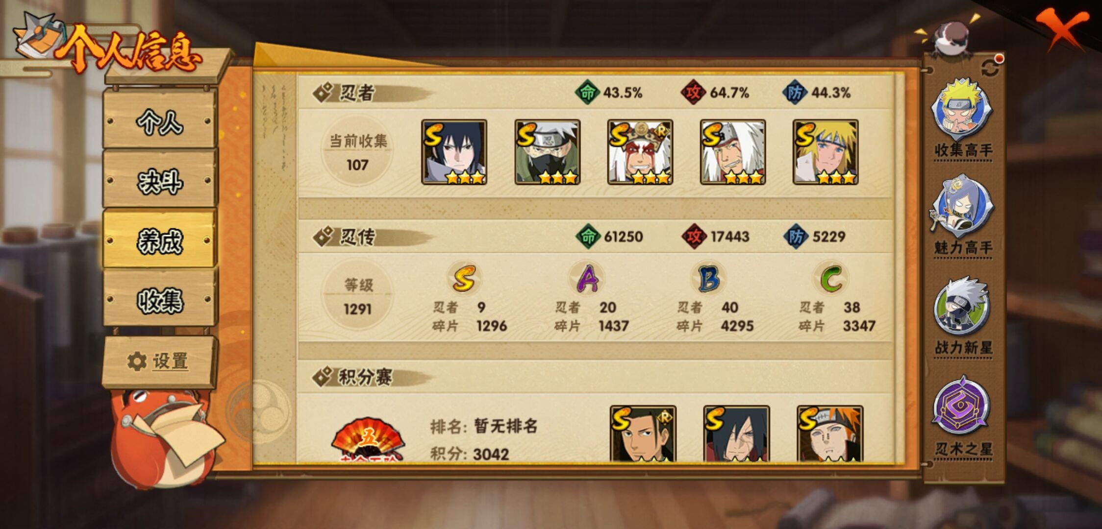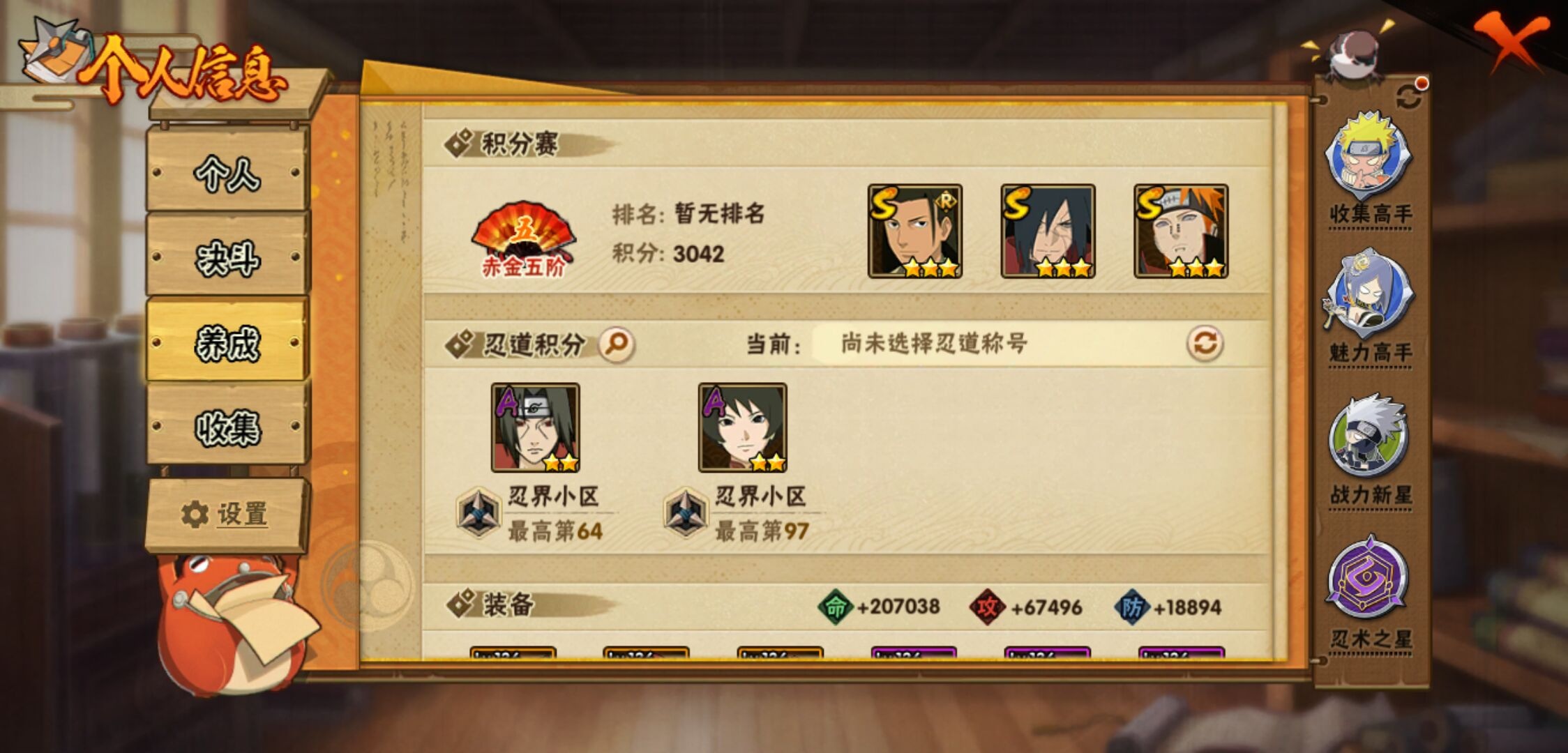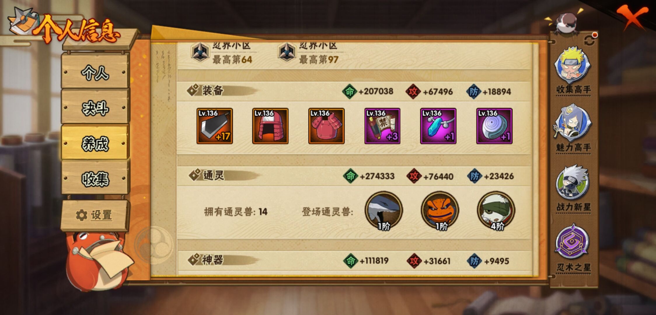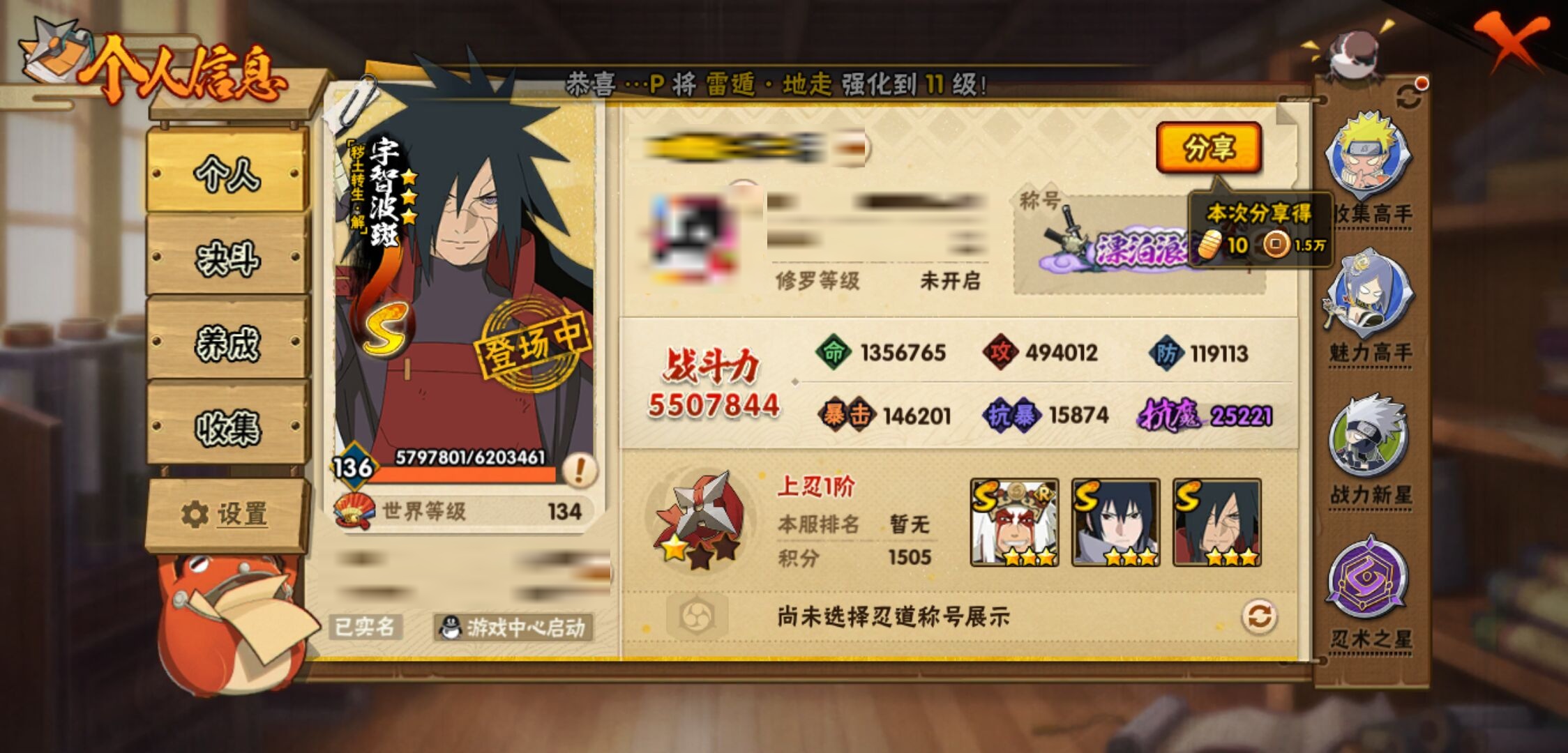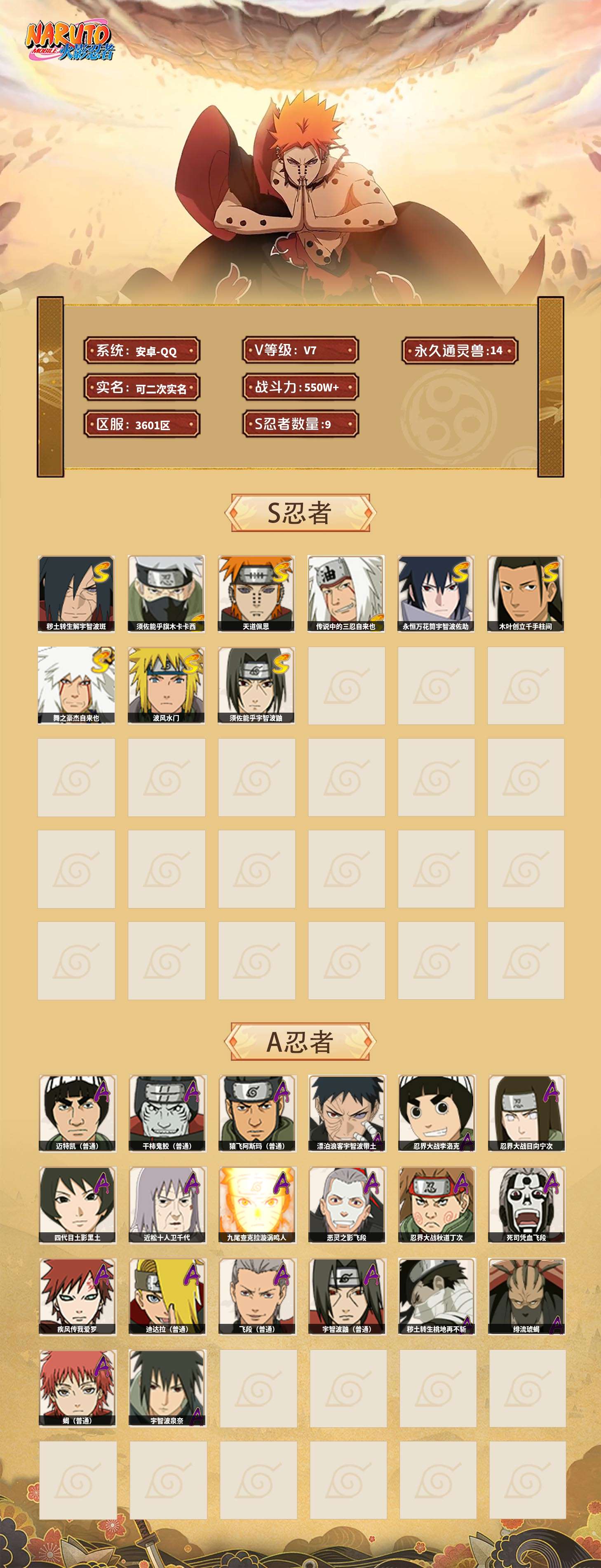 【火影忍者】【lyhy10972】战斗力:550w;段位:上忍1阶;本服排名:1559;vip:v7级;s忍:9个;a忍:20个;通灵兽:14个,s忍:秽土转生解宇智波斑|须佐能乎旗木卡卡西|天道佩恩|传说中的三忍自来也|永恒万花筒宇智波佐助|木叶创立千手柱间|舞之豪杰自来也|波风水门|须佐能乎宇智波鼬__a忍:漂泊浪客宇智波带土|忍界大战李洛克|忍界大战日向宁次|四代目土影黑土|近松十人卫千代|九尾查克拉漩涡鸣人|恶灵之影飞段|忍界大战秋道丁次|死司凭血飞段|疾风传我爱罗|迪达拉(普通)|飞段(普通)|迈特凯(普通) 4星|宇智波鼬(普通)|干柿鬼鲛(普通) 3星|秽土转生桃地再不斩|绯流琥蝎|蝎(普通)|猿飞阿斯玛(普通) 3星|宇智波泉奈__通灵兽:忍犬(普通)|蓝蛇|蛤蟆吉|忍龟|镰鼬|猿魔|山椒鱼|蜃|蛤蟆仙人|鲛鲨|蛤蟆健|乌鸦(普通)|砂之守鹤|蛤蟆龙