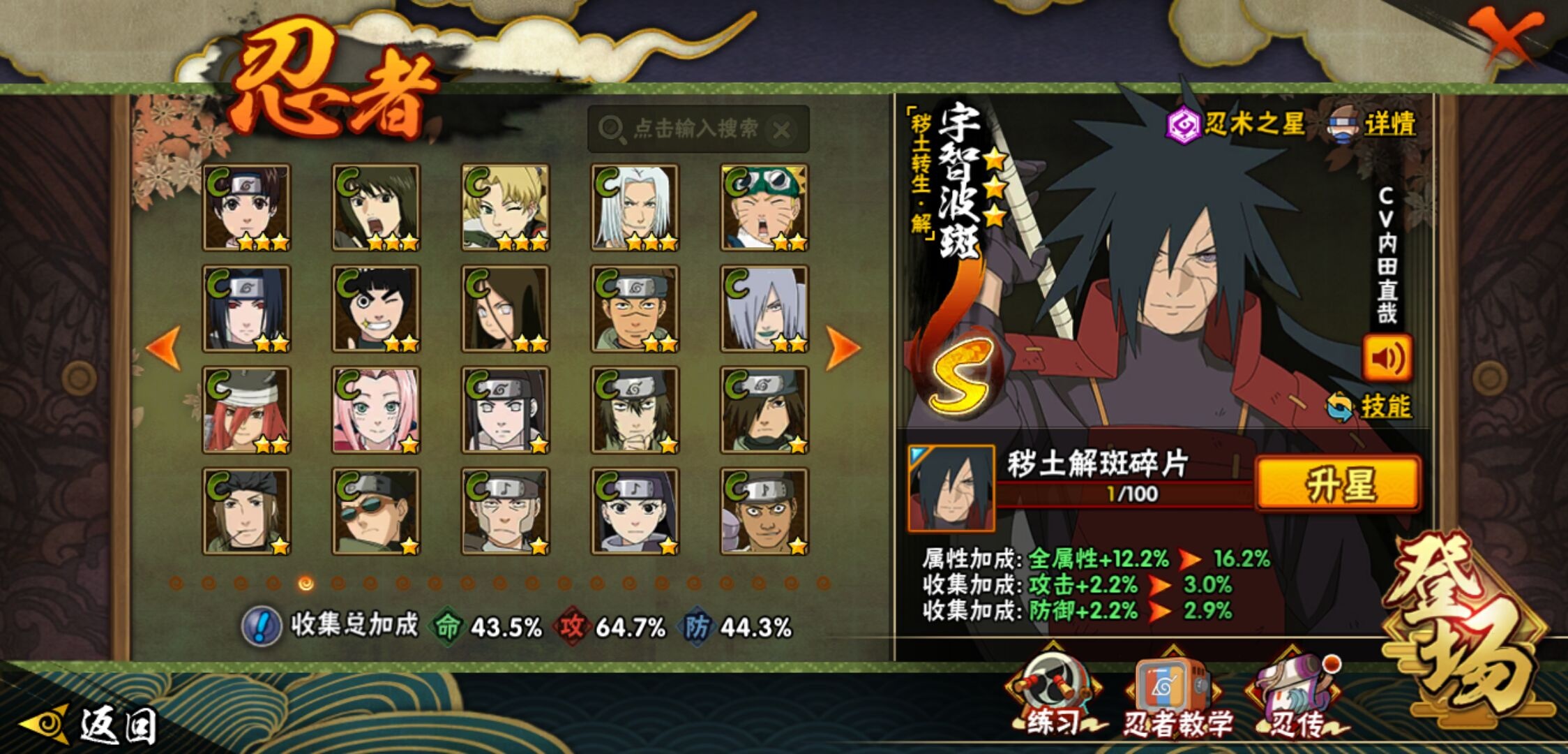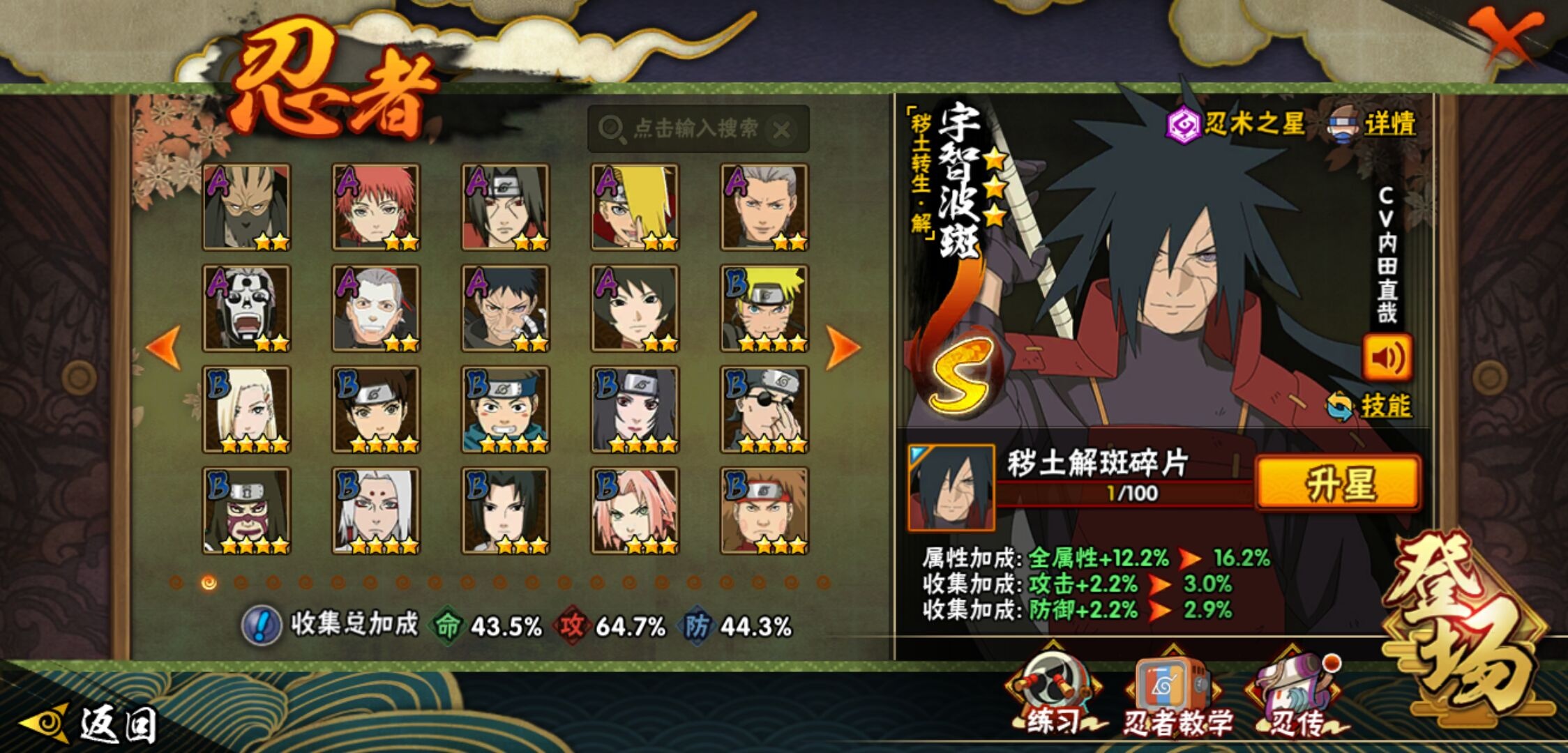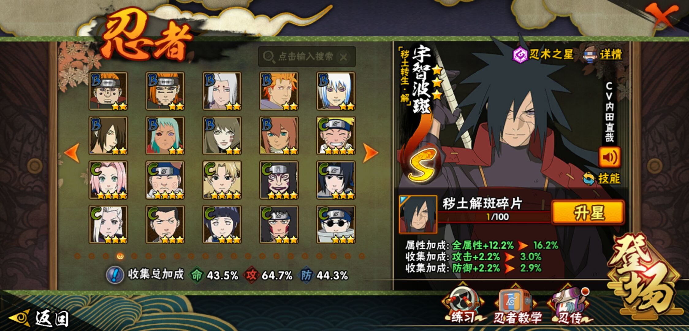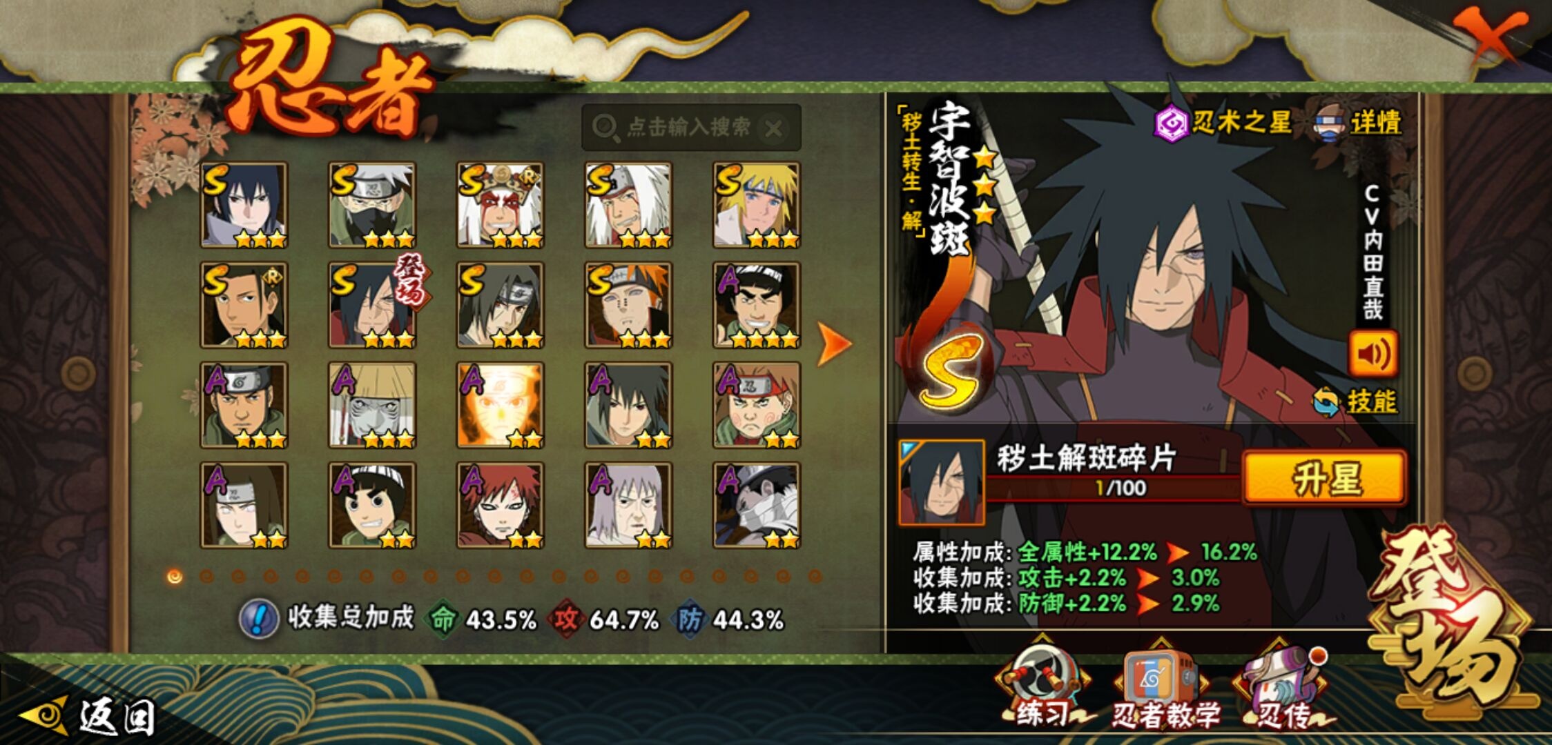【火影忍者】【lyhy10972】战斗力:550w;段位:上忍1阶;本服排名:1559;vip:v7级;s忍:9个;a忍:20个;通灵兽:14个,s忍:秽土转生解宇智波斑|须佐能乎旗木卡卡西|天道佩恩|传说中的三忍自来也|永恒万花筒宇智波佐助|木叶创立千手柱间|舞之豪杰自来也|波风水门|须佐能乎宇智波鼬__a忍:漂泊浪客宇智波带土|忍界大战李洛克|忍界大战日向宁次|四代目土影黑土|近松十人卫千代|九尾查克拉漩涡鸣人|恶灵之影飞段|忍界大战秋道丁次|死司凭血飞段|疾风传我爱罗|迪达拉(普通)|飞段(普通)|迈特凯(普通) 4星|宇智波鼬(普通)|干柿鬼鲛(普通) 3星|秽土转生桃地再不斩|绯流琥蝎|蝎(普通)|猿飞阿斯玛(普通) 3星|宇智波泉奈__通灵兽:忍犬(普通)|蓝蛇|蛤蟆吉|忍龟|镰鼬|猿魔|山椒鱼|蜃|蛤蟆仙人|鲛鲨|蛤蟆健|乌鸦(普通)|砂之守鹤|蛤蟆龙