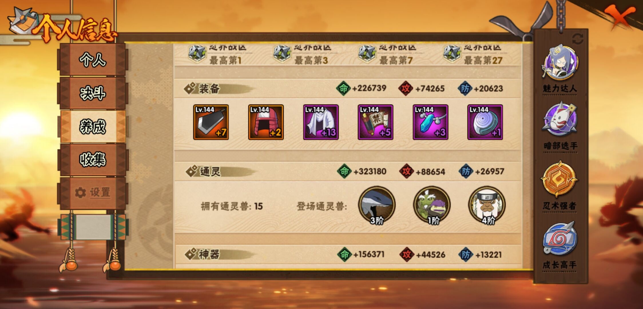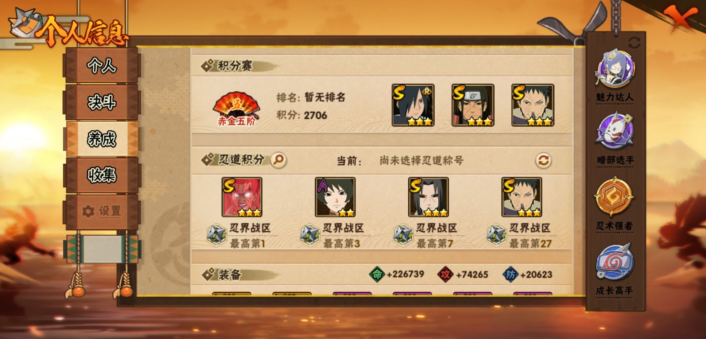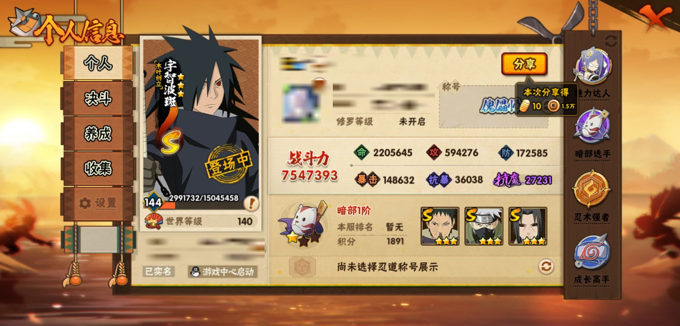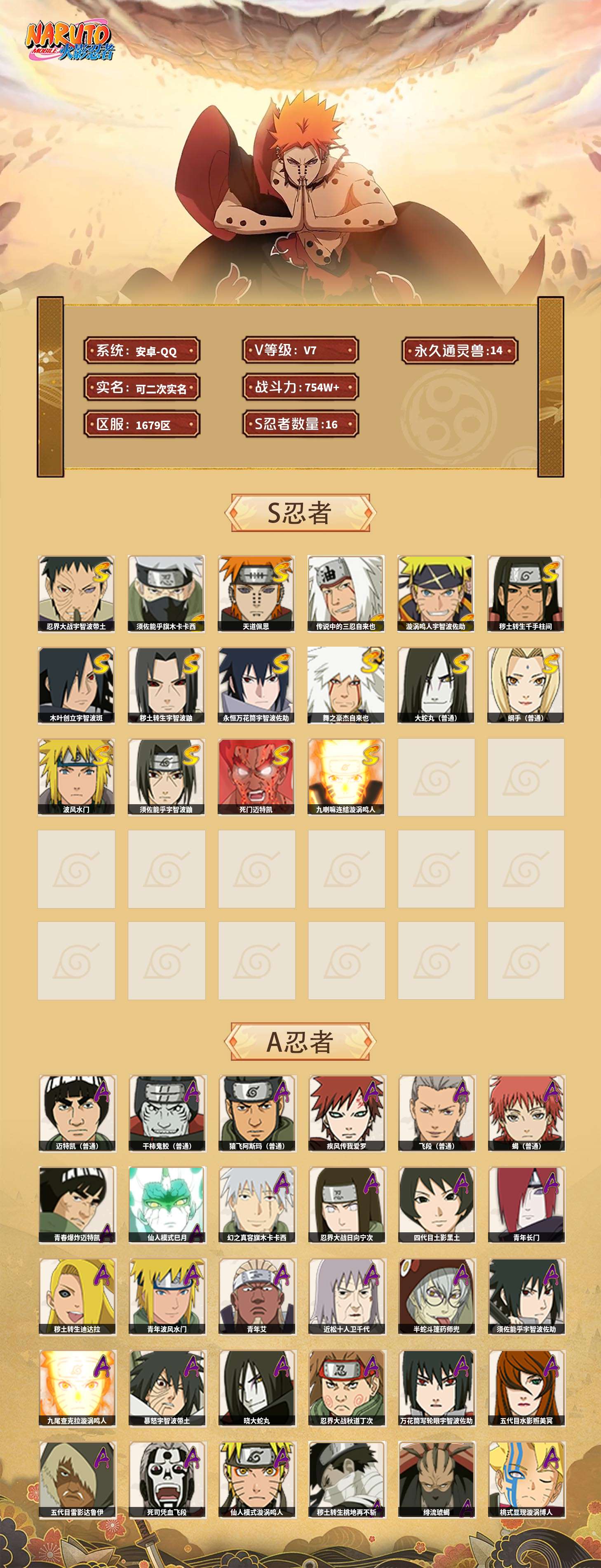 【火影忍者】【lyhy10973】s忍:忍界大战宇智波带土|须佐能乎旗木卡卡西|天道佩恩|传说中的三忍自来也|漩涡鸣人宇智波佐助|秽土转生千手柱间|木叶创立宇智波斑|秽土转生宇智波鼬|永恒万花筒宇智波佐助|舞之豪杰自来也|大蛇丸(普通)|纲手(普通)|波风水门|须佐能乎宇智波鼬|死门迈特凯|九喇嘛连结漩涡鸣人__a忍:青春爆炸迈特凯|仙人模式巳月|幻之真容旗木卡卡西|忍界大战日向宁次|四代目土影黑土|青年长门|秽土转生迪达拉|青年波风水门|青年艾|近松十人卫千代|半蛇斗篷药师兜|须佐能乎宇智波佐助|九尾查克拉漩涡鸣人|暴怒宇智波带土|晓大蛇丸|忍界大战秋道丁次|万花筒写轮眼宇智波佐助|五代目水影照美冥|五代目雷影达鲁伊|死司凭血飞段|疾风传我爱罗 3星|飞段(普通) 3星|仙人模式漩涡鸣人|迈特凯(普通) 5星|干柿鬼鲛(普通) 5星|秽土转生桃地再不斩|蝎(普通) 3星|绯流琥蝎|猿飞阿斯玛(普通) 5星|桃式显现漩涡博人|最终章日向雏田|六代目水影长十郎|不缘|宇智波泉奈|初始形态机械鸣人|侠隐江湖大野木__通灵兽:忍犬(普通)|蓝蛇|蛤蟆吉|忍龟|镰鼬|猿魔|山椒鱼|蜃|砂之守鹤|蛤蟆仙人|鲛鲨|蛤蟆健|乌鸦(普通)|蛤蟆龙1,战斗力:754w;vip:v7级