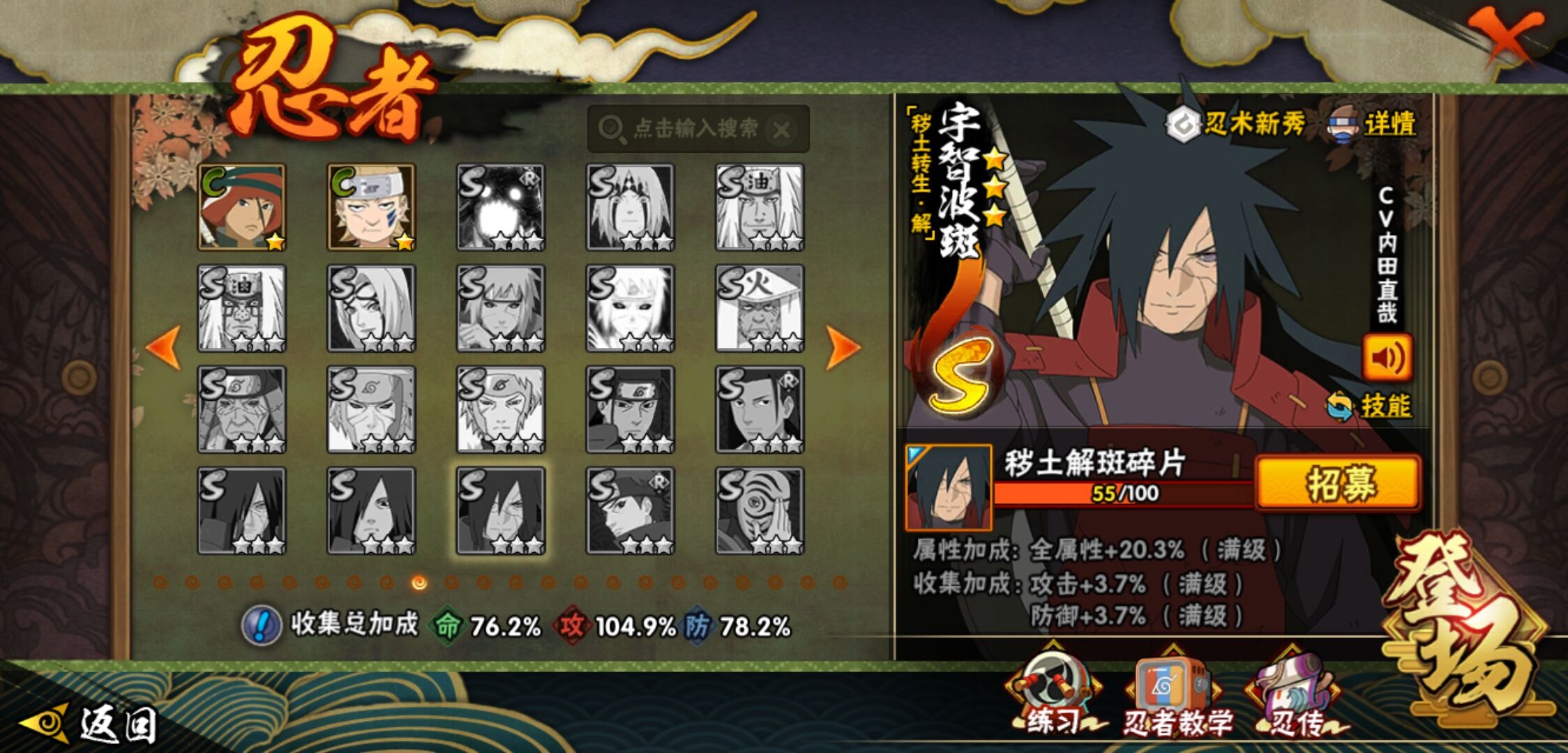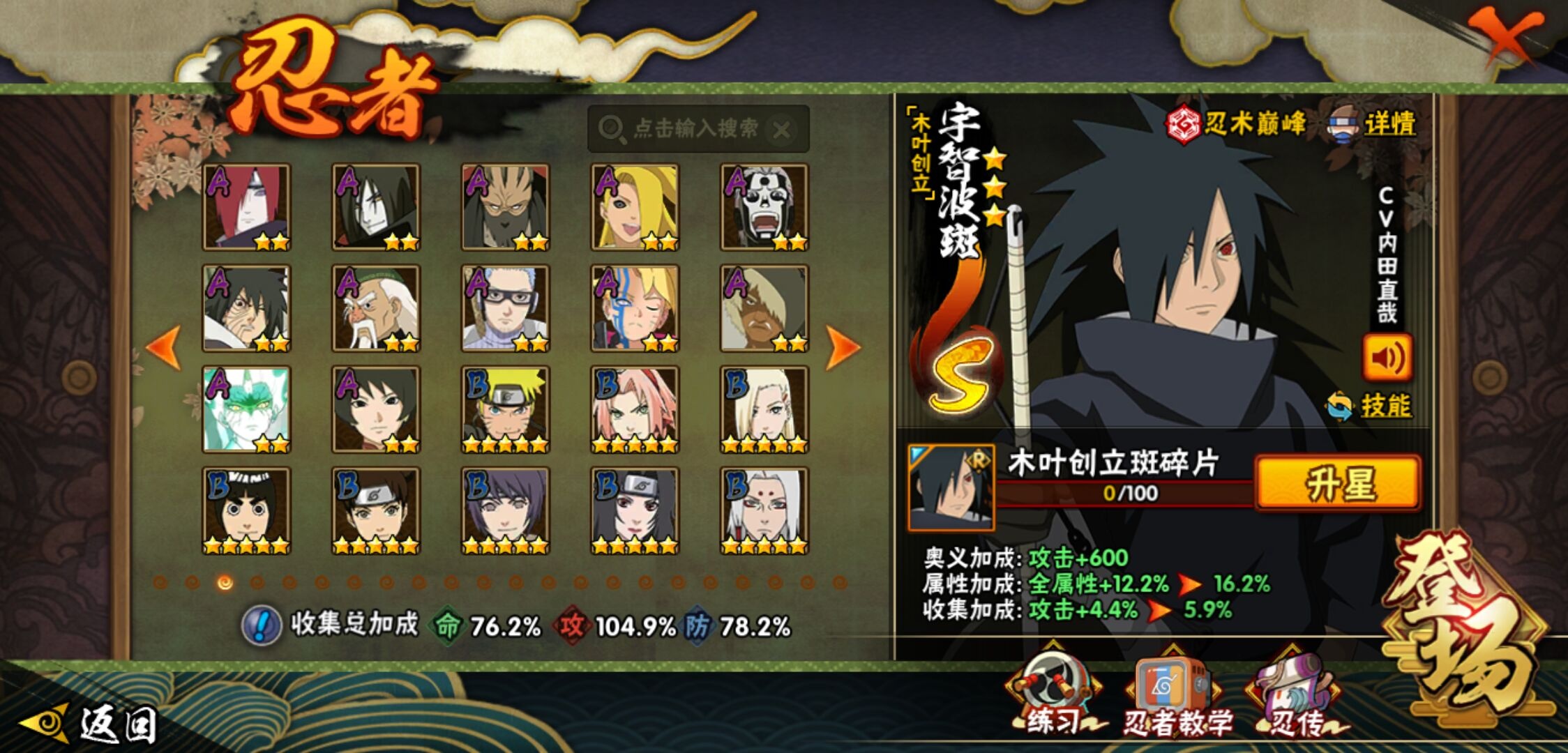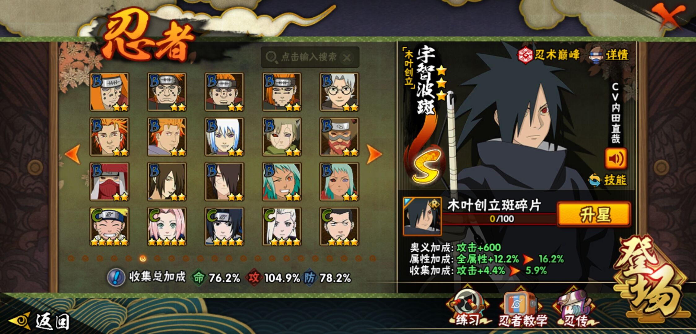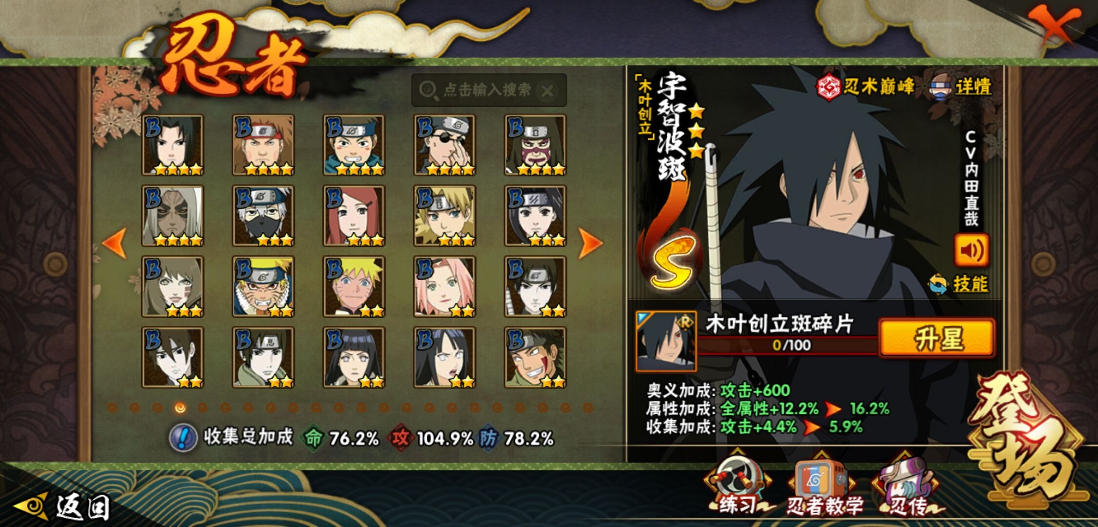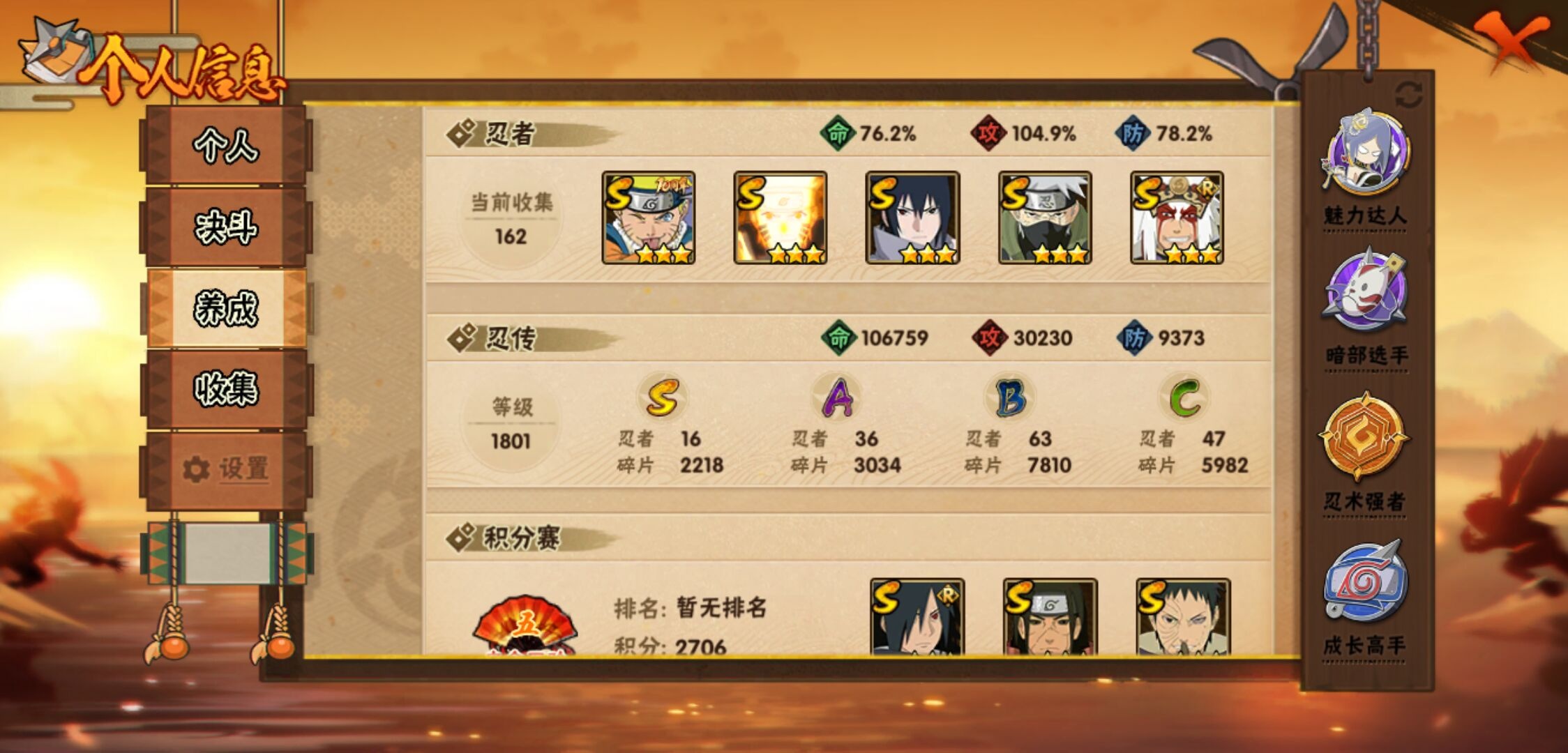【火影忍者】【lyhy10973】s忍:忍界大战宇智波带土|须佐能乎旗木卡卡西|天道佩恩|传说中的三忍自来也|漩涡鸣人宇智波佐助|秽土转生千手柱间|木叶创立宇智波斑|秽土转生宇智波鼬|永恒万花筒宇智波佐助|舞之豪杰自来也|大蛇丸(普通)|纲手(普通)|波风水门|须佐能乎宇智波鼬|死门迈特凯|九喇嘛连结漩涡鸣人__a忍:青春爆炸迈特凯|仙人模式巳月|幻之真容旗木卡卡西|忍界大战日向宁次|四代目土影黑土|青年长门|秽土转生迪达拉|青年波风水门|青年艾|近松十人卫千代|半蛇斗篷药师兜|须佐能乎宇智波佐助|九尾查克拉漩涡鸣人|暴怒宇智波带土|晓大蛇丸|忍界大战秋道丁次|万花筒写轮眼宇智波佐助|五代目水影照美冥|五代目雷影达鲁伊|死司凭血飞段|疾风传我爱罗 3星|飞段(普通) 3星|仙人模式漩涡鸣人|迈特凯(普通) 5星|干柿鬼鲛(普通) 5星|秽土转生桃地再不斩|蝎(普通) 3星|绯流琥蝎|猿飞阿斯玛(普通) 5星|桃式显现漩涡博人|最终章日向雏田|六代目水影长十郎|不缘|宇智波泉奈|初始形态机械鸣人|侠隐江湖大野木__通灵兽:忍犬(普通)|蓝蛇|蛤蟆吉|忍龟|镰鼬|猿魔|山椒鱼|蜃|砂之守鹤|蛤蟆仙人|鲛鲨|蛤蟆健|乌鸦(普通)|蛤蟆龙1,战斗力:754w;vip:v7级