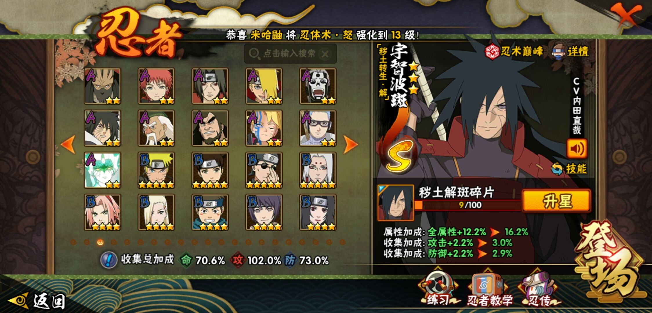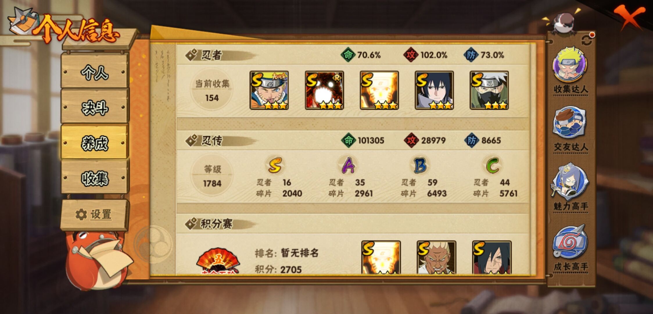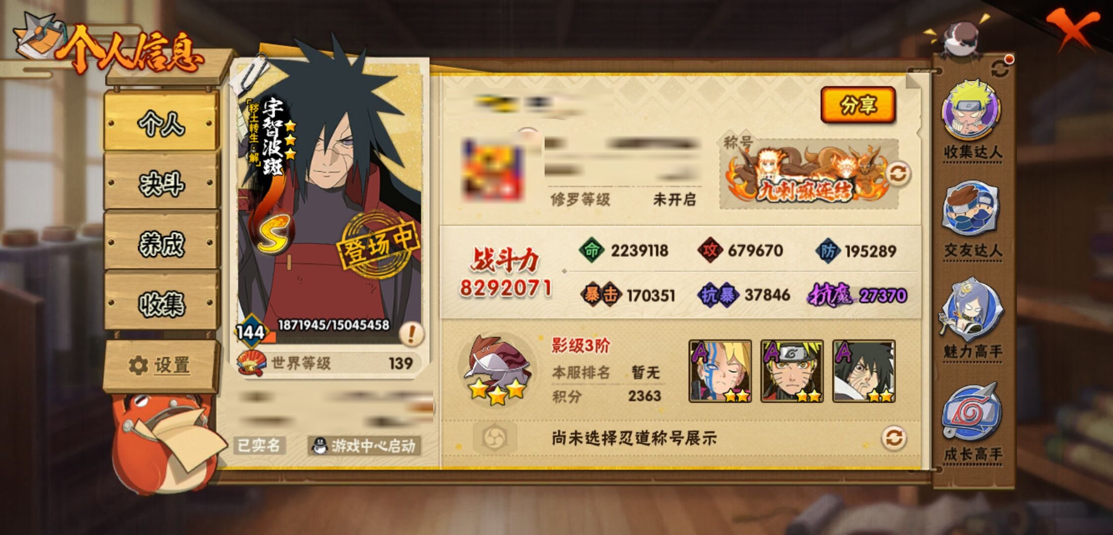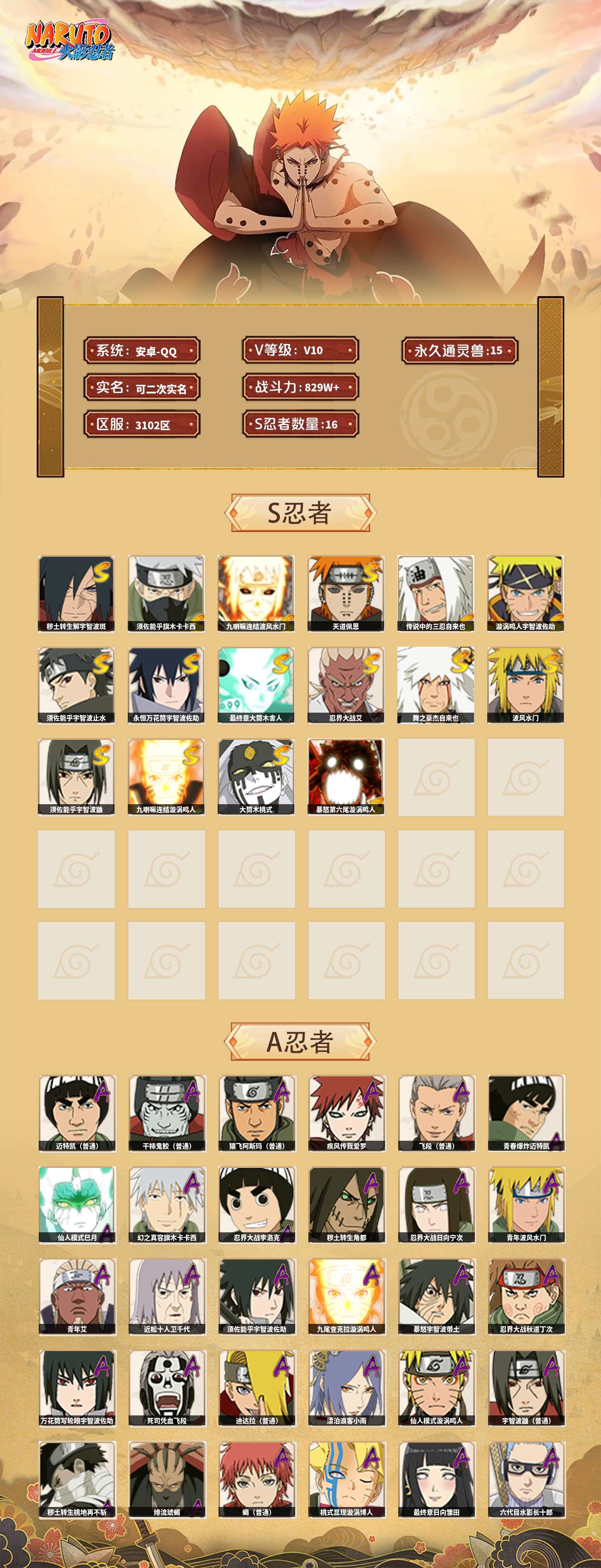 【火影忍者】【lyhy10990】战斗力:829w;段位:影级3阶;本服排名:920;vip:v10级;s忍:16个;a忍:35个;通灵兽:15个,s忍:秽土转生解宇智波斑|须佐能乎旗木卡卡西|九喇嘛连结波风水门|天道佩恩|传说中的三忍自来也|漩涡鸣人宇智波佐助|须佐能乎宇智波止水|永恒万花筒宇智波佐助|最终章大筒木舍人|忍界大战艾|舞之豪杰自来也|波风水门|须佐能乎宇智波鼬|九喇嘛连结漩涡鸣人|大筒木桃式|暴怒第六尾漩涡鸣人__a忍:青春爆炸迈特凯|仙人模式巳月|幻之真容旗木卡卡西|忍界大战李洛克|秽土转生角都|忍界大战日向宁次|青年波风水门|青年艾|近松十人卫千代|须佐能乎宇智波佐助|九尾查克拉漩涡鸣人|暴怒宇智波带土|忍界大战秋道丁次|万花筒写轮眼宇智波佐助|死司凭血飞段|疾风传我爱罗 3星|迪达拉(普通)|飞段(普通) 3星|漂泊浪客小南|仙人模式漩涡鸣人|迈特凯(普通) 5星|宇智波鼬(普通)|干柿鬼鲛(普通) 5星|秽土转生桃地再不斩|绯流琥蝎|蝎(普通)|猿飞阿斯玛(普通) 5星|桃式显现漩涡博人|最终章日向雏田|六代目水影长十郎|宇智波泉奈|羁绊神农|忍界大战土台|初始形态机械鸣人|侠隐江湖大野木__通灵兽:忍犬(普通)|蓝蛇|砂之守鹤|蛤蟆吉|忍龟|镰鼬|猿魔|山椒鱼|熊猫|蜃|蛤蟆仙人|鲛鲨|蛤蟆健|乌鸦(普通)|蛤蟆龙