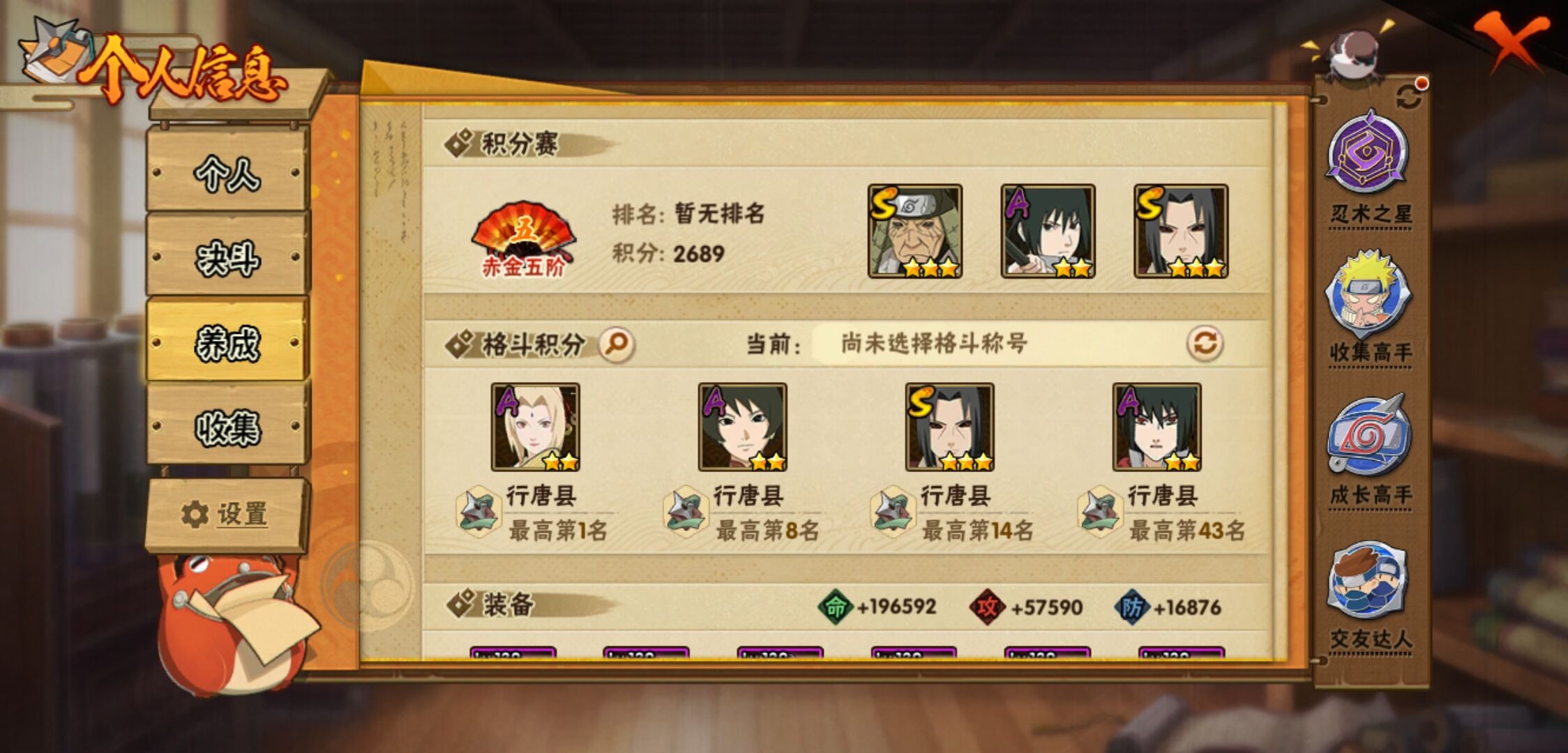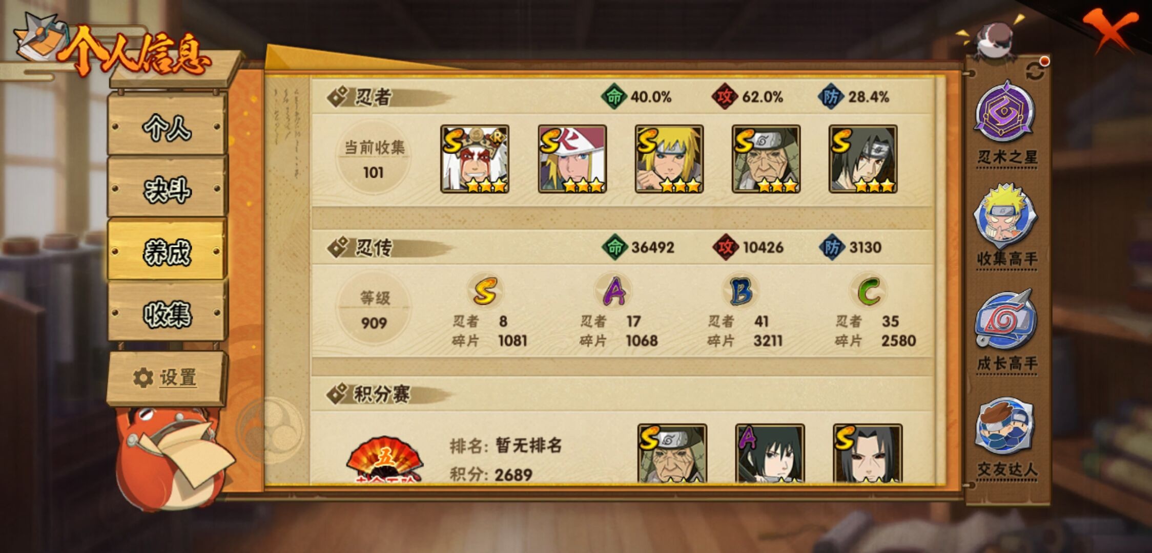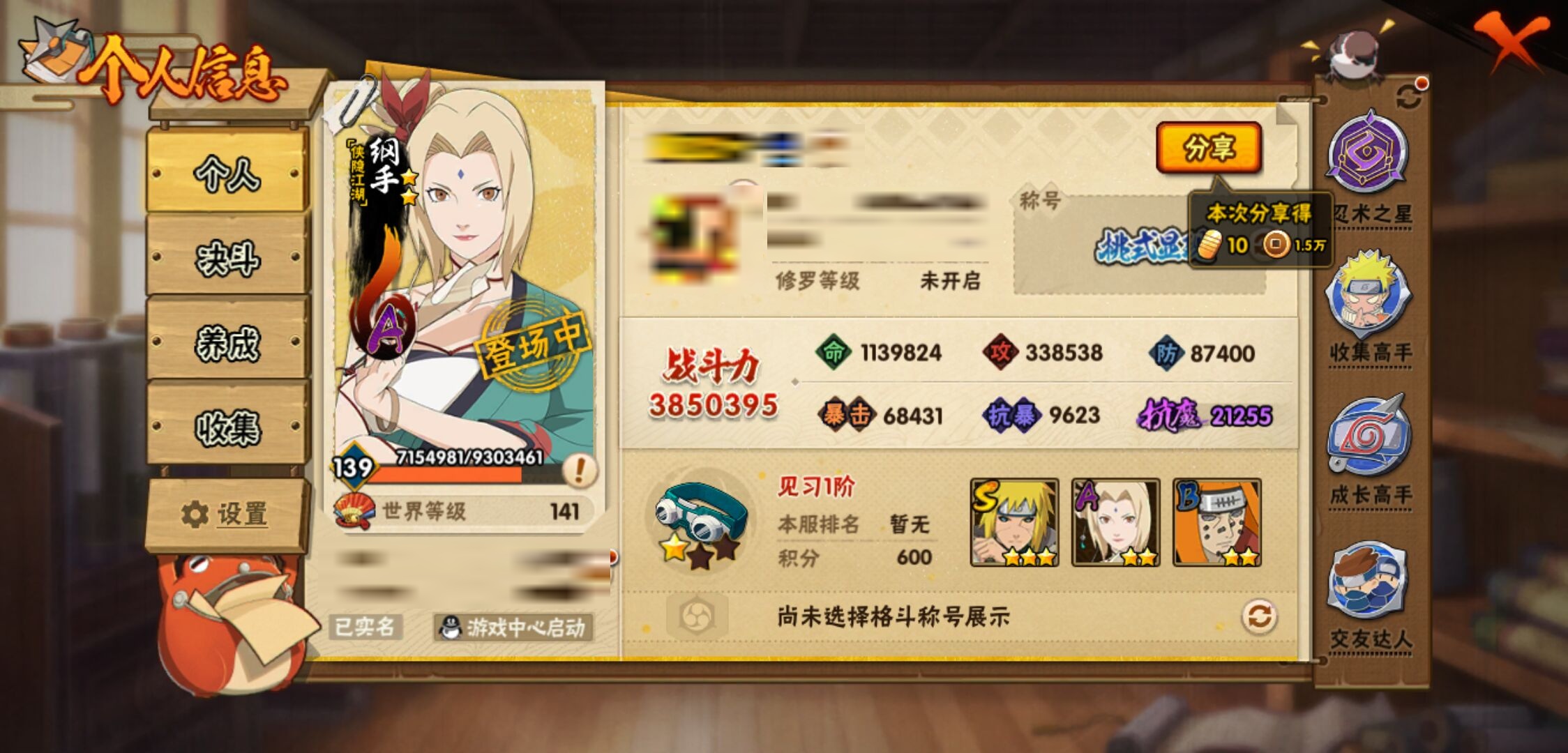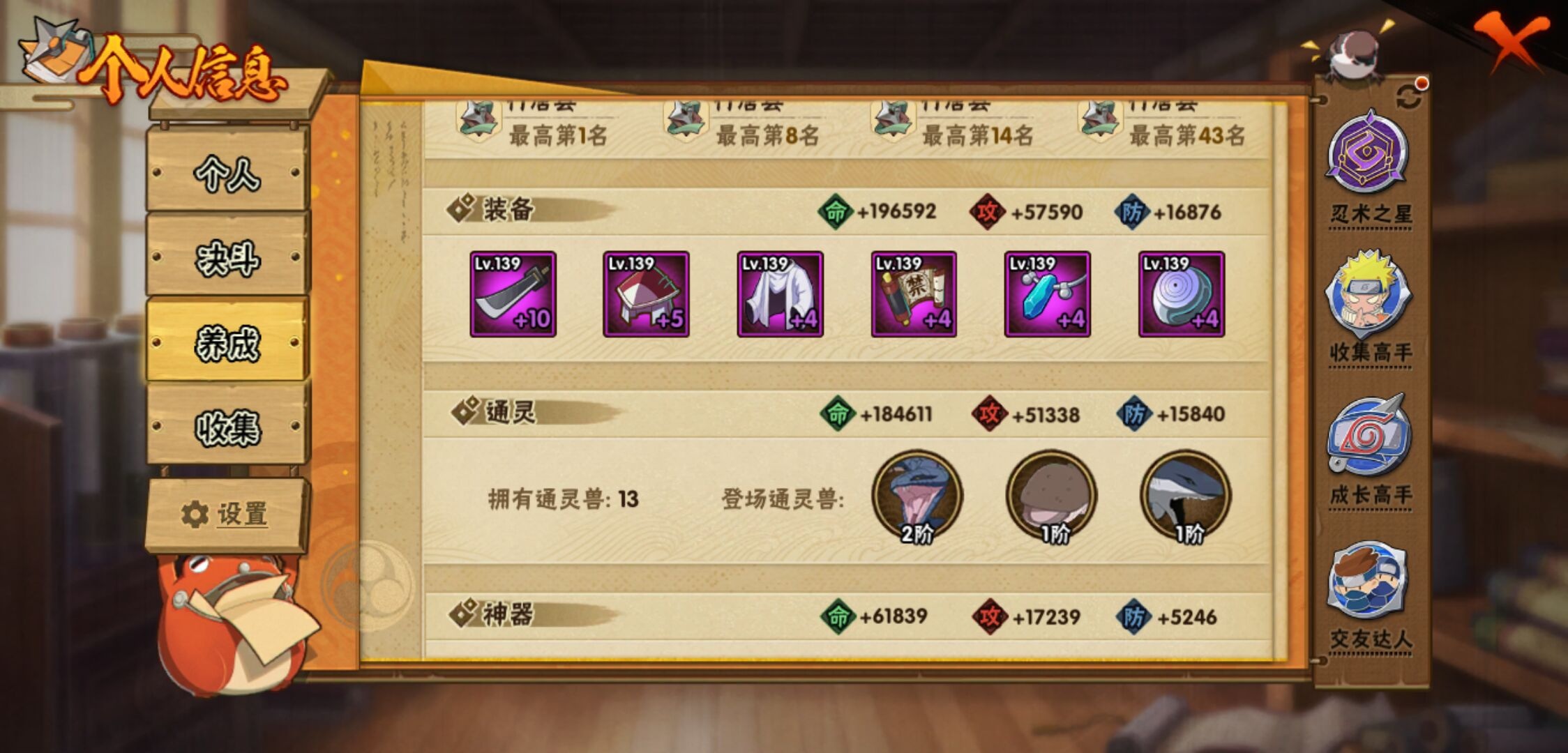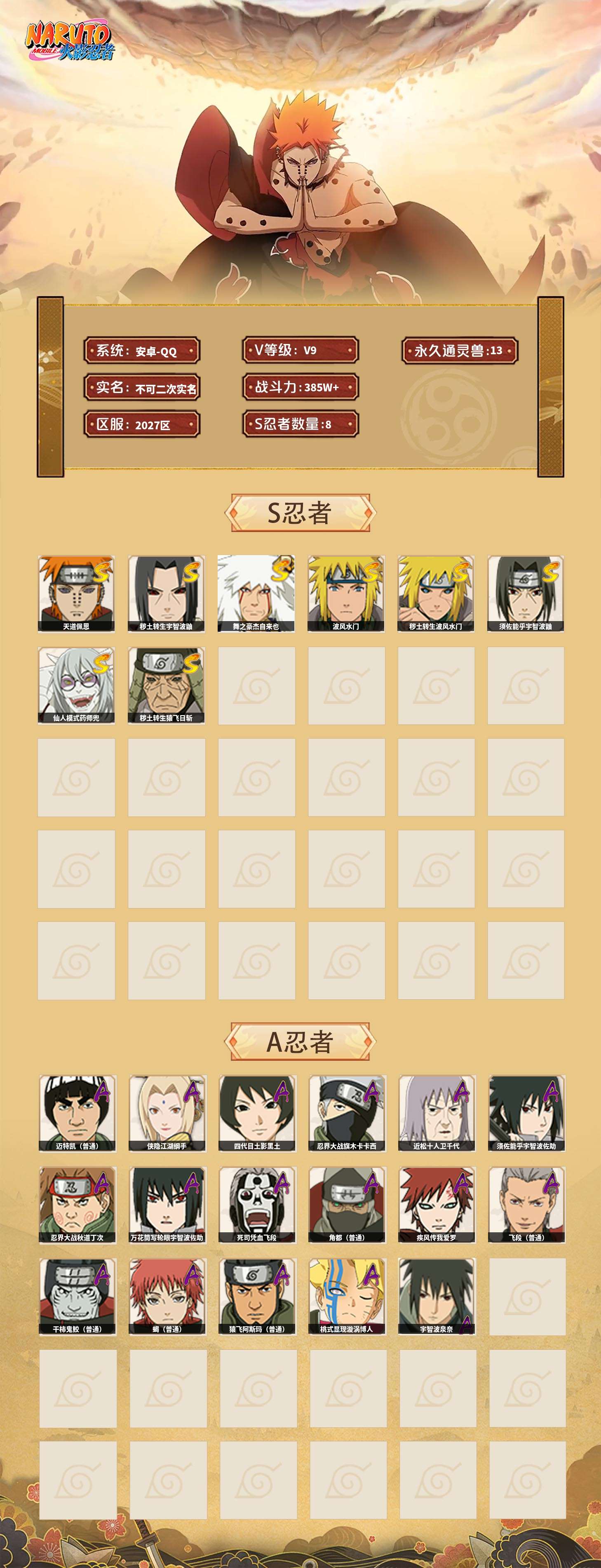 【火影忍者】【lyhy10979】战斗力:385w;段位:见习1阶;本服排名:1625;vip:v9级;s忍:8个;a忍:17个;通灵兽:13个,s忍:天道佩恩|秽土转生宇智波鼬|舞之豪杰自来也|波风水门|秽土转生波风水门|须佐能乎宇智波鼬|仙人模式药师兜|秽土转生猿飞日斩__a忍:侠隐江湖纲手|四代目土影黑土|忍界大战旗木卡卡西|近松十人卫千代|须佐能乎宇智波佐助|忍界大战秋道丁次|万花筒写轮眼宇智波佐助|死司凭血飞段|角都(普通)|疾风传我爱罗|飞段(普通)|迈特凯(普通) 3星|干柿鬼鲛(普通)|蝎(普通)|猿飞阿斯玛(普通)|桃式显现漩涡博人|宇智波泉奈__通灵兽:忍犬(普通)|蓝蛇|蛤蟆吉|砂之守鹤|忍龟|镰鼬|猿魔|山椒鱼|蜃|蛤蟆仙人|鲛鲨|蛤蟆健|乌鸦(普通)