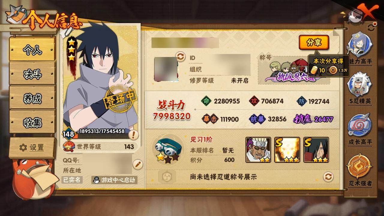 v6/战力799w/s忍12/a忍28 3星宇智波佐助「永恒万花筒」3星波风水门3星漩涡鸣人「九喇嘛连结」3星迈特凯「死门」3星千手扉间「秽土转生」3星宇智波鼬「秽土转生」3星宇智波斑「秽土转生」3星千手柱间「秽土转生」3星宇智波斑3星佩恩「天道」3星自来也「舞之豪杰」3星大蛇丸3星我爱罗「疾风传」2星蝎4星迈特凯3星猿飞阿斯玛4星干柿鬼鲛2星旗木卡卡西「万花筒写轮眼」2星角都「地怨虞」2星漩涡鸣人「仙人模式」3星飞段2星飞段「死司凭血」2星日向宁次「忍界大战」2星长十郎「六代目水影」2星宇智波鼬2星艾「青年」2星波风水门「青年」2星奇拉比2星宇智波佐助「万花筒写轮眼」2星迪达拉「秽土转生」2星漩涡鸣人「九尾查克拉」2星宇智波佐助「须佐能乎」2星奇拉比「忍界大战」2星照美冥「五代目水影」2星秋道丁次「忍界大战」2星千代「近松十人卫」2星我爱罗「忍界大战」2星宇智波泉奈