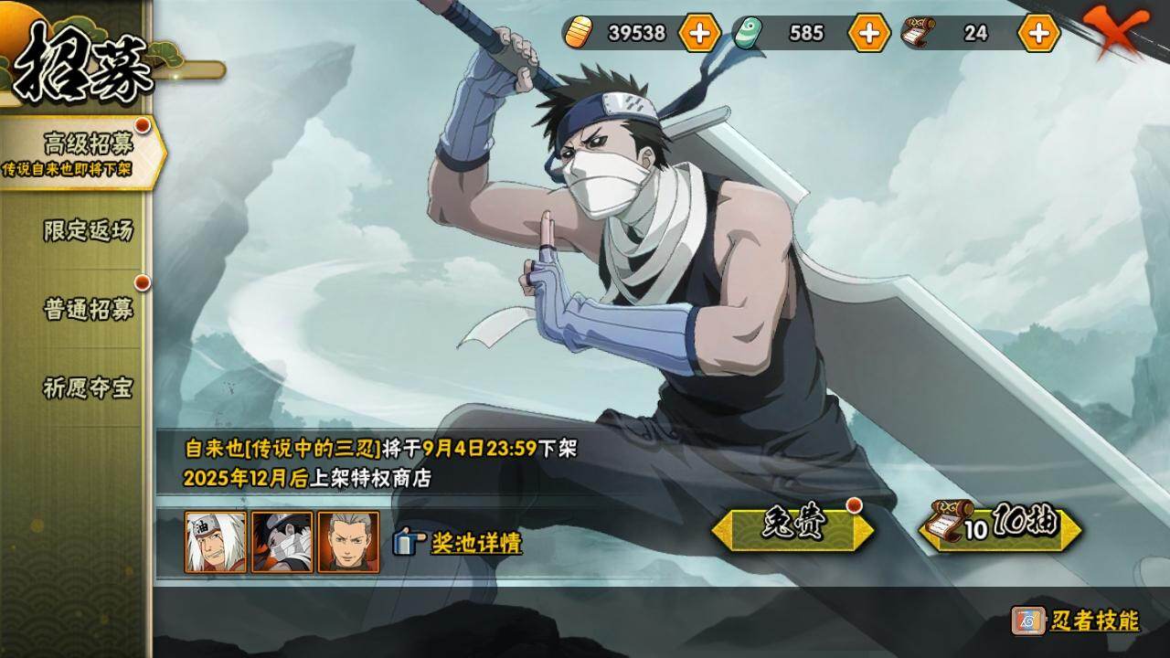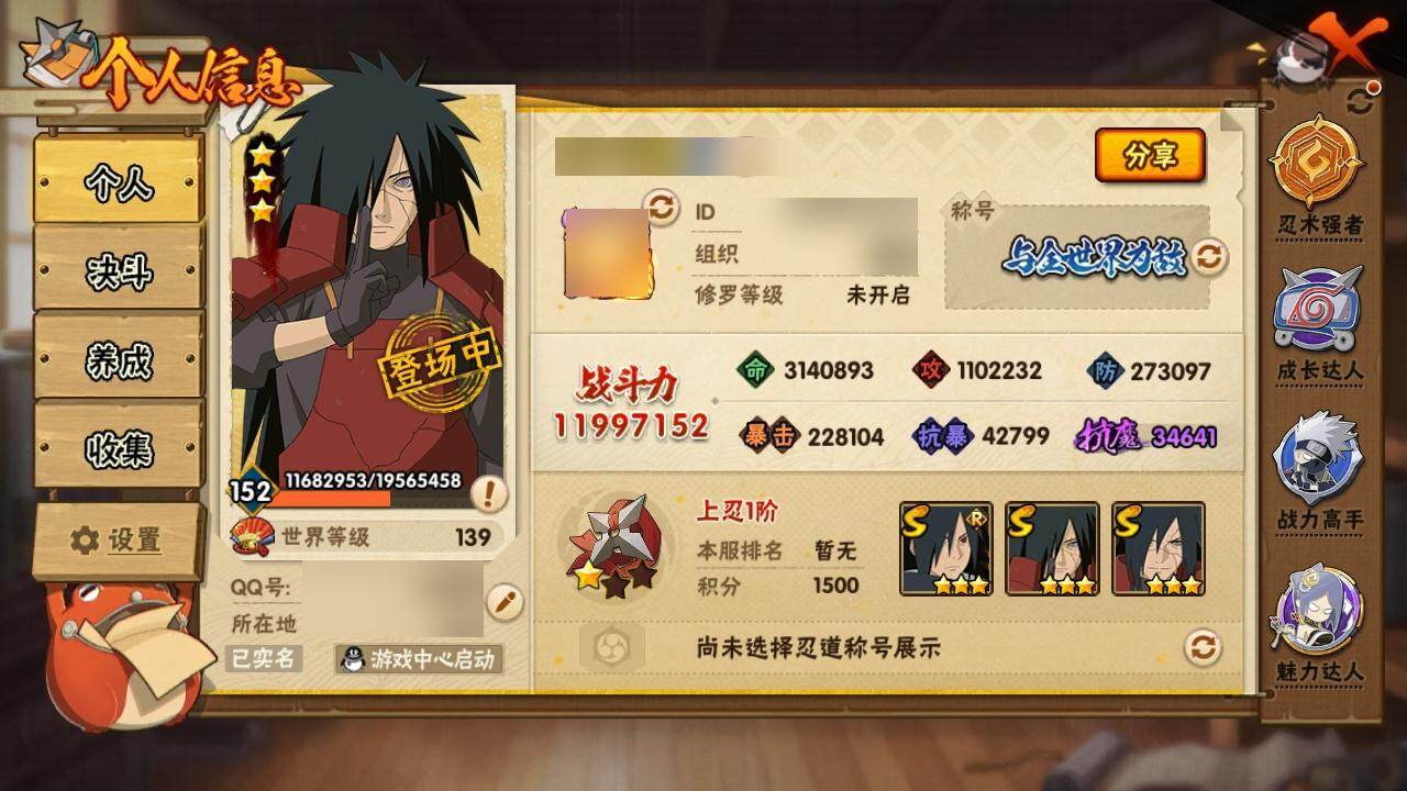 v10/战力1199w/s忍24/a忍33 3星大筒木桃式3星宇智波佐助「永恒万花筒」3星宇智波斑「秽土转生·解」3星宇智波带土「忍界大战」3星宇智波斑「白面具」3星波风水门3星漩涡鸣人「九喇嘛连结」3星迈特凯「死门」3星宇智波鼬「秽土转生」3星宇智波斑「秽土转生」3星宇智波鼬「须佐能乎」3星千手柱间「秽土转生」4星猿飞日斩3星药师兜「仙人模式」3星宇智波斑「木叶创立」3星佩恩「天道」3星自来也3星纲手3星春野樱「忍界大战」3星自来也「舞之豪杰」3星大蛇丸3星艾「忍界大战」3星宇智波止水「须佐能乎」3星自来也「传说中的三忍」4星我爱罗「疾风传」2星波风水门「新春限定」4星蝎5星迈特凯5星猿飞阿斯玛5星干柿鬼鲛2星漩涡鸣人「仙人模式」3星飞段3星飞段「死司凭血」2星日向宁次「忍界大战」2星长十郎「六代目水影」2星长门「青年」2星艾「青年」2星波风水门「青年」2星奇拉比2星宇智波带土「暴怒」2星迪达拉「秽土转生」2星漩涡鸣人「九尾查克拉」2星宇智波佐助「须佐能乎」2星飞段「恶灵之影」2星奇拉比「忍界大战」2星大蛇丸「晓」2星春野樱「百豪」2星秋道丁次「忍界大战」2星千代「近松十人卫」2星漩涡博人「桃式显现」2星旗木卡卡西「幻之真容」2星李洛克「忍界大战」2星宇智波泉奈2星蝎「绯流琥」