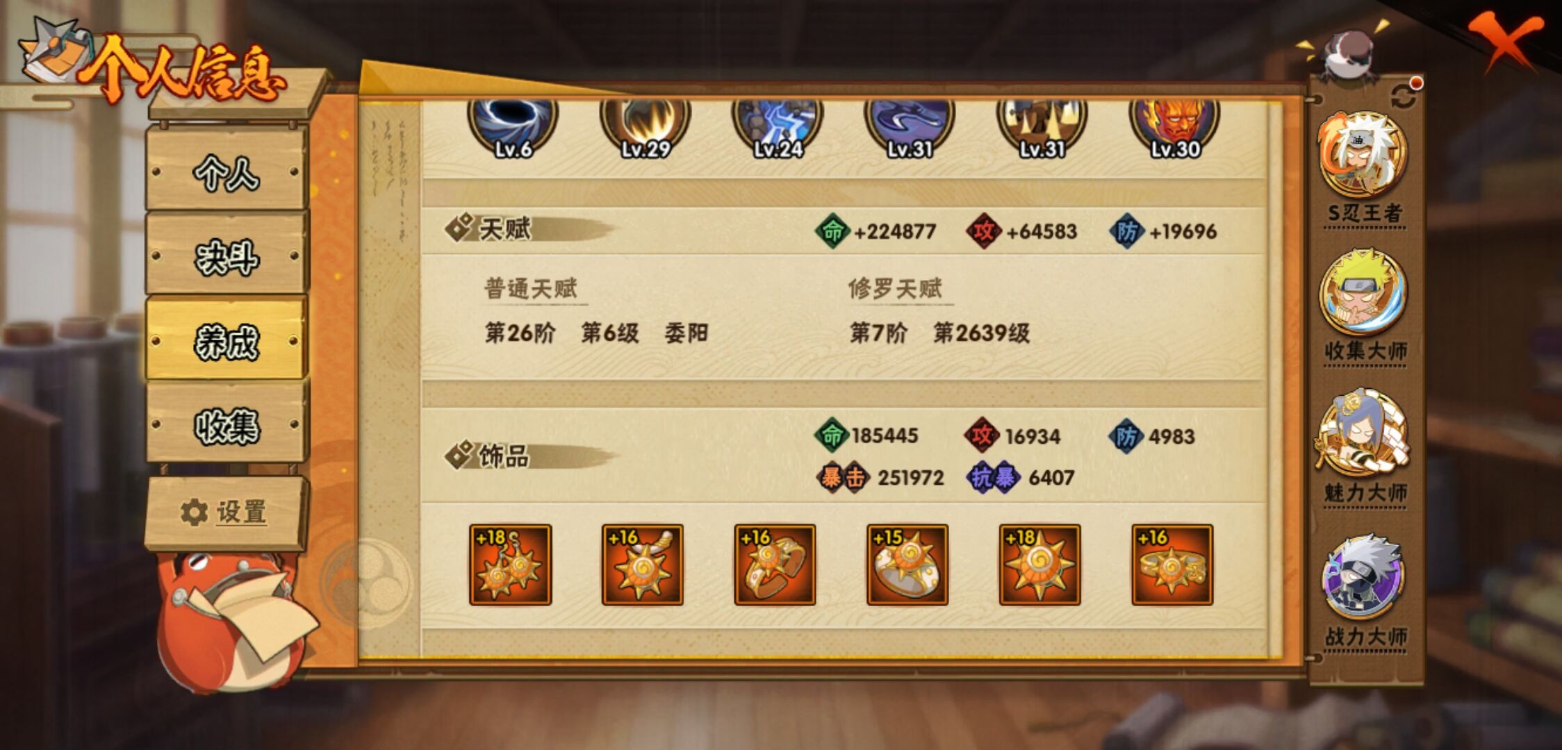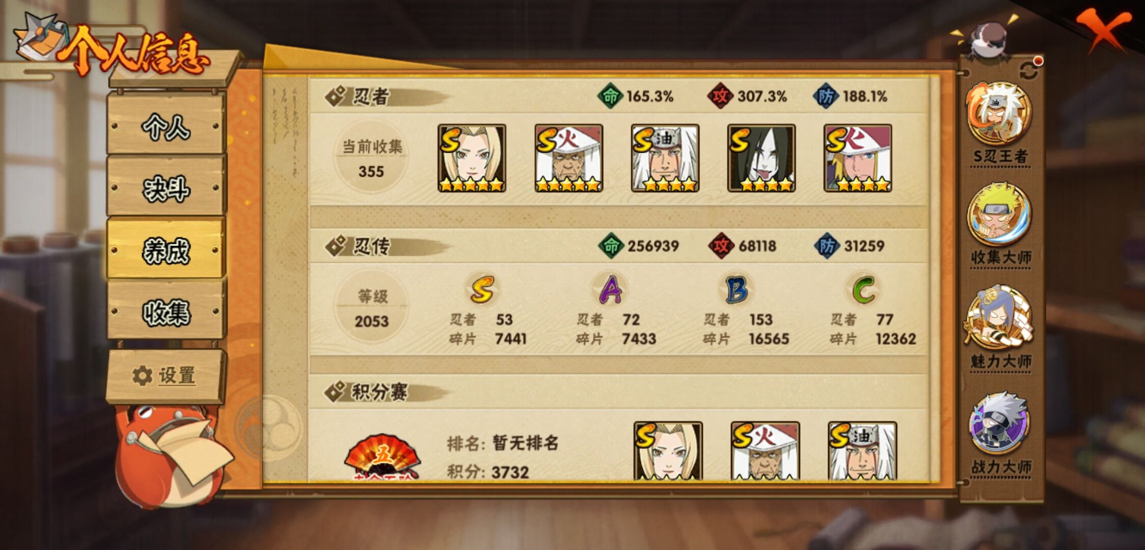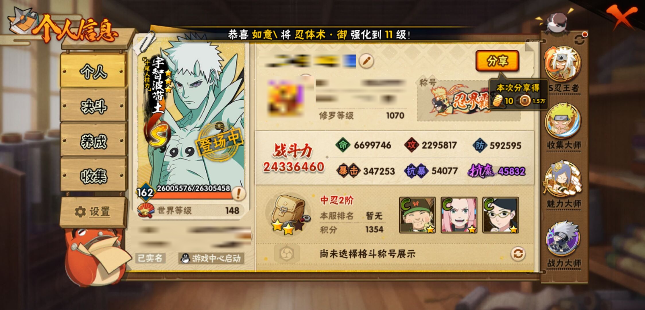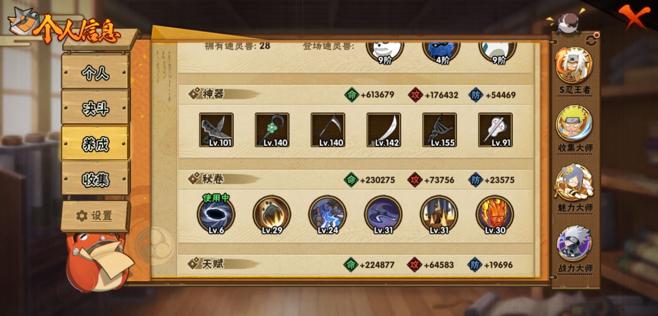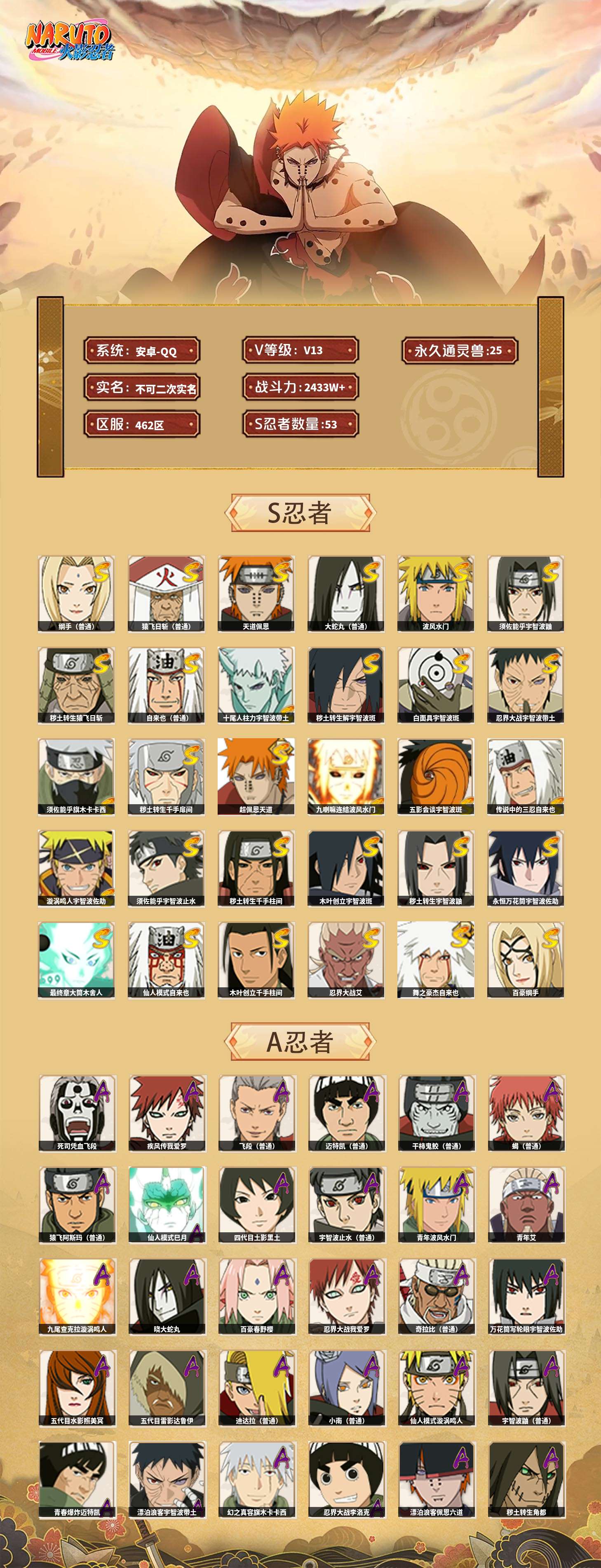 【火影忍者】【lyhy10987】战斗力:2433w;段位:中忍2阶;本服排名:77;vip:v13级;s忍:53个;a忍:72个;通灵兽:25个,s忍:十尾人柱力宇智波带土|秽土转生解宇智波斑|白面具宇智波斑|忍界大战宇智波带土|须佐能乎旗木卡卡西|秽土转生千手扉间|超佩恩天道|九喇嘛连结波风水门|五影会谈宇智波斑|天道佩恩 4星|传说中的三忍自来也|漩涡鸣人宇智波佐助|须佐能乎宇智波止水|秽土转生千手柱间|木叶创立宇智波斑|秽土转生宇智波鼬|永恒万花筒宇智波佐助|最终章大筒木舍人|仙人模式自来也|木叶创立千手柱间|忍界大战艾|舞之豪杰自来也|大蛇丸(普通) 4星|纲手(普通) 5星|百豪纲手|波风水门 4星|秽土转生波风水门|千手扉间(普通)|千手柱间(普通)|秽土转生宇智波斑|宇智波斑(普通)|须佐能乎宇智波鼬 4星|神秘面具男(普通)|红夜之刃神秘面具男|秽土转生长门|秽土转生半藏|秽土转生金角银角|二代目土影无|二代目水影鬼灯幻月|三代目土影大野木|三代目雷影艾|四代目雷影艾|仙人模式药师兜|死门迈特凯|忍界大战大野木|忍界大战春野樱|九喇嘛连结漩涡鸣人|大筒木桃式|猿飞日斩(普通) 5星|秽土转生猿飞日斩 4星|自来也(普通) 4星|暴怒第六尾漩涡鸣人|初代目风影烈斗__a忍:青春爆炸迈特凯|漂泊浪客宇智波带土|仙人模式巳月 3星|幻之真容旗木卡卡西|忍界大战李洛克|漂泊浪客佩恩六道|秽土转生角都|忍界大战日向宁次|四代目土影黑土 3星|木叶上忍猿飞木叶丸|火之意志继承者卑留呼|青年长门|忍者之路神秘面具男|秽土转生迪达拉|志村团藏|宇智波止水(普通) 3星|新春限定宇智波止水|不风|忍界大战奇拉比|青年波风水门 3星|青年艾 3星|加藤断|忍界大战旗木卡卡西|漂泊武士桃地再不斩|近松十人卫千代|晓创生角都|半蛇斗篷药师兜|须佐能乎宇智波佐助|九尾查克拉漩涡鸣人 3星|晓大蛇丸 3星|地陆|火影继承人猿飞日斩|百豪春野樱 3星|忍界大战秋道丁次|忍界大战我爱罗 3星|忍界大战勘九郎|秽土转生猿飞阿斯玛|新春限定波风水门|夏日泳装小南|新春限定宇智波鼬|奇拉比(普通) 3星|万花筒写轮眼宇智波佐助 3星|五代目水影照美冥 3星|五代目雷影达鲁伊 3星|达鲁伊(普通)|死司凭血飞段 5星|角都(普通)|地怨虞角都|疾风传我爱罗 5星|迪达拉(普通) 3星|飞段(普通) 5星|小南(普通) 3星|仙人模式漩涡鸣人 3星|万花筒写轮眼旗木卡卡西|迈特凯(普通) 5星|宇智波鼬(普通) 3星|干柿鬼鲛(普通) 5星|秽土转生桃地再不斩|桃地再不斩|蝎(普通) 5星|绯流琥蝎|猿飞阿斯玛(普通) 5星|桃式显现漩涡博人|最终章日向雏田|六代目水影长十郎|不缘|不动|宇智波泉奈|羁绊神农|忍界大战土台|初始形态机械鸣人|侠隐江湖大野木__通灵兽:忍犬(普通)|蓝蛇|蛤蟆吉|忍龟|镰鼬|猿魔|山椒鱼|蛞蝓(普通)|蜃|蛤蟆仙人|鲛鲨|蛤蟆健|乌鸦(普通)|蛤蟆龙|蛤蟆广|熊猫|二尾又旅|怒鬼(普通)|梦貘|鹰|砂之守鹤|蜘蛛|怒鬼爪|辛牙|怒鬼无臂