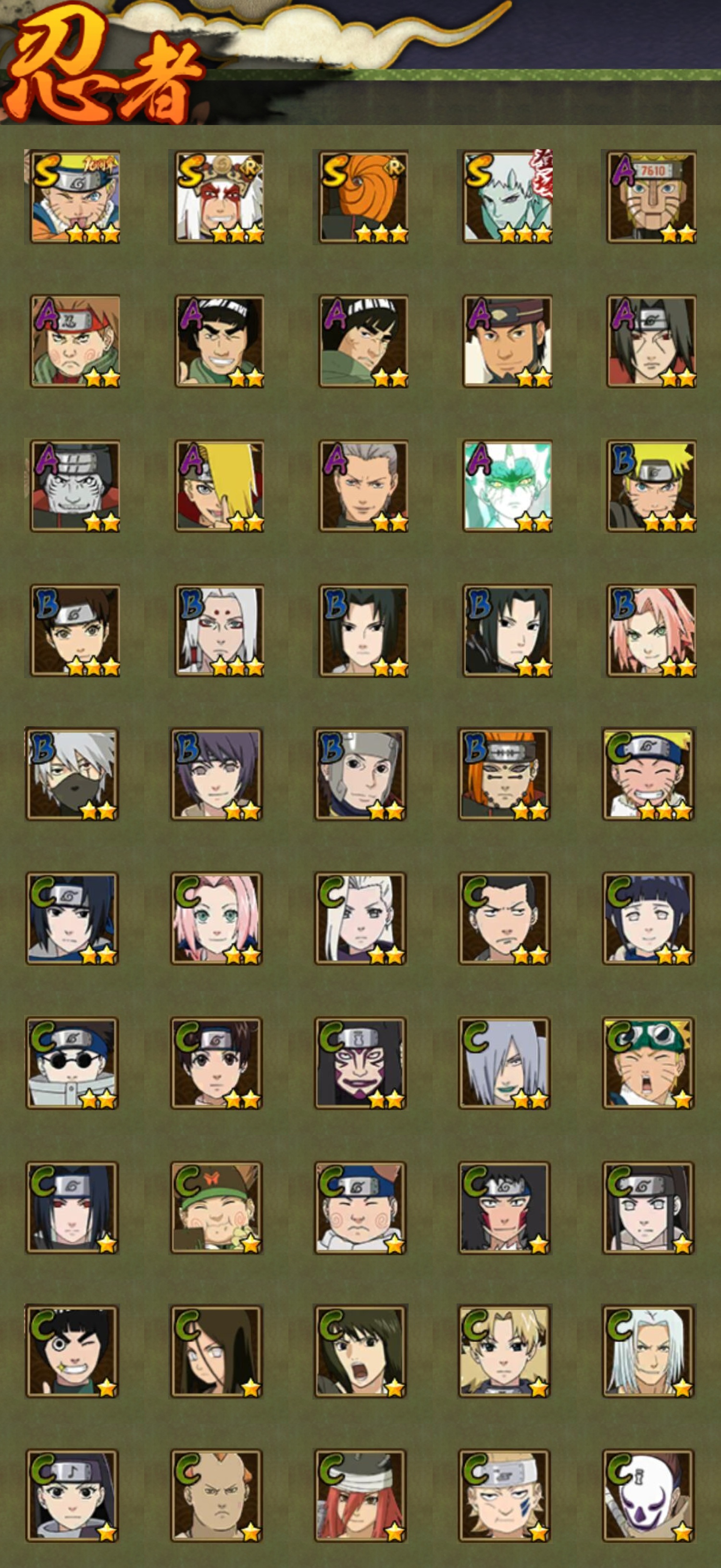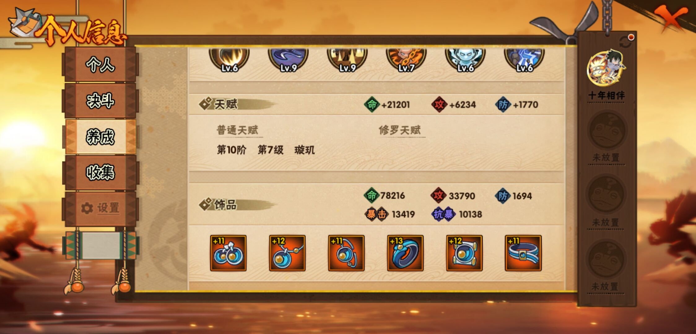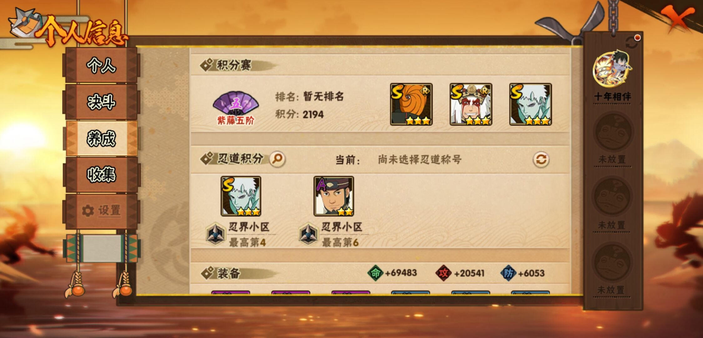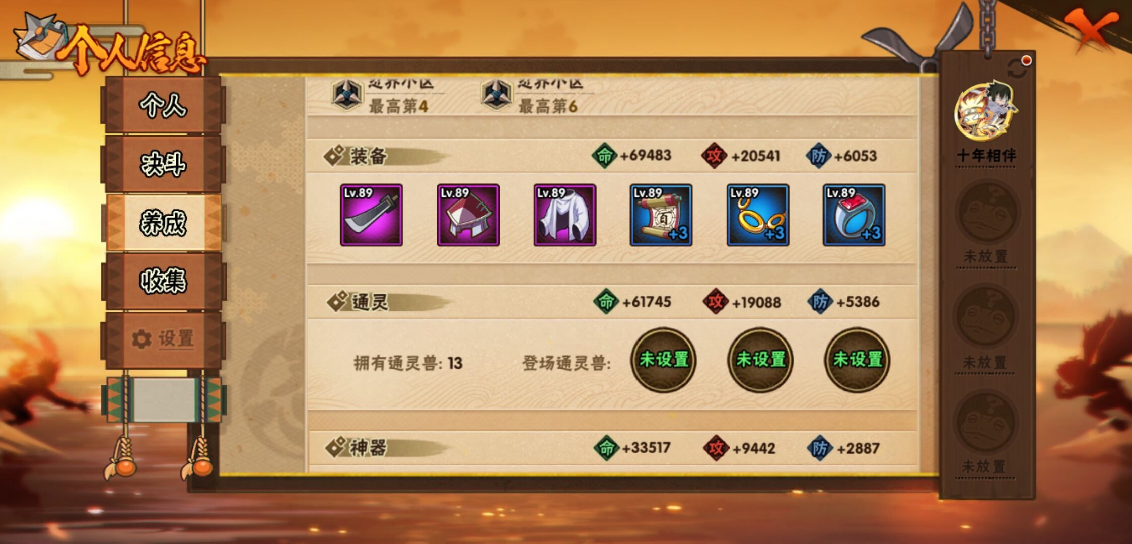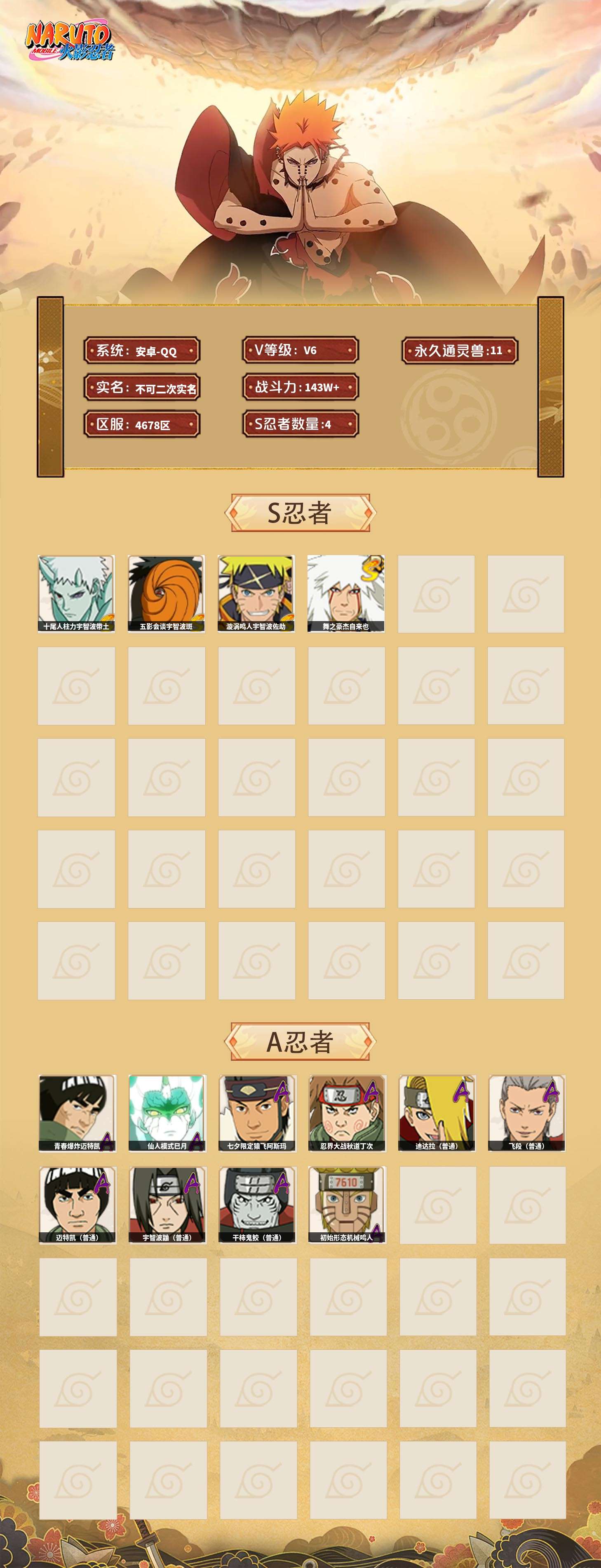 【火影忍者】【lyhy11026】战斗力:143w;段位:上忍3阶;本服排名:92;vip:v6级;s忍:4个;a忍:10个;通灵兽:11个,s忍:十尾人柱力宇智波带土|五影会谈宇智波斑|漩涡鸣人宇智波佐助|舞之豪杰自来也__a忍:青春爆炸迈特凯|仙人模式巳月|七夕限定猿飞阿斯玛|忍界大战秋道丁次|迪达拉(普通)|飞段(普通)|迈特凯(普通)|宇智波鼬(普通)|干柿鬼鲛(普通)|初始形态机械鸣人__通灵兽:忍犬(普通)|蓝蛇|蛤蟆吉|砂之守鹤|忍龟|镰鼬|猿魔|山椒鱼|乌鸦夏日限定|蜃|蛤蟆仙人