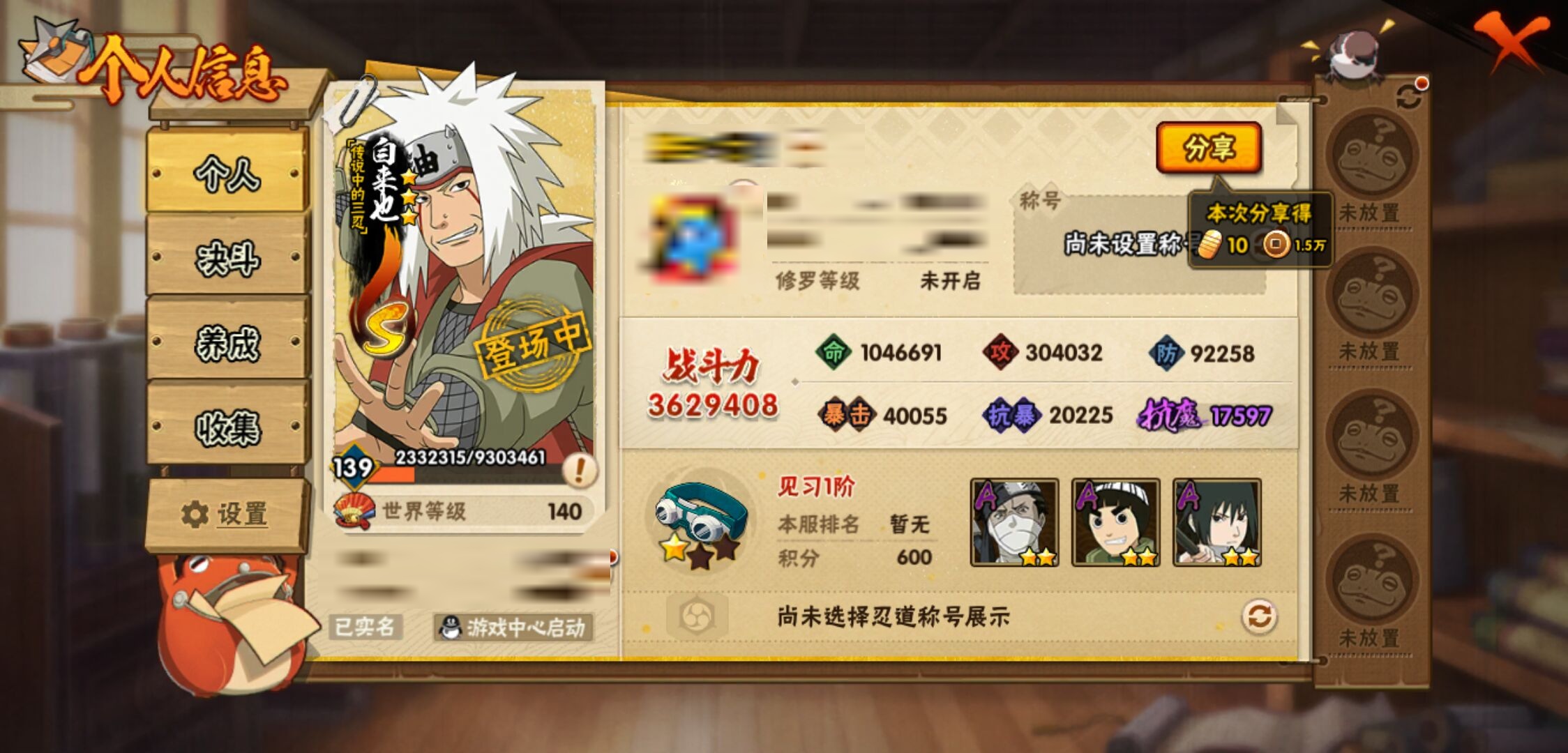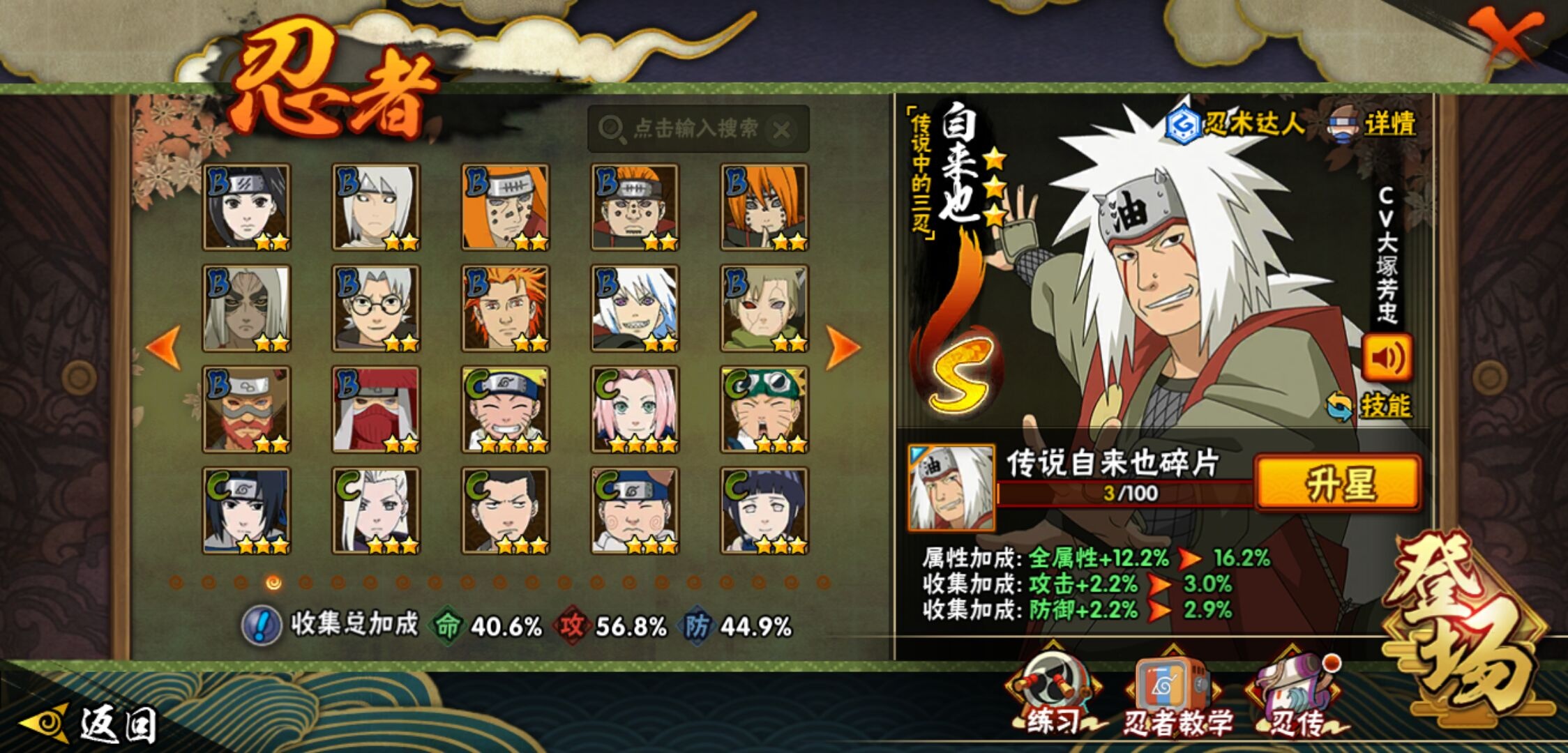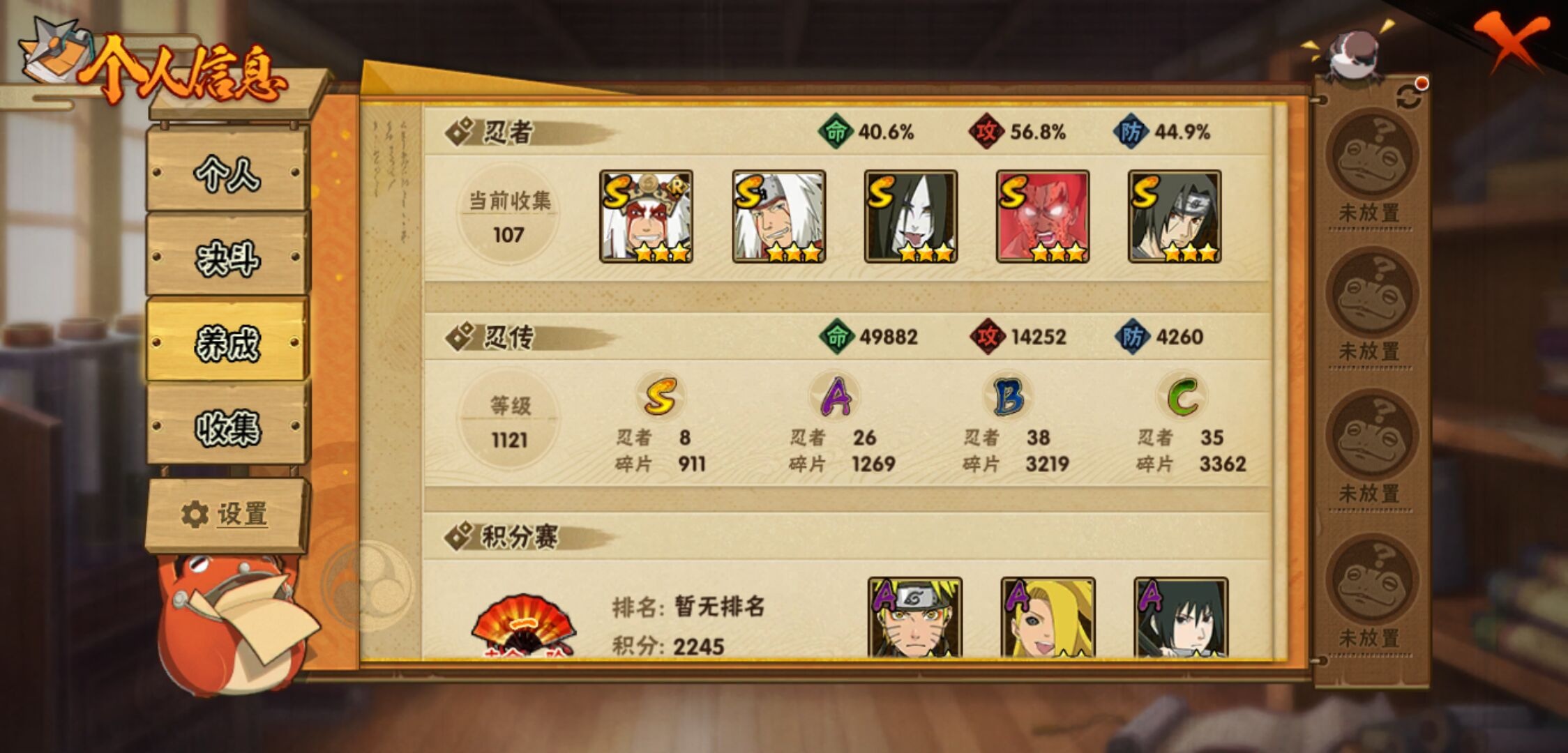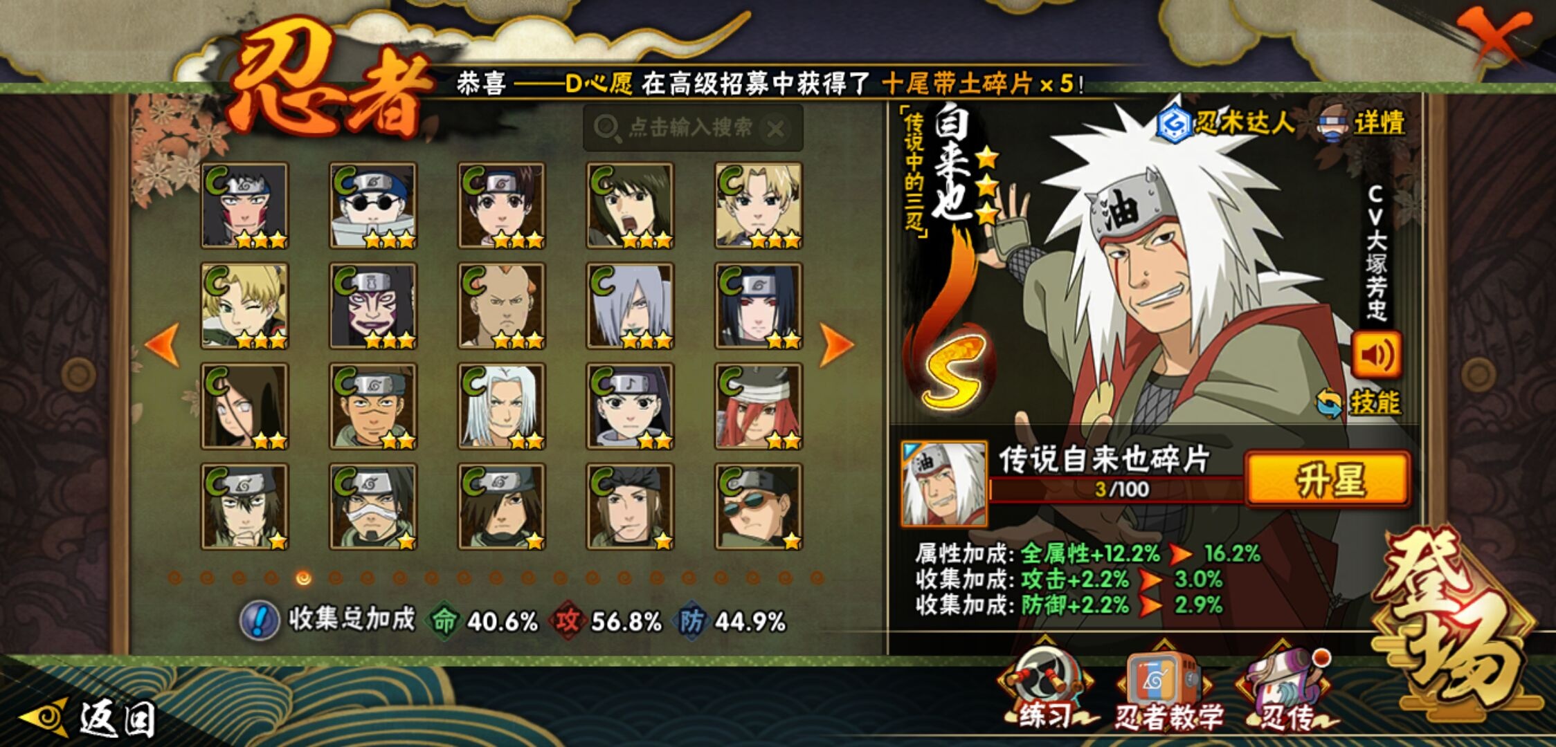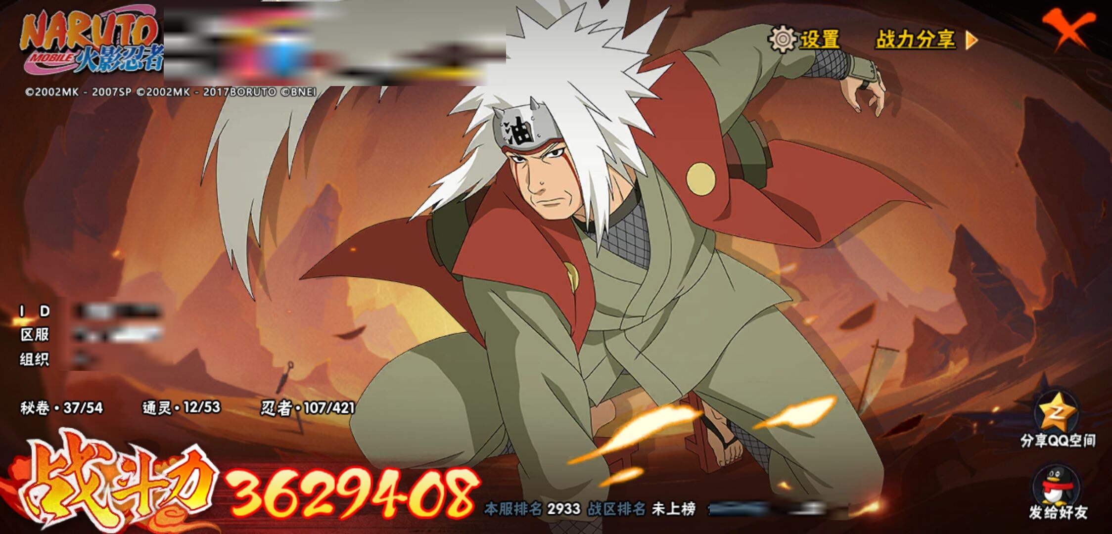 【火影忍者】【lyhy11007】战斗力:362w;段位:见习1阶;本服排名:2933;vip:v0级;s忍:8个;a忍:26个;通灵兽:12个,s忍:忍界大战宇智波带土|天道佩恩|传说中的三忍自来也|忍界大战艾|舞之豪杰自来也|大蛇丸(普通)|须佐能乎宇智波鼬|死门迈特凯__a忍:忍界大战李洛克|秽土转生迪达拉|青年波风水门|青年艾|近松十人卫千代|须佐能乎宇智波佐助|忍界大战我爱罗|万花筒写轮眼宇智波佐助|五代目水影照美冥|五代目雷影达鲁伊|死司凭血飞段|疾风传我爱罗|迪达拉(普通)|飞段(普通)|仙人模式漩涡鸣人|迈特凯(普通)|宇智波鼬(普通)|干柿鬼鲛(普通)|桃地再不斩|秽土转生桃地再不斩|绯流琥蝎|蝎(普通)|猿飞阿斯玛(普通)|桃式显现漩涡博人|不缘|宇智波泉奈__通灵兽:忍犬(普通)|蓝蛇|蛤蟆吉|忍龟|镰鼬|猿魔|山椒鱼|蜃|蛤蟆仙人|鲛鲨|蛤蟆健|乌鸦(普通)