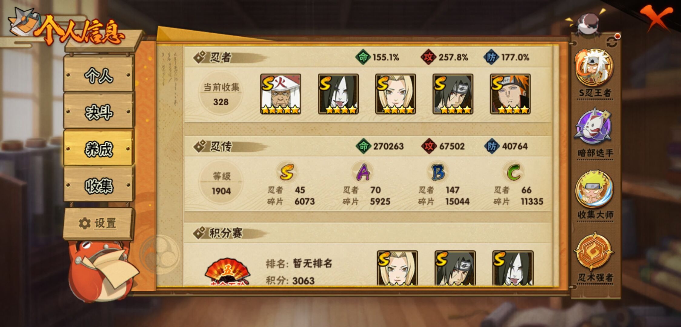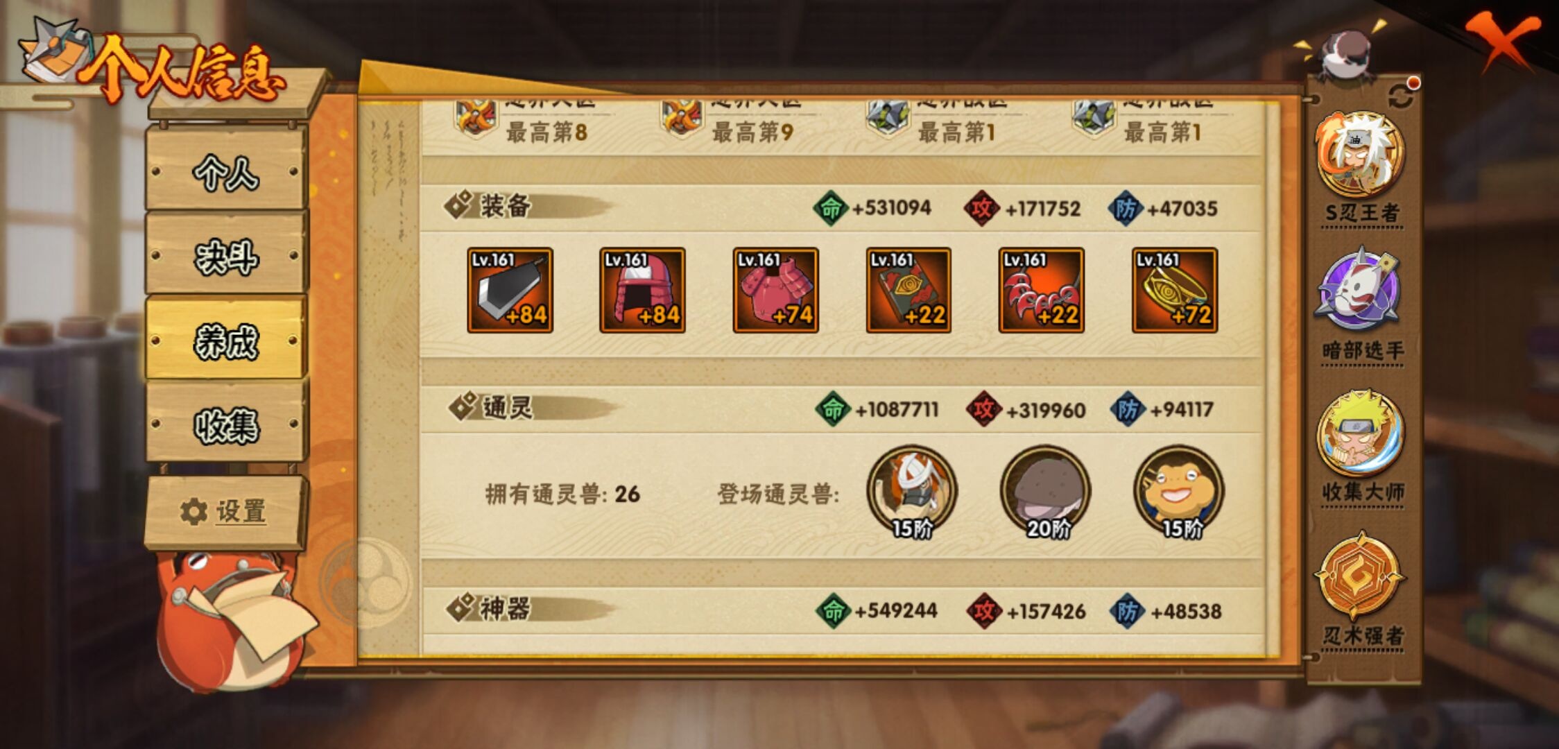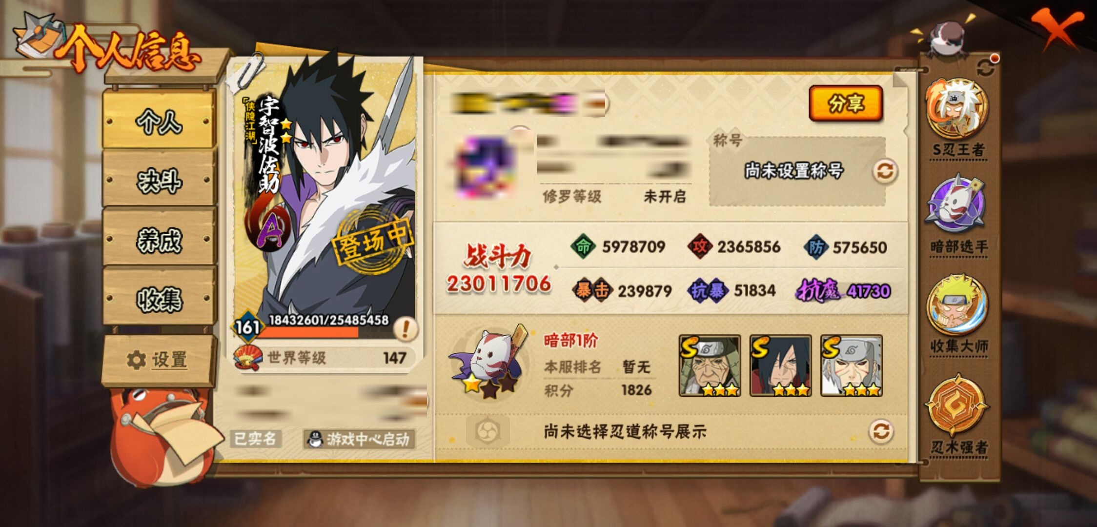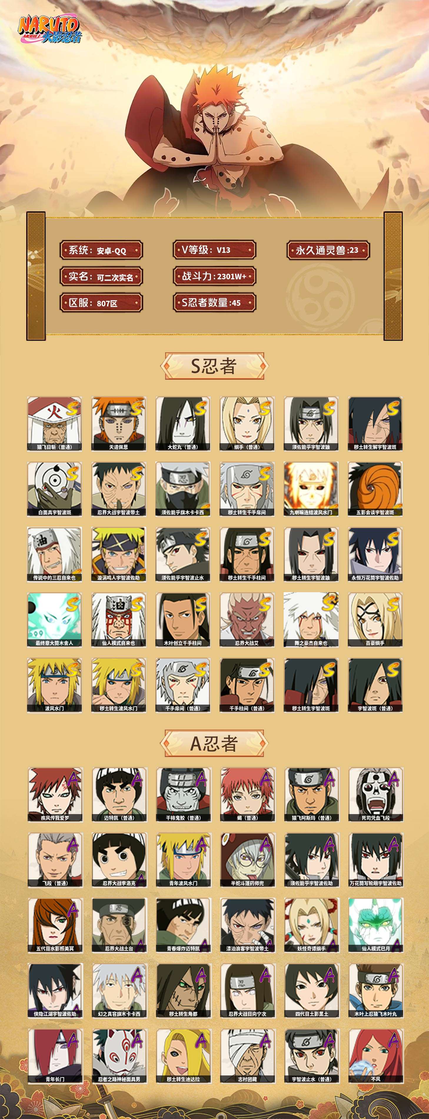【火影忍者】【lyhy11016】战斗力:2301w;段位:暗部1阶;本服排名:91;vip:v13级;s忍:45个;a忍:70个;通灵兽:23个,s忍:秽土转生解宇智波斑|白面具宇智波斑|忍界大战宇智波带土|须佐能乎旗木卡卡西|秽土转生千手扉间|九喇嘛连结波风水门|五影会谈宇智波斑|天道佩恩 4星|传说中的三忍自来也|漩涡鸣人宇智波佐助|须佐能乎宇智波止水|秽土转生千手柱间|秽土转生宇智波鼬|永恒万花筒宇智波佐助|最终章大筒木舍人|仙人模式自来也|木叶创立千手柱间|忍界大战艾|舞之豪杰自来也|大蛇丸(普通) 4星|纲手(普通) 4星|百豪纲手|波风水门|秽土转生波风水门|千手扉间(普通)|千手柱间(普通)|秽土转生宇智波斑|宇智波斑(普通)|须佐能乎宇智波鼬 4星|神秘面具男(普通)|红夜之刃神秘面具男|秽土转生长门|二代目土影无|二代目水影鬼灯幻月|三代目雷影艾|四代目雷影艾|仙人模式药师兜|死门迈特凯|忍界大战春野樱|九喇嘛连结漩涡鸣人|大筒木桃式|猿飞日斩(普通) 5星|秽土转生猿飞日斩|自来也(普通)|暴怒第六尾漩涡鸣人__a忍:青春爆炸迈特凯|漂泊浪客宇智波带土|妖怪奇谭纲手|仙人模式巳月|侠隐江湖宇智波佐助|幻之真容旗木卡卡西|忍界大战李洛克 3星|秽土转生角都|忍界大战日向宁次|四代目土影黑土|木叶上忍猿飞木叶丸|青年长门|忍者之路神秘面具男|秽土转生迪达拉|志村团藏|宇智波止水(普通)|不风|忍界大战奇拉比|青年波风水门 3星|青年艾|加藤断|近松十人卫千代|晓创生角都|半蛇斗篷药师兜 3星|须佐能乎宇智波佐助 3星|九尾查克拉漩涡鸣人|晓大蛇丸|地陆|火影继承人猿飞日斩|百豪春野樱|忍界大战秋道丁次|忍界大战我爱罗|忍界大战勘九郎|秽土转生猿飞阿斯玛|新春限定波风水门|疾风传咒印宇智波佐助|新春限定宇智波鼬|奇拉比(普通)|万花筒写轮眼宇智波佐助 3星|五代目水影照美冥 3星|五代目雷影达鲁伊|死司凭血飞段 4星|角都(普通)|地怨虞角都|疾风传我爱罗 5星|迪达拉(普通)|百机操演蝎|飞段(普通) 4星|小南(普通)|仙人模式漩涡鸣人|万花筒写轮眼旗木卡卡西|迈特凯(普通) 5星|宇智波鼬(普通)|干柿鬼鲛(普通) 5星|桃地再不斩|秽土转生桃地再不斩|蝎(普通) 5星|绯流琥蝎|猿飞阿斯玛(普通) 5星|桃式显现漩涡博人|最终章日向雏田|六代目水影长十郎|不缘|不动|宇智波泉奈|羁绊神农|夏日限定黑土|忍界大战土台 3星|初始形态机械鸣人|侠隐江湖大野木__通灵兽:忍犬(普通)|蓝蛇|蛤蟆吉|忍龟|镰鼬|猿魔|山椒鱼|蜃|蛞蝓(普通)|蛤蟆仙人|鲛鲨|蛤蟆健|乌鸦(普通)|蛤蟆龙|怒鬼(普通)|熊猫|蛤蟆广|砂之守鹤|梦貘|二尾又旅|鹰|蜘蛛|辛牙3140点券