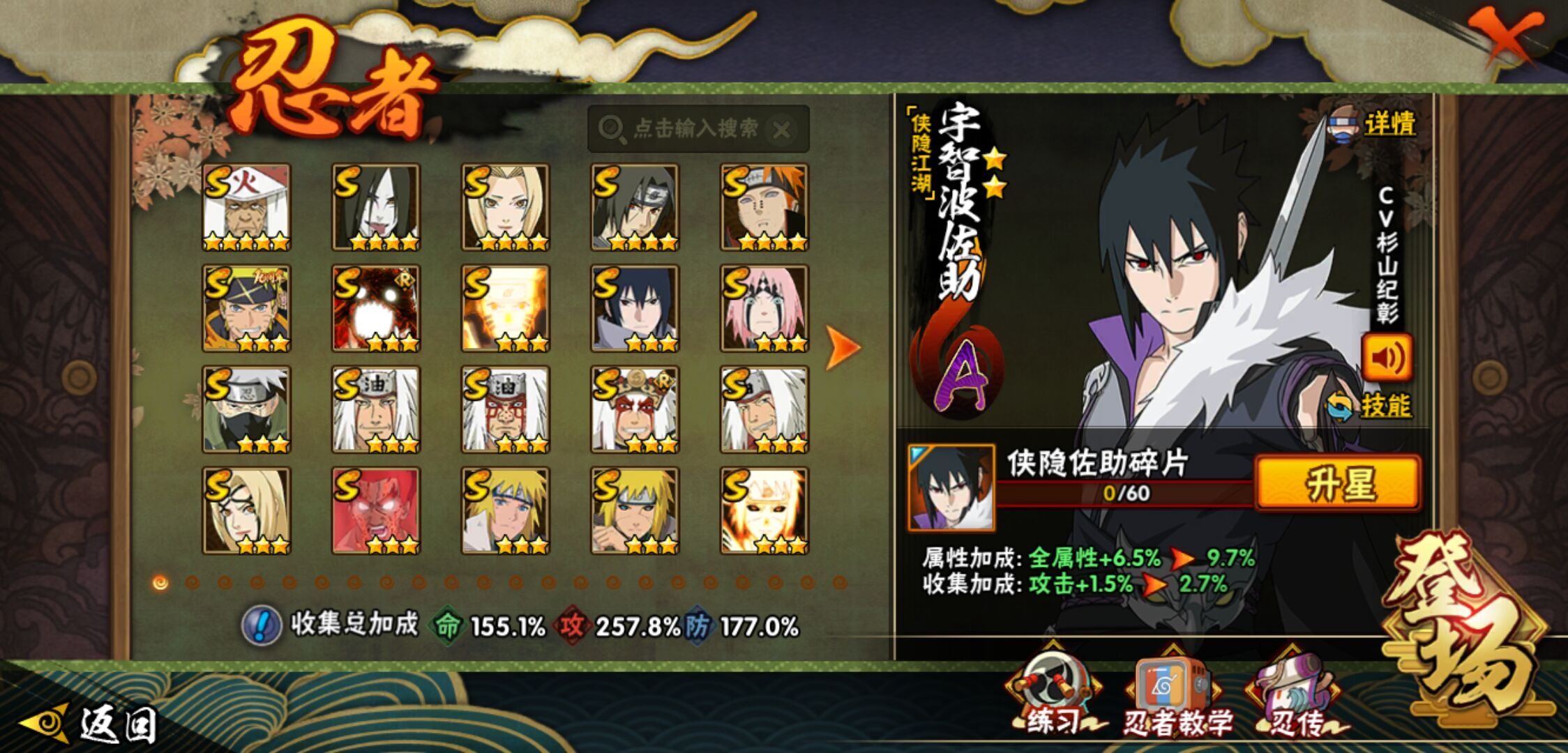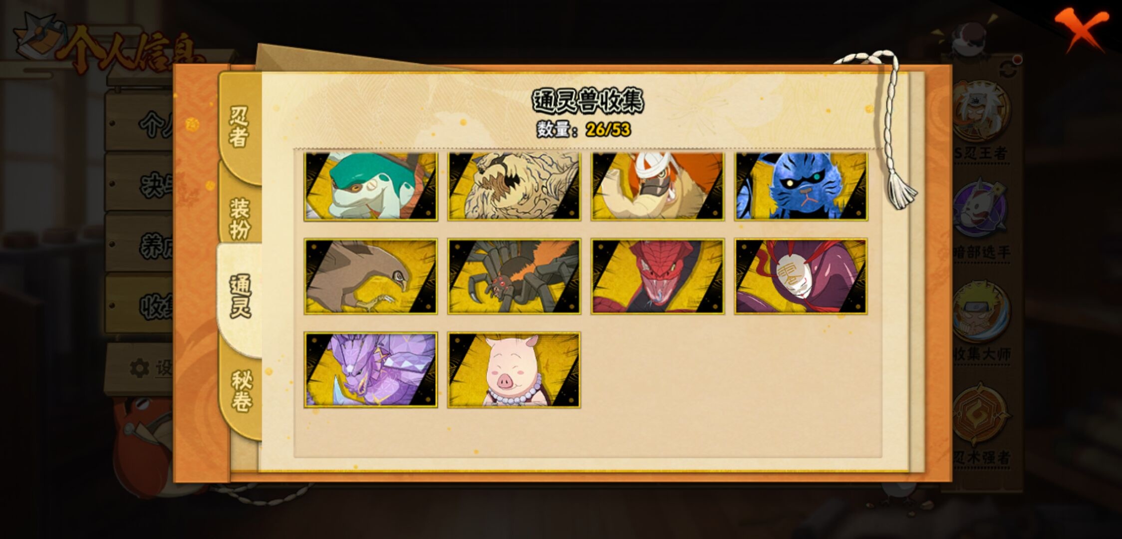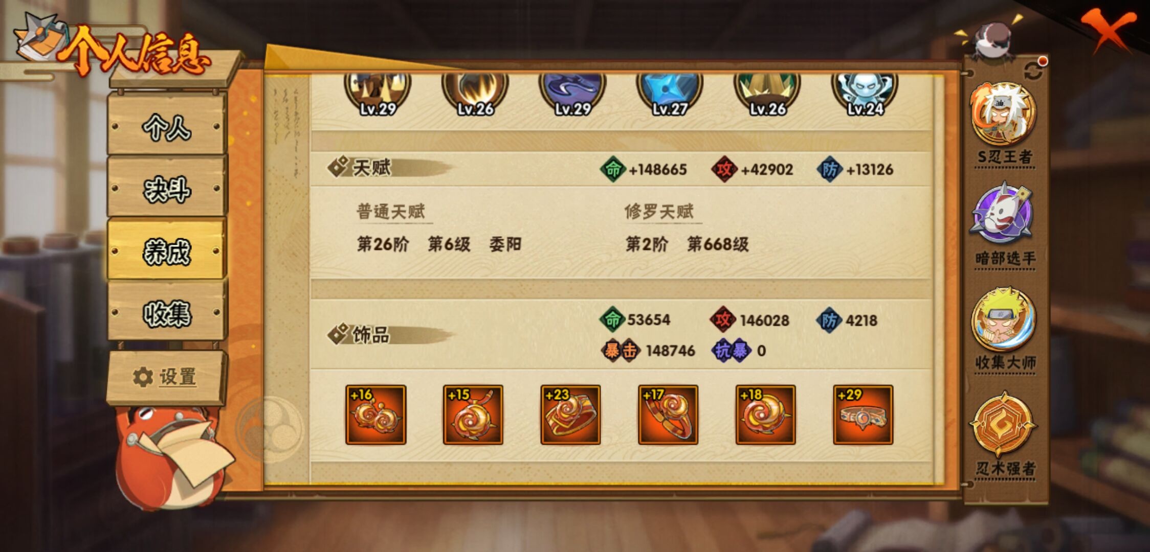 【火影忍者】【lyhy11016】战斗力:2301w;段位:暗部1阶;本服排名:91;vip:v13级;s忍:45个;a忍:70个;通灵兽:23个,s忍:秽土转生解宇智波斑|白面具宇智波斑|忍界大战宇智波带土|须佐能乎旗木卡卡西|秽土转生千手扉间|九喇嘛连结波风水门|五影会谈宇智波斑|天道佩恩 4星|传说中的三忍自来也|漩涡鸣人宇智波佐助|须佐能乎宇智波止水|秽土转生千手柱间|秽土转生宇智波鼬|永恒万花筒宇智波佐助|最终章大筒木舍人|仙人模式自来也|木叶创立千手柱间|忍界大战艾|舞之豪杰自来也|大蛇丸(普通) 4星|纲手(普通) 4星|百豪纲手|波风水门|秽土转生波风水门|千手扉间(普通)|千手柱间(普通)|秽土转生宇智波斑|宇智波斑(普通)|须佐能乎宇智波鼬 4星|神秘面具男(普通)|红夜之刃神秘面具男|秽土转生长门|二代目土影无|二代目水影鬼灯幻月|三代目雷影艾|四代目雷影艾|仙人模式药师兜|死门迈特凯|忍界大战春野樱|九喇嘛连结漩涡鸣人|大筒木桃式|猿飞日斩(普通) 5星|秽土转生猿飞日斩|自来也(普通)|暴怒第六尾漩涡鸣人__a忍:青春爆炸迈特凯|漂泊浪客宇智波带土|妖怪奇谭纲手|仙人模式巳月|侠隐江湖宇智波佐助|幻之真容旗木卡卡西|忍界大战李洛克 3星|秽土转生角都|忍界大战日向宁次|四代目土影黑土|木叶上忍猿飞木叶丸|青年长门|忍者之路神秘面具男|秽土转生迪达拉|志村团藏|宇智波止水(普通)|不风|忍界大战奇拉比|青年波风水门 3星|青年艾|加藤断|近松十人卫千代|晓创生角都|半蛇斗篷药师兜 3星|须佐能乎宇智波佐助 3星|九尾查克拉漩涡鸣人|晓大蛇丸|地陆|火影继承人猿飞日斩|百豪春野樱|忍界大战秋道丁次|忍界大战我爱罗|忍界大战勘九郎|秽土转生猿飞阿斯玛|新春限定波风水门|疾风传咒印宇智波佐助|新春限定宇智波鼬|奇拉比(普通)|万花筒写轮眼宇智波佐助 3星|五代目水影照美冥 3星|五代目雷影达鲁伊|死司凭血飞段 4星|角都(普通)|地怨虞角都|疾风传我爱罗 5星|迪达拉(普通)|百机操演蝎|飞段(普通) 4星|小南(普通)|仙人模式漩涡鸣人|万花筒写轮眼旗木卡卡西|迈特凯(普通) 5星|宇智波鼬(普通)|干柿鬼鲛(普通) 5星|桃地再不斩|秽土转生桃地再不斩|蝎(普通) 5星|绯流琥蝎|猿飞阿斯玛(普通) 5星|桃式显现漩涡博人|最终章日向雏田|六代目水影长十郎|不缘|不动|宇智波泉奈|羁绊神农|夏日限定黑土|忍界大战土台 3星|初始形态机械鸣人|侠隐江湖大野木__通灵兽:忍犬(普通)|蓝蛇|蛤蟆吉|忍龟|镰鼬|猿魔|山椒鱼|蜃|蛞蝓(普通)|蛤蟆仙人|鲛鲨|蛤蟆健|乌鸦(普通)|蛤蟆龙|怒鬼(普通)|熊猫|蛤蟆广|砂之守鹤|梦貘|二尾又旅|鹰|蜘蛛|辛牙3140点券