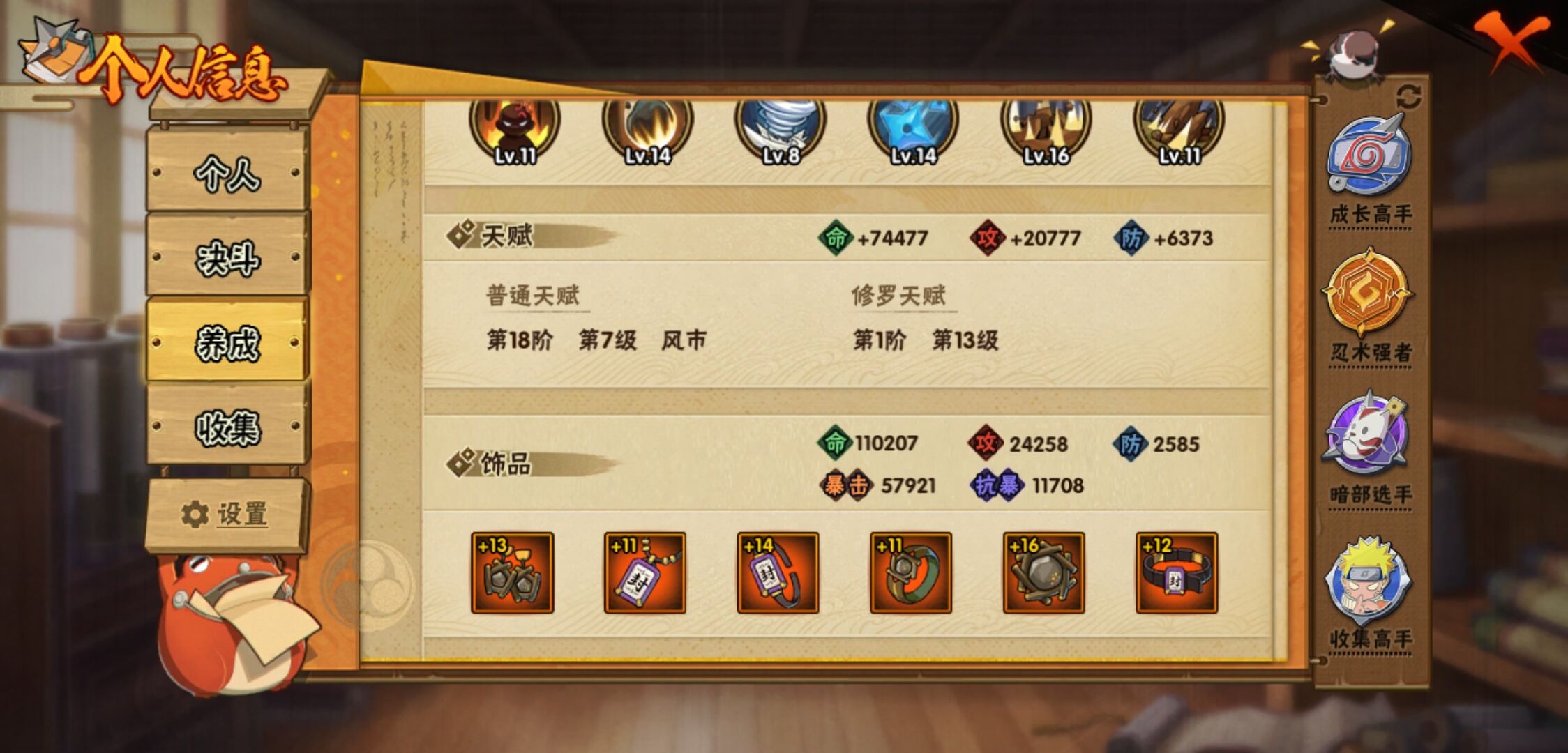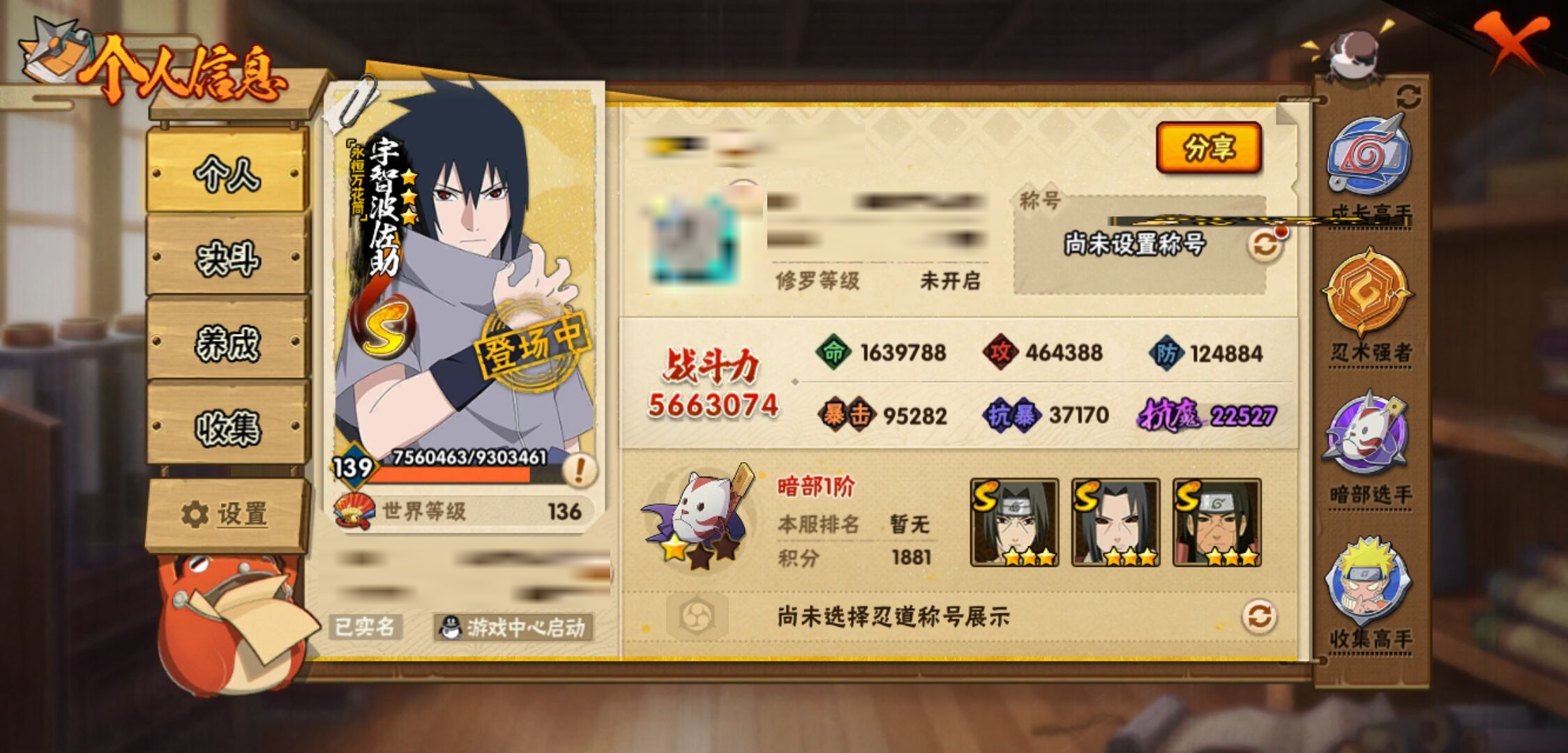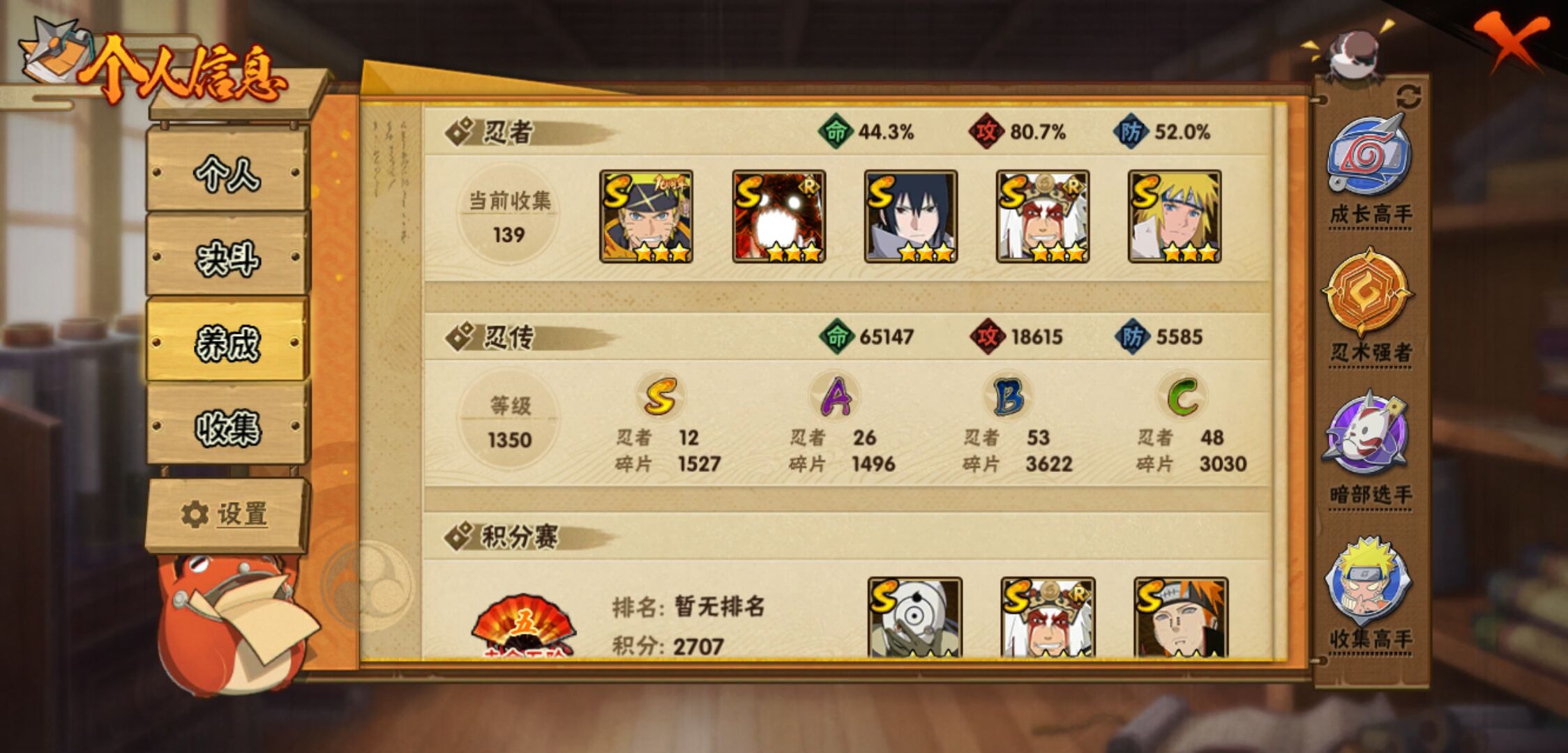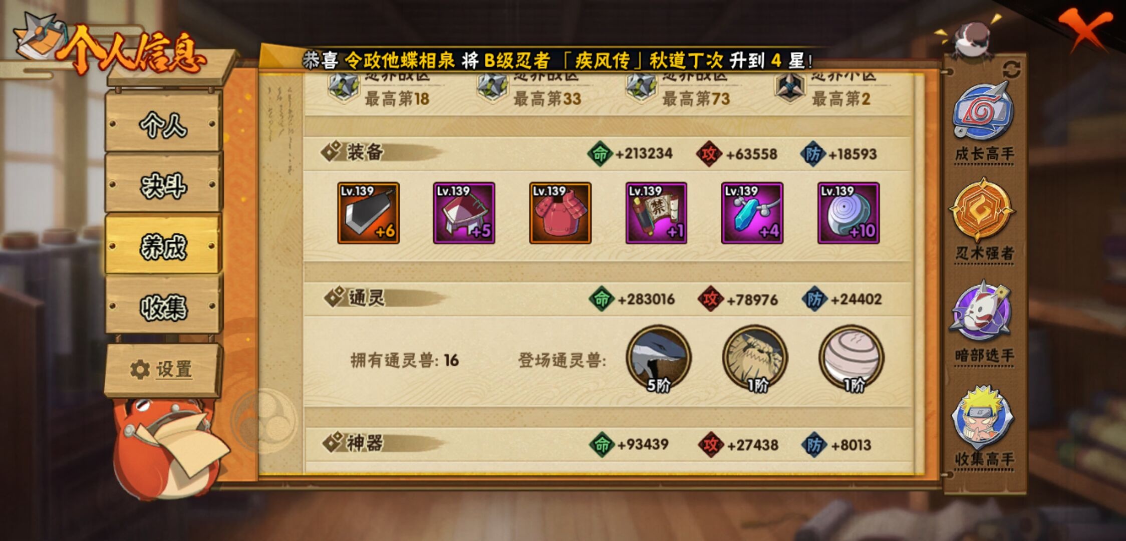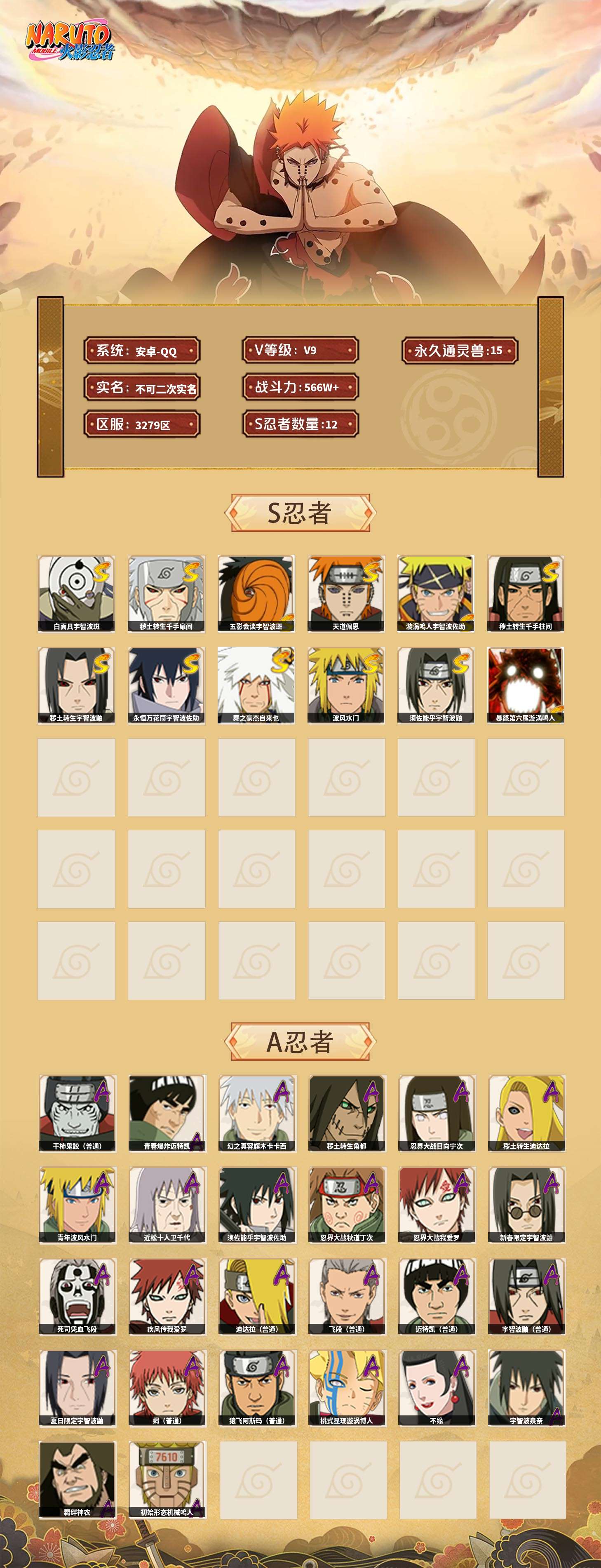 【火影忍者】【lyhy11015】战斗力:566w;段位:暗部1阶;本服排名:1856;vip:v9级;s忍:12个;a忍:26个;通灵兽:15个,s忍:白面具宇智波斑|秽土转生千手扉间|五影会谈宇智波斑|天道佩恩|漩涡鸣人宇智波佐助|秽土转生千手柱间|秽土转生宇智波鼬|永恒万花筒宇智波佐助|舞之豪杰自来也|波风水门|须佐能乎宇智波鼬|暴怒第六尾漩涡鸣人__a忍:青春爆炸迈特凯|幻之真容旗木卡卡西|秽土转生角都|忍界大战日向宁次|秽土转生迪达拉|青年波风水门|近松十人卫千代|须佐能乎宇智波佐助|忍界大战秋道丁次|忍界大战我爱罗|新春限定宇智波鼬|死司凭血飞段|疾风传我爱罗|迪达拉(普通)|飞段(普通)|迈特凯(普通)|宇智波鼬(普通)|夏日限定宇智波鼬|干柿鬼鲛(普通) 4星|蝎(普通)|猿飞阿斯玛(普通)|桃式显现漩涡博人|不缘|宇智波泉奈|羁绊神农|初始形态机械鸣人__通灵兽:忍犬(普通)|蓝蛇|蛤蟆吉|砂之守鹤|忍龟|镰鼬|猿魔|山椒鱼|蜃|守鹤(普通)|蛤蟆仙人|鲛鲨|蛤蟆健|乌鸦(普通)|蛤蟆龙