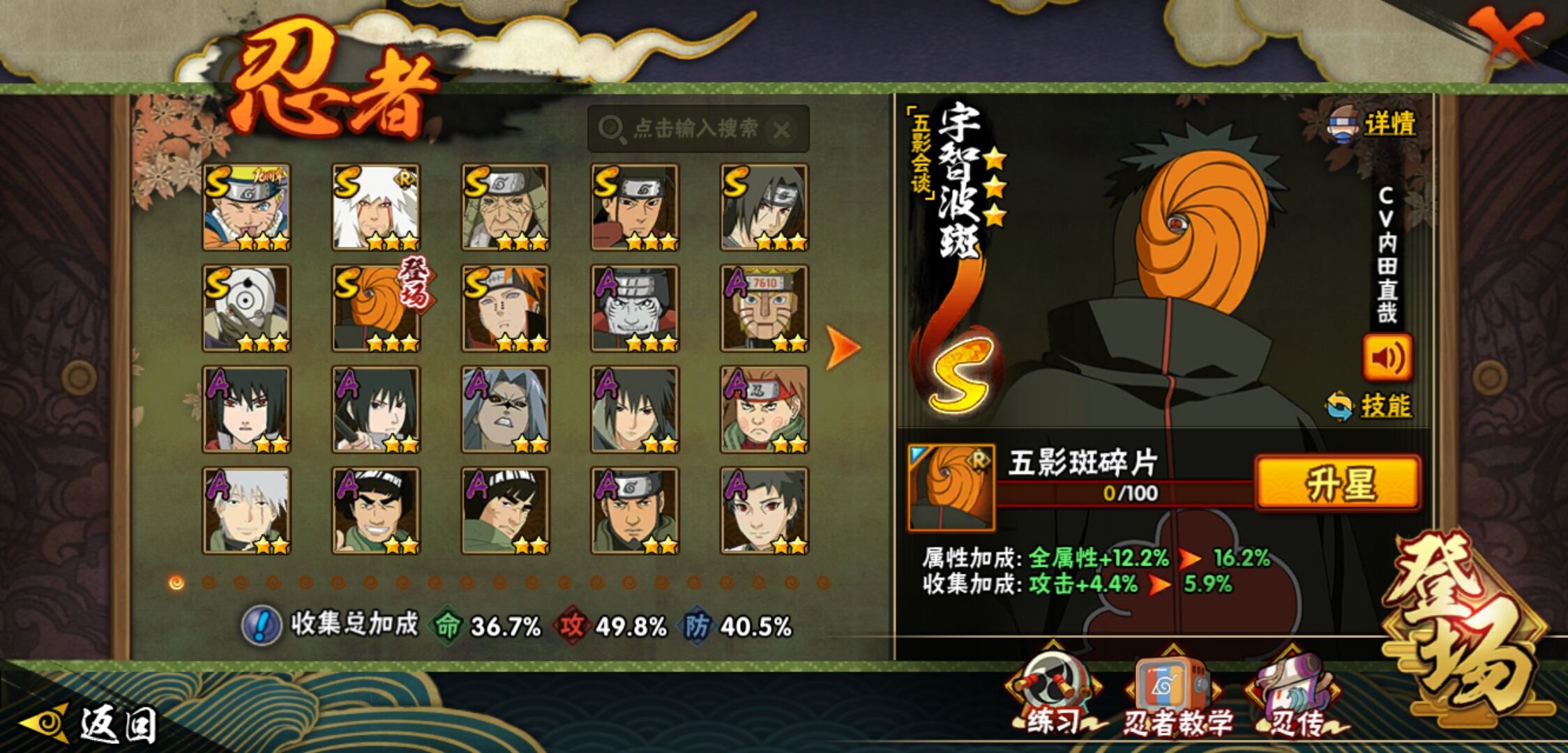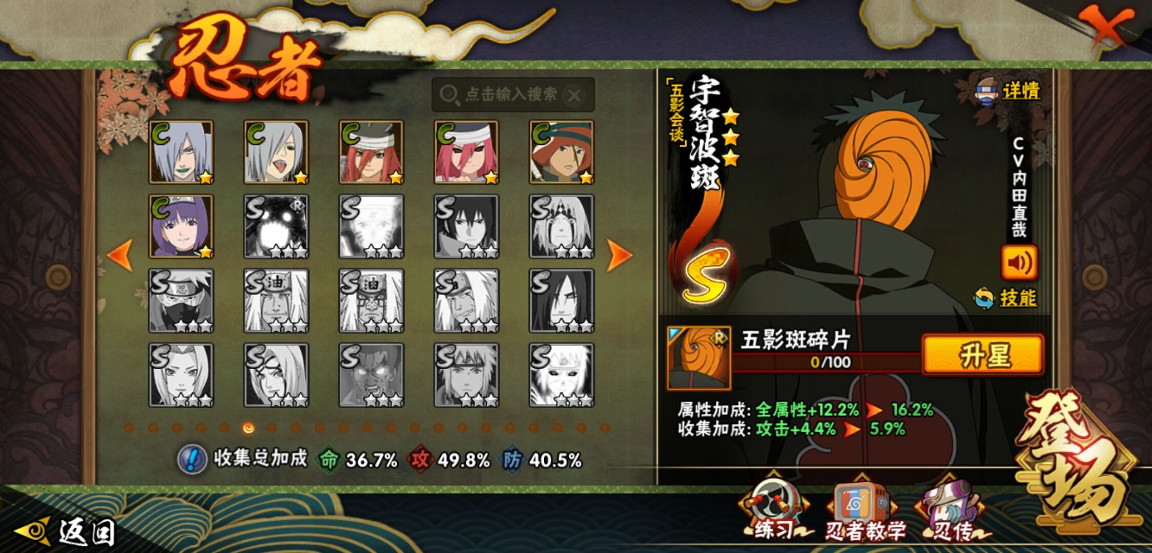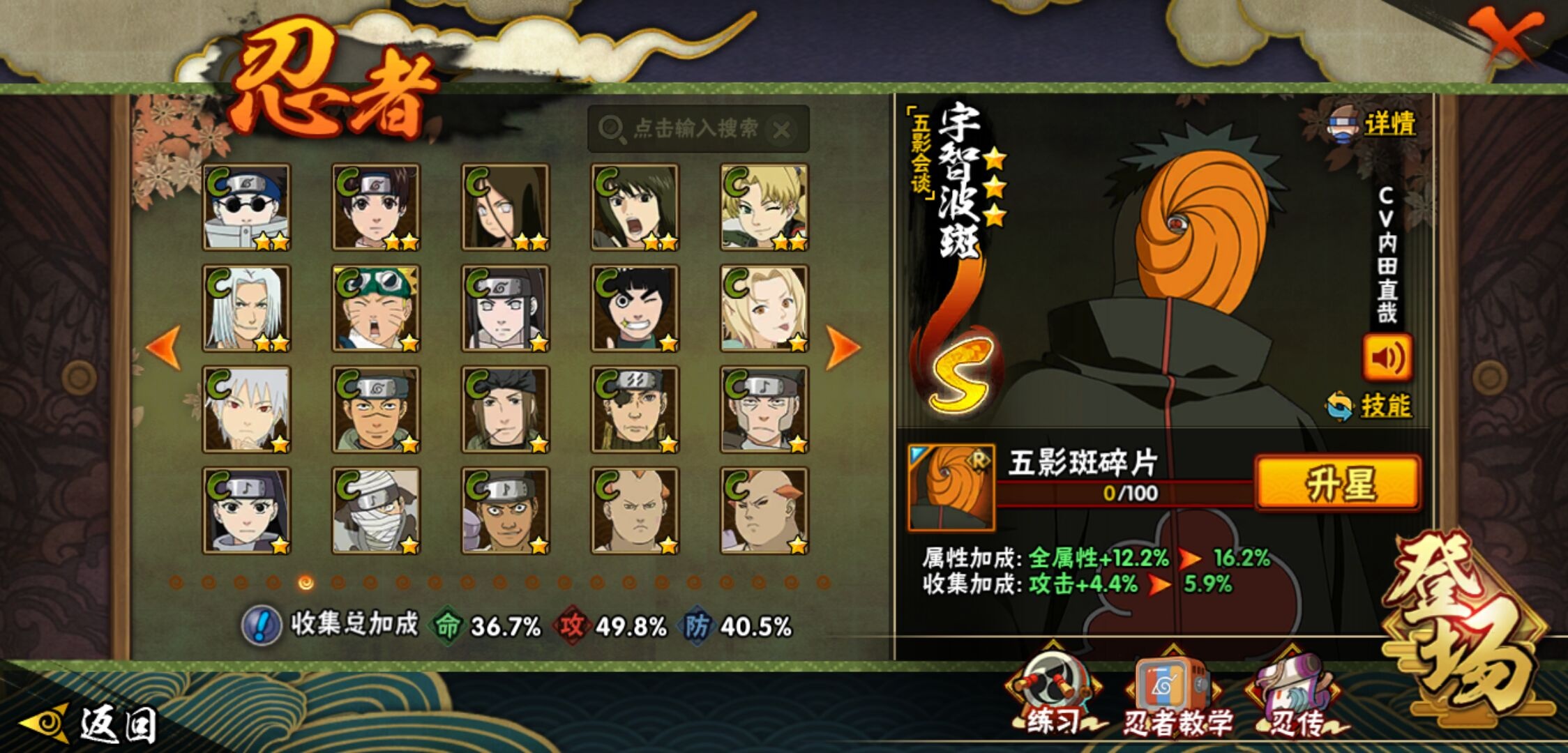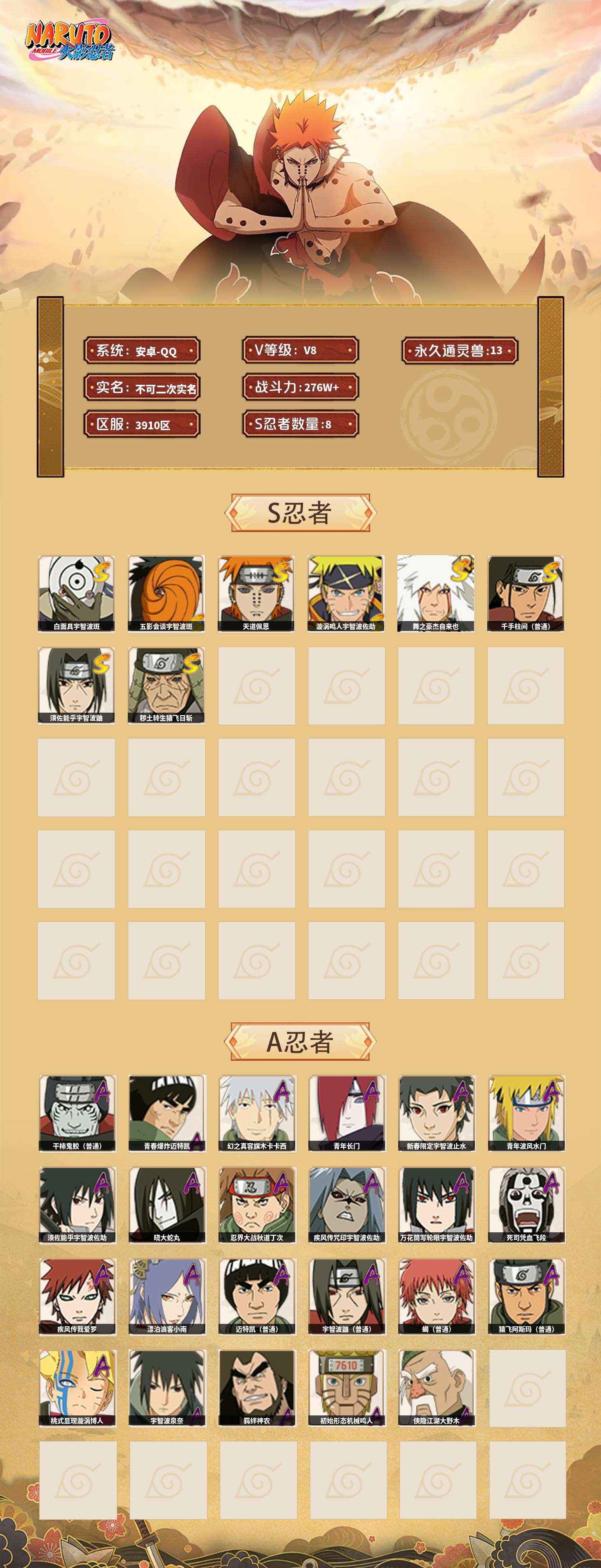 【火影忍者】【lyhy11017】战斗力:276w;段位:上忍3阶;本服排名:3163;vip:v8级;s忍:8个;a忍:23个;通灵兽:13个,s忍:白面具宇智波斑|五影会谈宇智波斑|天道佩恩|漩涡鸣人宇智波佐助|舞之豪杰自来也|千手柱间(普通)|须佐能乎宇智波鼬|秽土转生猿飞日斩__a忍:青春爆炸迈特凯|幻之真容旗木卡卡西|青年长门|新春限定宇智波止水|青年波风水门|须佐能乎宇智波佐助|晓大蛇丸|忍界大战秋道丁次|疾风传咒印宇智波佐助|万花筒写轮眼宇智波佐助|死司凭血飞段|疾风传我爱罗|漂泊浪客小南|迈特凯(普通)|宇智波鼬(普通)|干柿鬼鲛(普通) 3星|蝎(普通)|猿飞阿斯玛(普通)|桃式显现漩涡博人|宇智波泉奈|羁绊神农|初始形态机械鸣人|侠隐江湖大野木__通灵兽:忍犬(普通)|蓝蛇|蛤蟆吉|砂之守鹤|忍龟|镰鼬|猿魔|山椒鱼|蜃|蛤蟆仙人|鲛鲨|蛤蟆健|蛞蝓(普通)