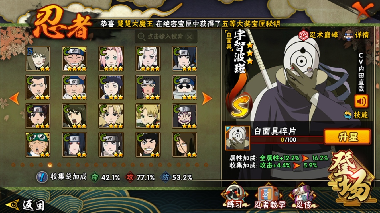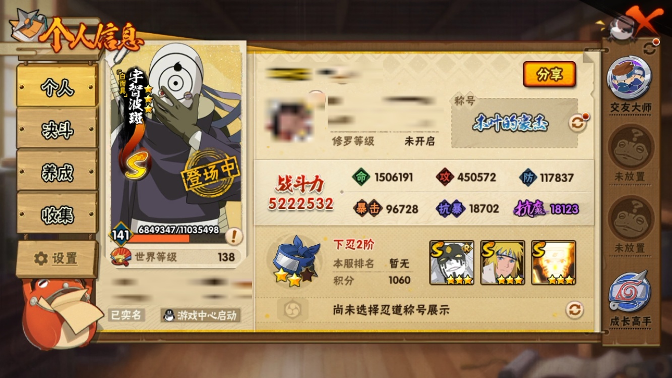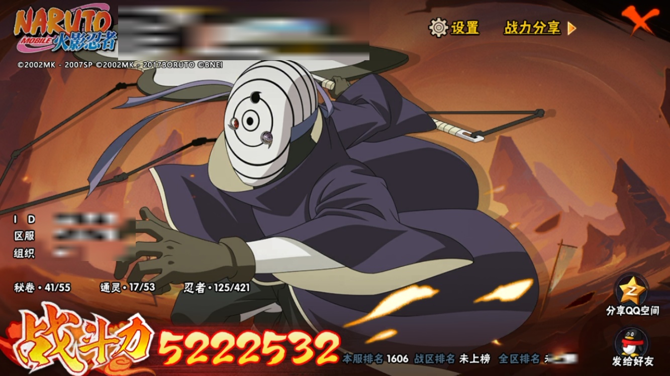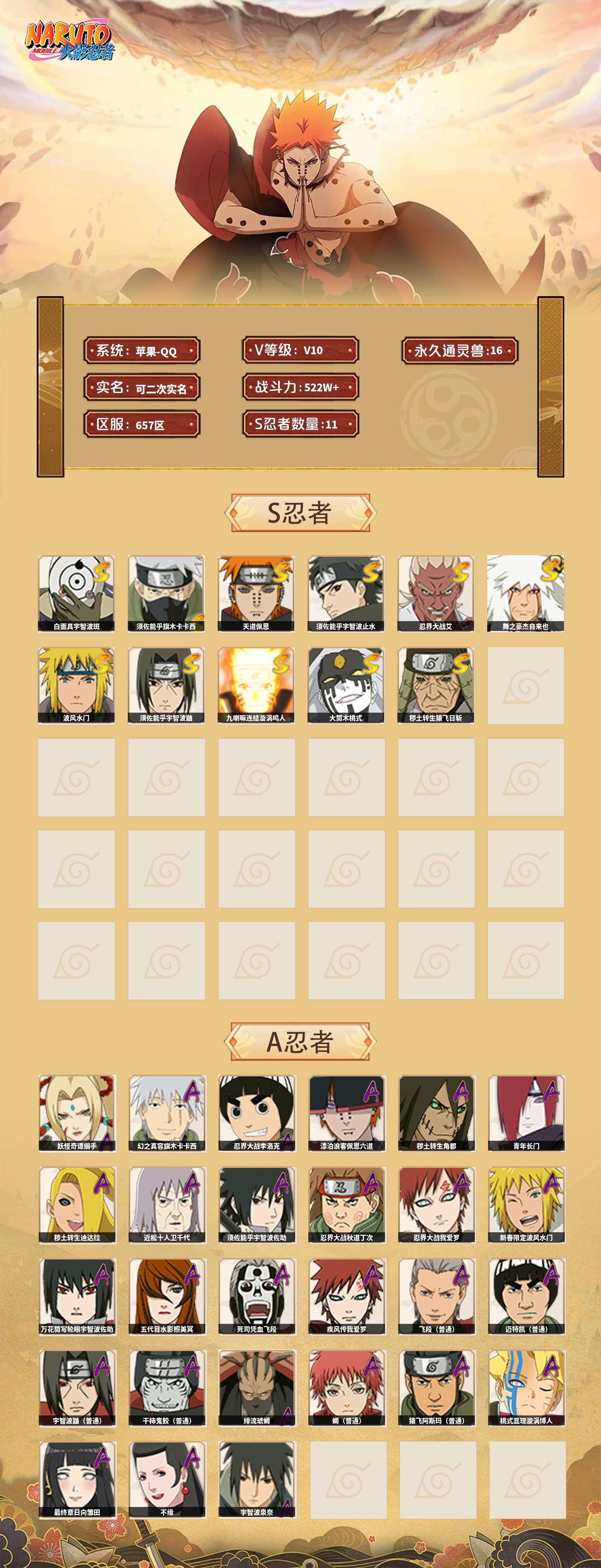 【火影忍者】【lyhy11043】战斗力:522w;段位:下忍2阶;本服排名:1606;vip:v10级;s忍:11个;a忍:27个;通灵兽:16个,s忍:白面具宇智波斑|须佐能乎旗木卡卡西|天道佩恩|须佐能乎宇智波止水|忍界大战艾|舞之豪杰自来也|波风水门|须佐能乎宇智波鼬|九喇嘛连结漩涡鸣人|大筒木桃式|秽土转生猿飞日斩__a忍:妖怪奇谭纲手|幻之真容旗木卡卡西|忍界大战李洛克|漂泊浪客佩恩六道|秽土转生角都|青年长门|秽土转生迪达拉|近松十人卫千代|须佐能乎宇智波佐助|忍界大战秋道丁次|忍界大战我爱罗|新春限定波风水门|万花筒写轮眼宇智波佐助|五代目水影照美冥|死司凭血飞段|疾风传我爱罗|飞段(普通)|迈特凯(普通)|宇智波鼬(普通)|干柿鬼鲛(普通)|绯流琥蝎|蝎(普通)|猿飞阿斯玛(普通)|桃式显现漩涡博人|最终章日向雏田|不缘|宇智波泉奈__通灵兽:忍犬(普通)|蓝蛇|砂之守鹤|蛤蟆吉|忍龟|镰鼬|猿魔|山椒鱼|蜃|蛤蟆仙人|鲛鲨|辛牙|蛤蟆健|蛞蝓(普通)|乌鸦(普通)|蛤蟆龙