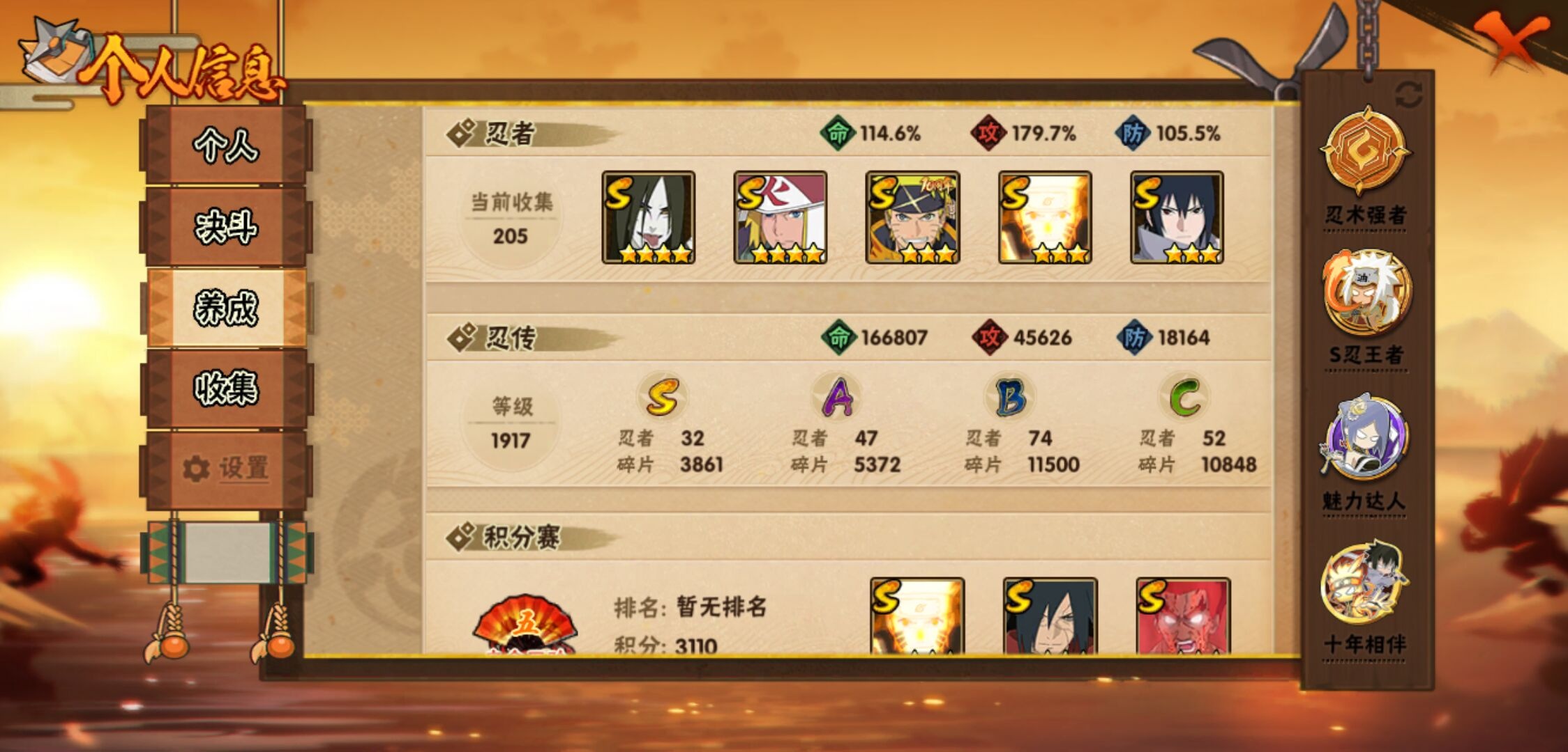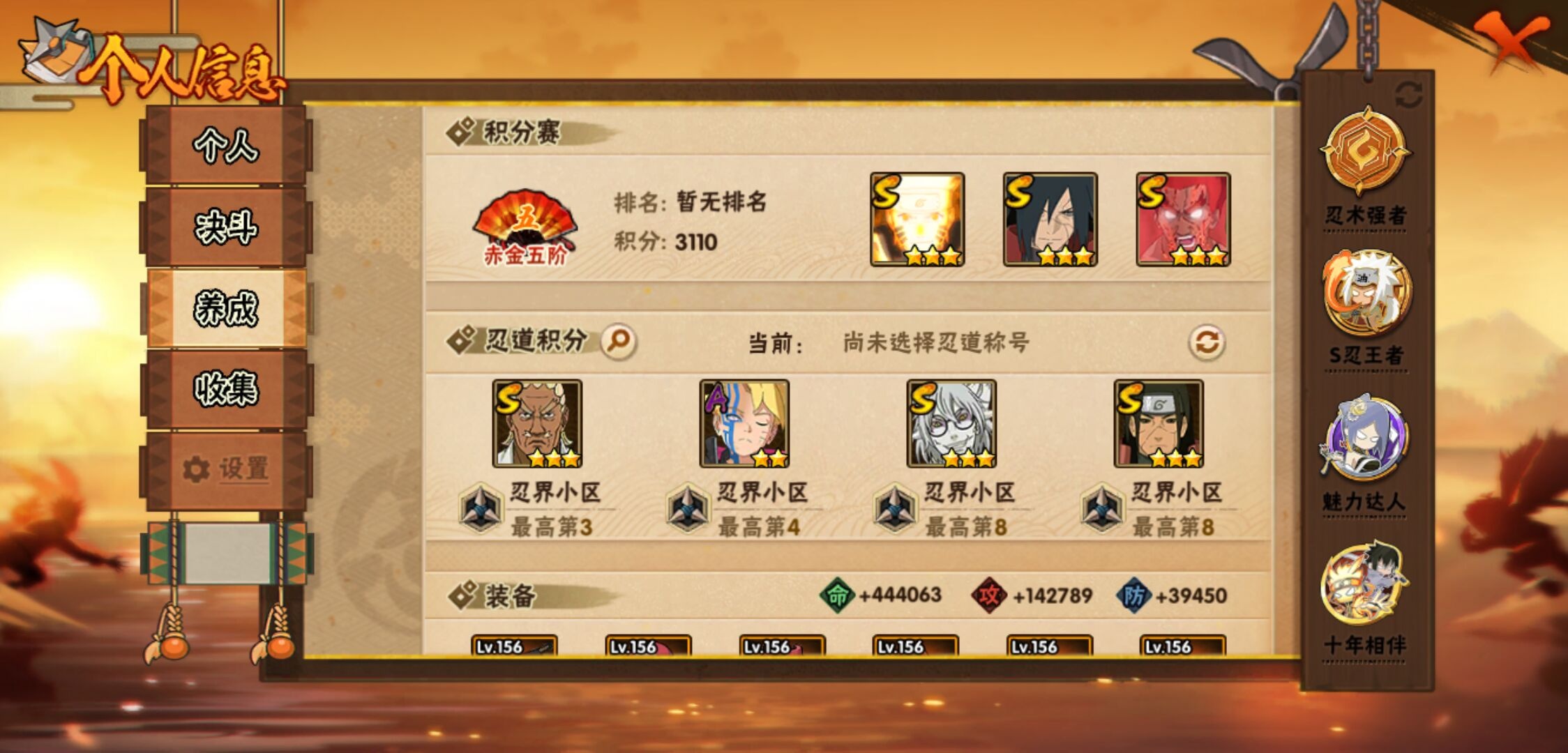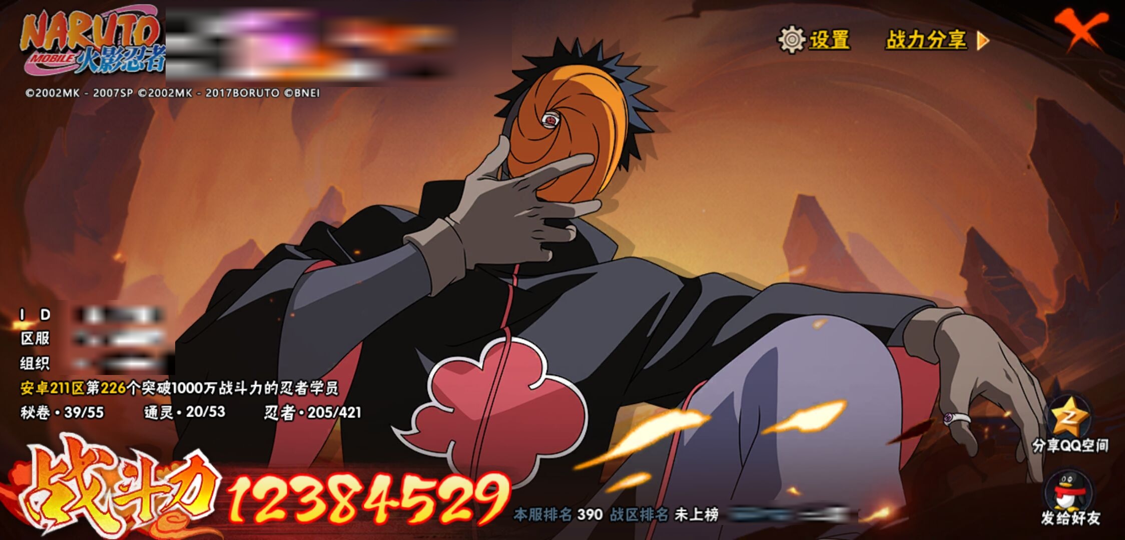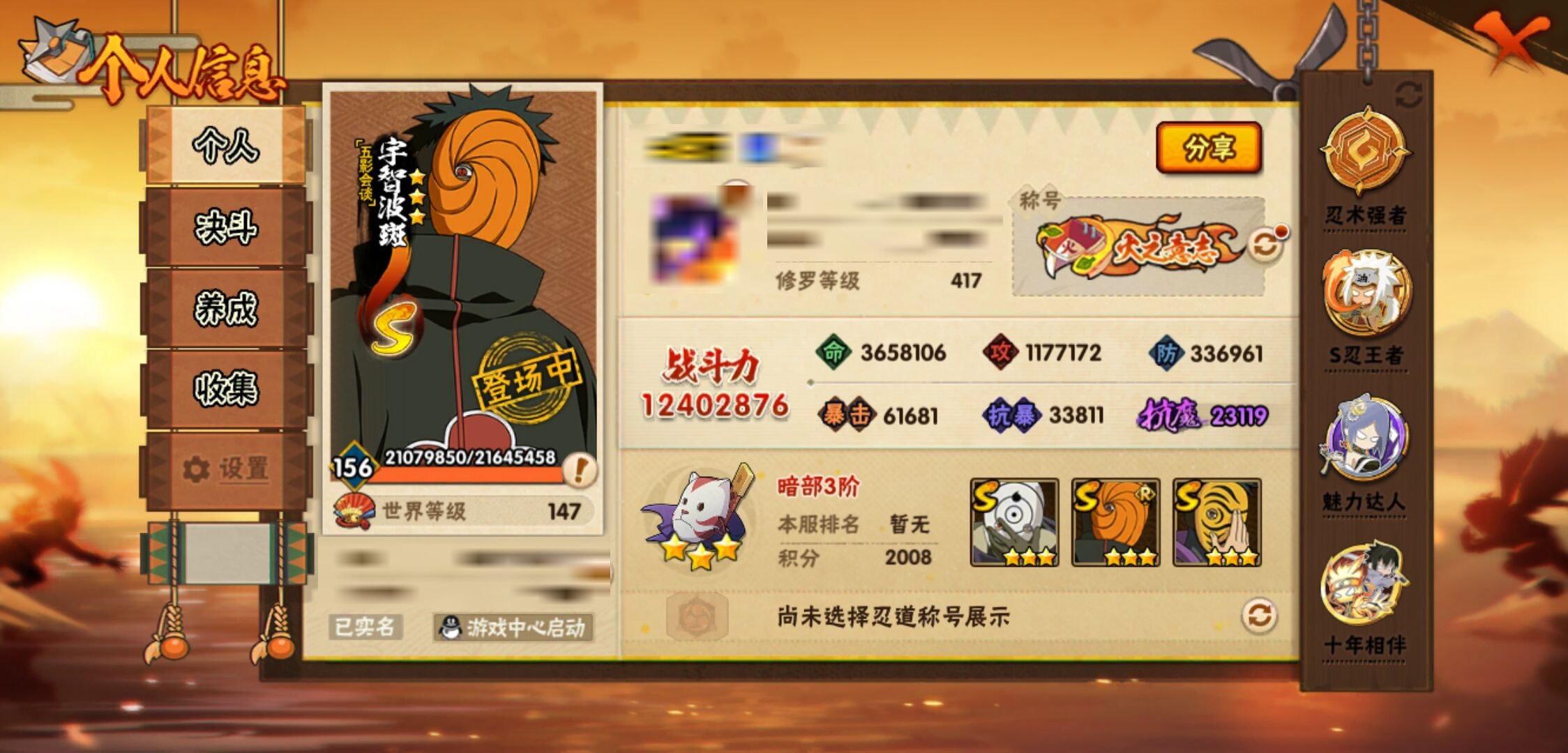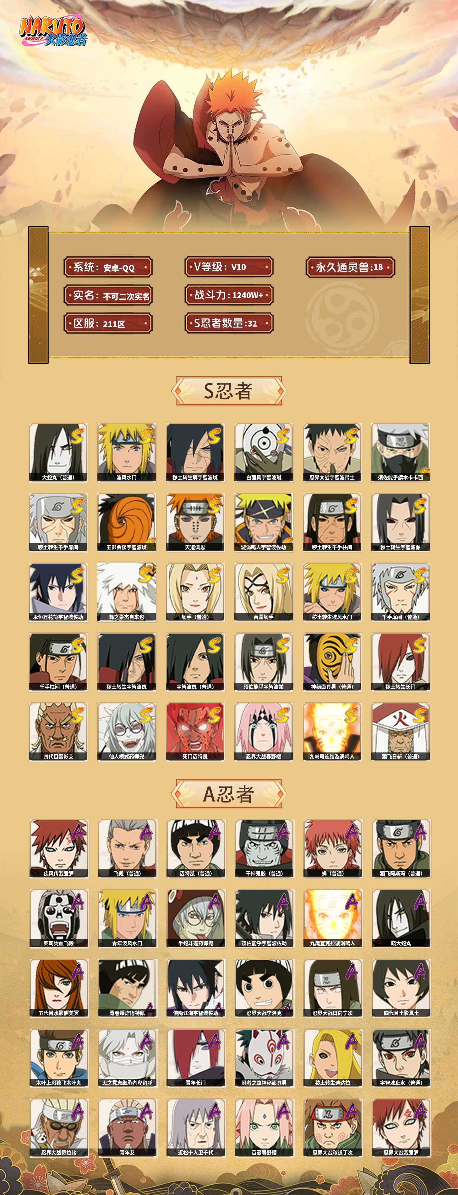 【火影忍者】【lyhy11058】战斗力:1240w;段位:暗部3阶;本服排名:390;vip:v10级;s忍:32个;a忍:47个;通灵兽:18个,s忍:秽土转生解宇智波斑|白面具宇智波斑|忍界大战宇智波带土|须佐能乎旗木卡卡西|秽土转生千手扉间|五影会谈宇智波斑|天道佩恩|漩涡鸣人宇智波佐助|秽土转生千手柱间|秽土转生宇智波鼬|永恒万花筒宇智波佐助|舞之豪杰自来也|大蛇丸(普通) 4星|纲手(普通)|百豪纲手|波风水门 4星|秽土转生波风水门|千手扉间(普通)|千手柱间(普通)|秽土转生宇智波斑|宇智波斑(普通)|须佐能乎宇智波鼬|神秘面具男(普通)|秽土转生长门|四代目雷影艾|仙人模式药师兜|死门迈特凯|忍界大战春野樱|九喇嘛连结漩涡鸣人|猿飞日斩(普通)|秽土转生猿飞日斩|自来也(普通)__a忍:青春爆炸迈特凯|侠隐江湖宇智波佐助|忍界大战李洛克|忍界大战日向宁次|四代目土影黑土|木叶上忍猿飞木叶丸|火之意志继承者卑留呼|青年长门|忍者之路神秘面具男|秽土转生迪达拉|宇智波止水(普通)|忍界大战奇拉比|青年波风水门 3星|青年艾|近松十人卫千代|半蛇斗篷药师兜 3星|须佐能乎宇智波佐助 3星|九尾查克拉漩涡鸣人 3星|晓大蛇丸 3星|百豪春野樱|忍界大战秋道丁次|忍界大战我爱罗|奇拉比(普通)|万花筒写轮眼宇智波佐助|五代目水影照美冥 3星|五代目雷影达鲁伊|绝|黑绝|死司凭血飞段 4星|角都(普通)|地怨虞角都|疾风传我爱罗 5星|迪达拉(普通)|飞段(普通) 5星|小南(普通)|仙人模式漩涡鸣人|万花筒写轮眼旗木卡卡西|迈特凯(普通) 5星|宇智波鼬(普通)|干柿鬼鲛(普通) 5星|蝎(普通) 5星|绯流琥蝎|猿飞阿斯玛(普通) 5星|桃式显现漩涡博人|六代目水影长十郎|宇智波泉奈|初始形态机械鸣人__通灵兽:忍犬(普通)|蓝蛇|蛤蟆吉|忍龟|镰鼬|猿魔|山椒鱼|蜃|蛤蟆仙人|鲛鲨|蛤蟆健|乌鸦(普通)|蛤蟆龙|蛤蟆广|梦貘|鹰|蜘蛛|砂之守鹤