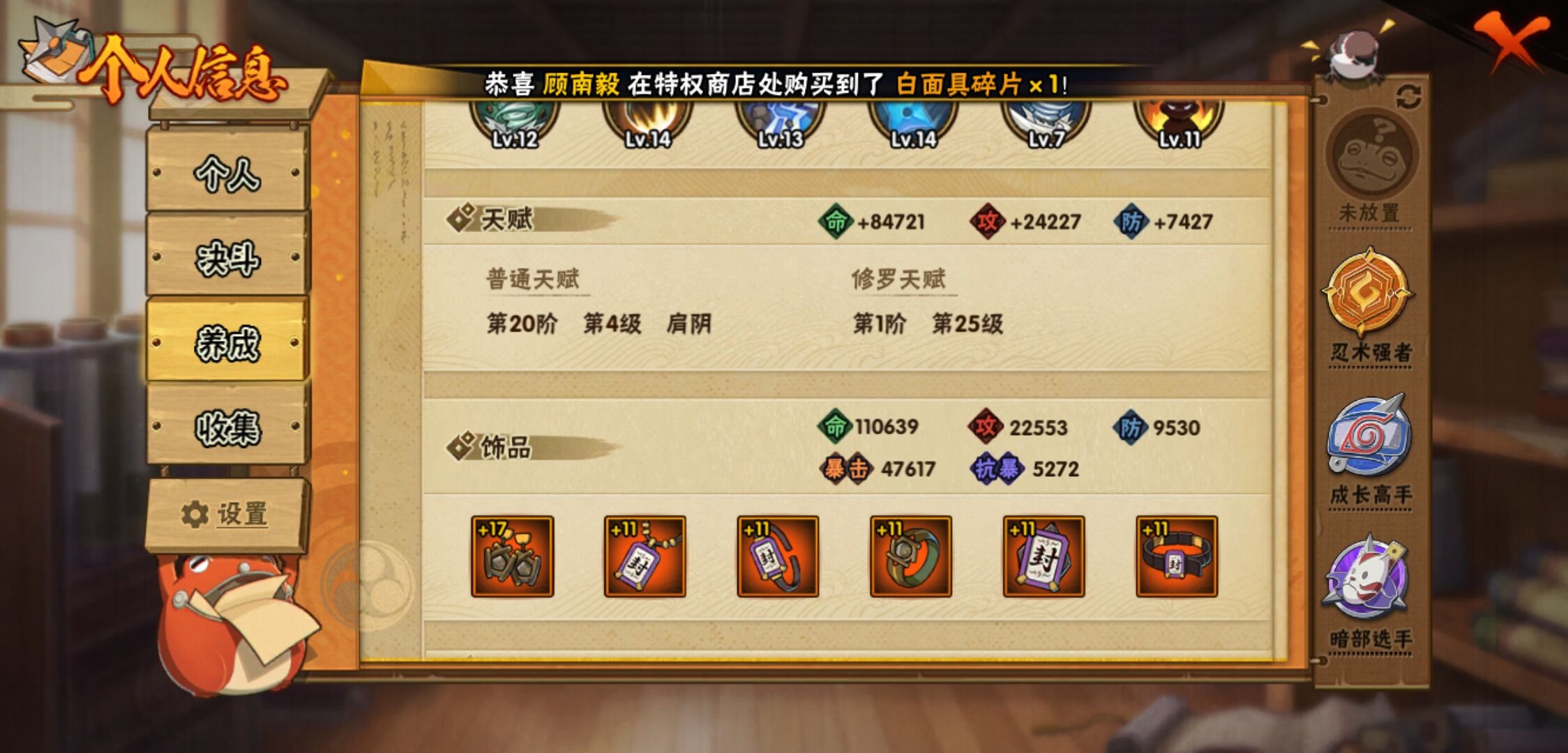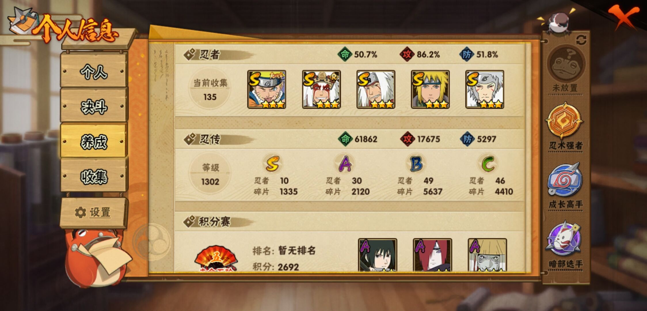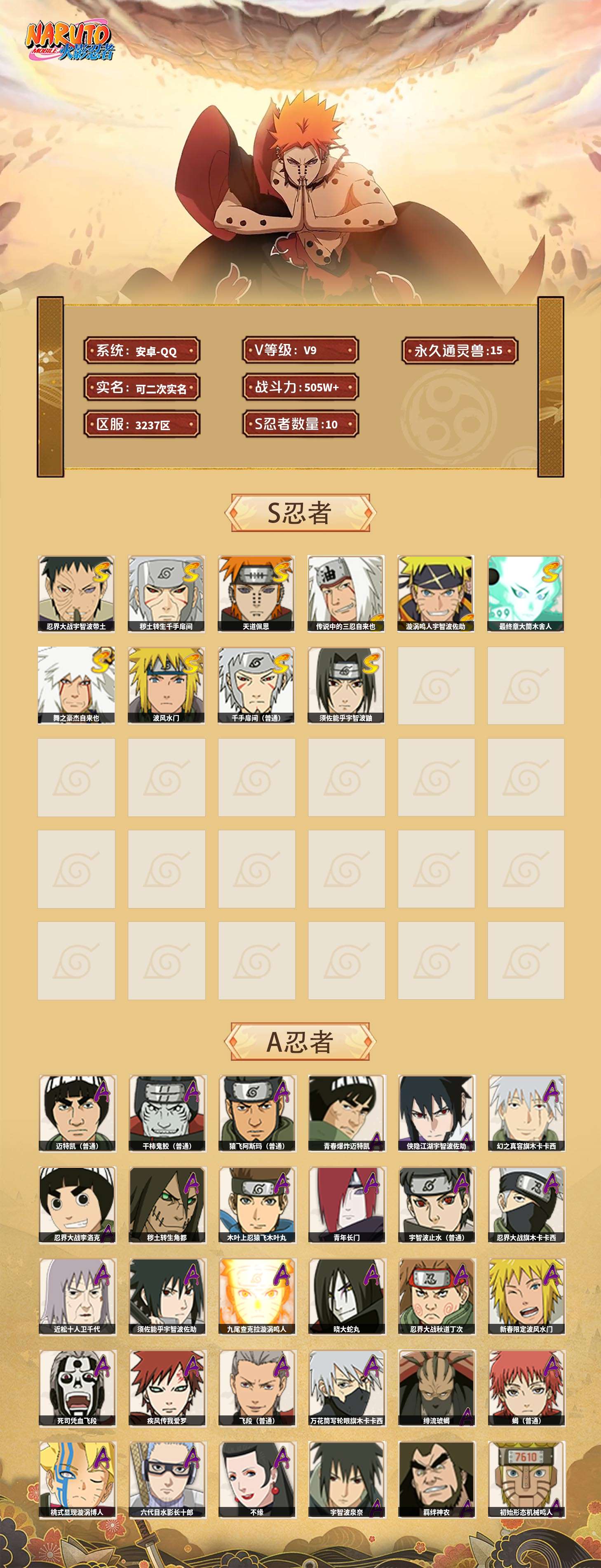 【火影忍者】【lyhy11056】战斗力:505w;段位:暗部1阶;本服排名:2286;vip:v9级;s忍:10个;a忍:30个;通灵兽:15个,s忍:忍界大战宇智波带土|秽土转生千手扉间|天道佩恩|传说中的三忍自来也|漩涡鸣人宇智波佐助|最终章大筒木舍人|舞之豪杰自来也|波风水门|千手扉间(普通)|须佐能乎宇智波鼬__a忍:青春爆炸迈特凯|侠隐江湖宇智波佐助|幻之真容旗木卡卡西|忍界大战李洛克|秽土转生角都|木叶上忍猿飞木叶丸|青年长门|宇智波止水(普通)|忍界大战旗木卡卡西|近松十人卫千代|须佐能乎宇智波佐助|九尾查克拉漩涡鸣人|晓大蛇丸|忍界大战秋道丁次|新春限定波风水门|死司凭血飞段|疾风传我爱罗|飞段(普通)|万花筒写轮眼旗木卡卡西|迈特凯(普通) 4星|干柿鬼鲛(普通) 4星|绯流琥蝎|蝎(普通)|猿飞阿斯玛(普通) 4星|桃式显现漩涡博人|六代目水影长十郎|不缘|宇智波泉奈|羁绊神农|初始形态机械鸣人__通灵兽:忍犬(普通)|蓝蛇|蛤蟆吉|忍龟|镰鼬|猿魔|山椒鱼|砂之守鹤|蜃|蛤蟆仙人|鲛鲨|蛤蟆健|乌鸦(普通)|蛞蝓(普通)|蛤蟆龙1