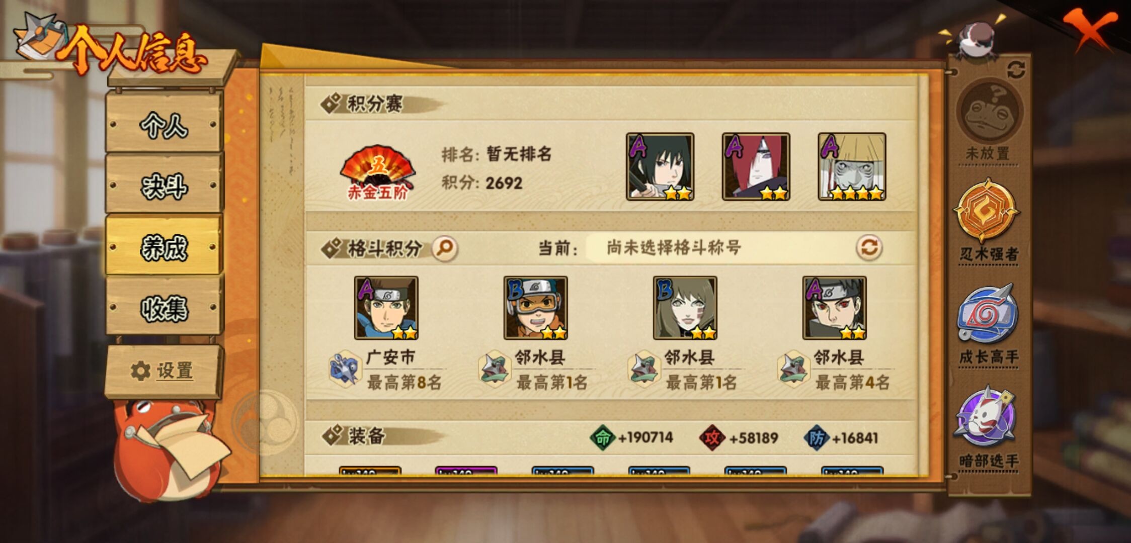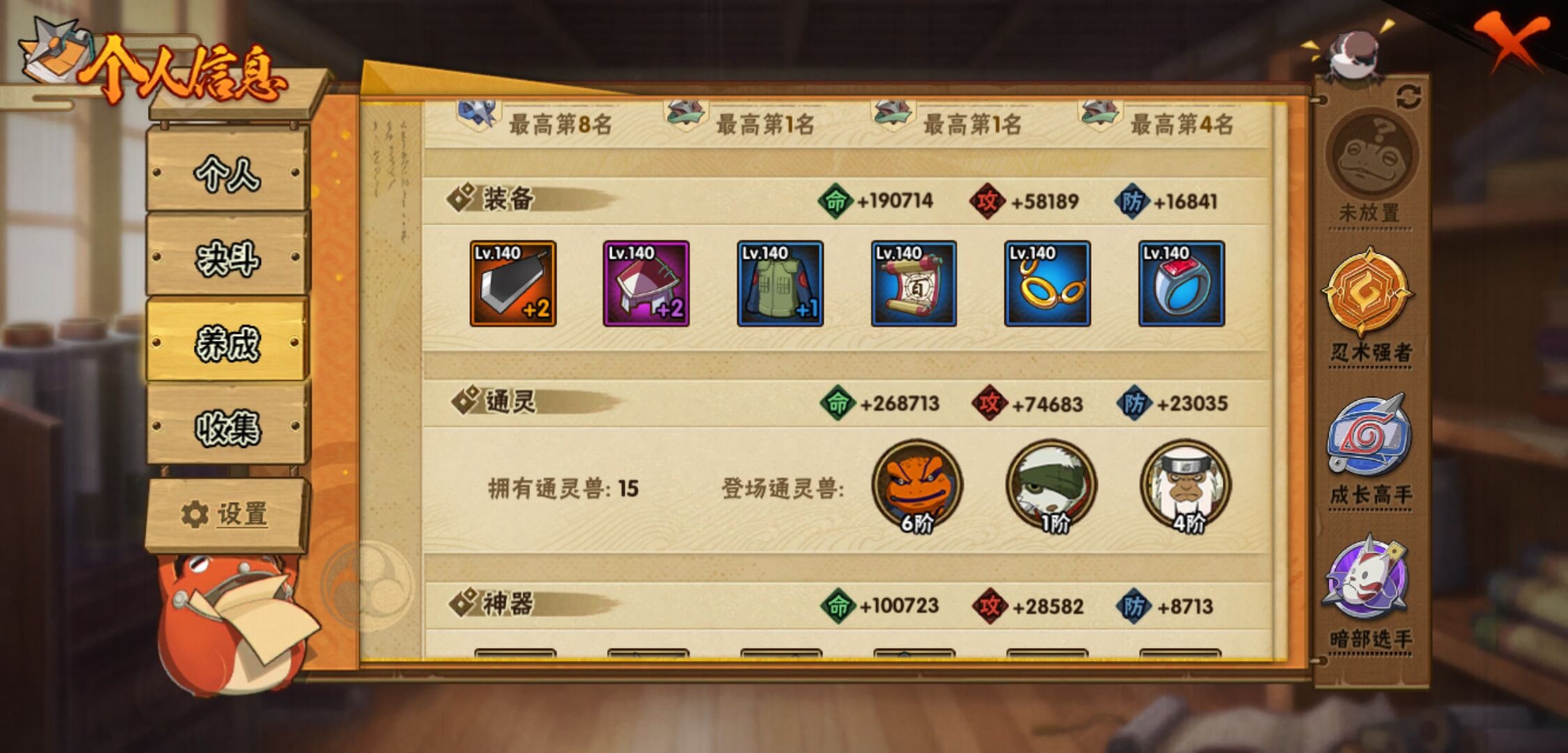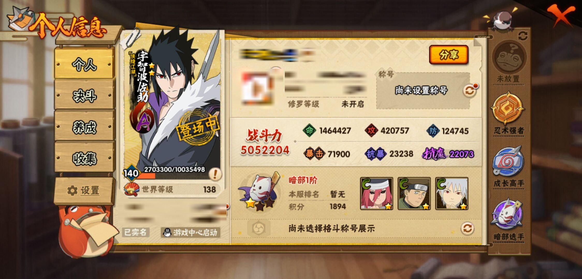 【火影忍者】【lyhy11056】战斗力:505w;段位:暗部1阶;本服排名:2286;vip:v9级;s忍:10个;a忍:30个;通灵兽:15个,s忍:忍界大战宇智波带土|秽土转生千手扉间|天道佩恩|传说中的三忍自来也|漩涡鸣人宇智波佐助|最终章大筒木舍人|舞之豪杰自来也|波风水门|千手扉间(普通)|须佐能乎宇智波鼬__a忍:青春爆炸迈特凯|侠隐江湖宇智波佐助|幻之真容旗木卡卡西|忍界大战李洛克|秽土转生角都|木叶上忍猿飞木叶丸|青年长门|宇智波止水(普通)|忍界大战旗木卡卡西|近松十人卫千代|须佐能乎宇智波佐助|九尾查克拉漩涡鸣人|晓大蛇丸|忍界大战秋道丁次|新春限定波风水门|死司凭血飞段|疾风传我爱罗|飞段(普通)|万花筒写轮眼旗木卡卡西|迈特凯(普通) 4星|干柿鬼鲛(普通) 4星|绯流琥蝎|蝎(普通)|猿飞阿斯玛(普通) 4星|桃式显现漩涡博人|六代目水影长十郎|不缘|宇智波泉奈|羁绊神农|初始形态机械鸣人__通灵兽:忍犬(普通)|蓝蛇|蛤蟆吉|忍龟|镰鼬|猿魔|山椒鱼|砂之守鹤|蜃|蛤蟆仙人|鲛鲨|蛤蟆健|乌鸦(普通)|蛞蝓(普通)|蛤蟆龙1