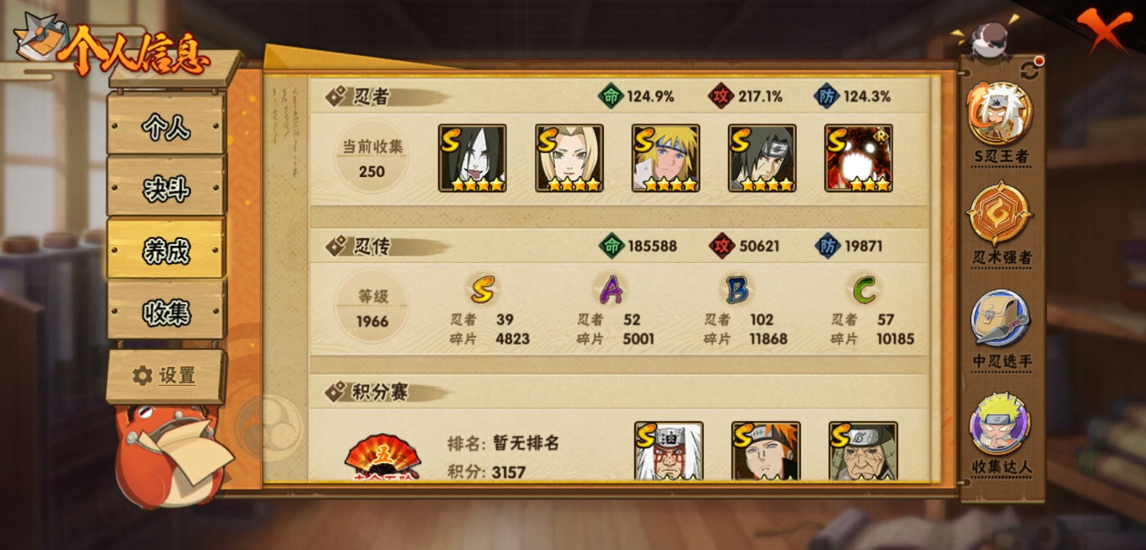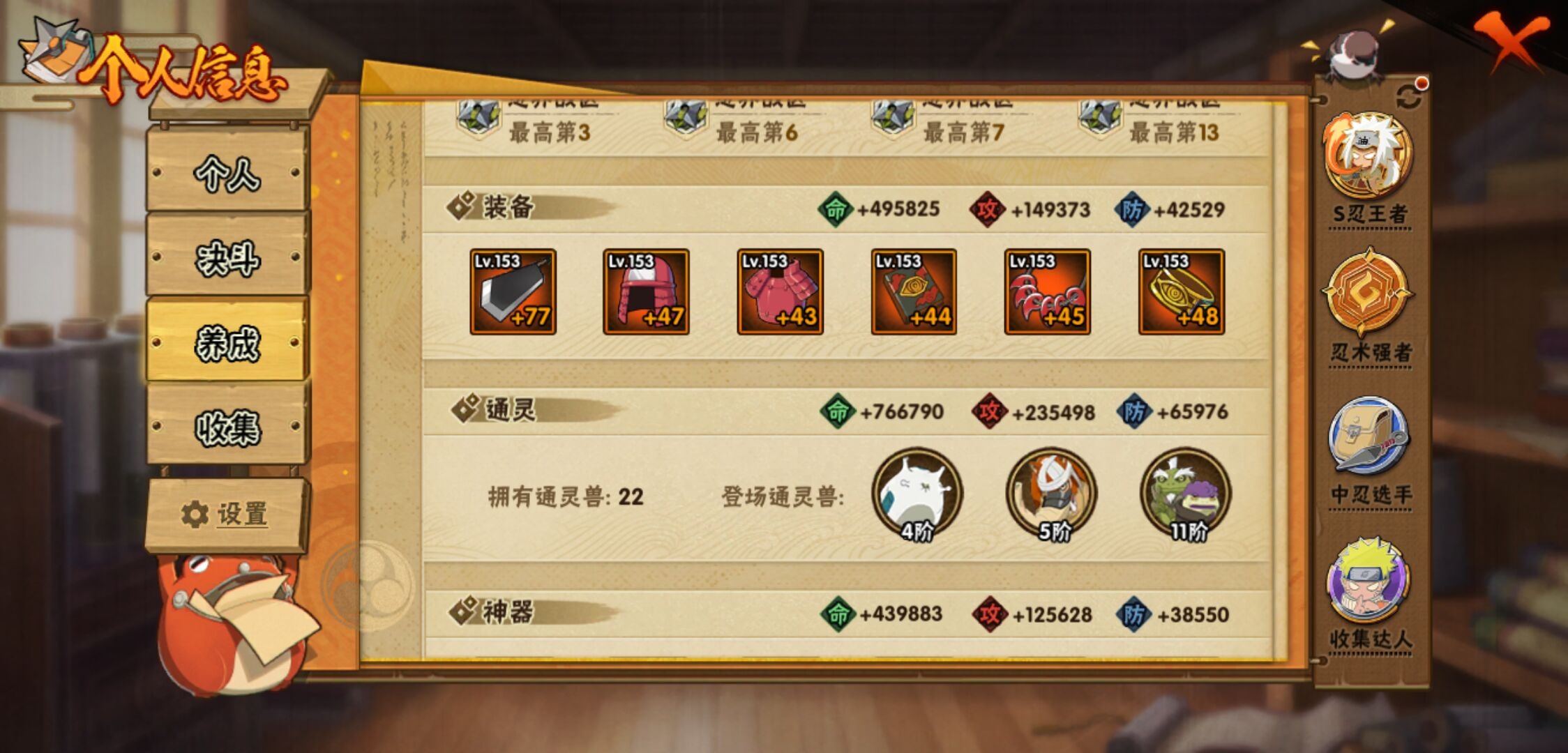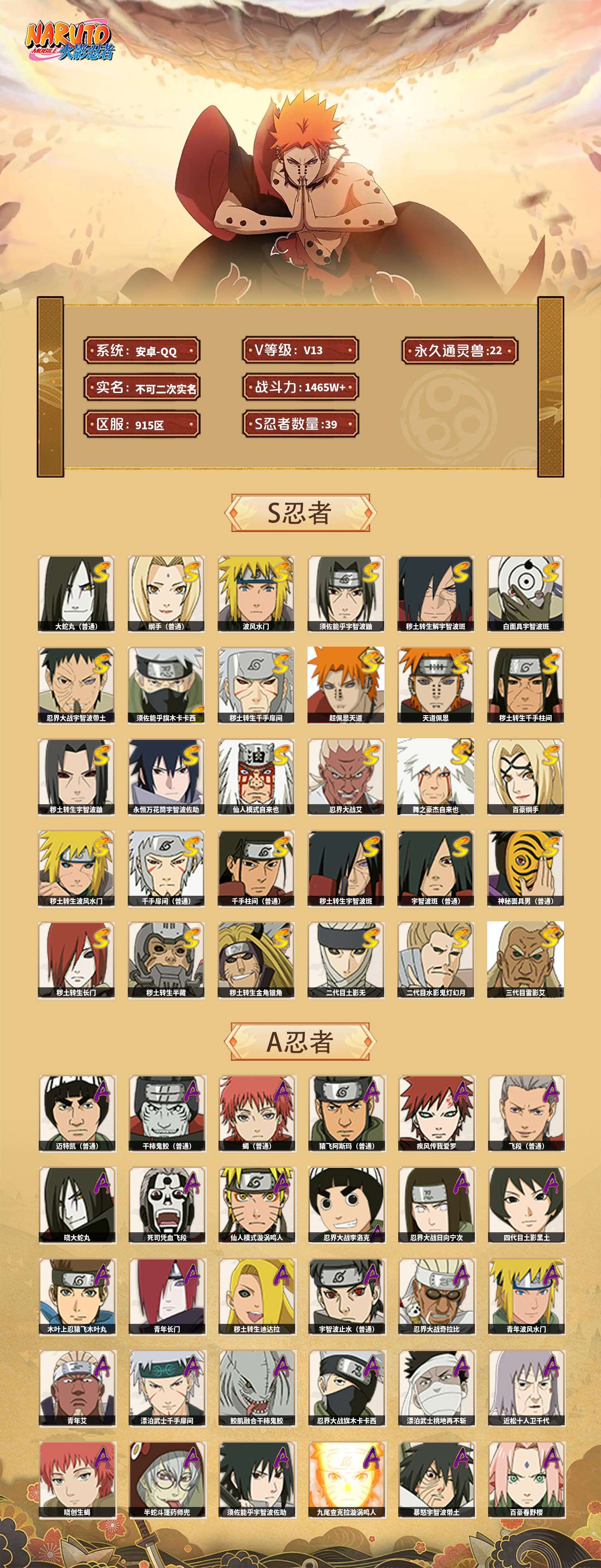 【火影忍者】【lyhy11066】战斗力:1465w;段位:上忍2阶;本服排名:299;vip:v13级;s忍:39个;a忍:52个;通灵兽:22个,s忍:秽土转生解宇智波斑|白面具宇智波斑|忍界大战宇智波带土|须佐能乎旗木卡卡西|秽土转生千手扉间|超佩恩天道|天道佩恩|秽土转生千手柱间|秽土转生宇智波鼬|永恒万花筒宇智波佐助|仙人模式自来也|忍界大战艾|舞之豪杰自来也|大蛇丸(普通) 4星|纲手(普通) 4星|百豪纲手|波风水门 4星|秽土转生波风水门|千手扉间(普通)|千手柱间(普通)|秽土转生宇智波斑|宇智波斑(普通)|须佐能乎宇智波鼬 4星|神秘面具男(普通)|秽土转生长门|秽土转生半藏|秽土转生金角银角|二代目土影无|二代目水影鬼灯幻月|三代目雷影艾|四代目雷影艾|仙人模式药师兜|死门迈特凯|忍界大战春野樱|九喇嘛连结漩涡鸣人|猿飞日斩(普通)|秽土转生猿飞日斩|自来也(普通)|暴怒第六尾漩涡鸣人__a忍:忍界大战李洛克|忍界大战日向宁次|四代目土影黑土|木叶上忍猿飞木叶丸|青年长门|秽土转生迪达拉|宇智波止水(普通)|忍界大战奇拉比|青年波风水门|青年艾|漂泊武士千手扉间|鲛肌融合干柿鬼鲛|忍界大战旗木卡卡西|漂泊武士桃地再不斩|近松十人卫千代|晓创生蝎|半蛇斗篷药师兜|须佐能乎宇智波佐助|九尾查克拉漩涡鸣人|暴怒宇智波带土|晓大蛇丸 3星|百豪春野樱|忍界大战秋道丁次|忍界大战我爱罗|新春限定波风水门|疾风传咒印宇智波佐助|新春限定宇智波鼬|奇拉比(普通)|万花筒写轮眼宇智波佐助|五代目水影照美冥|五代目雷影达鲁伊|绝|死司凭血飞段 3星|角都(普通)|地怨虞角都|疾风传我爱罗 4星|迪达拉(普通)|飞段(普通) 4星|小南(普通)|仙人模式漩涡鸣人 3星|万花筒写轮眼旗木卡卡西|迈特凯(普通) 5星|宇智波鼬(普通)|干柿鬼鲛(普通) 5星|蝎(普通) 5星|绯流琥蝎|猿飞阿斯玛(普通) 5星|桃式显现漩涡博人|六代目水影长十郎|不动|宇智波泉奈|羁绊神农__通灵兽:忍犬(普通)|蓝蛇|蛤蟆吉|忍龟|镰鼬|猿魔|蛞蝓(普通)|山椒鱼|蜃|蛤蟆仙人|鲛鲨|蛤蟆健|乌鸦(普通)|熊猫|蛤蟆龙|蛤蟆广|二尾又旅|砂之守鹤|梦貘|怒鬼无臂|鹰|蜘蛛